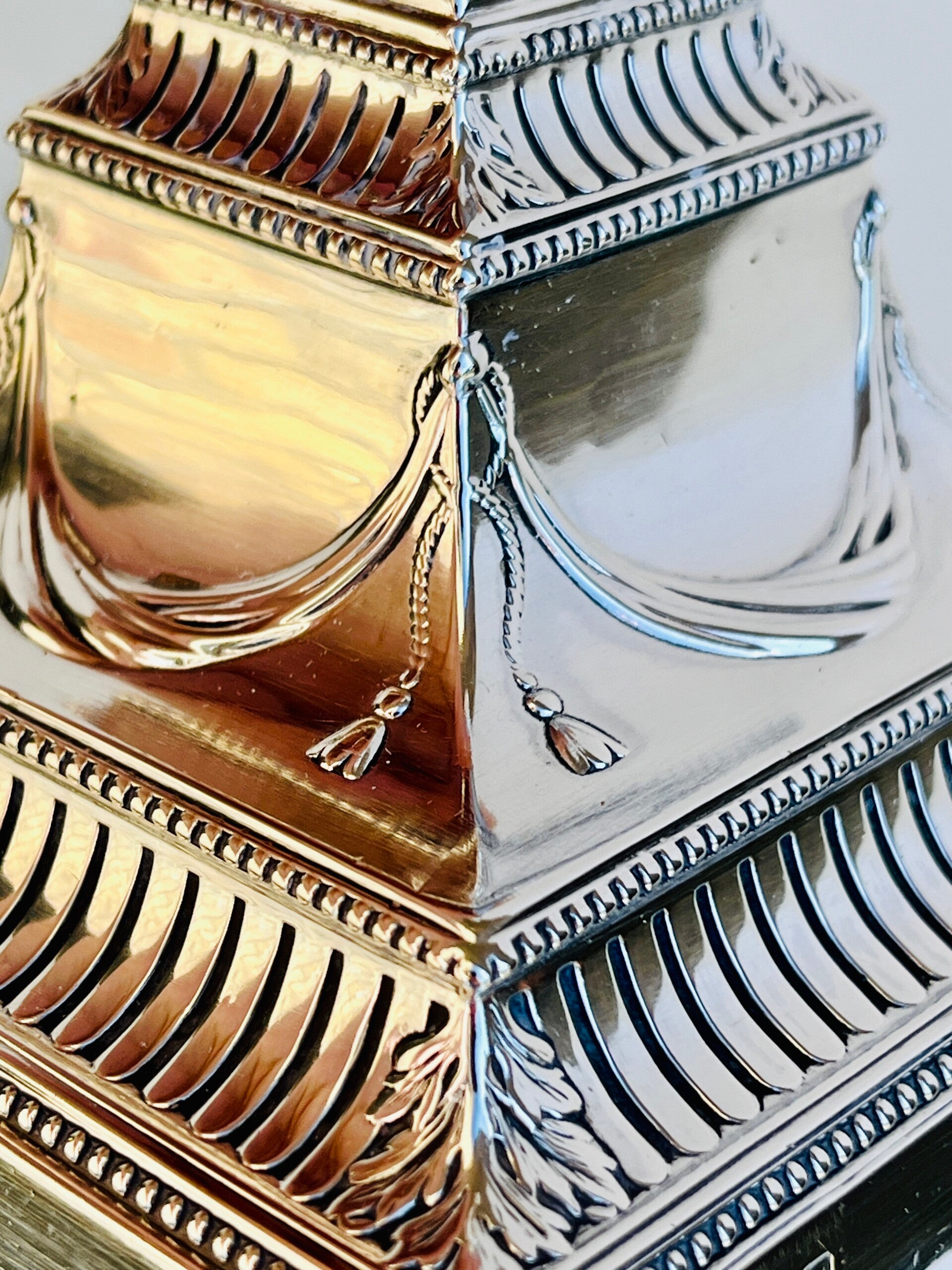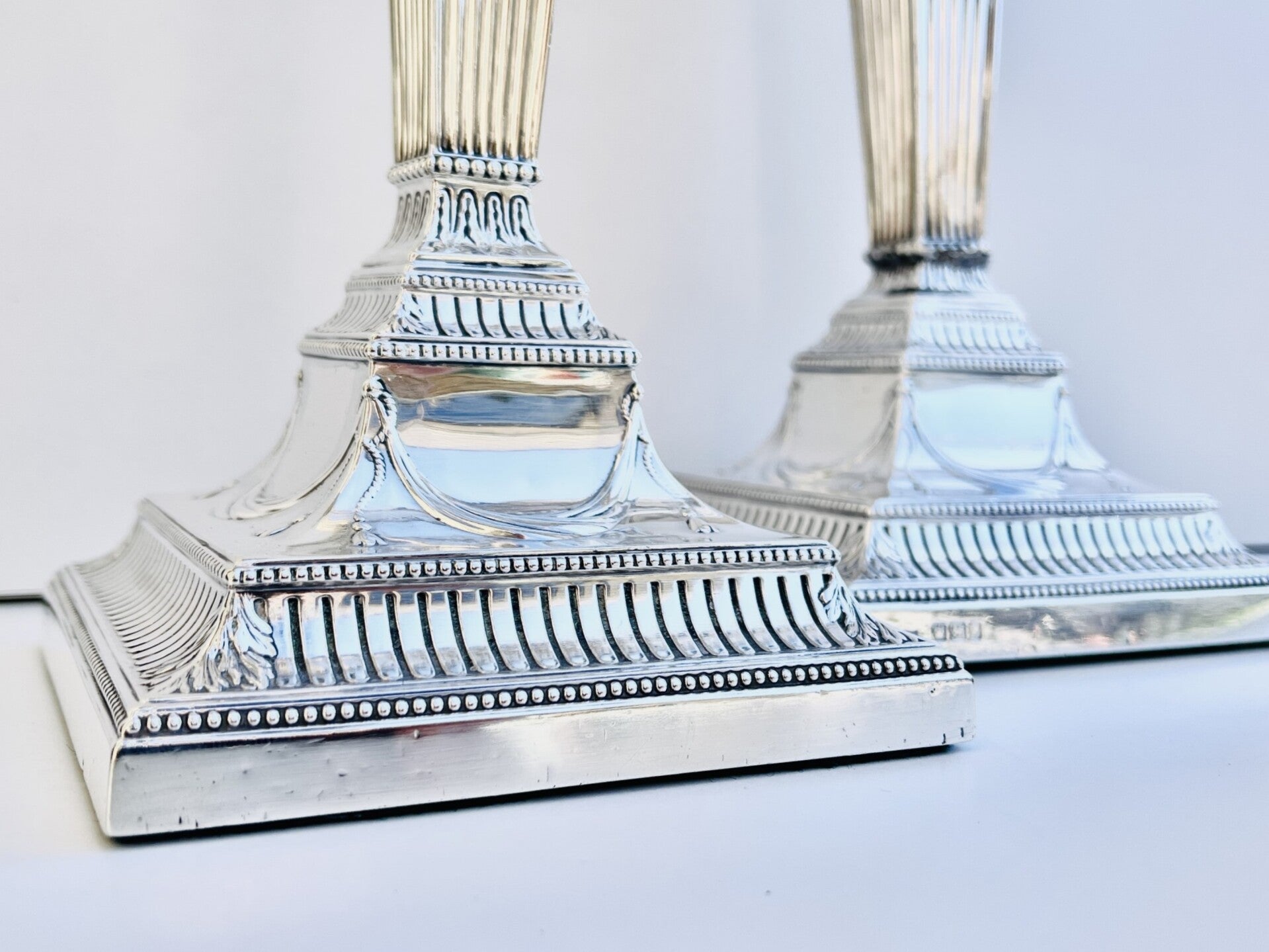 fluted plinth and tapered square section fluted column to a stepped swagged and fluted base with foliate corners and beaded edges