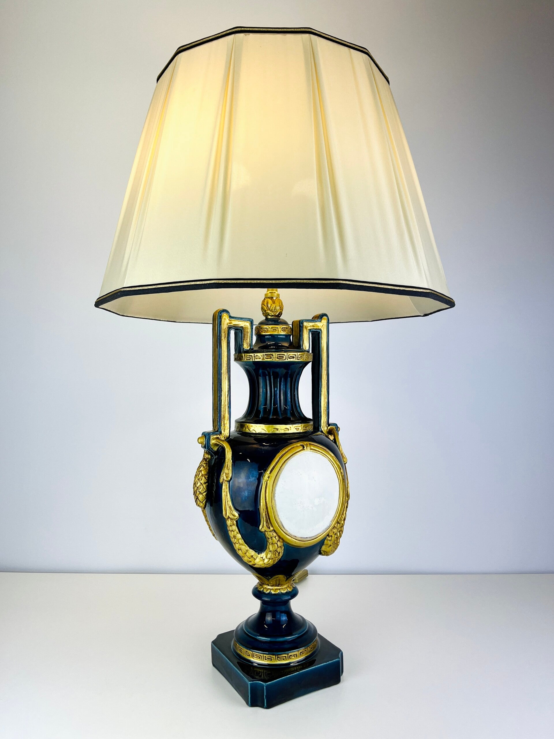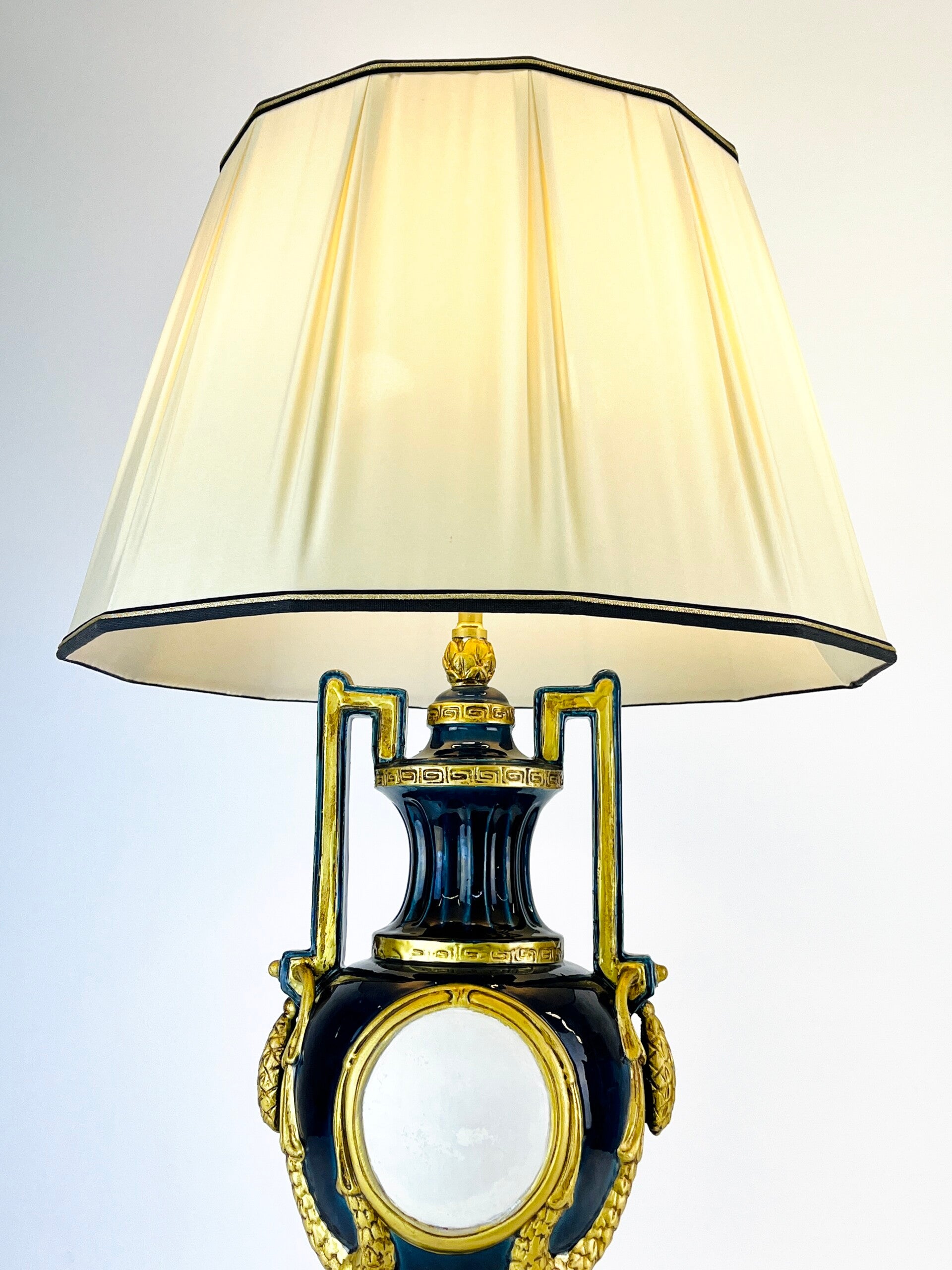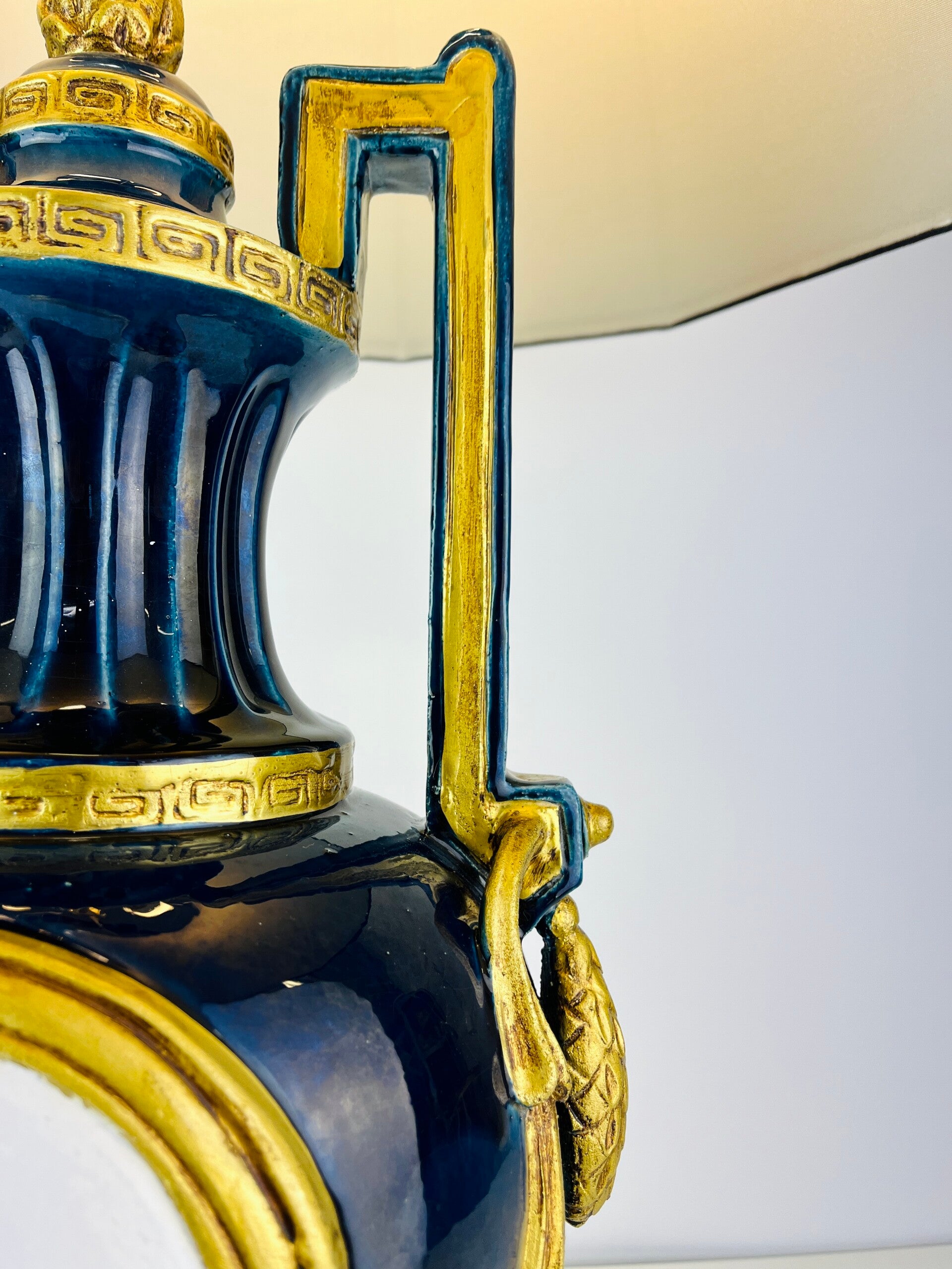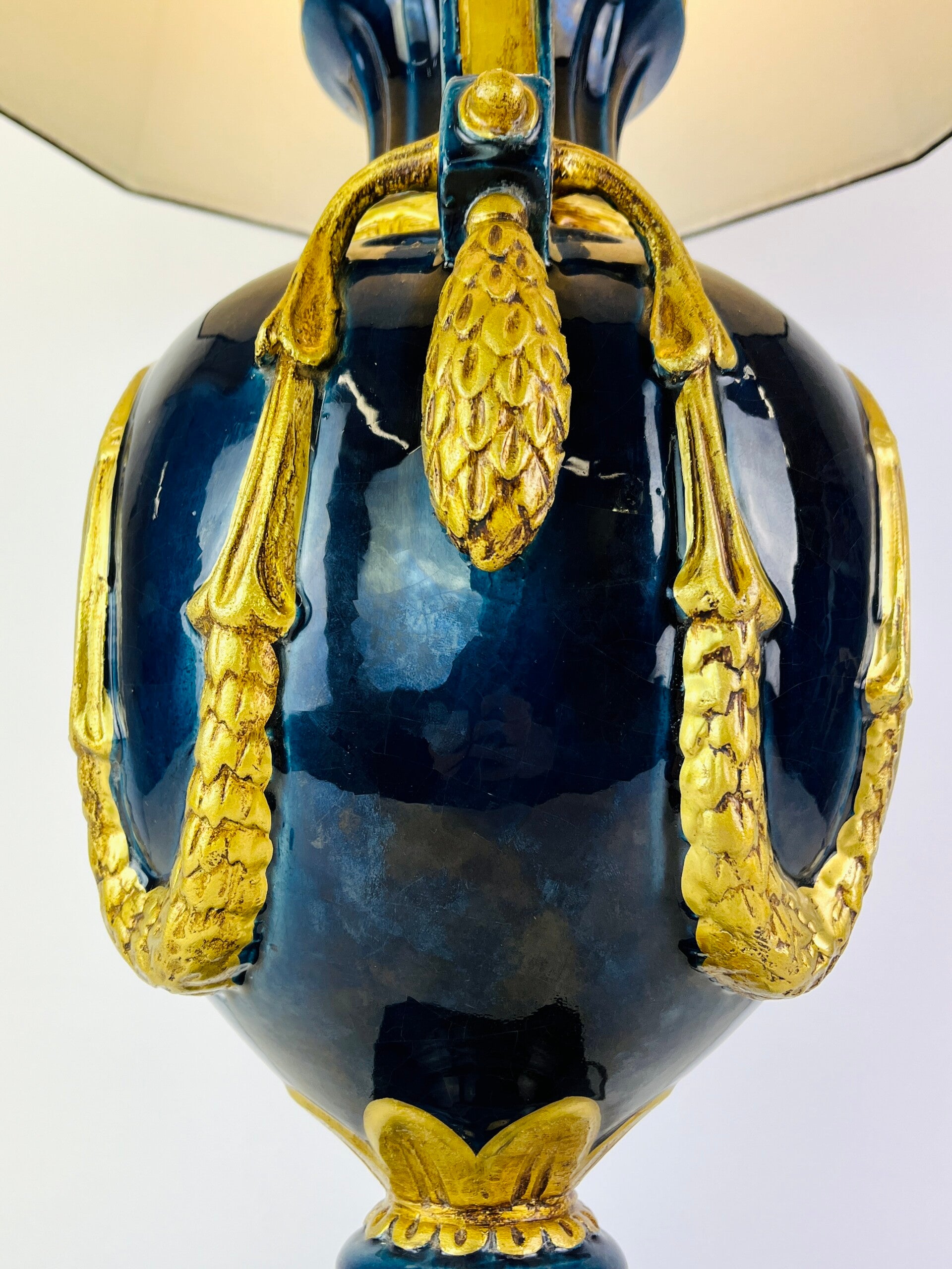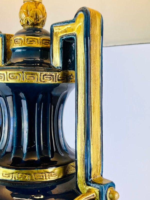 Very large blue glazed ceramic table lamp from the Italian BAGA, Patrizia Garganti in Firzene. Finished in classic style with gold details.