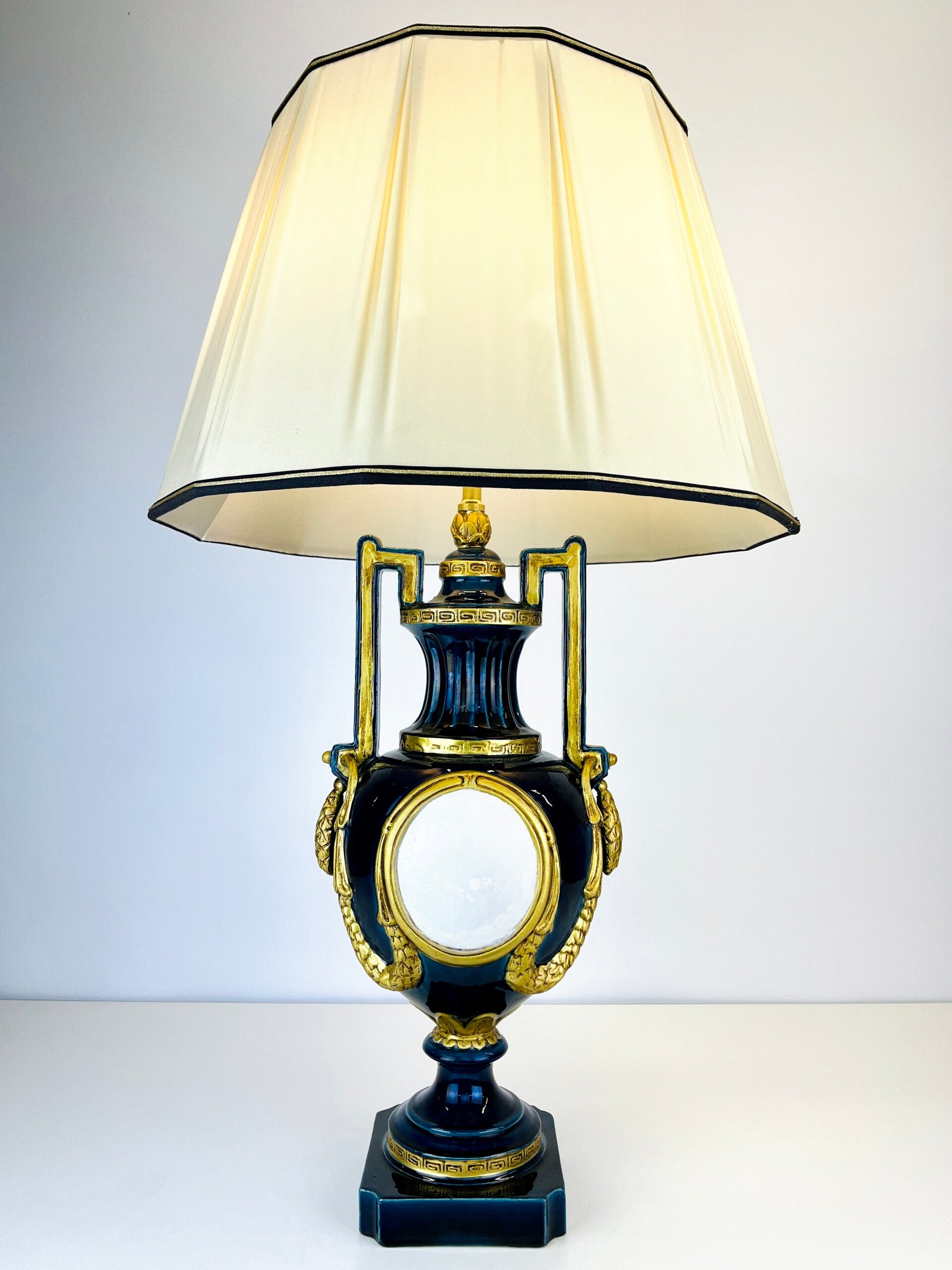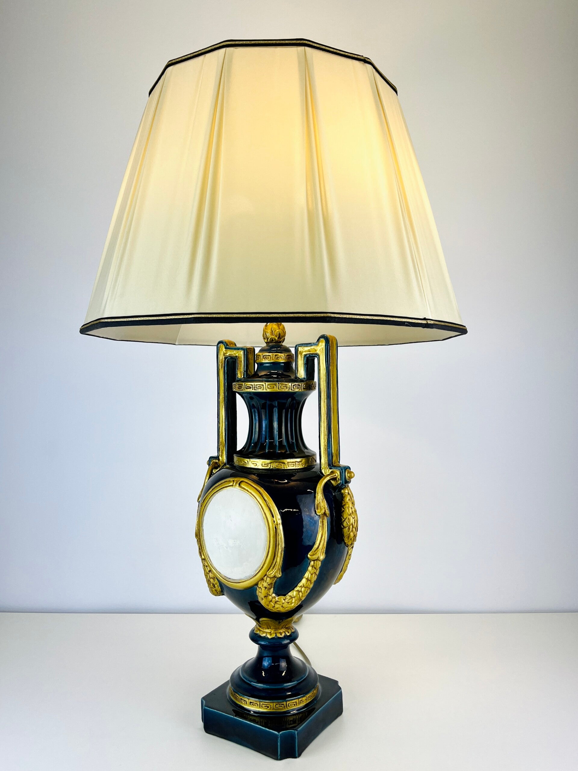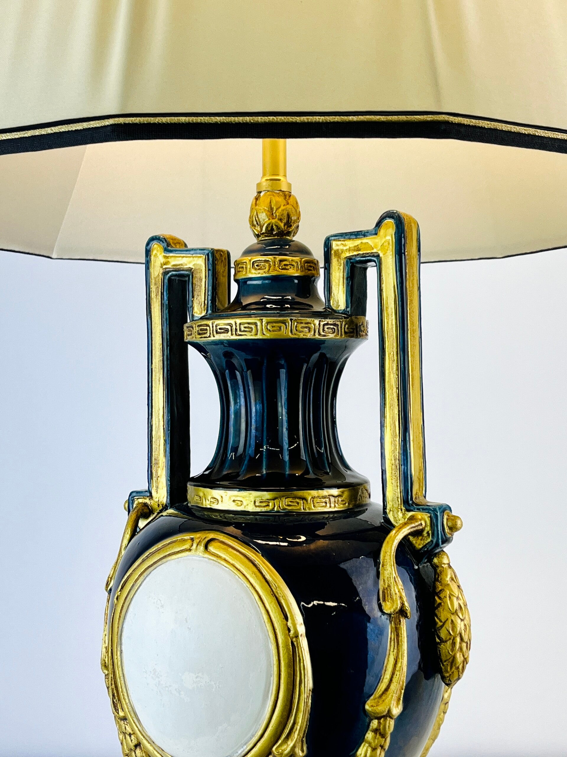 Very large blue glazed ceramic table lamp from the Italian BAGA, Patrizia Garganti in Firzene. Finished in classic style with gold details.
