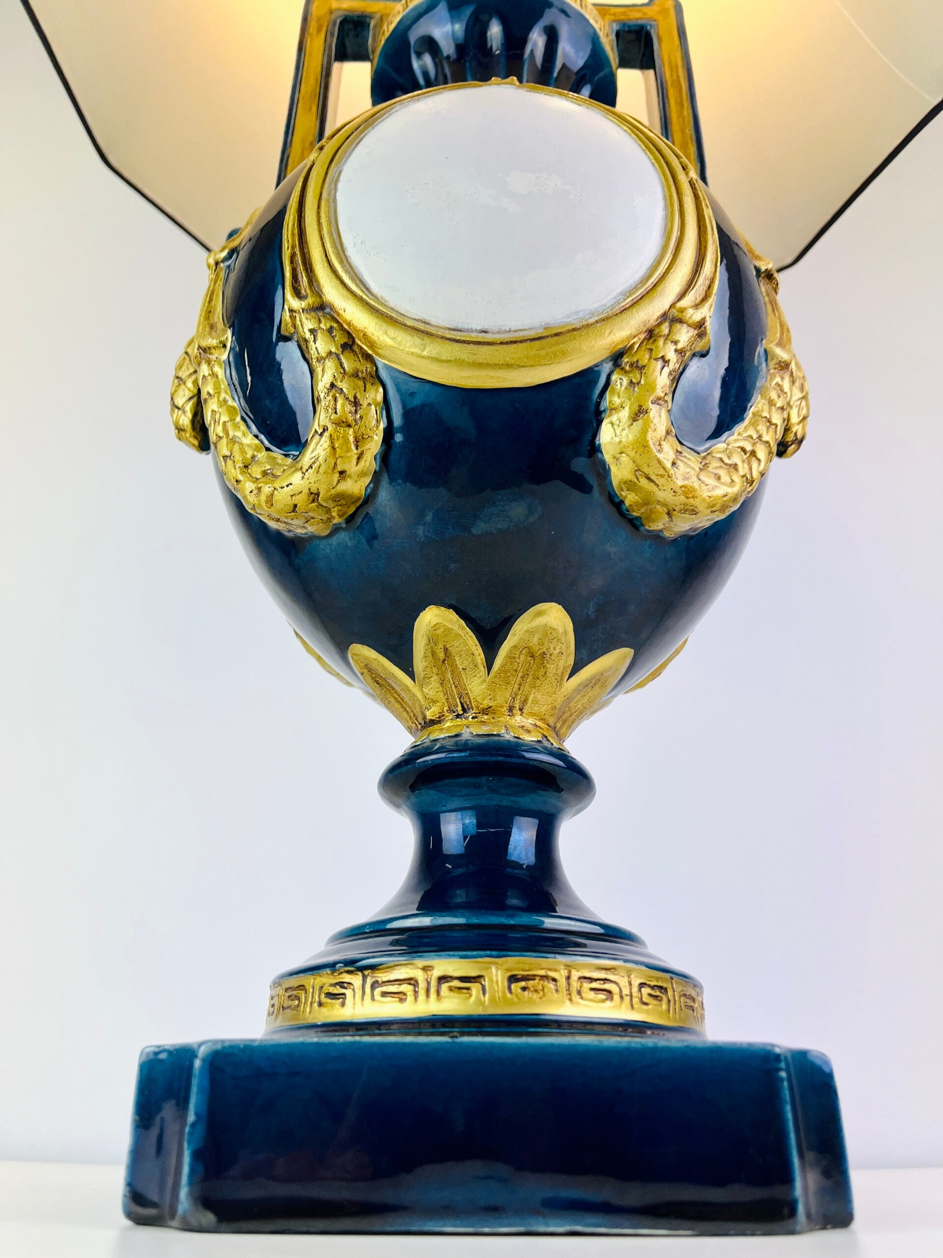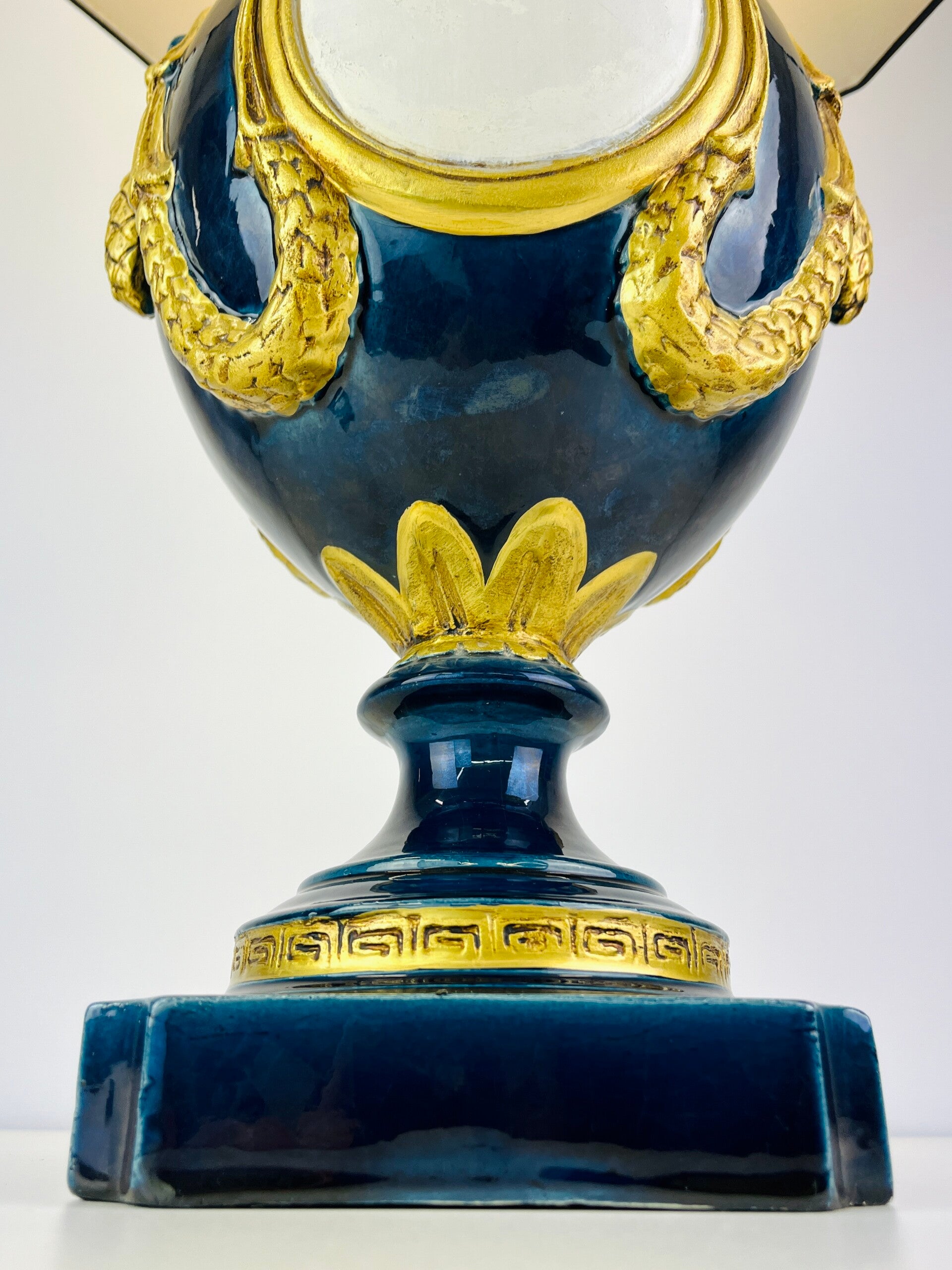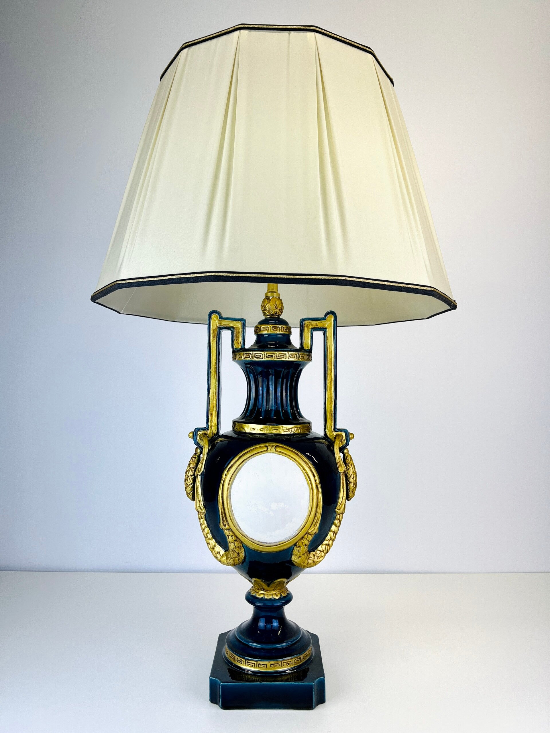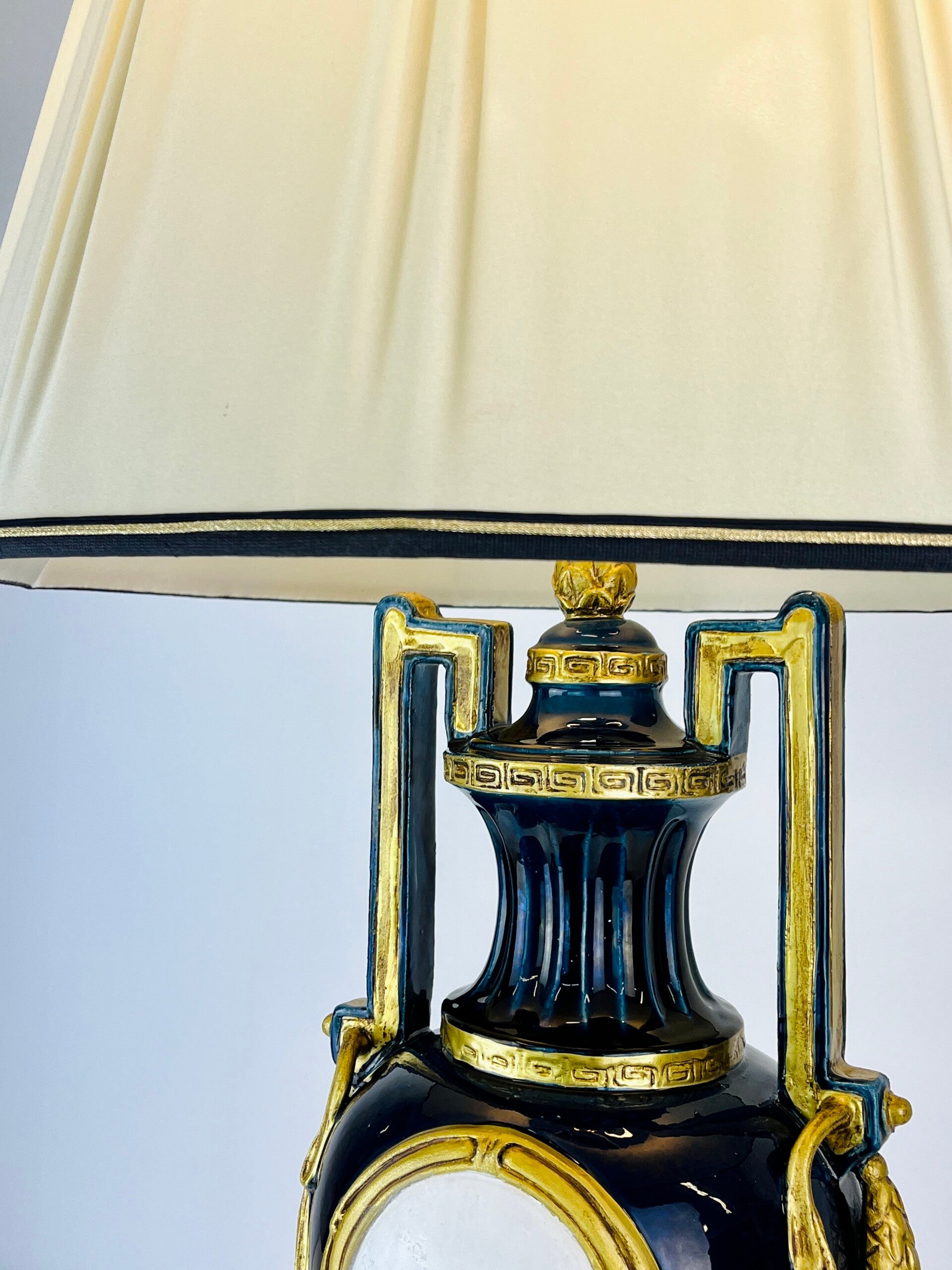 Very large blue glazed ceramic table lamp from the Italian BAGA, Patrizia Garganti in Firzene. Finished in classic style with gold details.