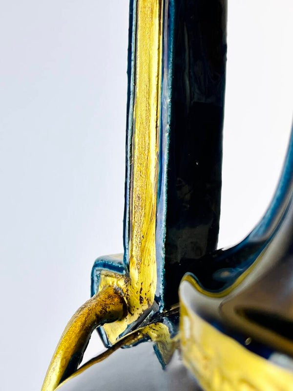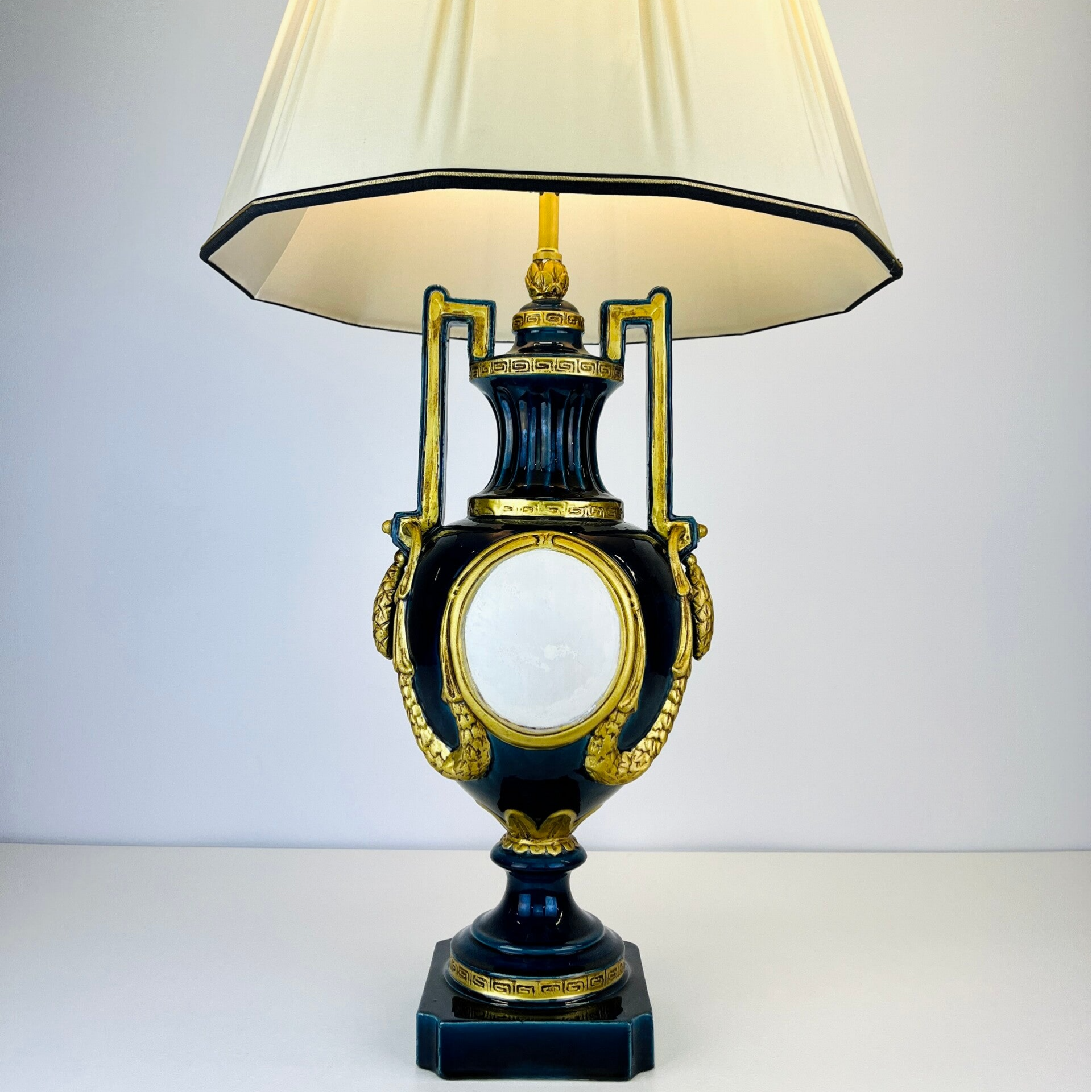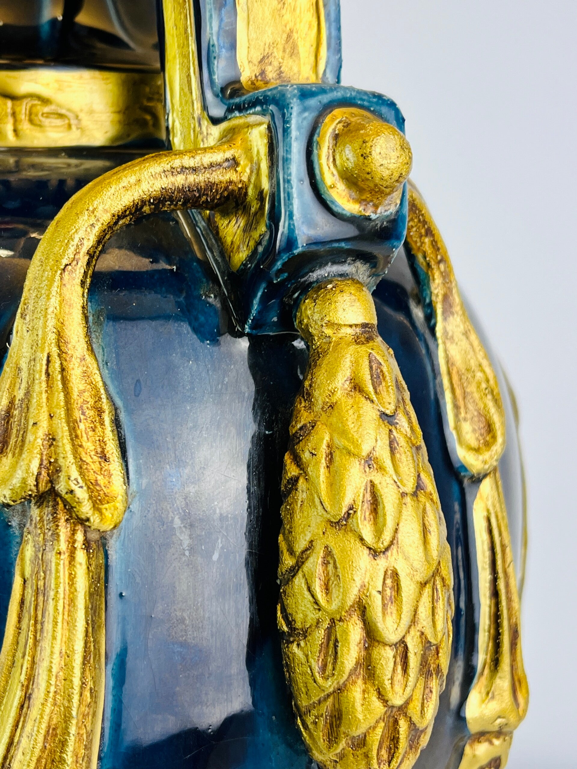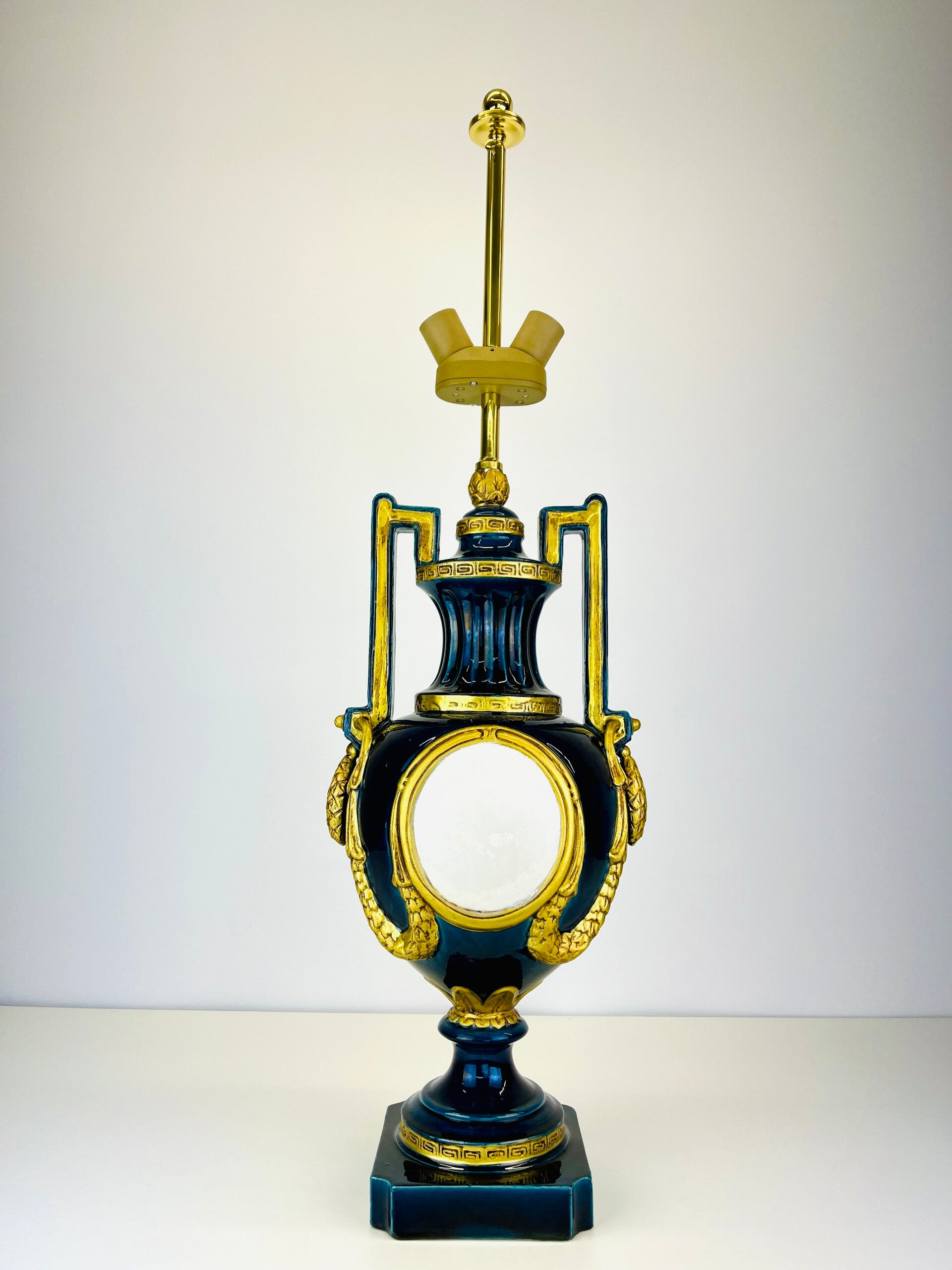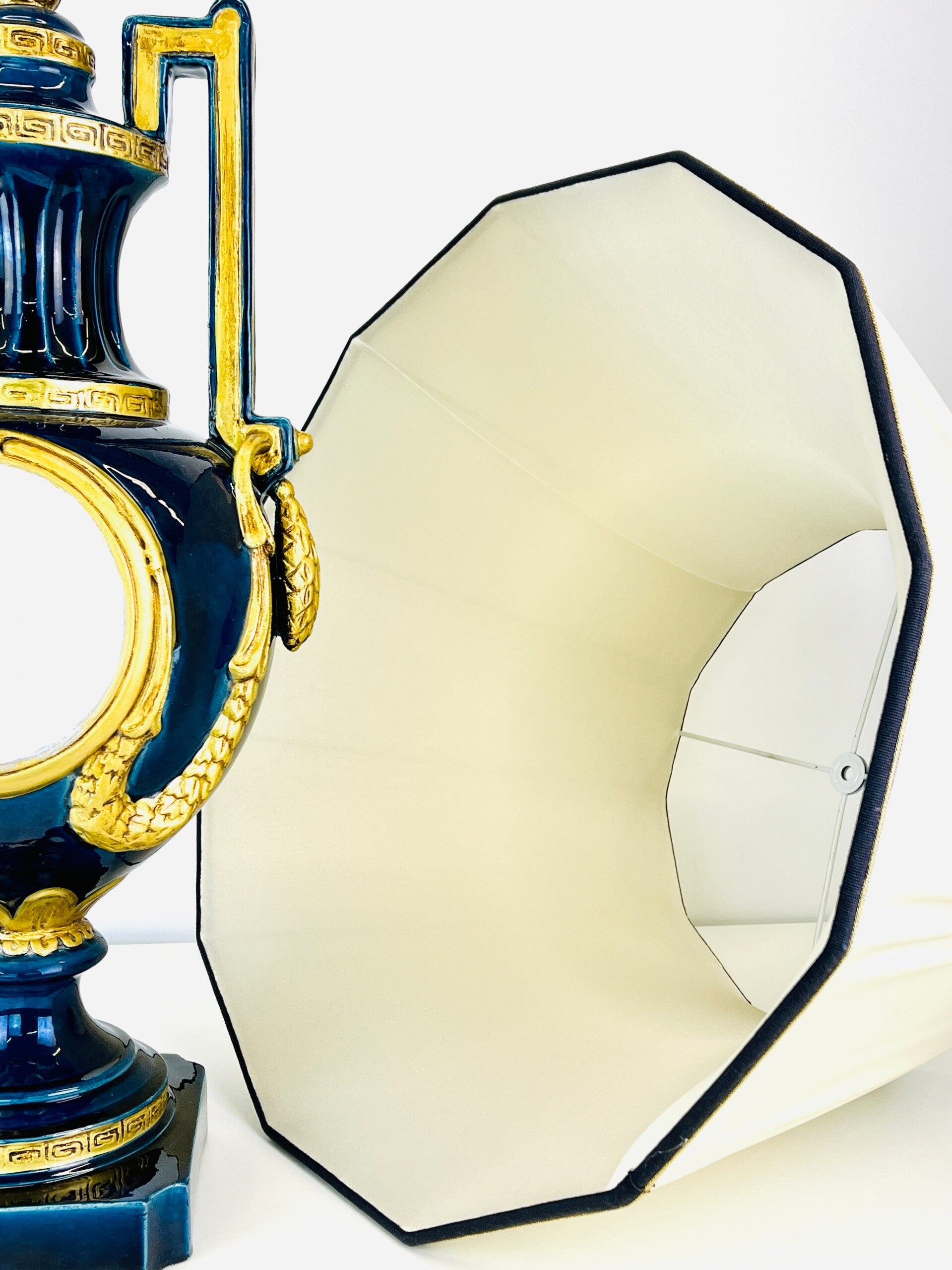 Very large blue glazed ceramic table lamp from the Italian BAGA, Patrizia Garganti in Firzene. Finished in classic style with gold details.