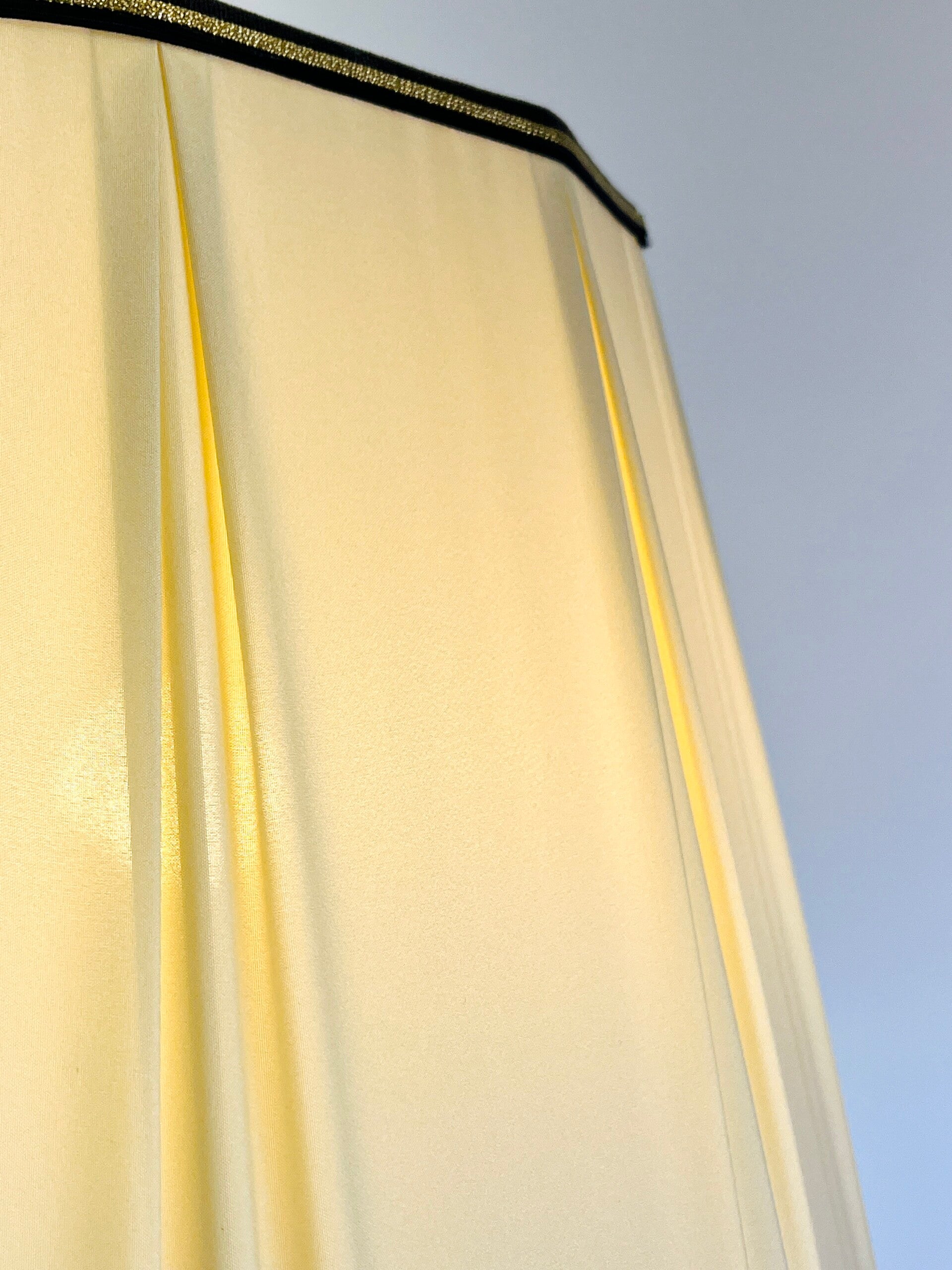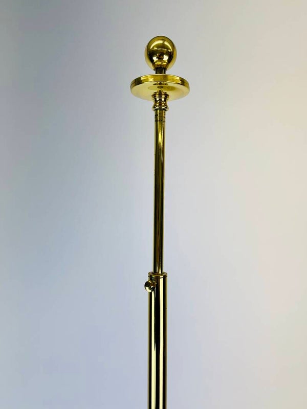 The lampshade is supported on a brass rod that is height-adjustable to a maximum height of 115 cm.