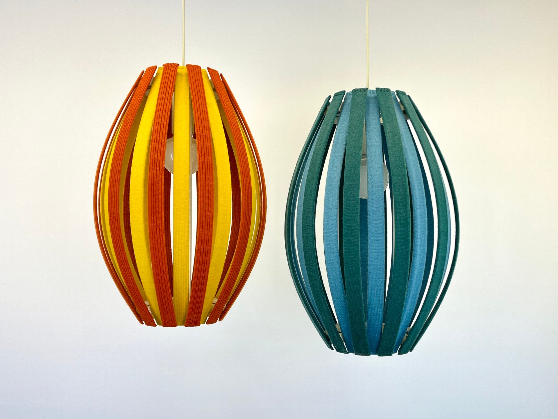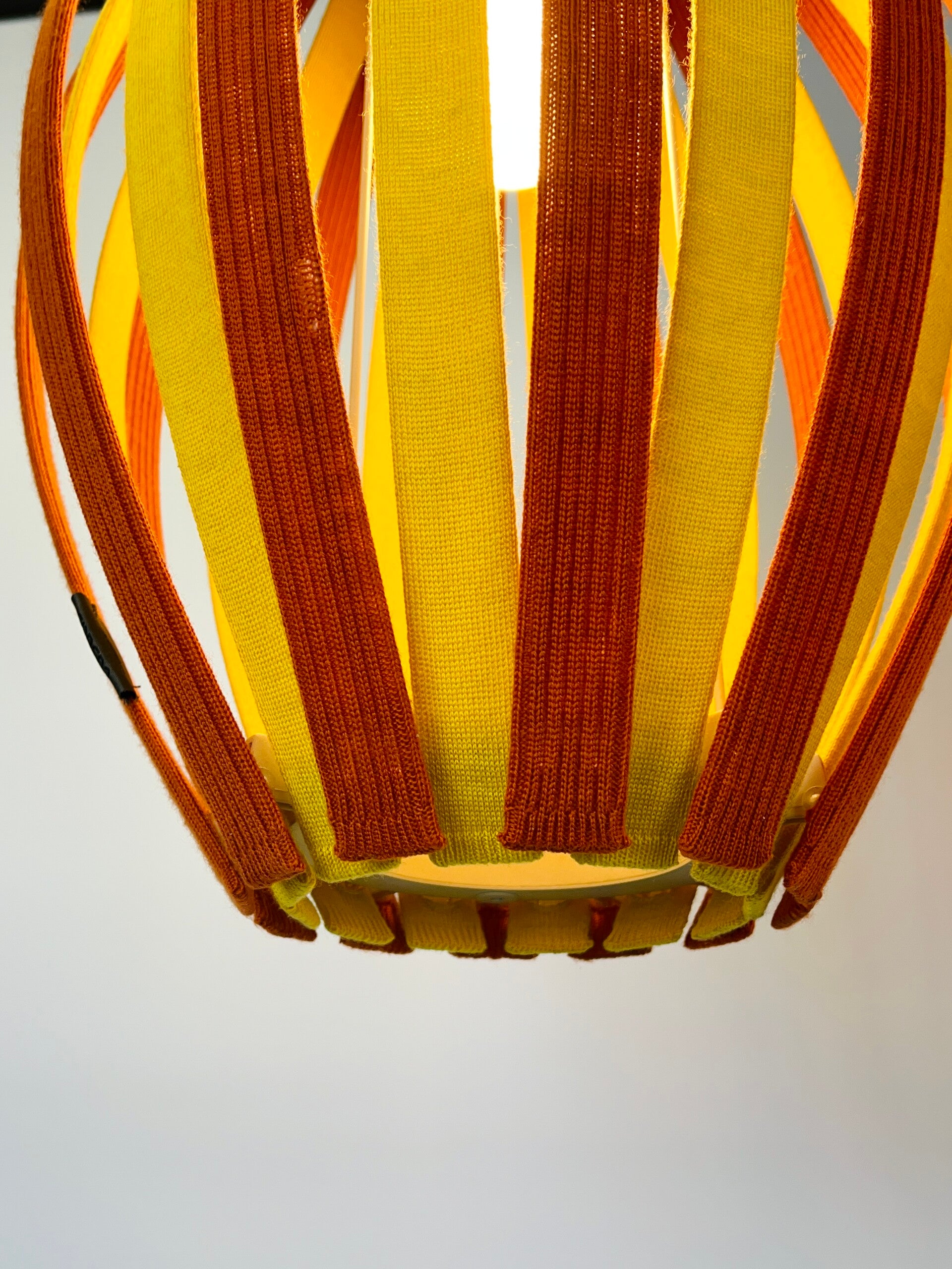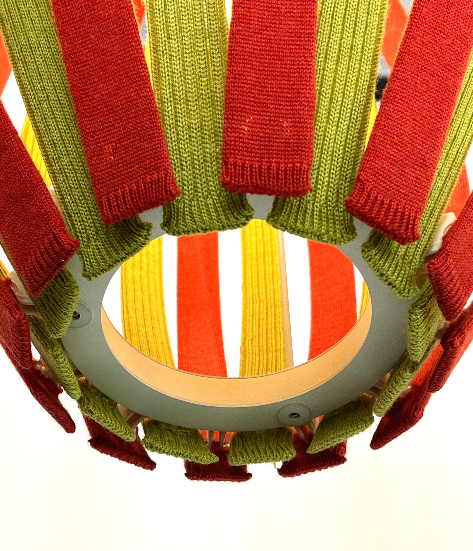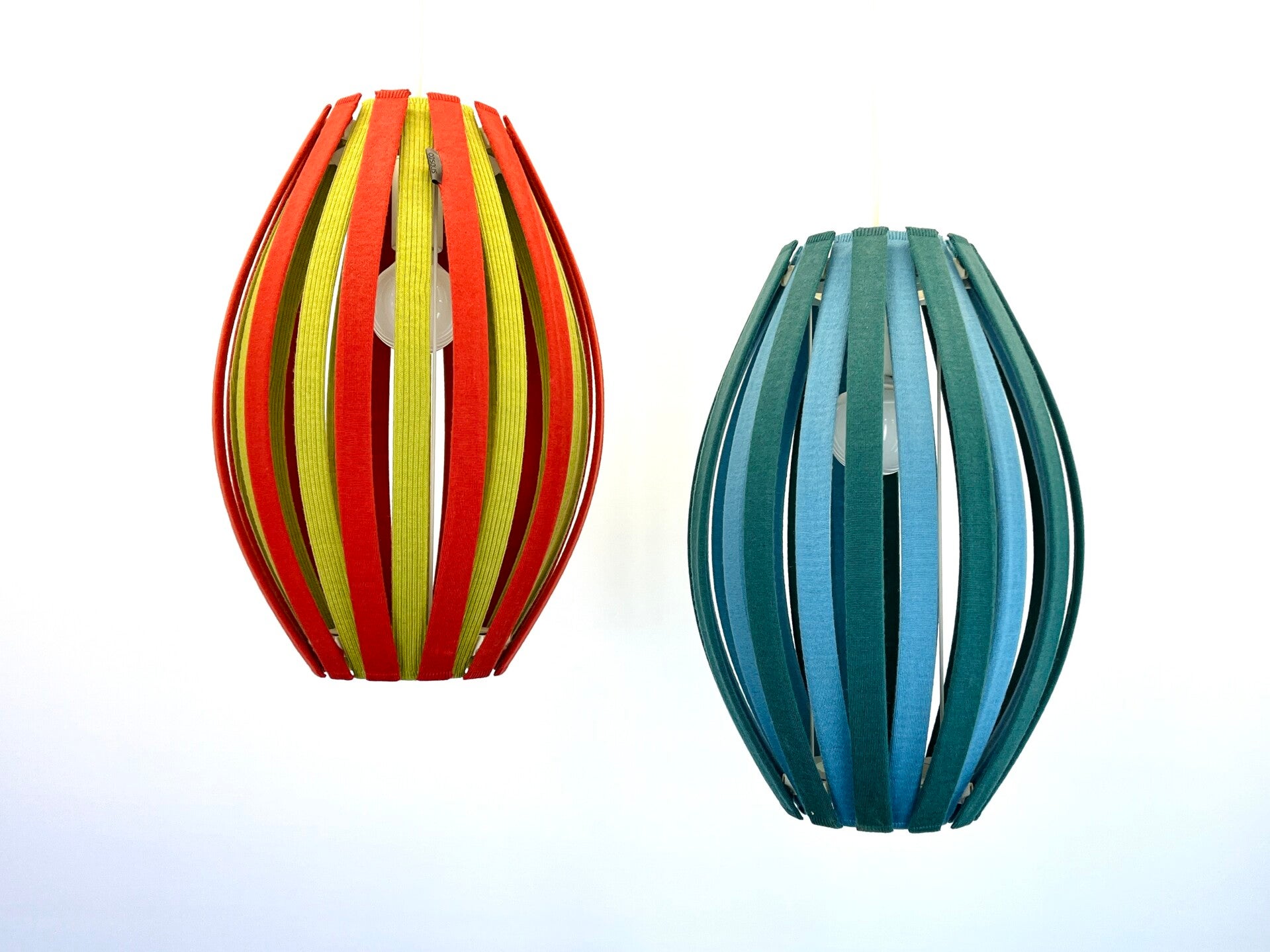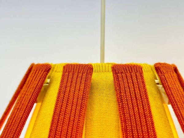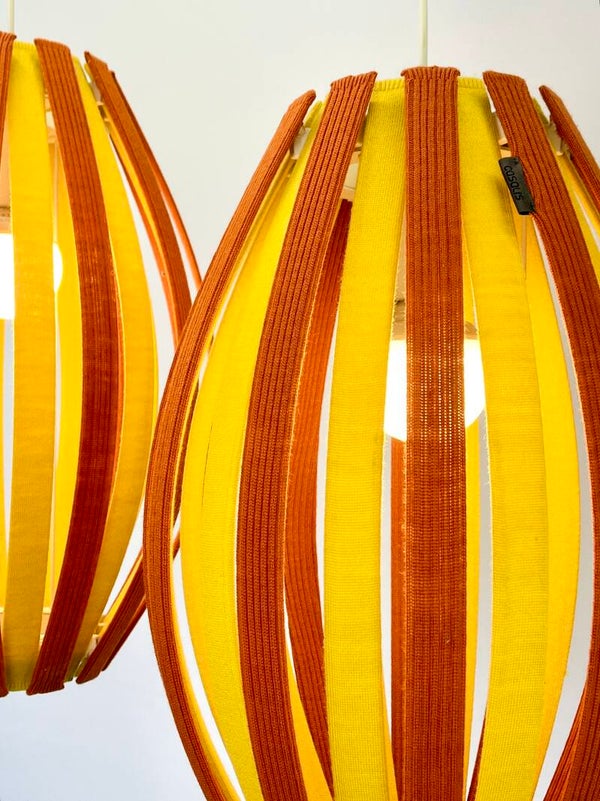 Colorful and attractive hanging lamp, constructed from slats covered with fabric covers made of Merino wool. Durable and colourfast wool with lifelong quality. The fabric covers are removable and can be washed if necessary. The principle is the same for every lamp, the slats can be removed very easily, the click system ensures a smooth operation.