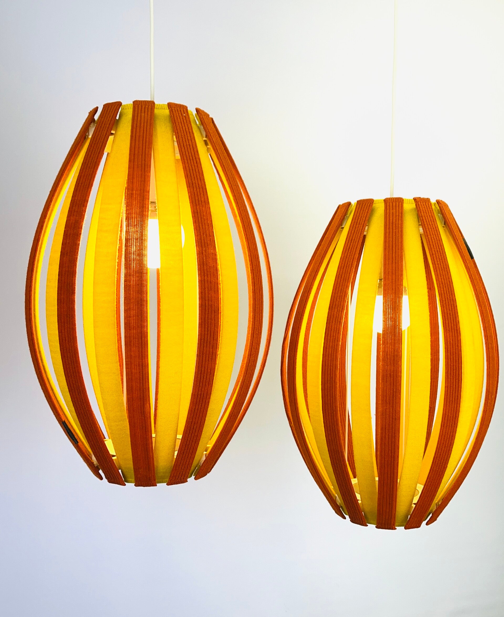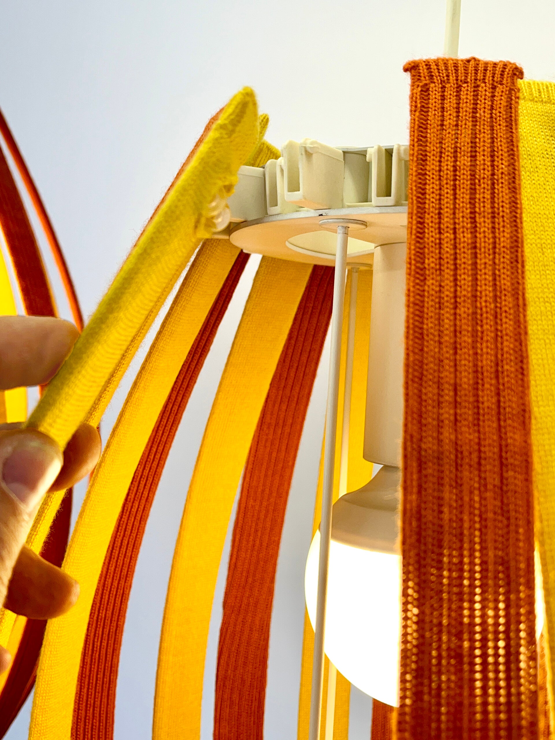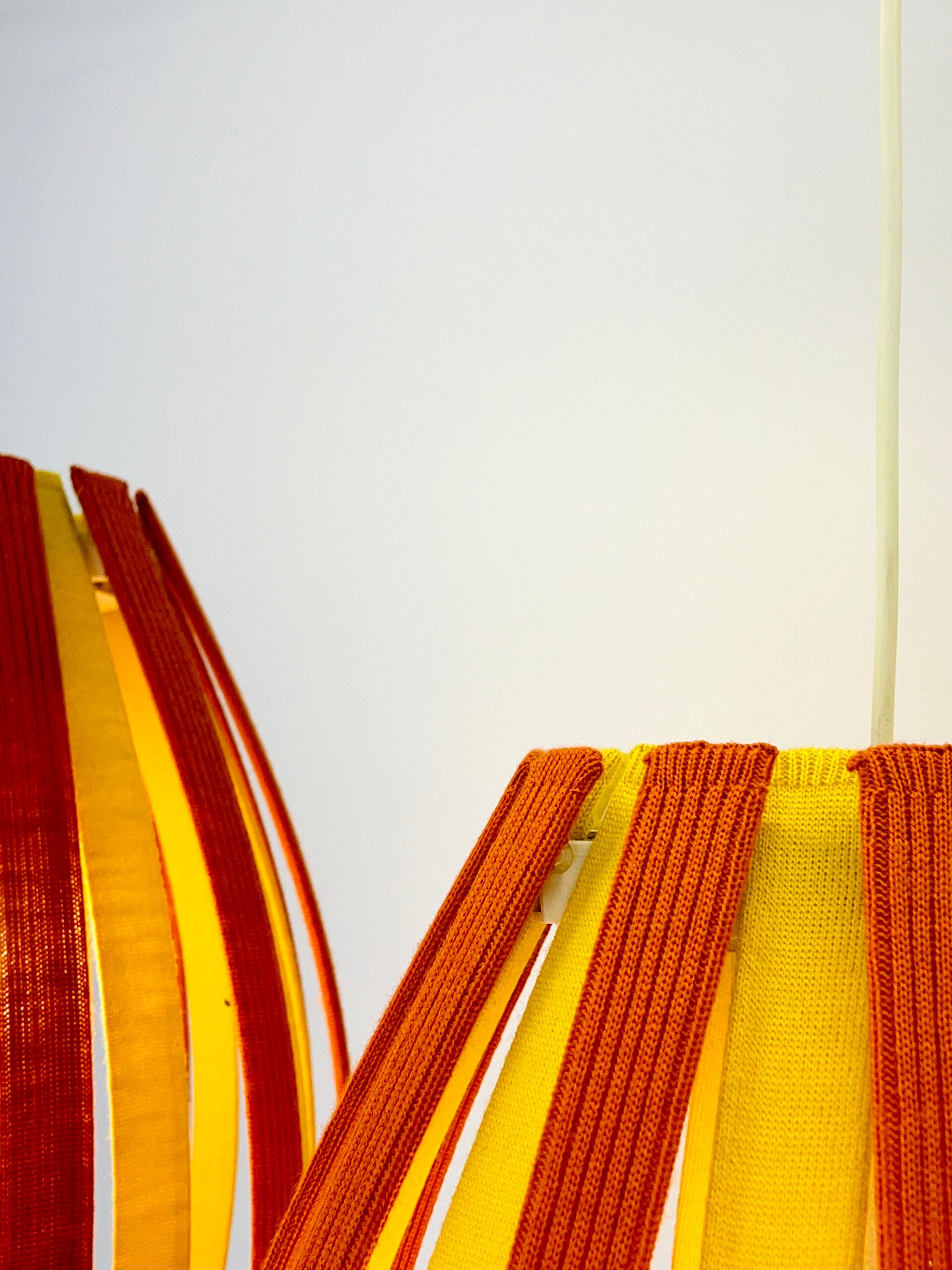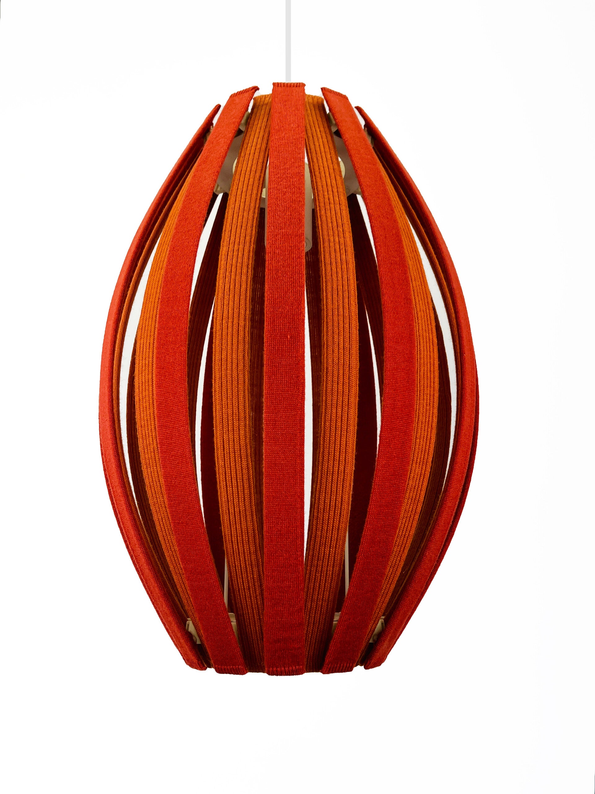 Colorful and attractive hanging lamp, constructed from slats covered with fabric covers made of Merino wool. Durable and colourfast wool with lifelong quality. The fabric covers are removable and can be washed if necessary. The principle is the same for every lamp, the slats can be removed very easily, the click system ensures a smooth operation.