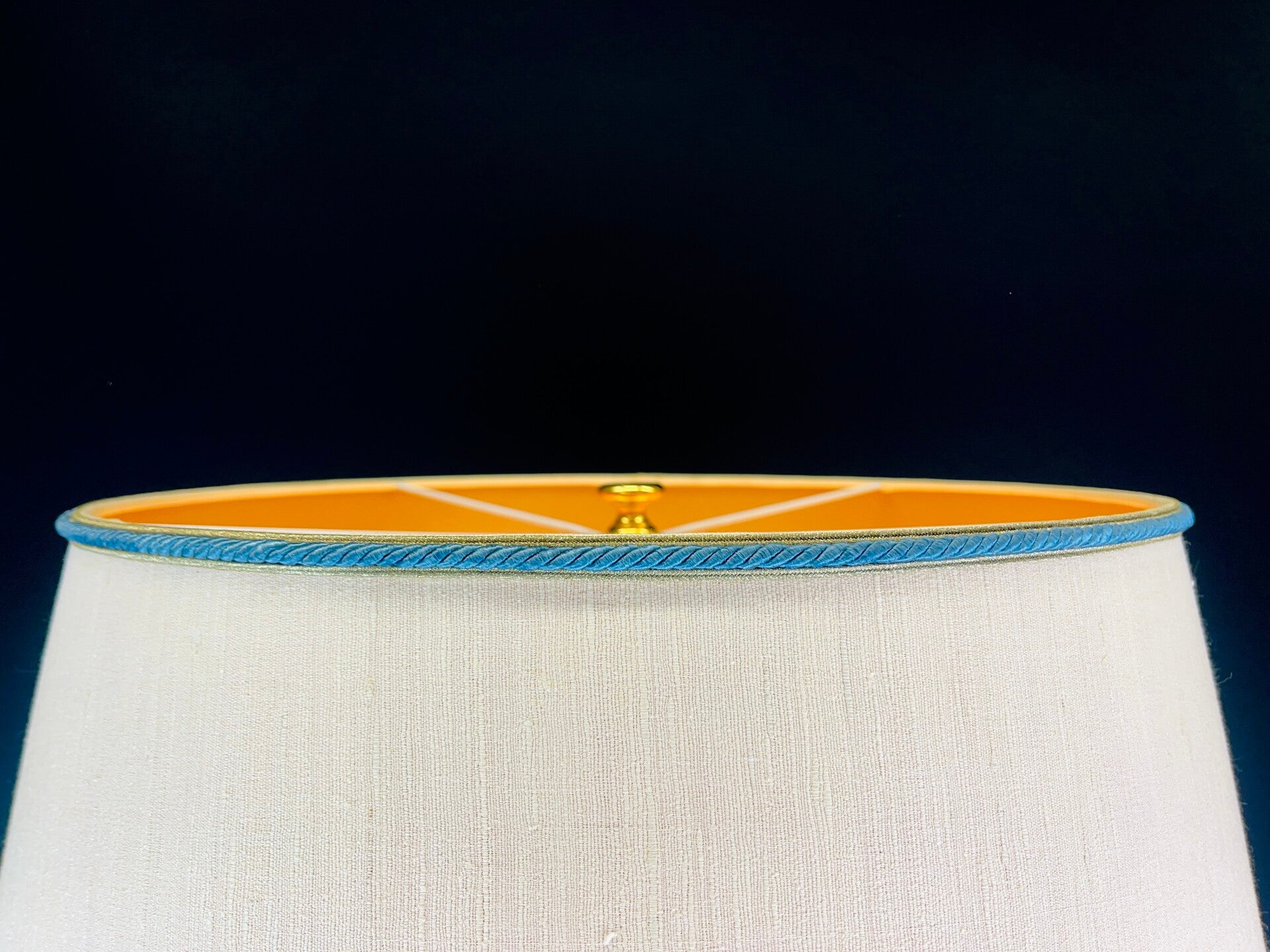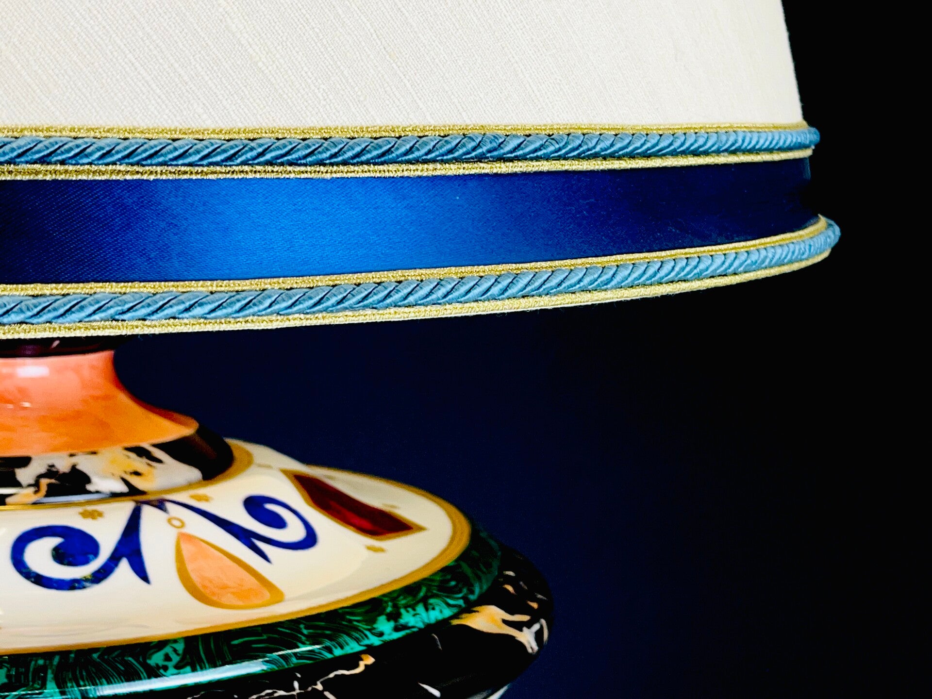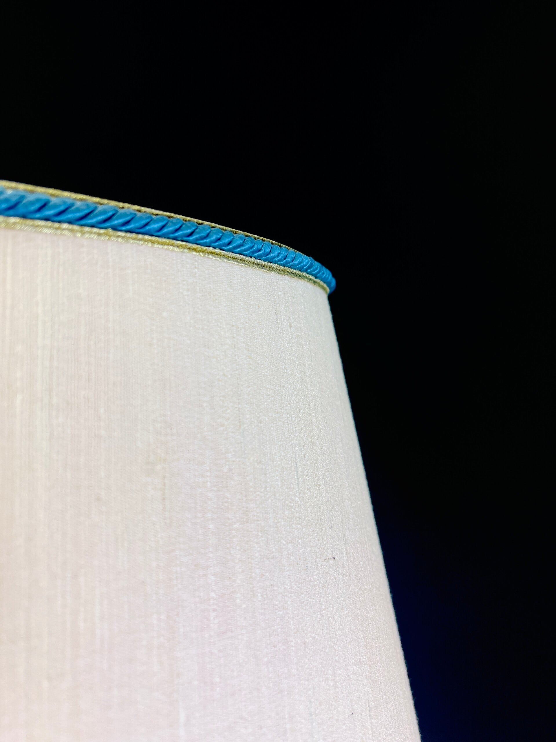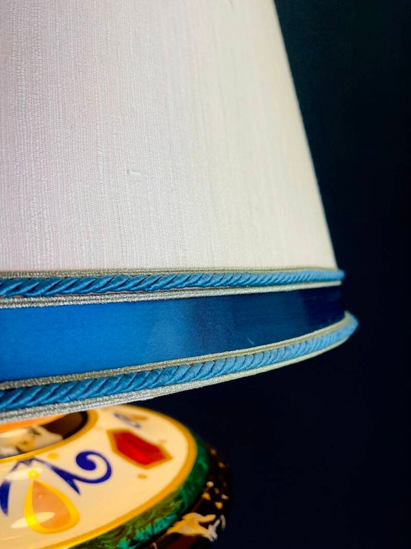 The lamp has a lampshade that was custom made by Mangani and fits perfectly with the theme, finished at the bottom with a wide band of satin fabric between two blue twisted cords and a gold rim. this was repeated at the top but without satin fabric. The lampshade is secured at the top with a brass screw cap. The satin band has small scratches in some places.