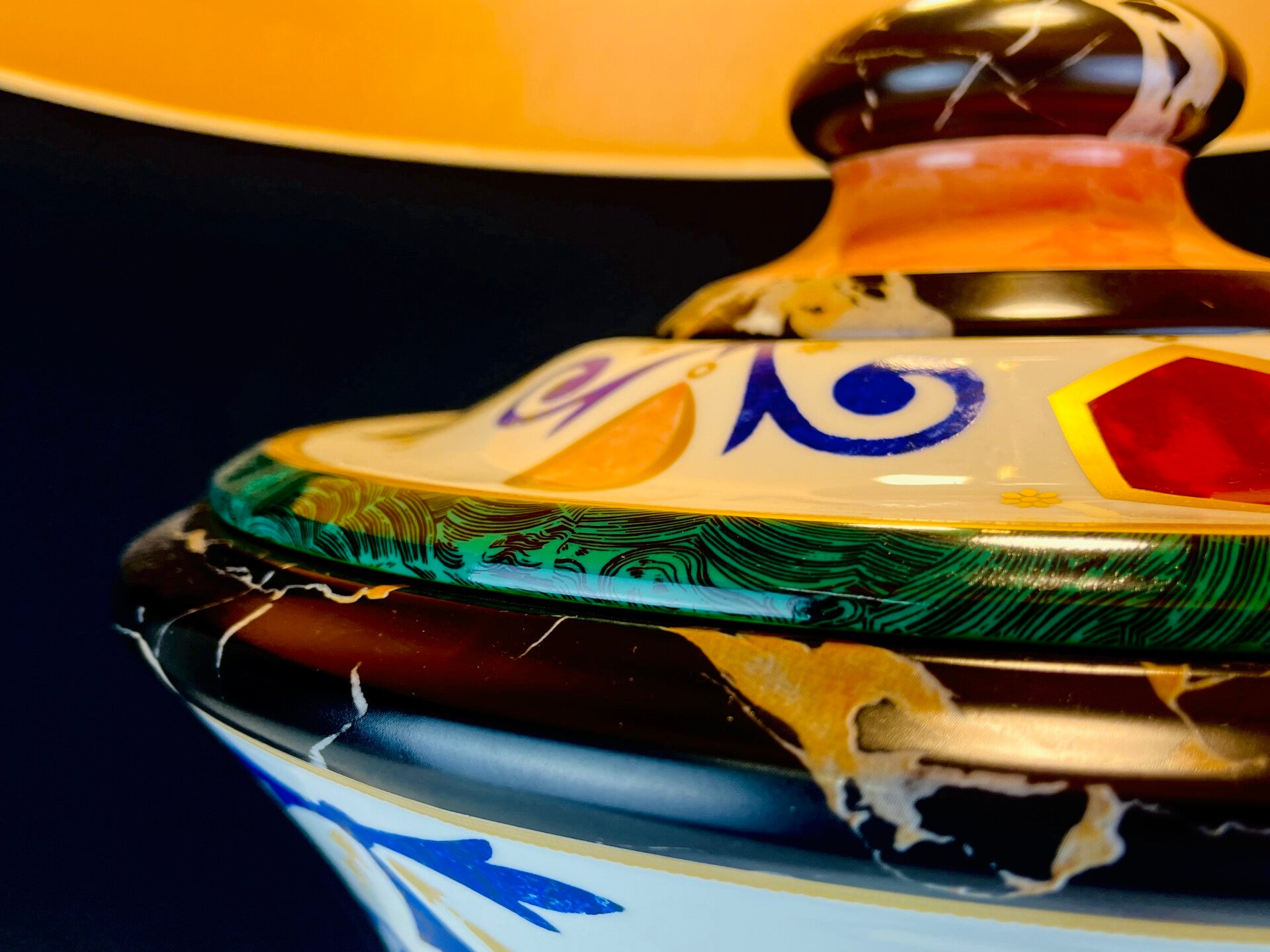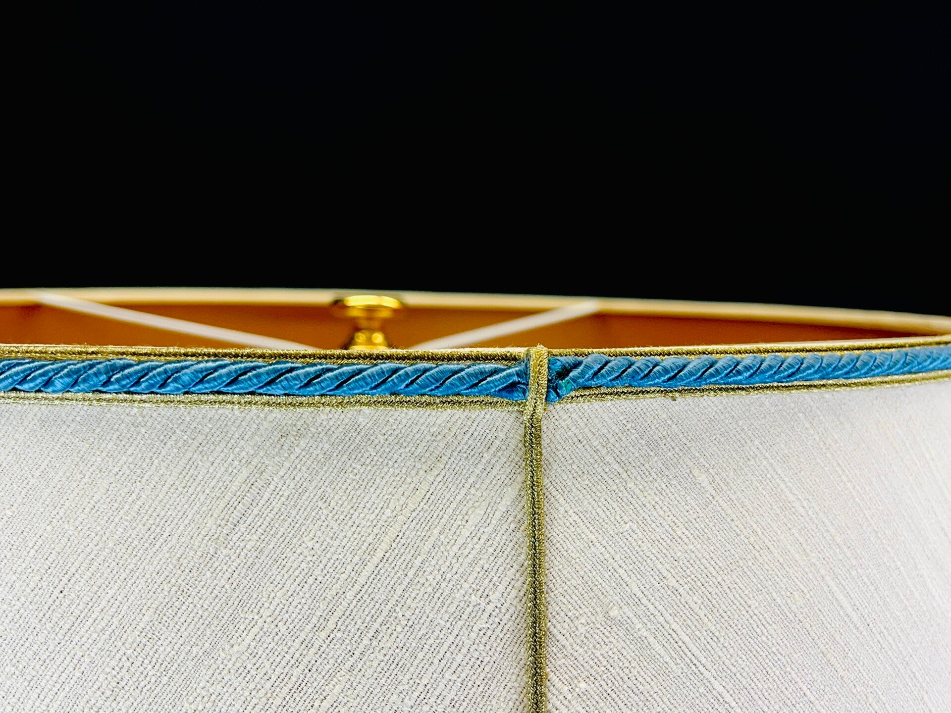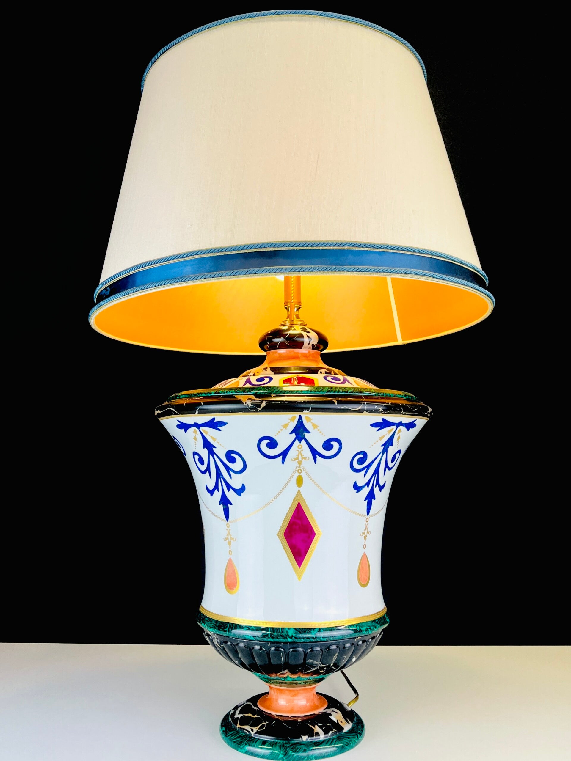 The lamp has a lampshade that was custom made by Mangani and fits perfectly with the theme, finished at the bottom with a wide band of satin fabric between two blue twisted cords and a gold rim. this was repeated at the top but without satin fabric. The lampshade is secured at the top with a brass screw cap. The satin band has small scratches in some places.