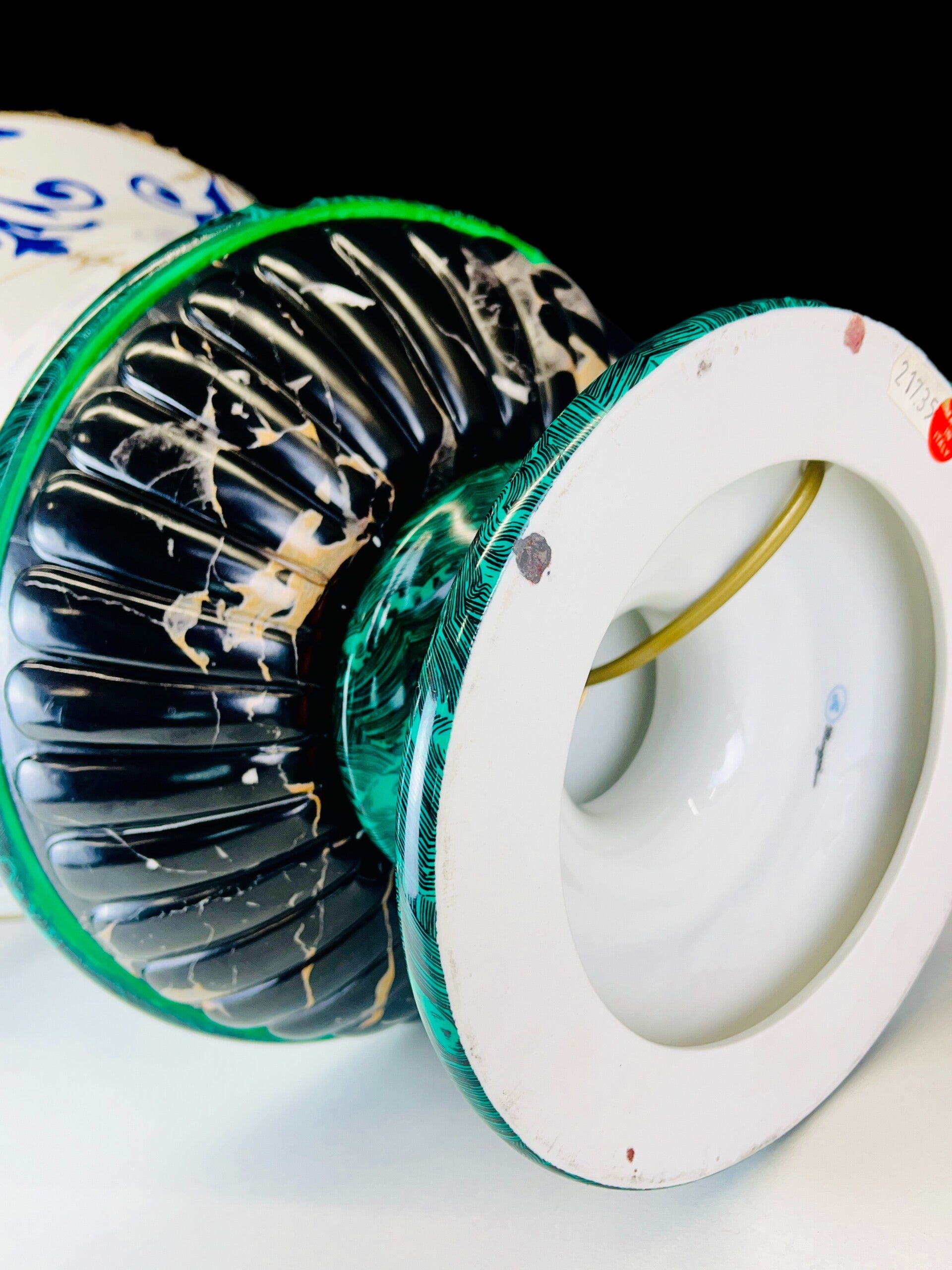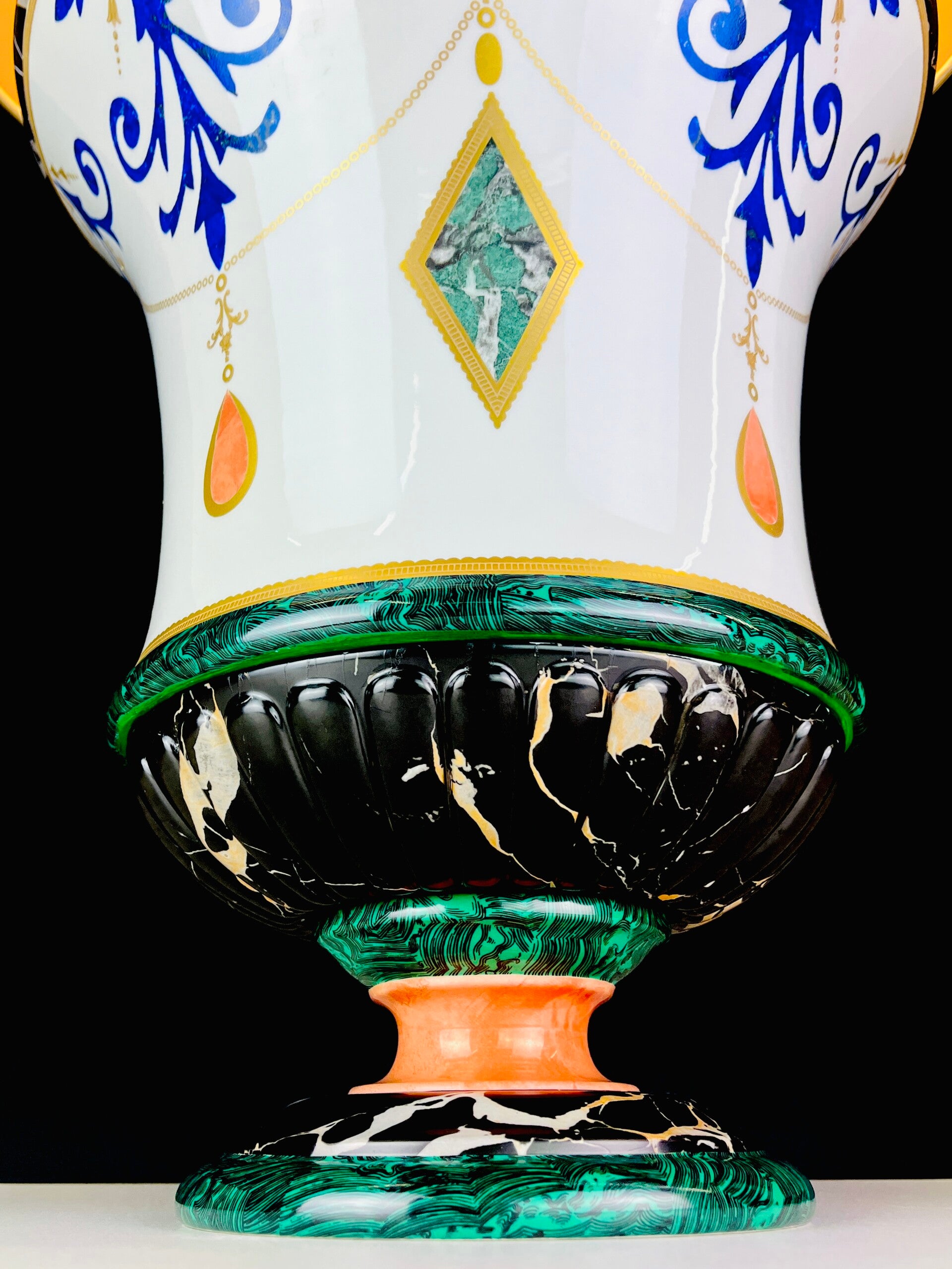 Made of porcelain, in an unprecedented pattern of marble, malagite. An Italian style reminiscent of Pietra Dura designs. Mangani has chosen the most high-quality finish for these piece.