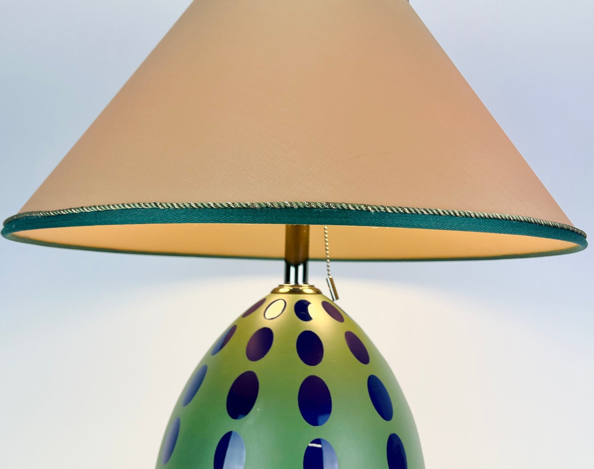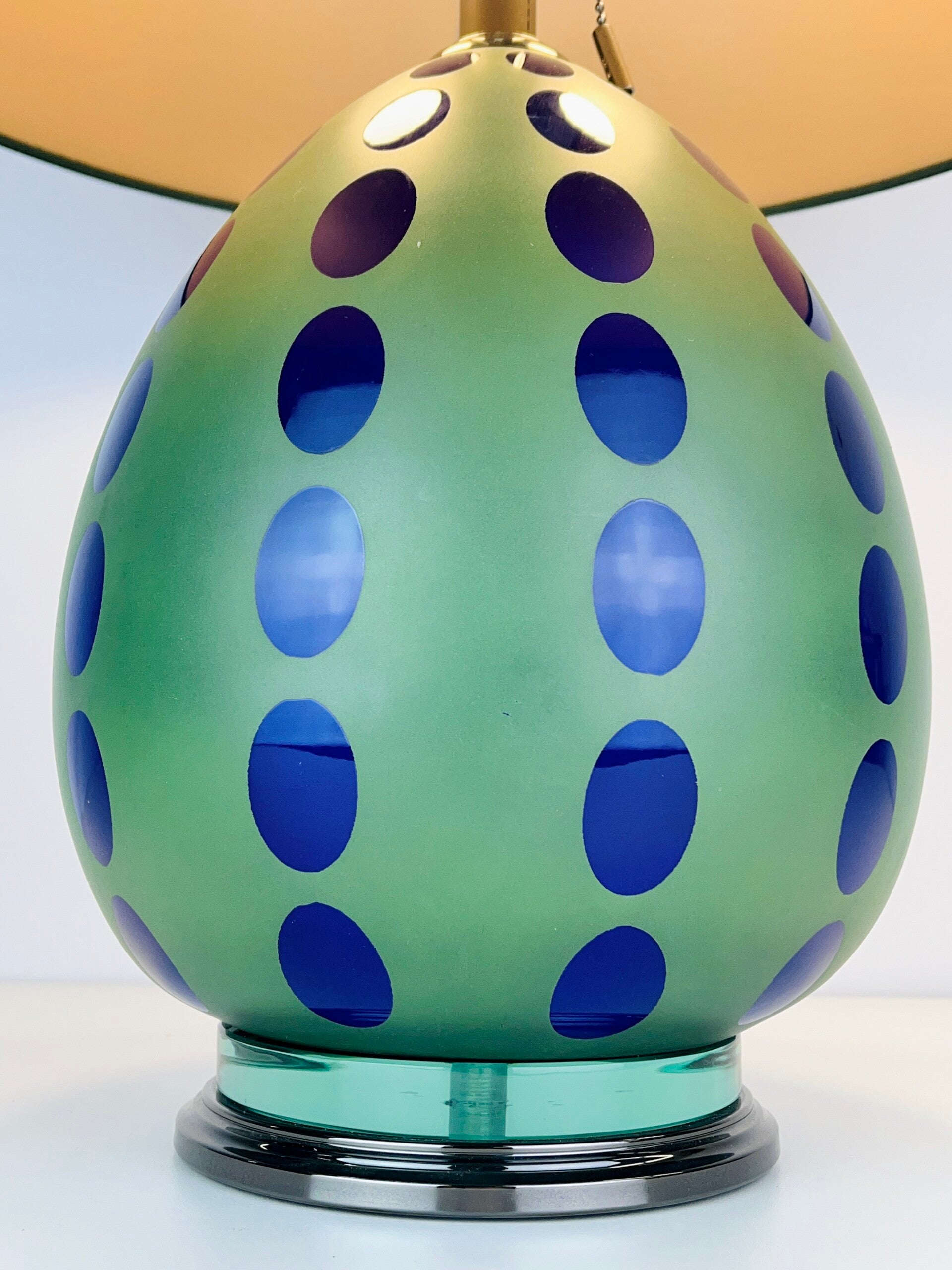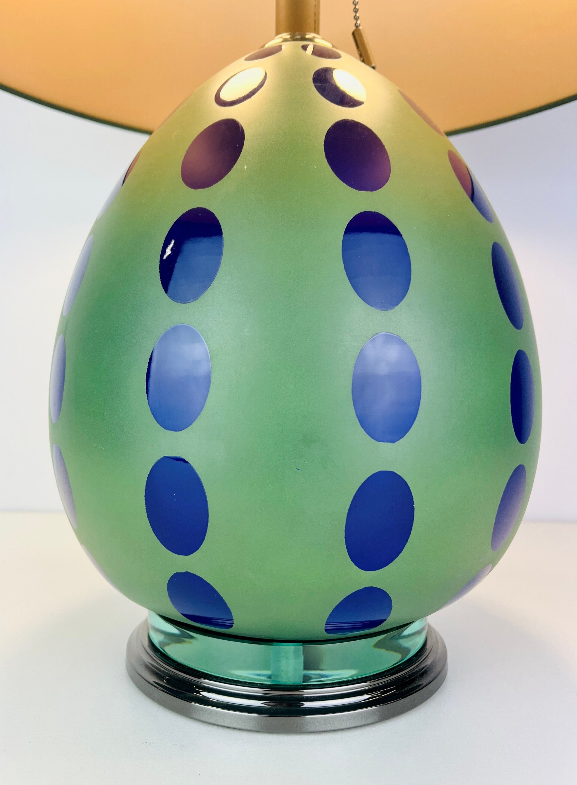 Very decorative table lamp made of porcelain, cheerful finish of blue spheres on a spherical green base, mounted on a metal base that is finished in gunmetal high-gloss lacquer, the support rod is also finished in this material.