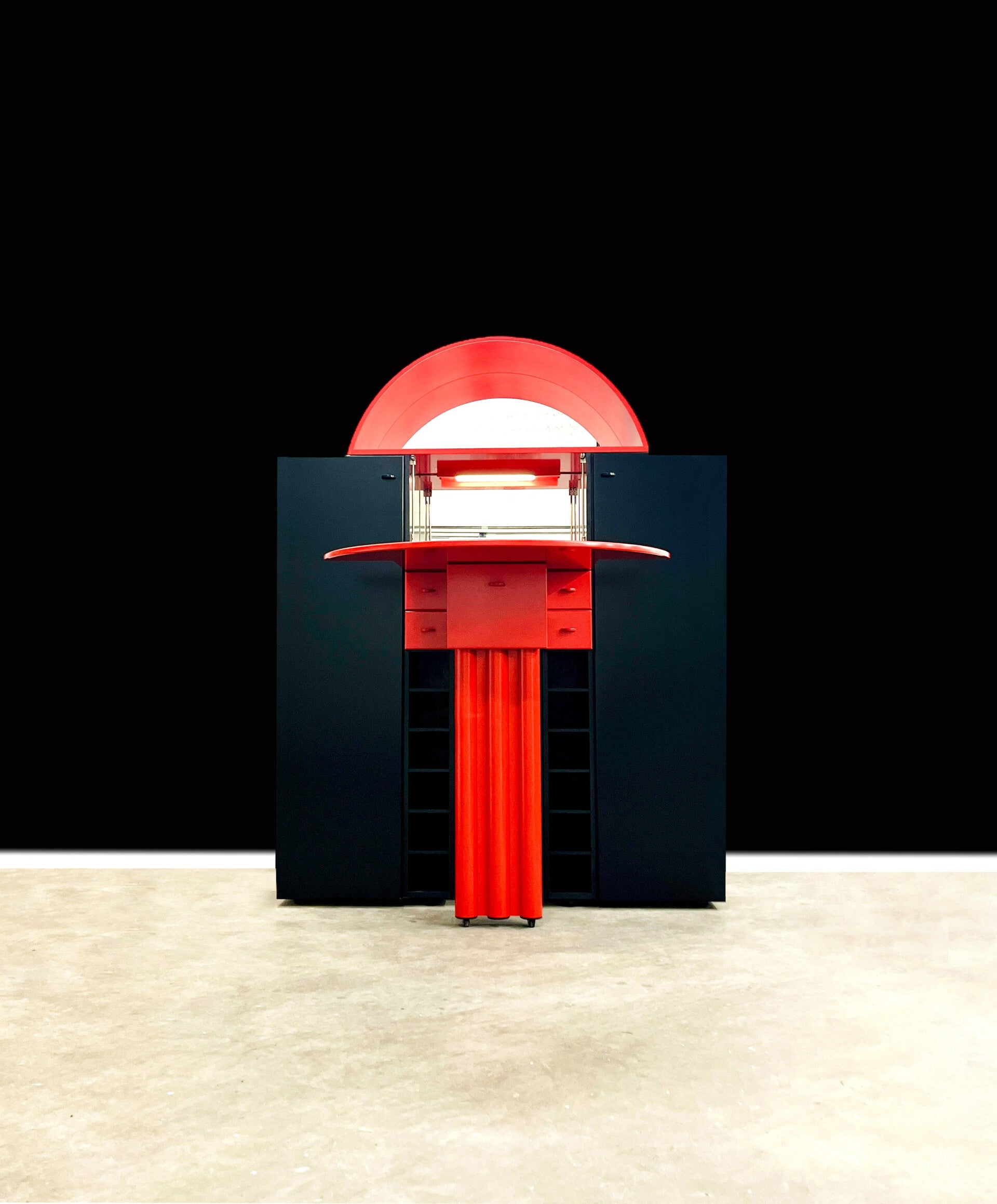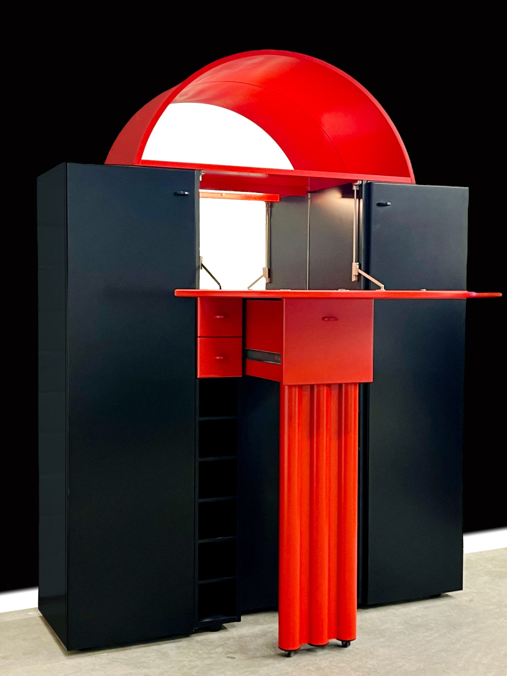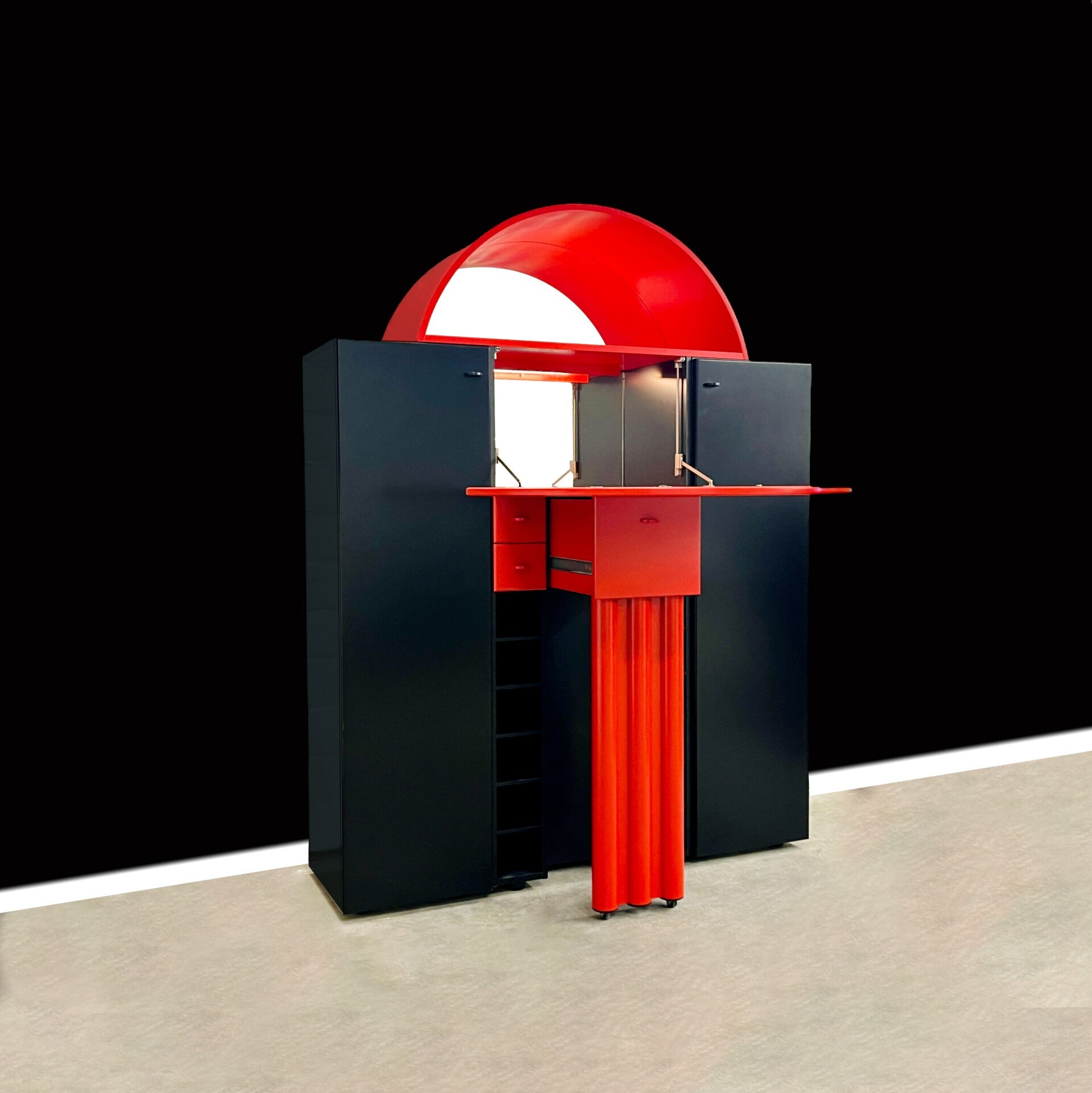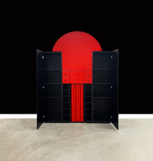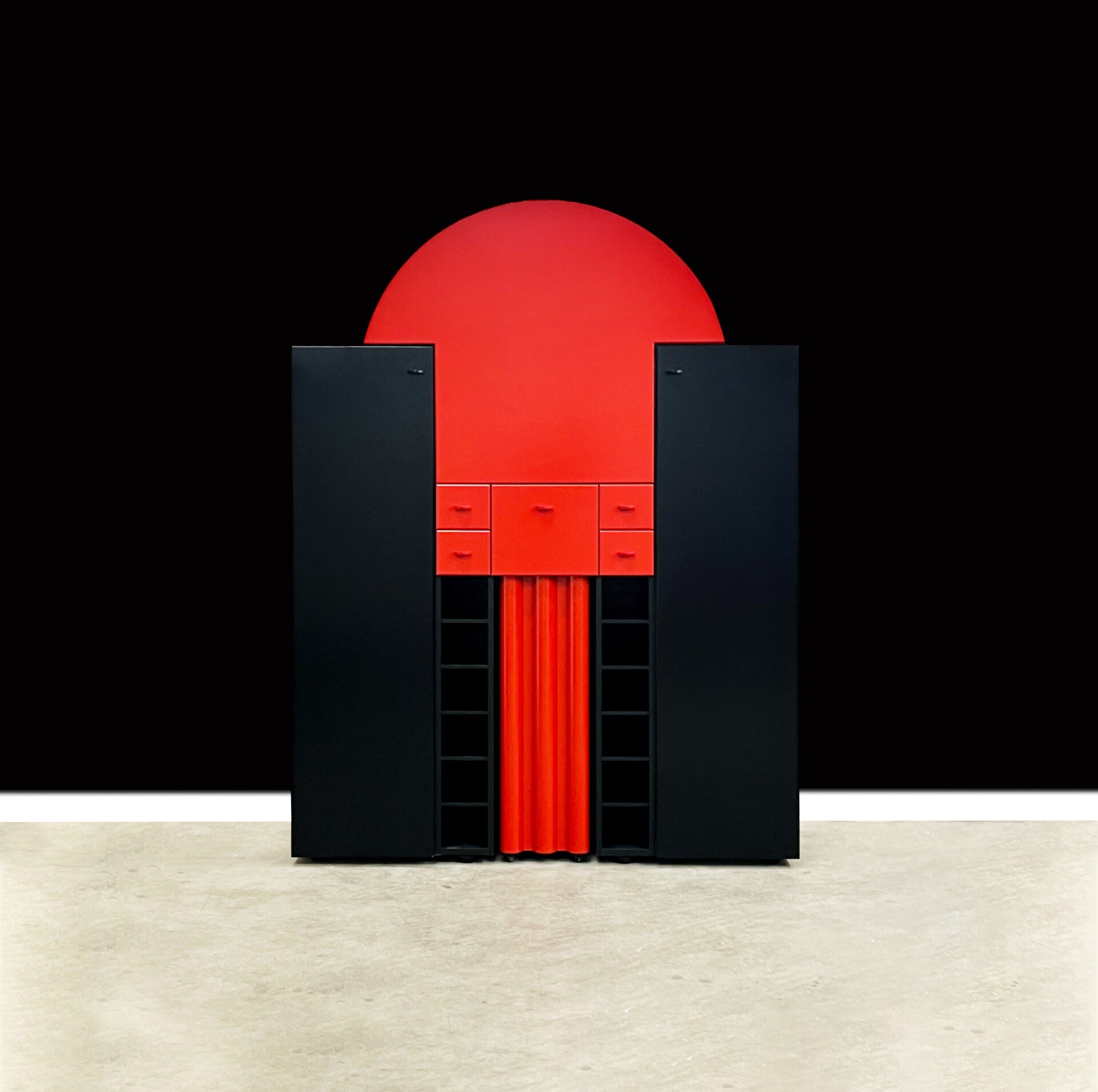 Black and red laminated wood, a central drawer unit with small drawers, in the middle a large drawer with a group of cylindrical columns as a double function which supports the table top of the cabinet. There is a mirror incorporated in the bar cabinet and above in the semi-red circle. Sufficient storage space with three shelves each on the left and right behind the high black doors.