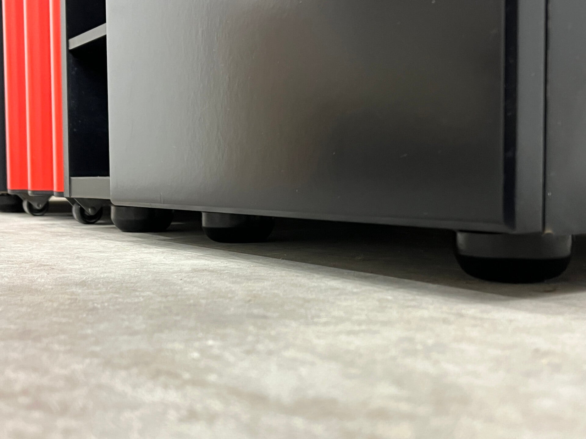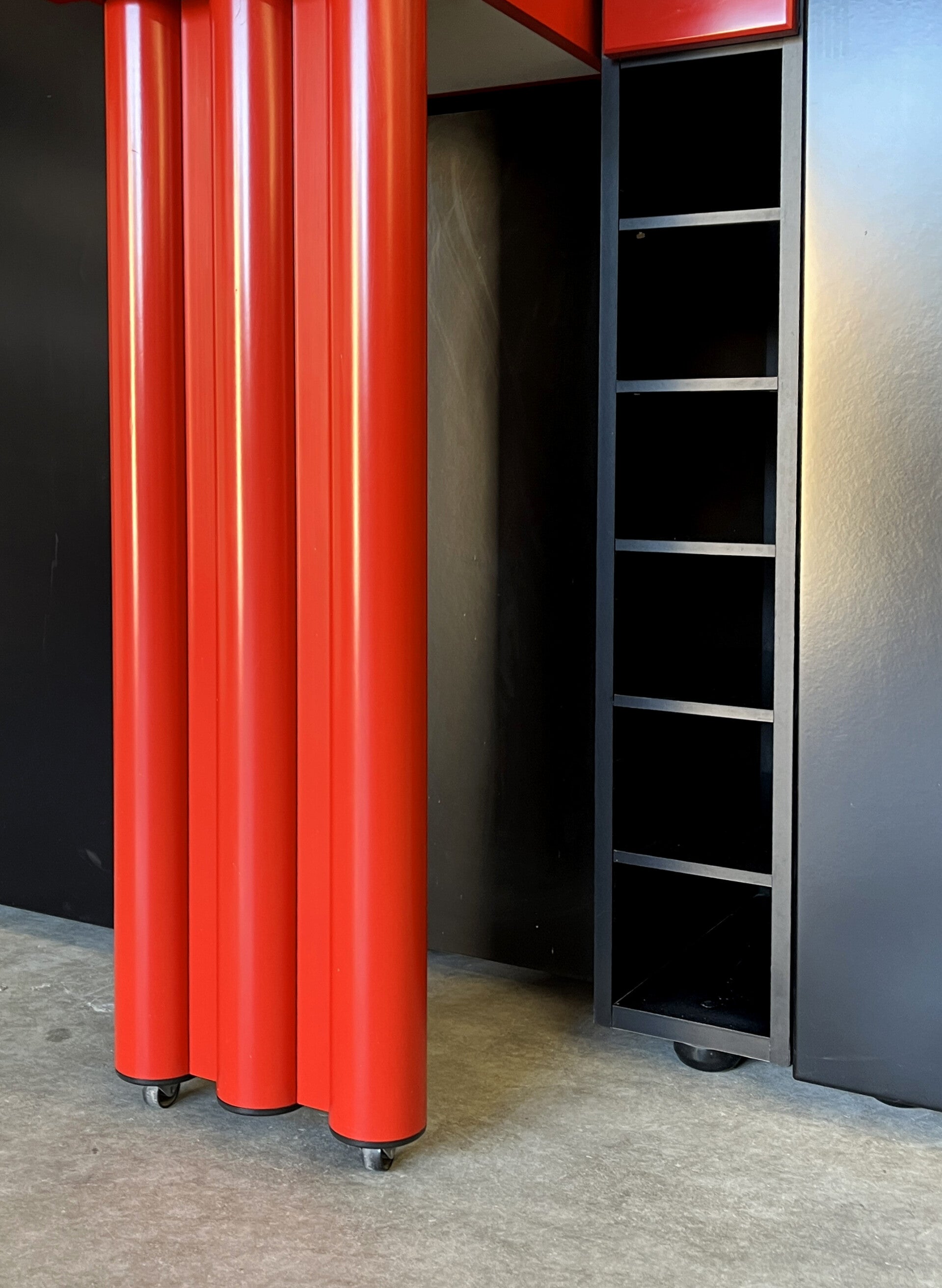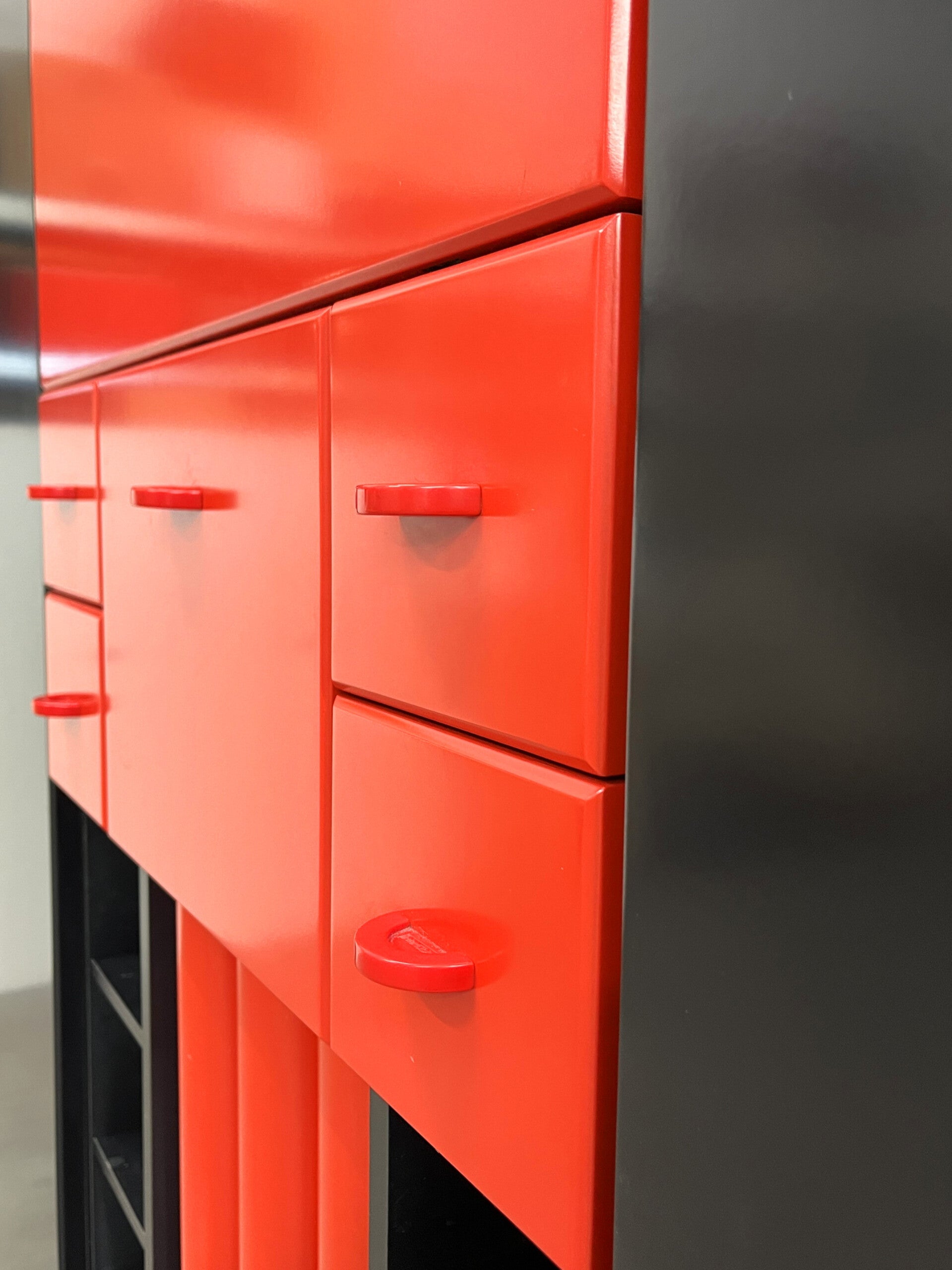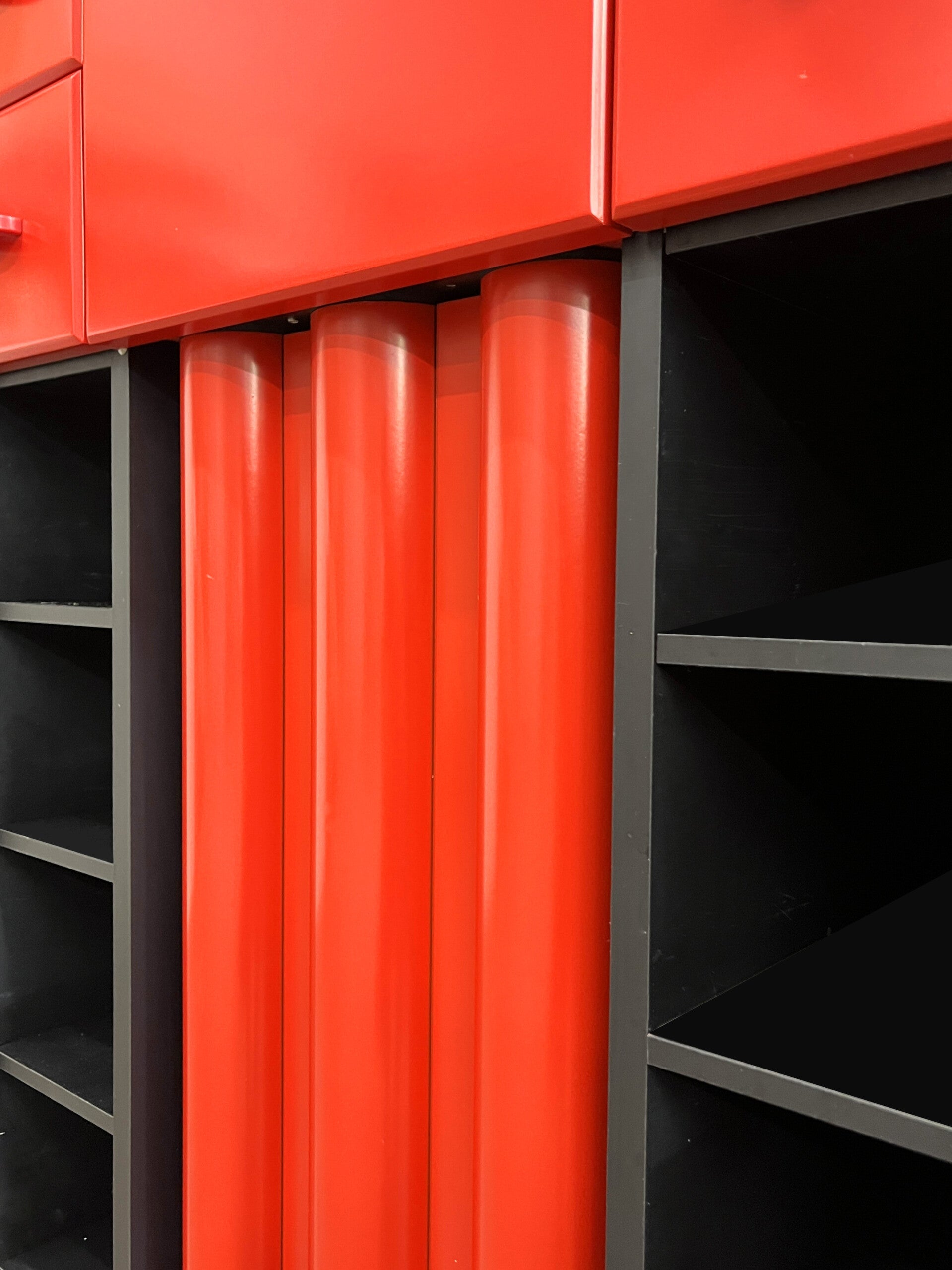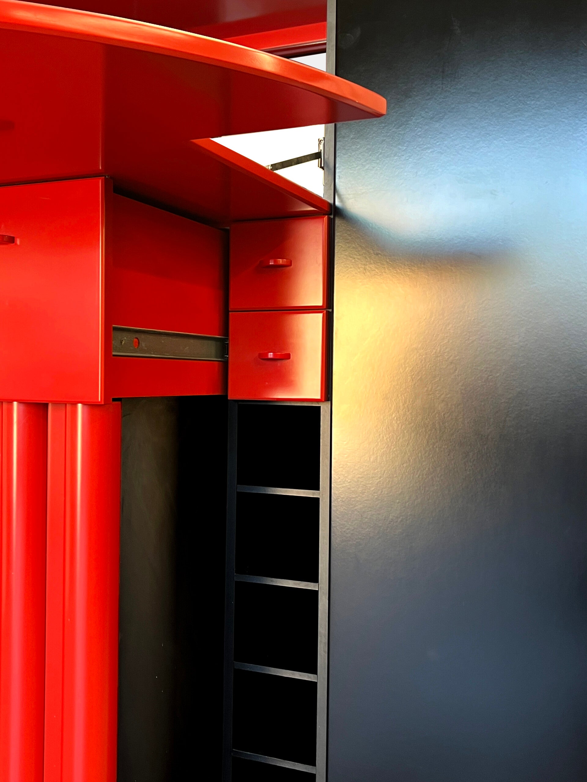 Black and red laminated wood, a central drawer unit with small drawers, in the middle a large drawer with a group of cylindrical columns as a double function which supports the table top of the cabinet. There is a mirror incorporated in the bar cabinet and above in the semi-red circle. Sufficient storage space with three shelves each on the left and right behind the high black doors.