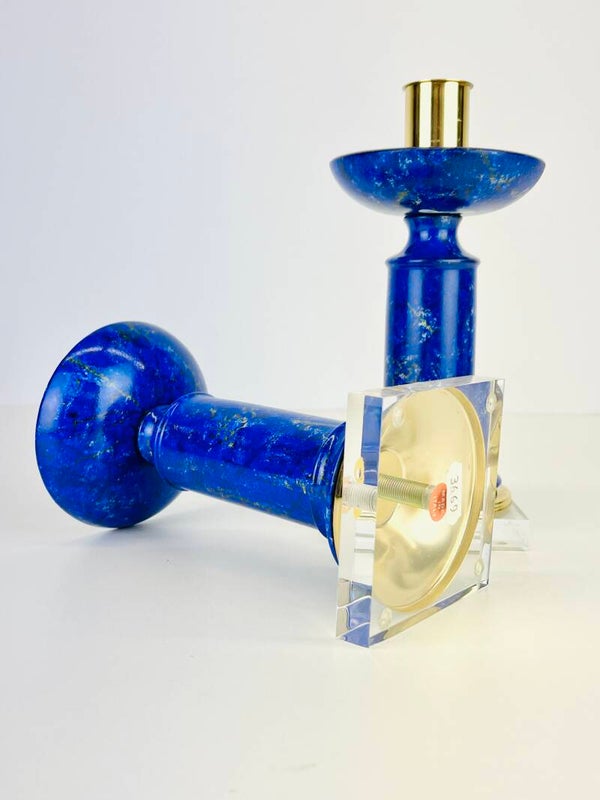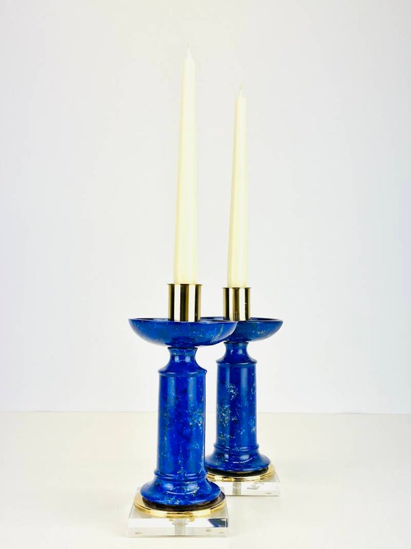 Beautiful set of candlesticks in cobalt blue mounted on a clear plexiglass base and brass parts.