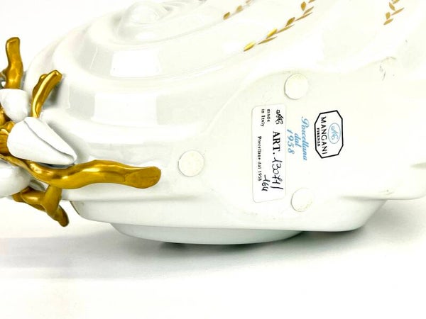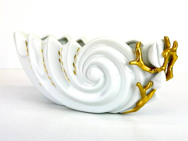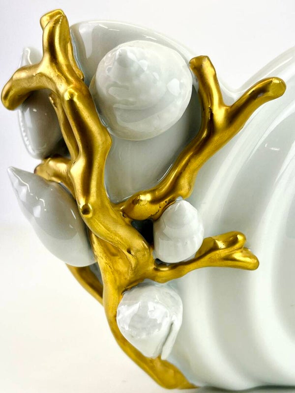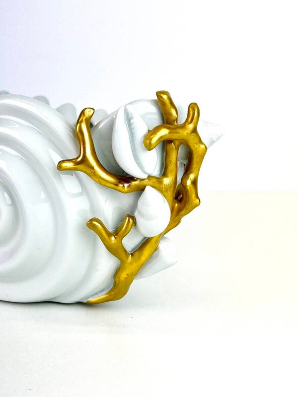 Presented with a white glazed coupe decorated with crustaceans and gold-covered coral.