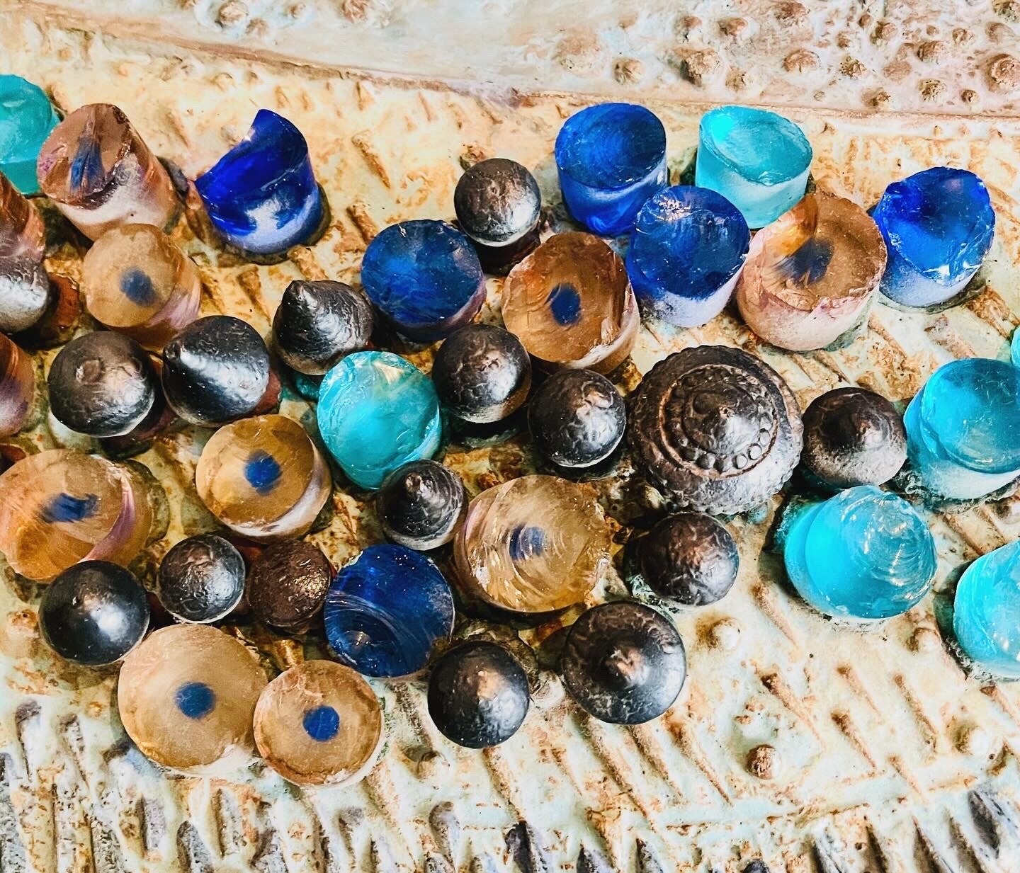 Exceptional bas-relief Amphora flatfish by Rogier Vandeweghe from the 1970s, decorated with glass elements and ceramic cones.