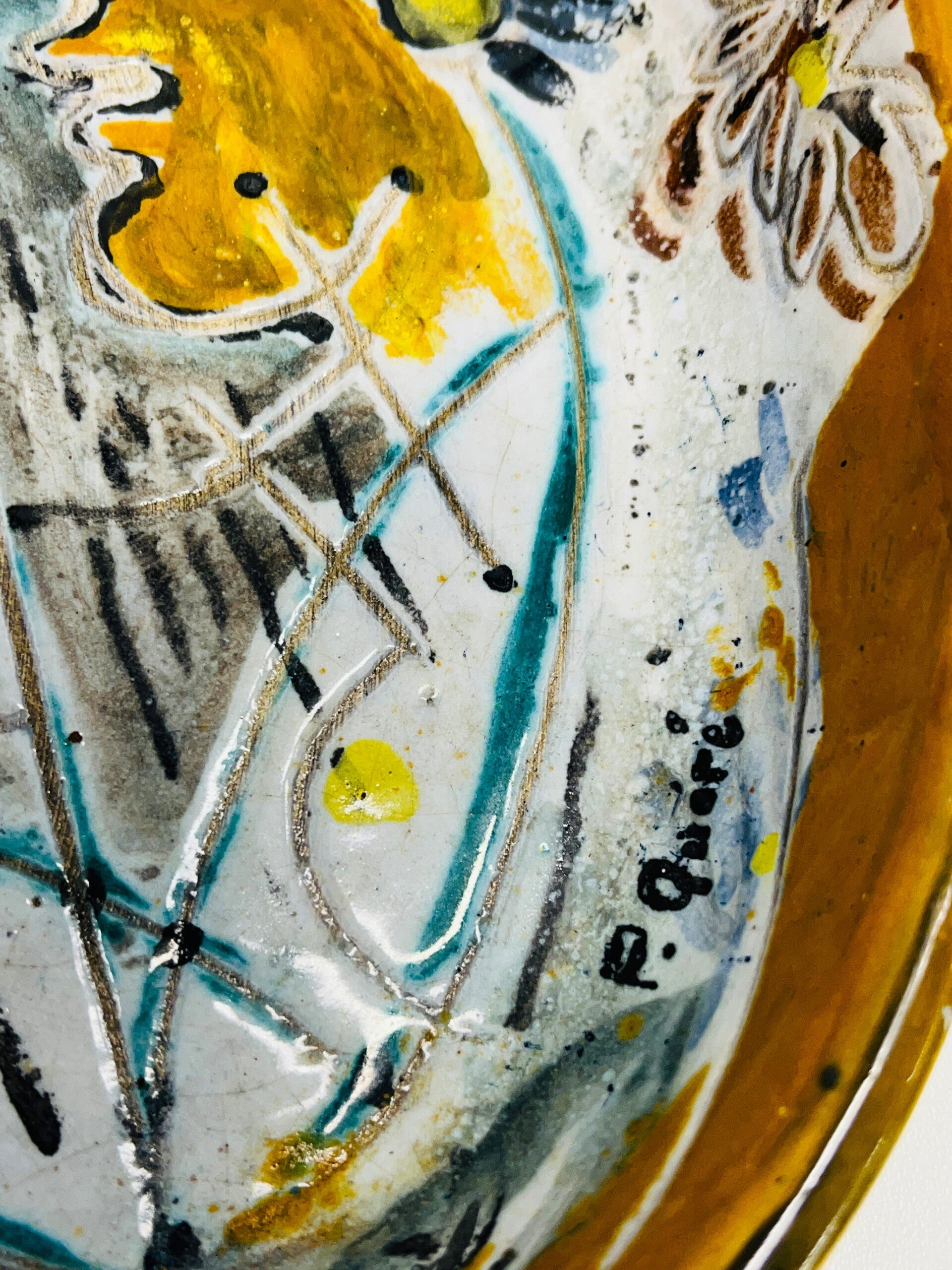 Special platter with a remarkable decor by Paul Quéré that clearly comes from the Pablo Picasso period at the end of the 1940s and early 1950s. The bowl is marked on the back with Allix (Michel Alexandrov), which indicates a collaboration between the ceramists. These three are contemporaries and spent the same period in Vallauris.