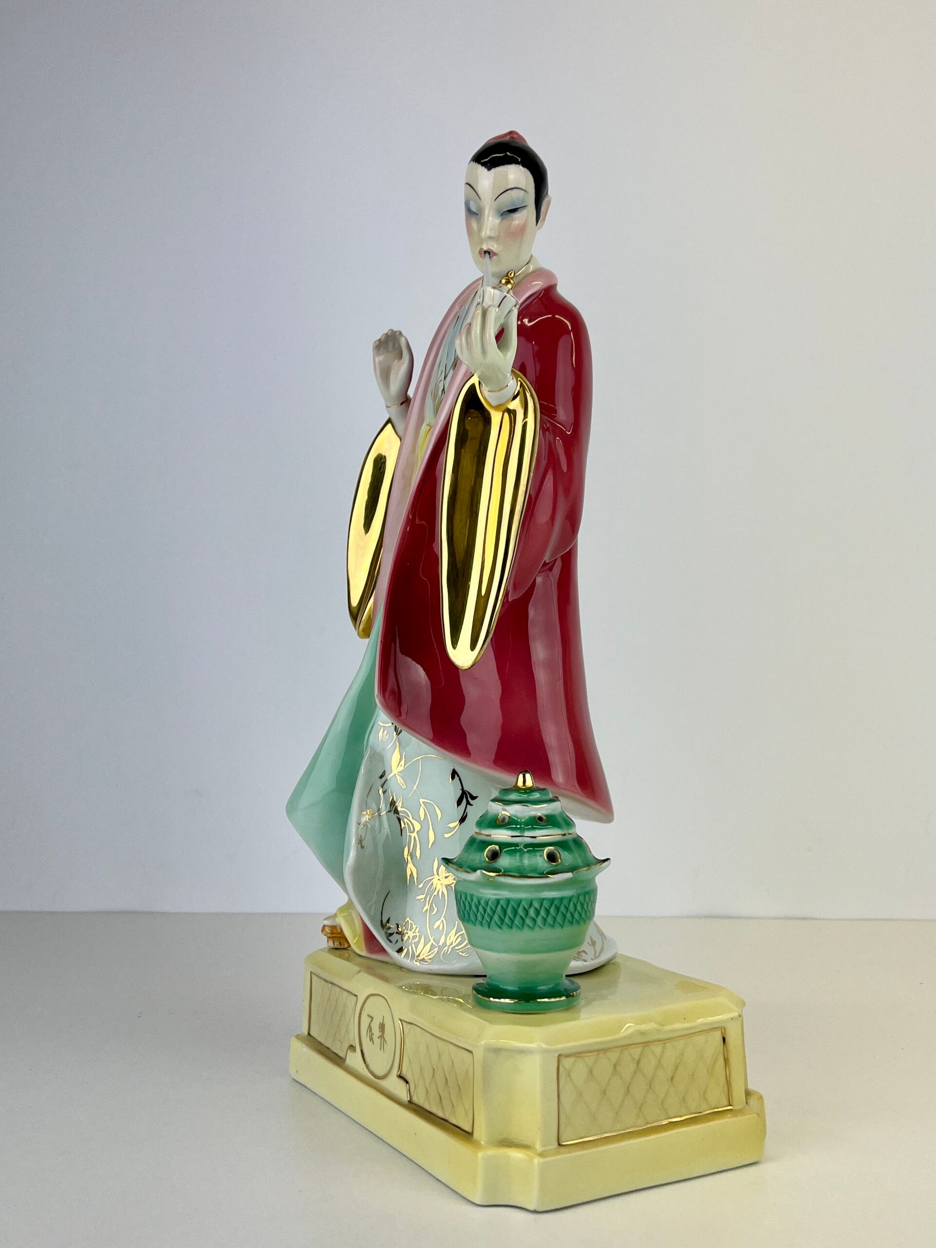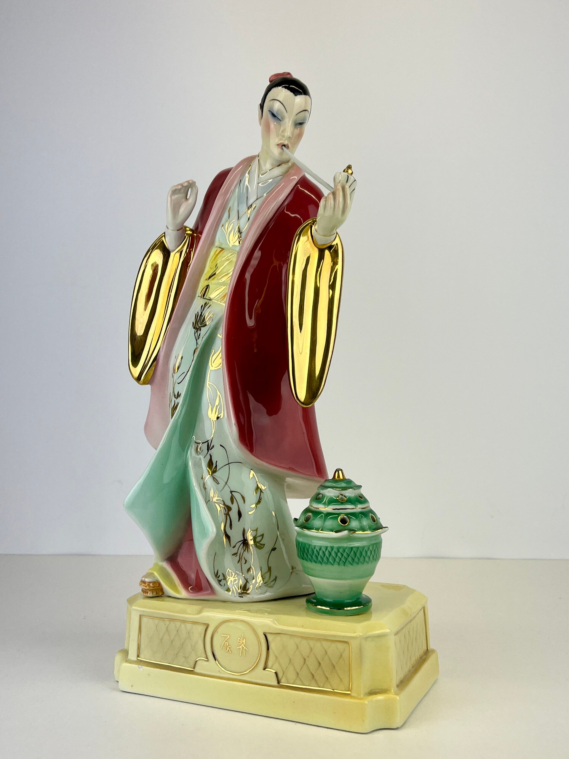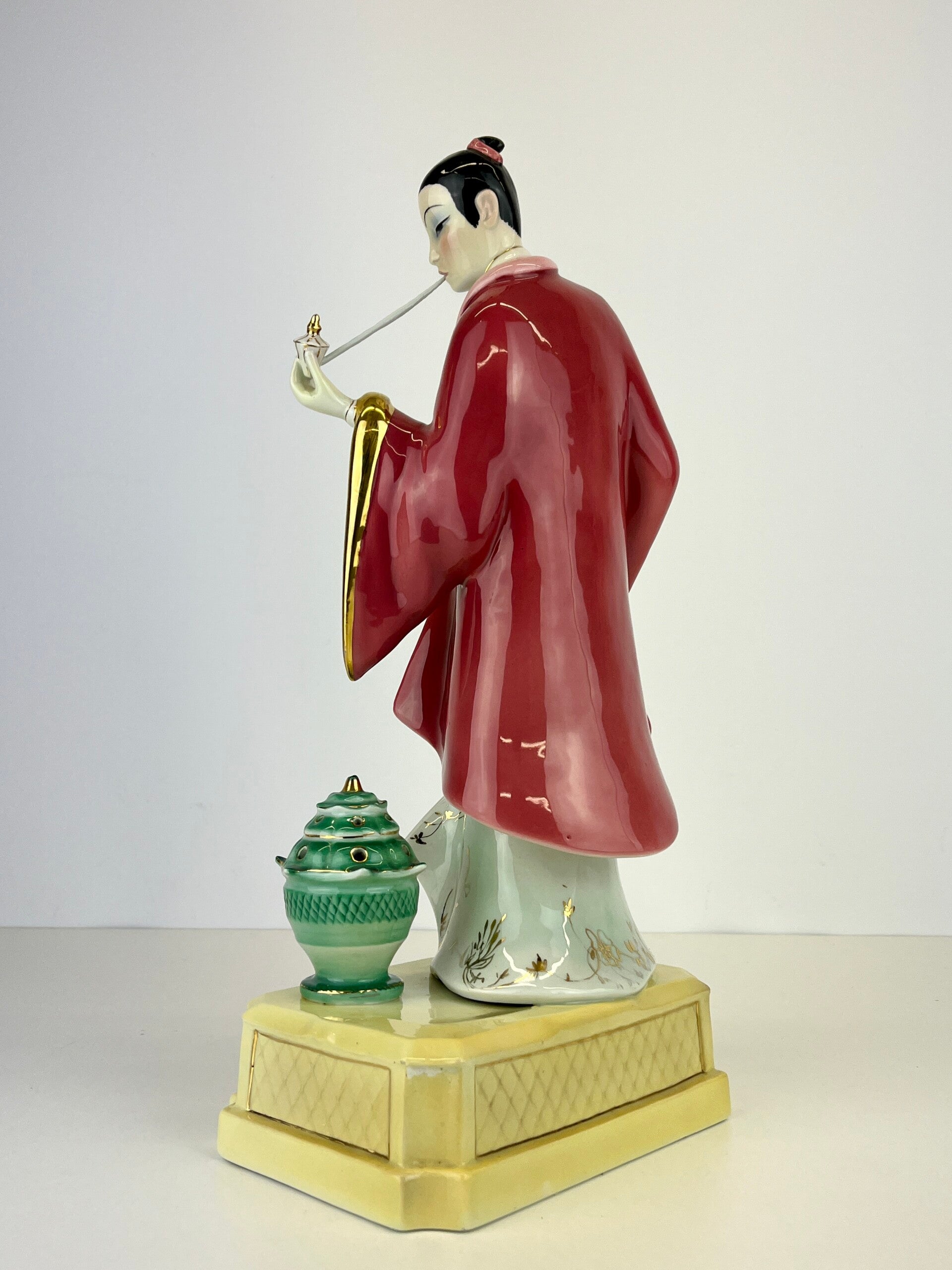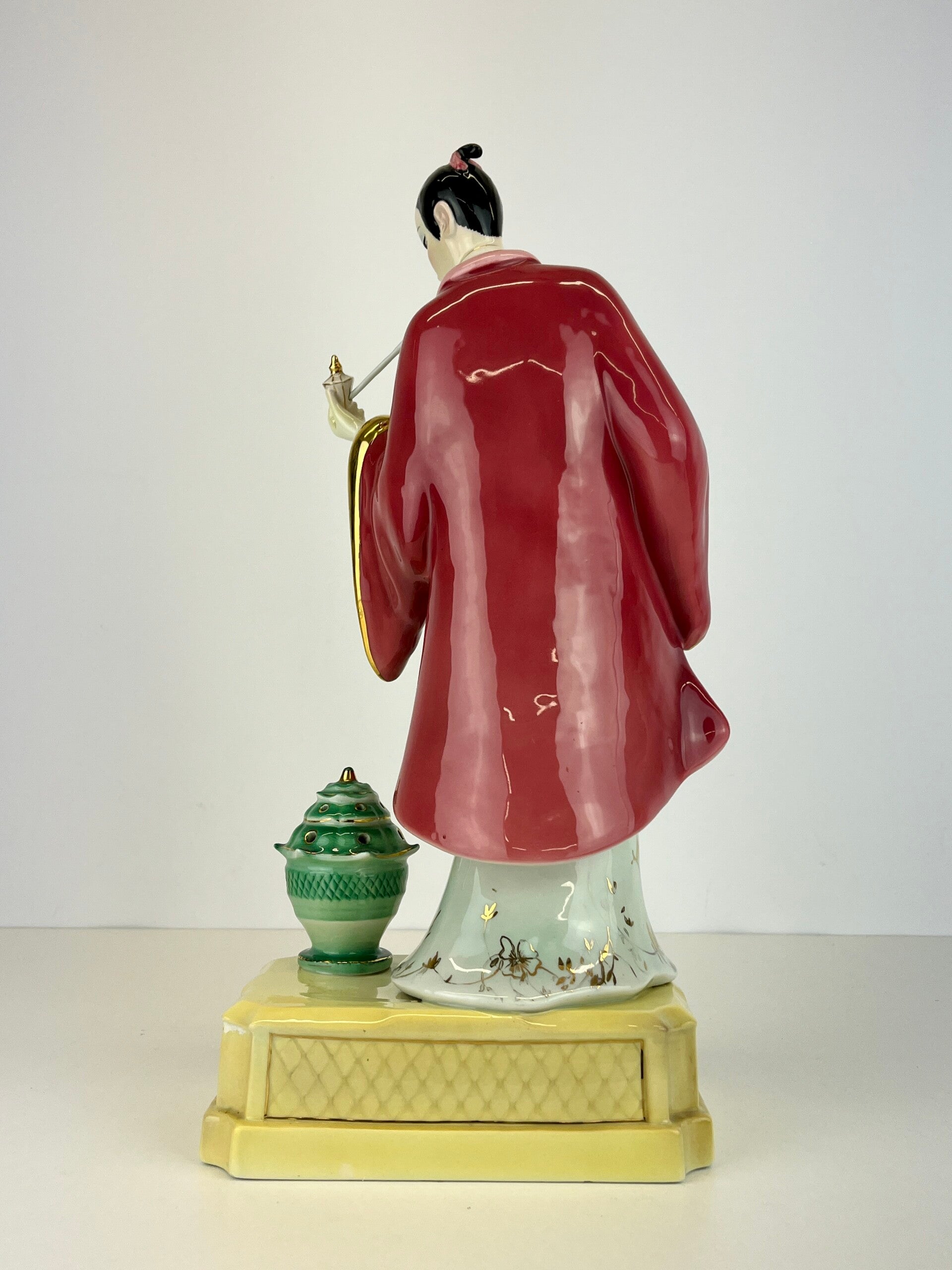 Special piece by Giovanni Ronzan from the 1940s. Asian man in traditional costume mounted on a pedestal with a green incense burner next to him.