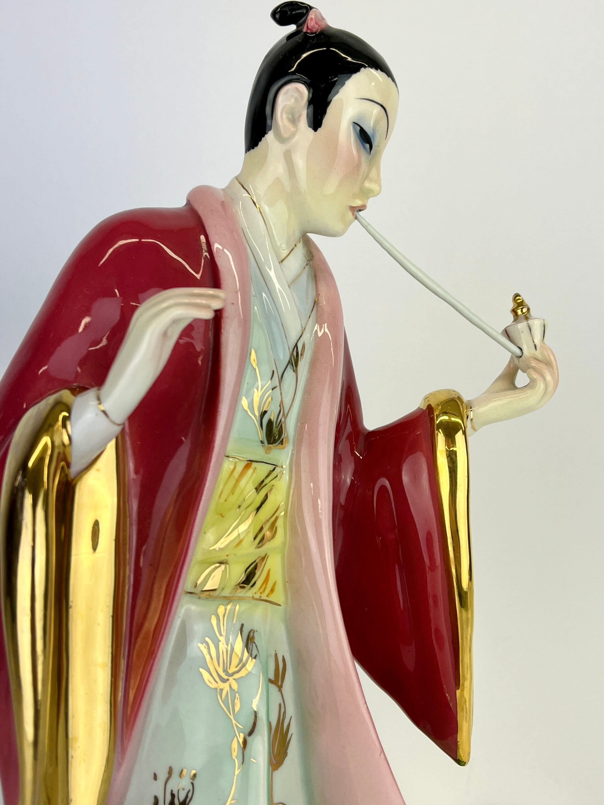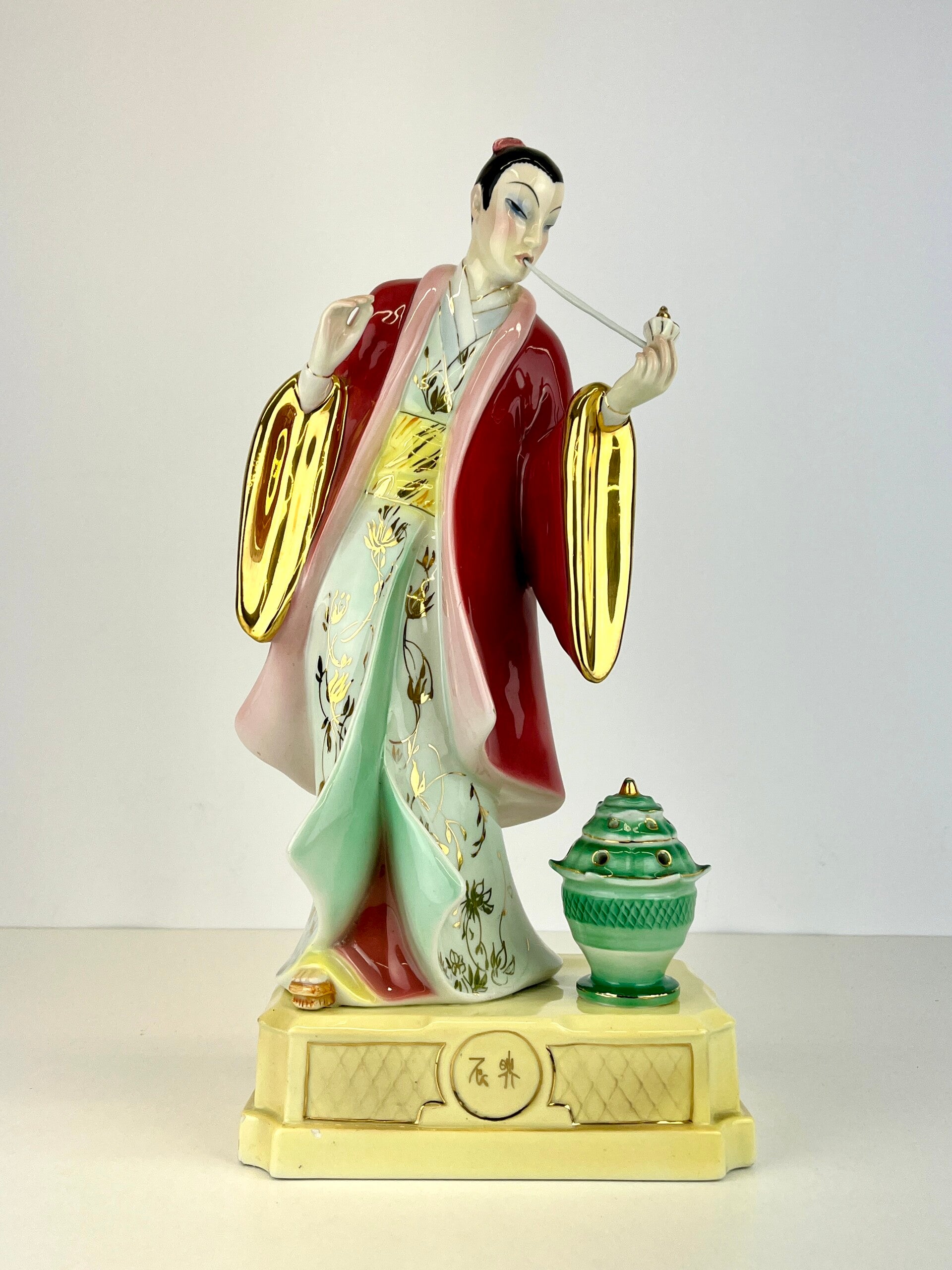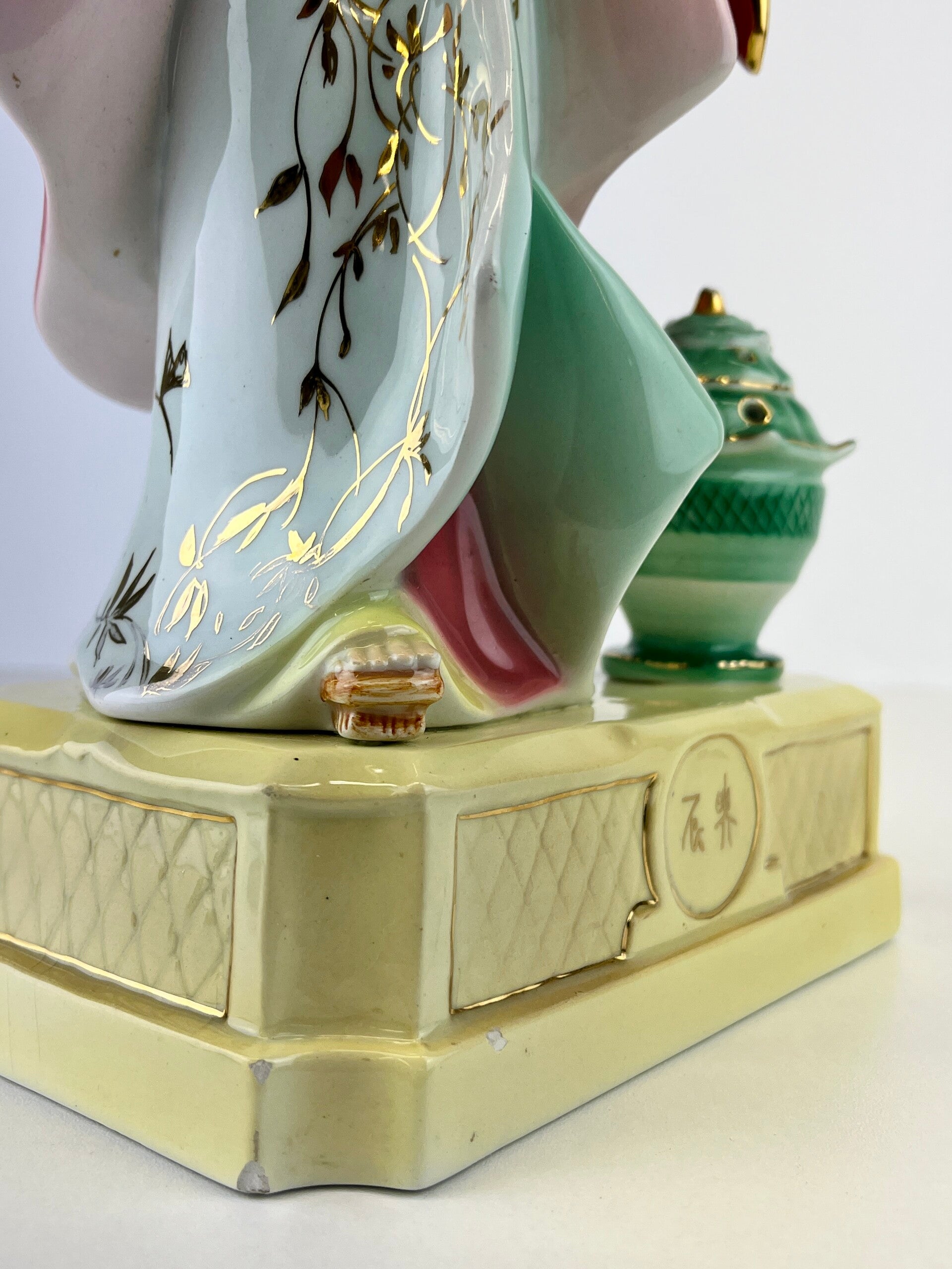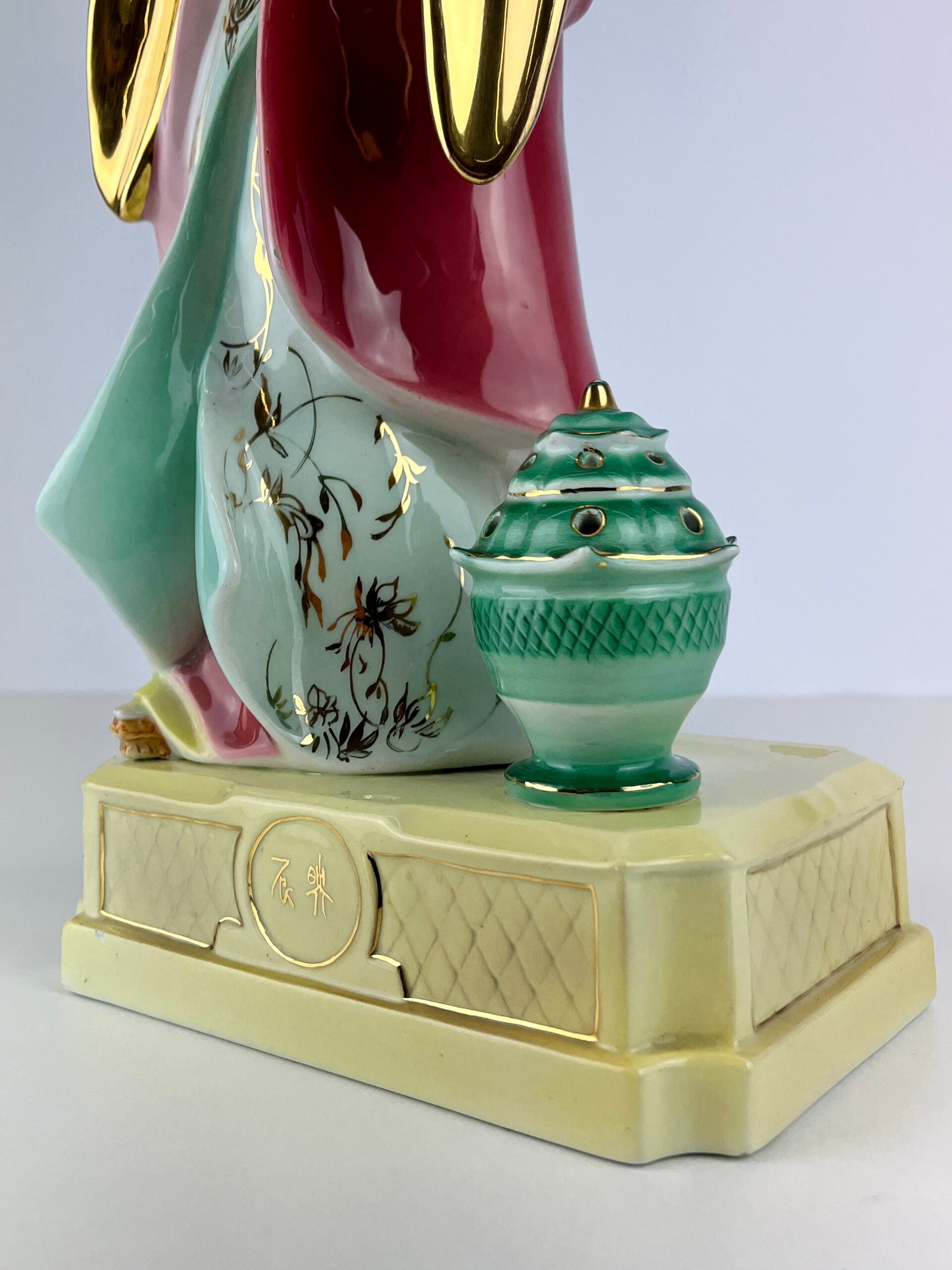Special piece by Giovanni Ronzan from the 1940s. Asian man in traditional costume mounted on a pedestal with a green incense burner next to him.
