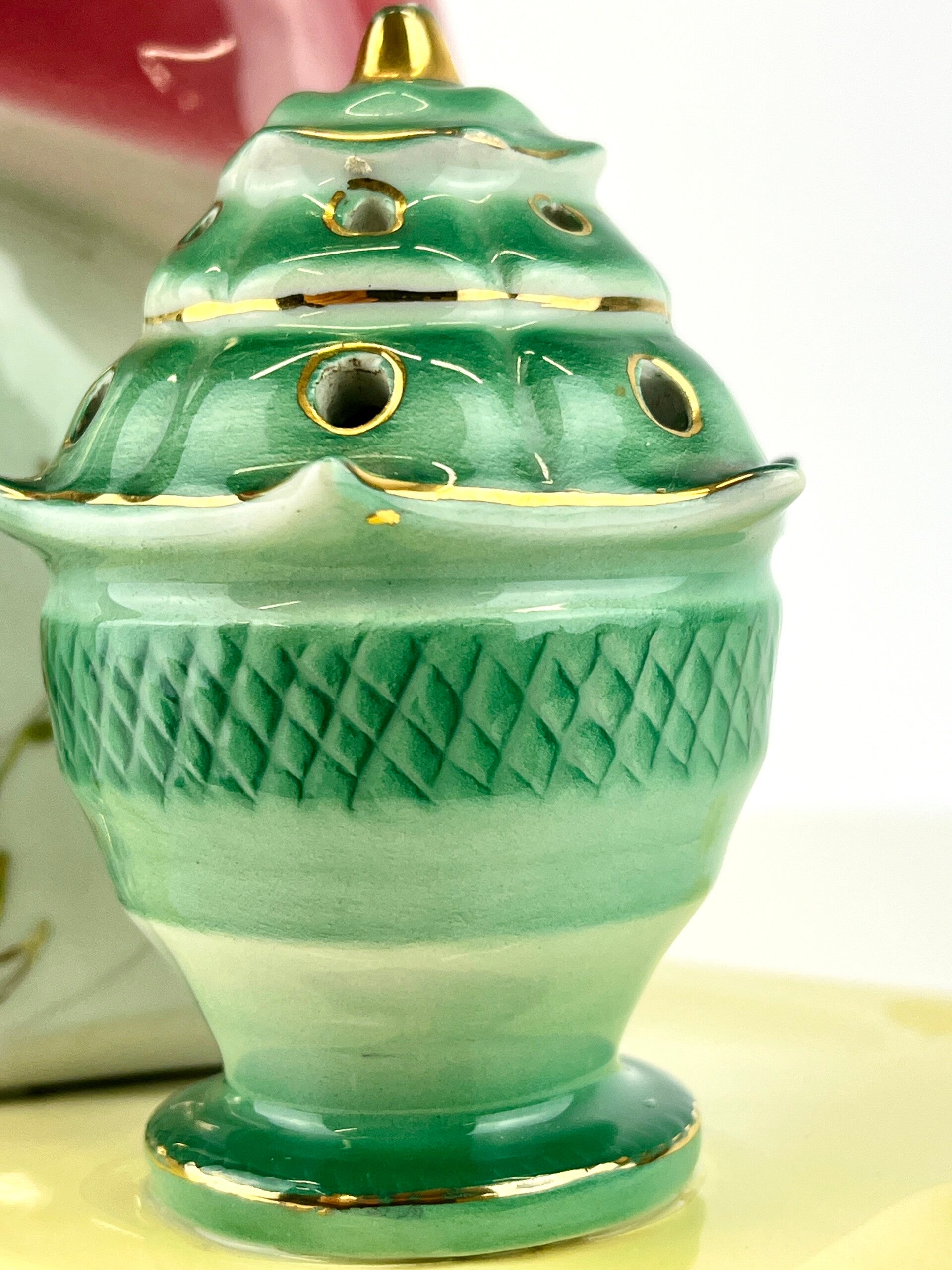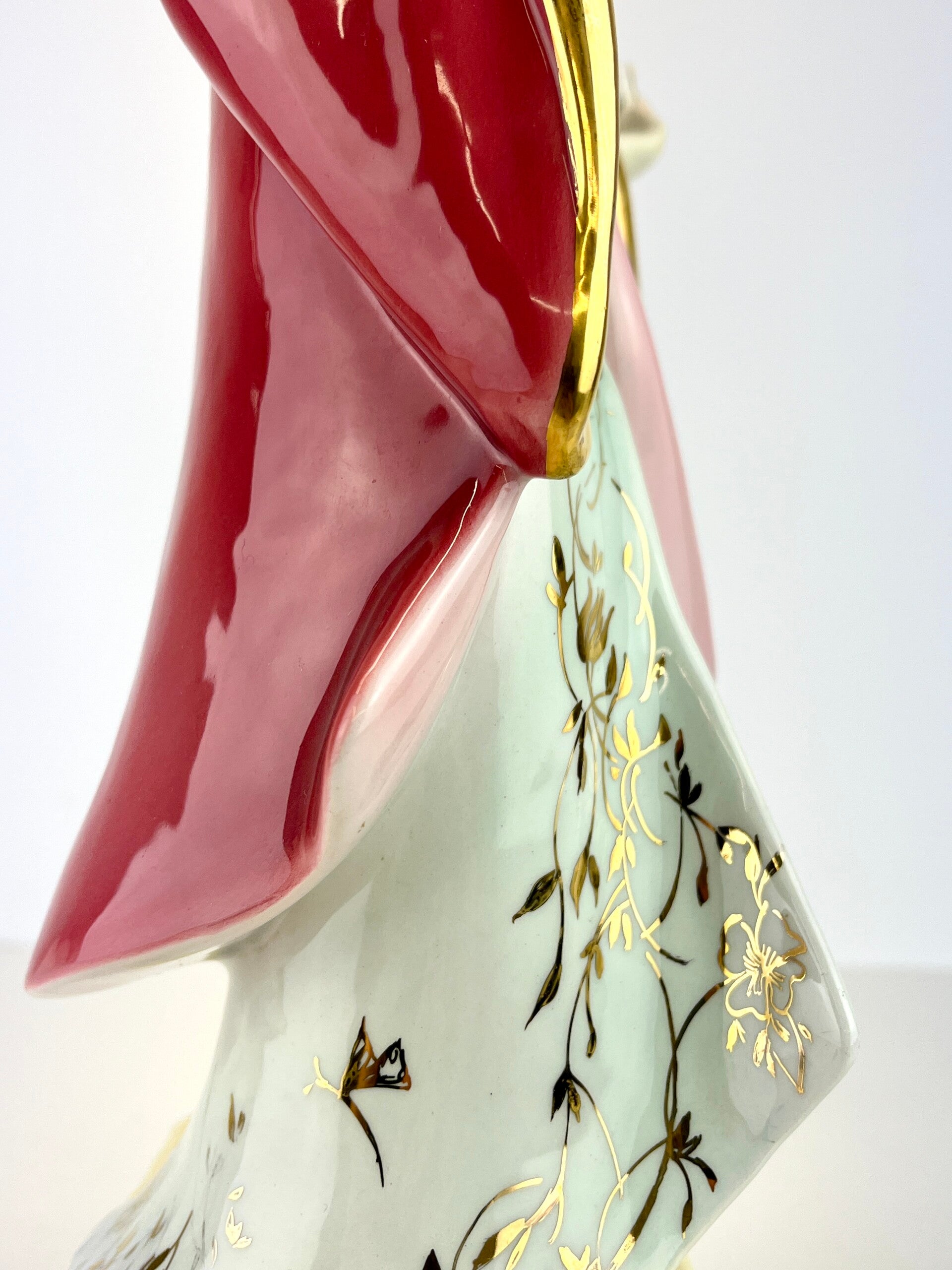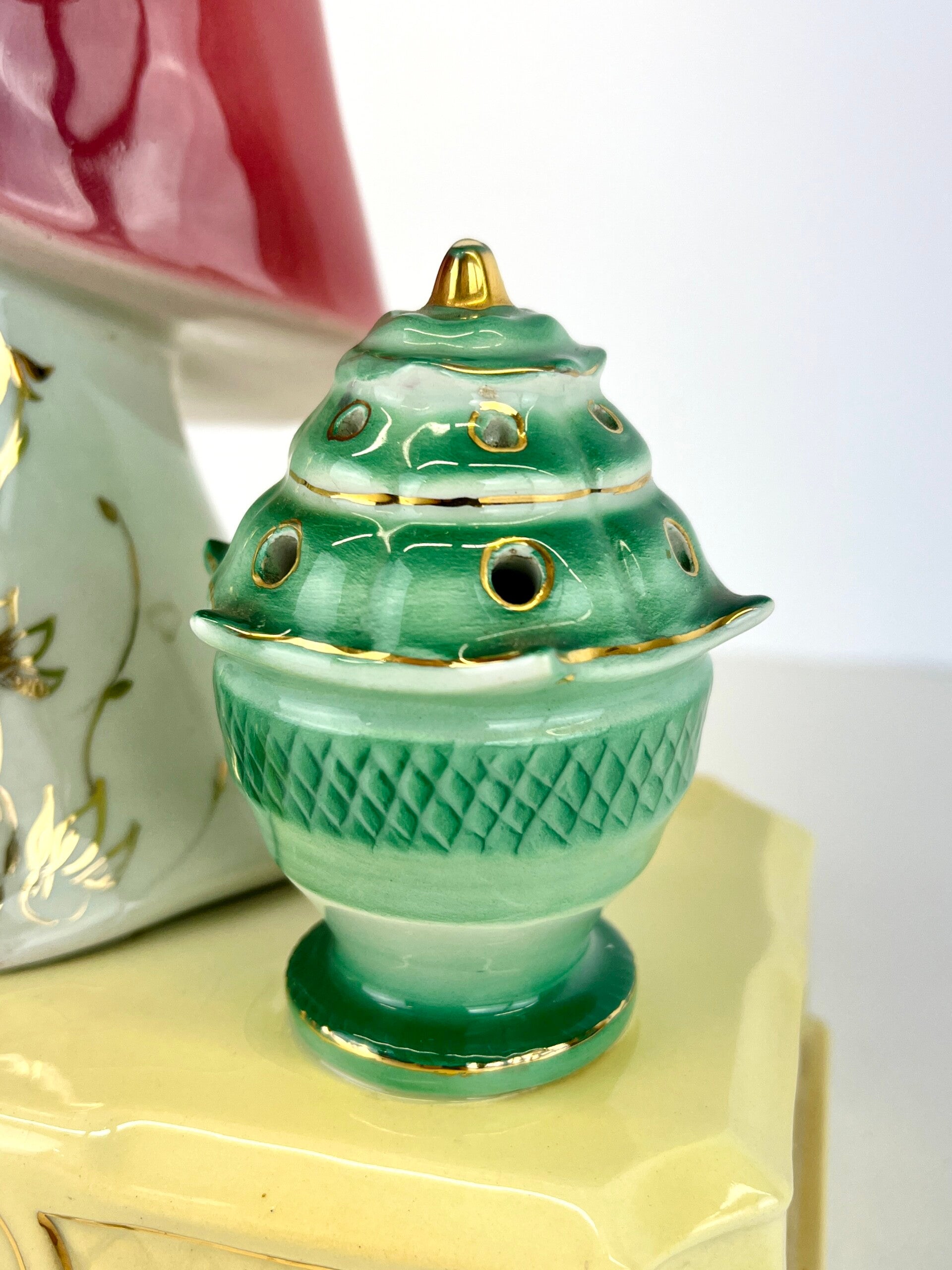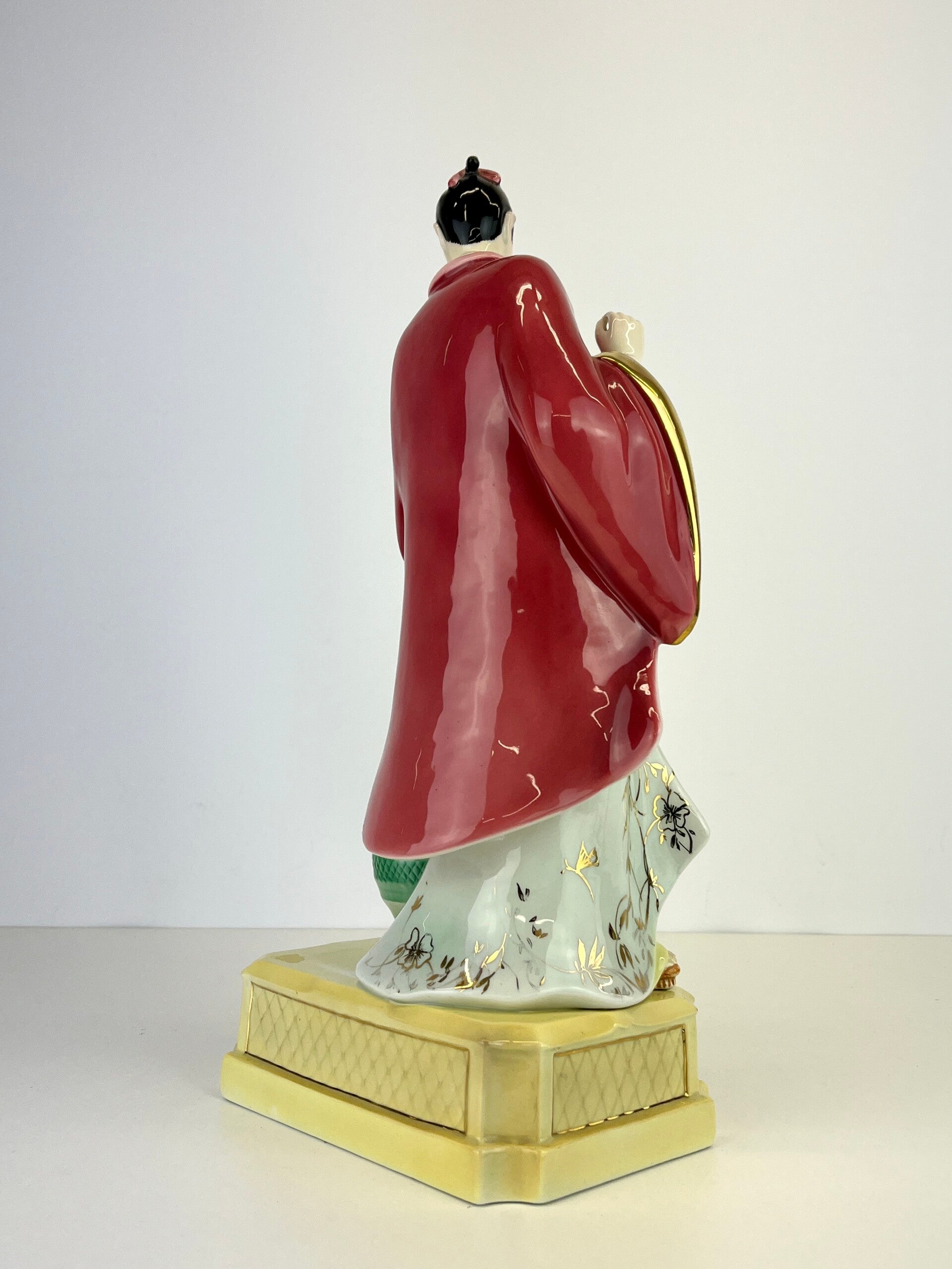 Special piece by Giovanni Ronzan from the 1940s. Asian man in traditional costume mounted on a pedestal with a green incense burner next to him.