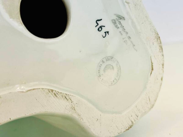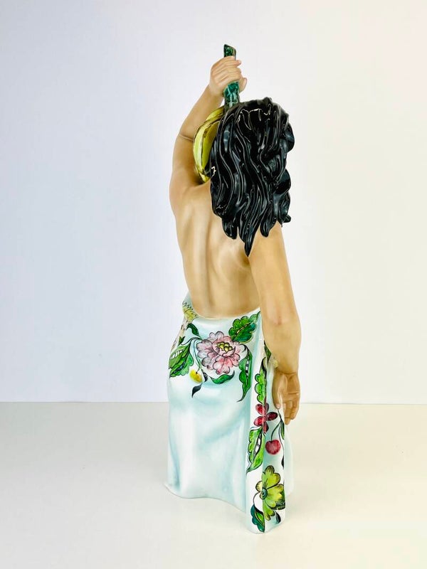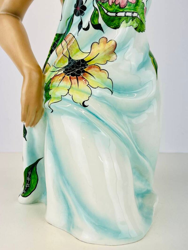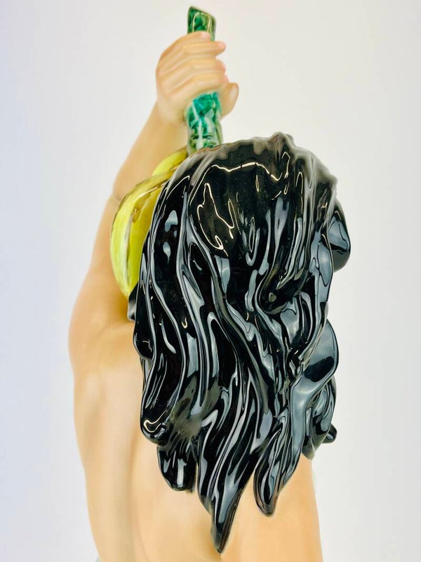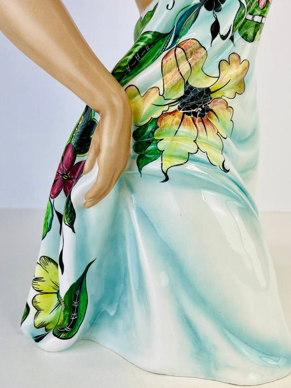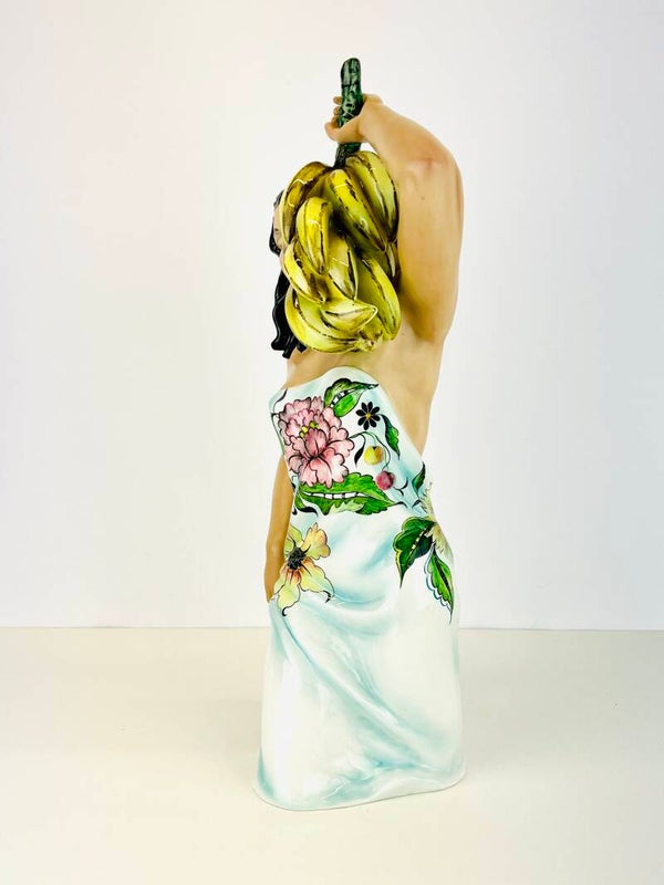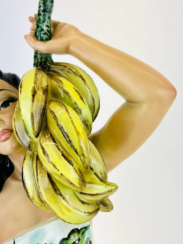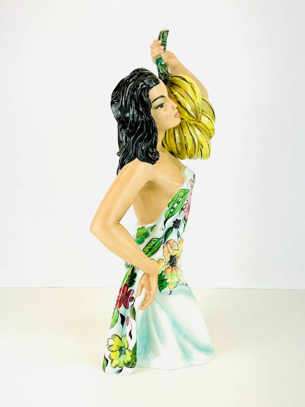 Hawaiian woman in colorful stained dress taught with flowers by Giovanni Ronzan. In her left hand she carries a large bunch of glazed bananas. the body and face are made of a matte glaze. Circa 1960s, very rare piece.