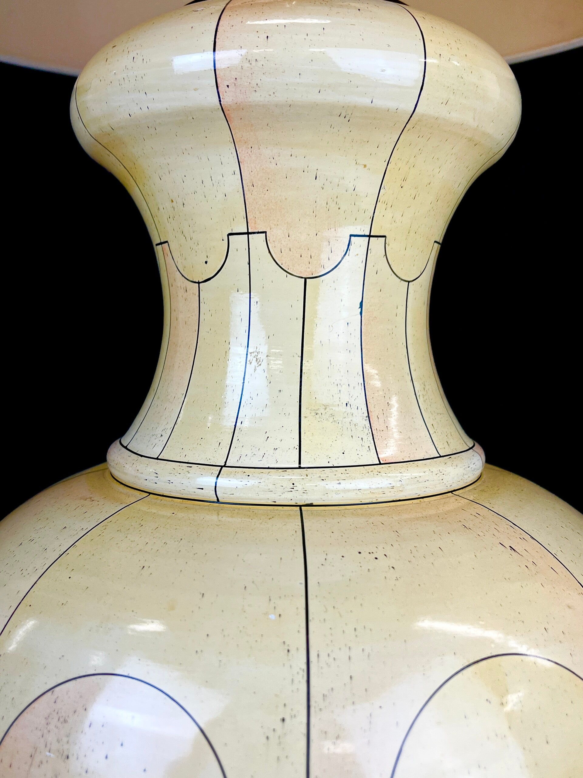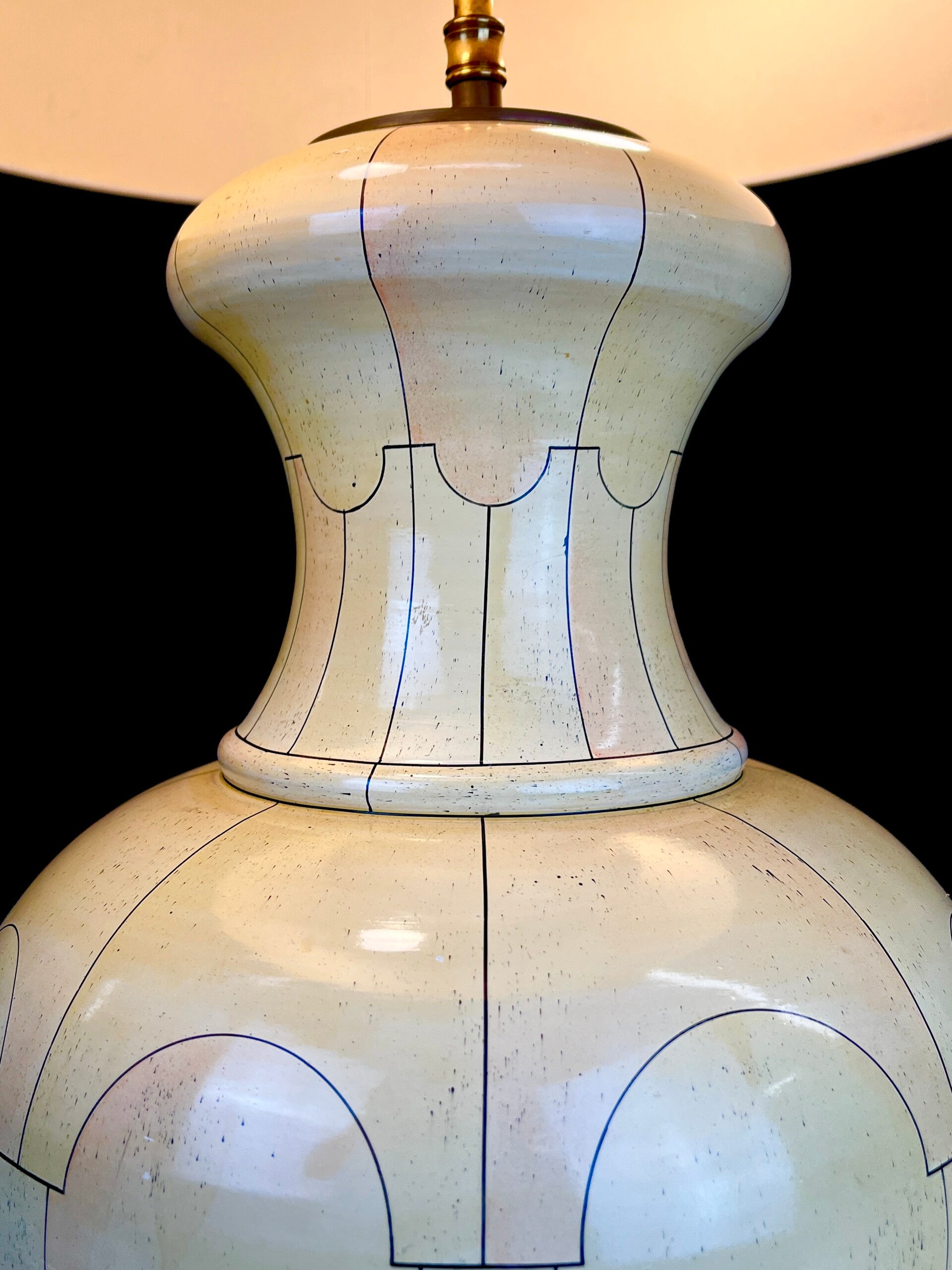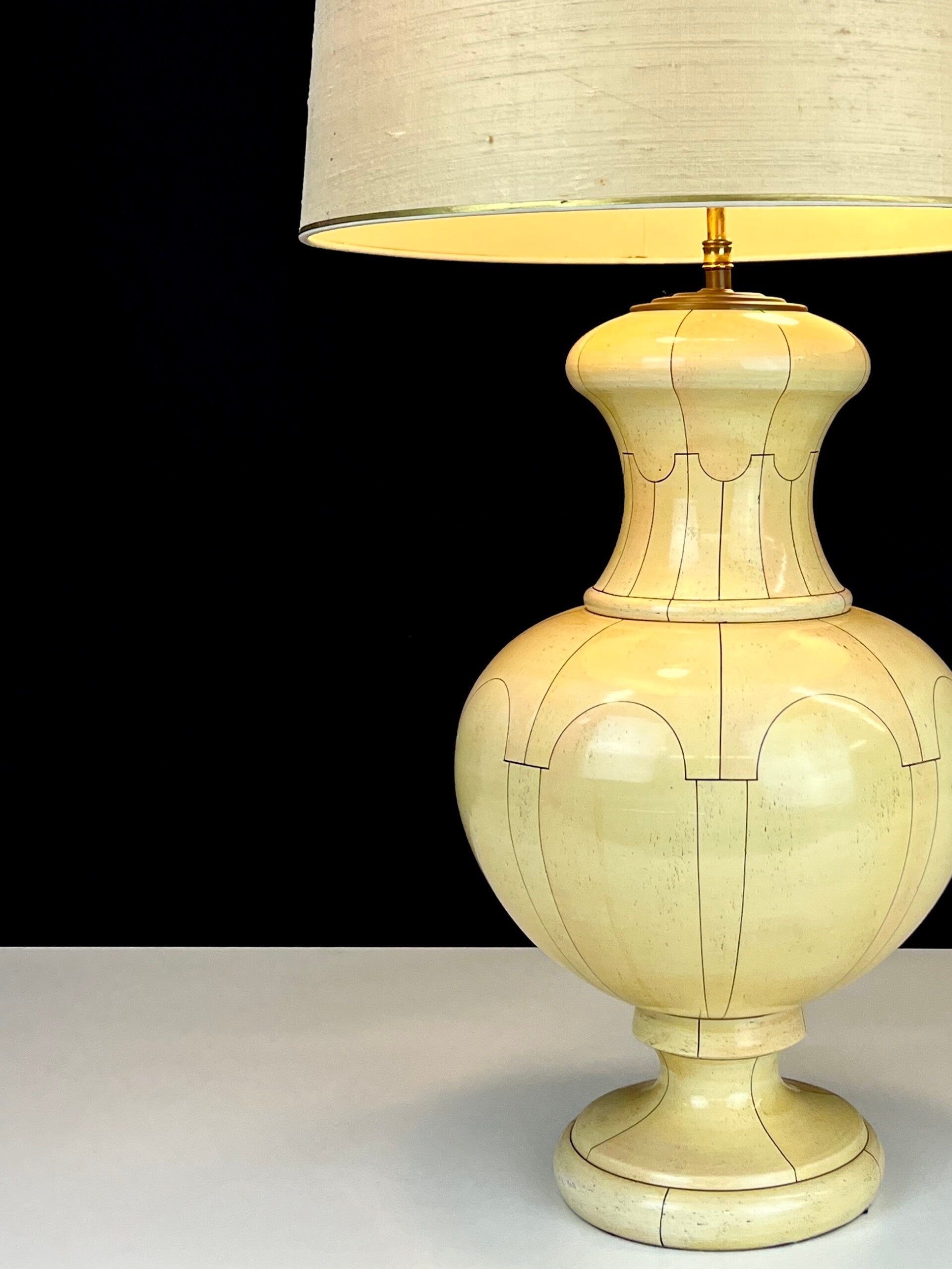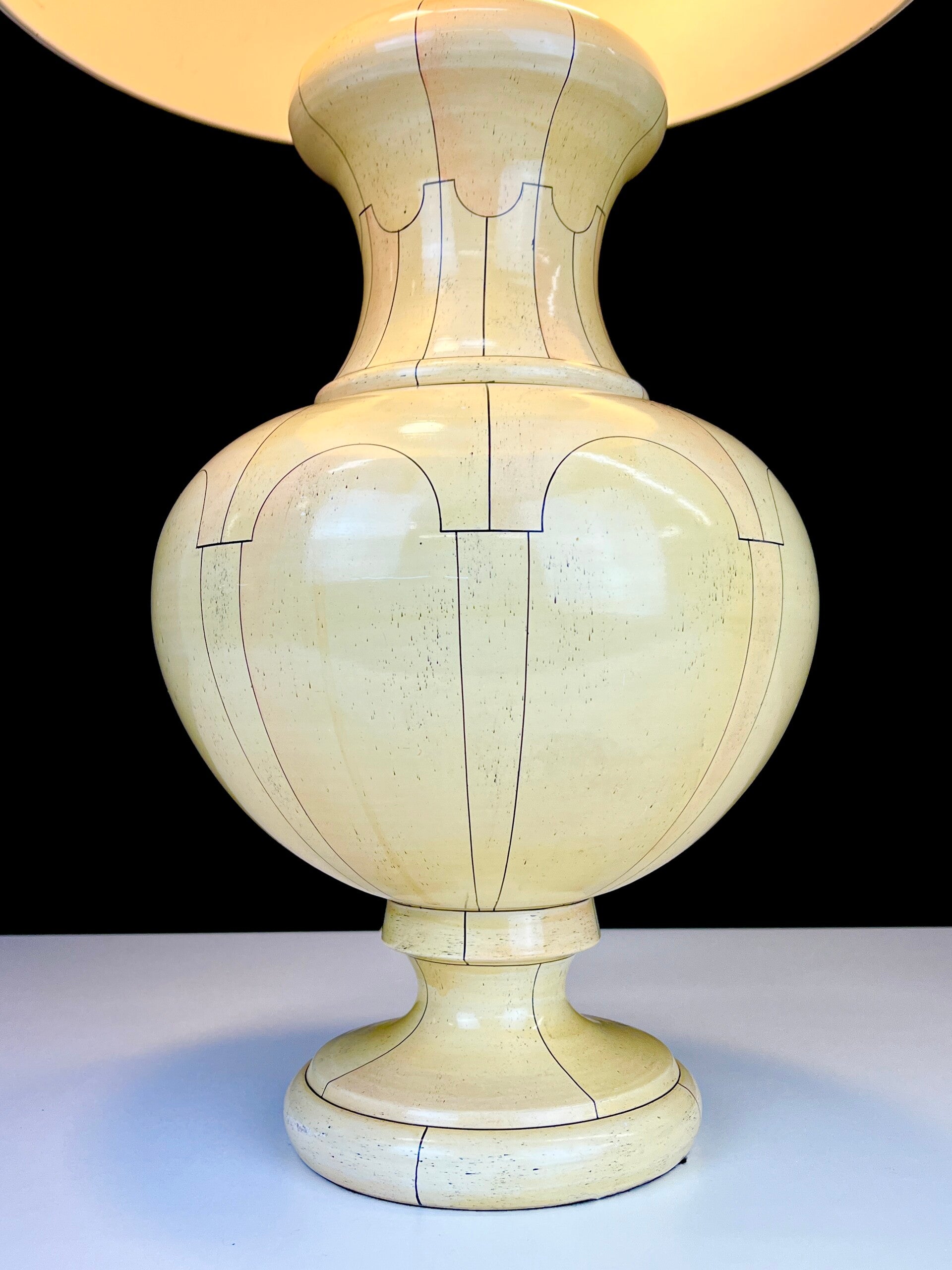 large hand-painted ceramic table lamp in an ivory pattern, a well-known pattern that often appears in works by Jean Roger.