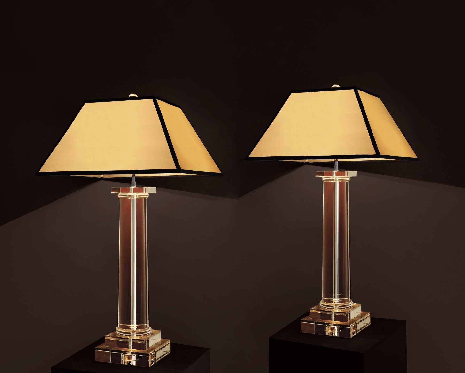 A pair of tall table lamps with a base made of solid crystal.