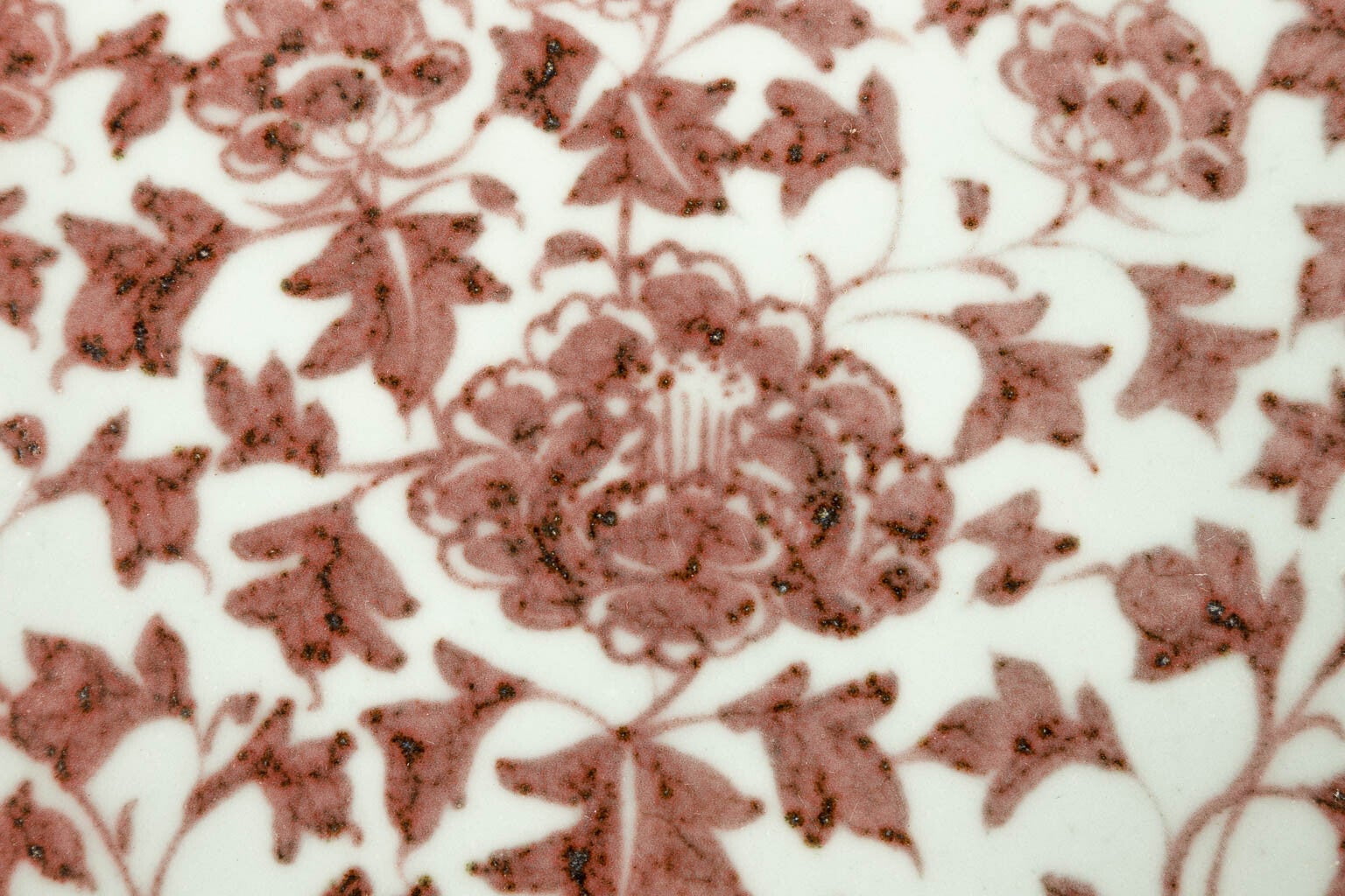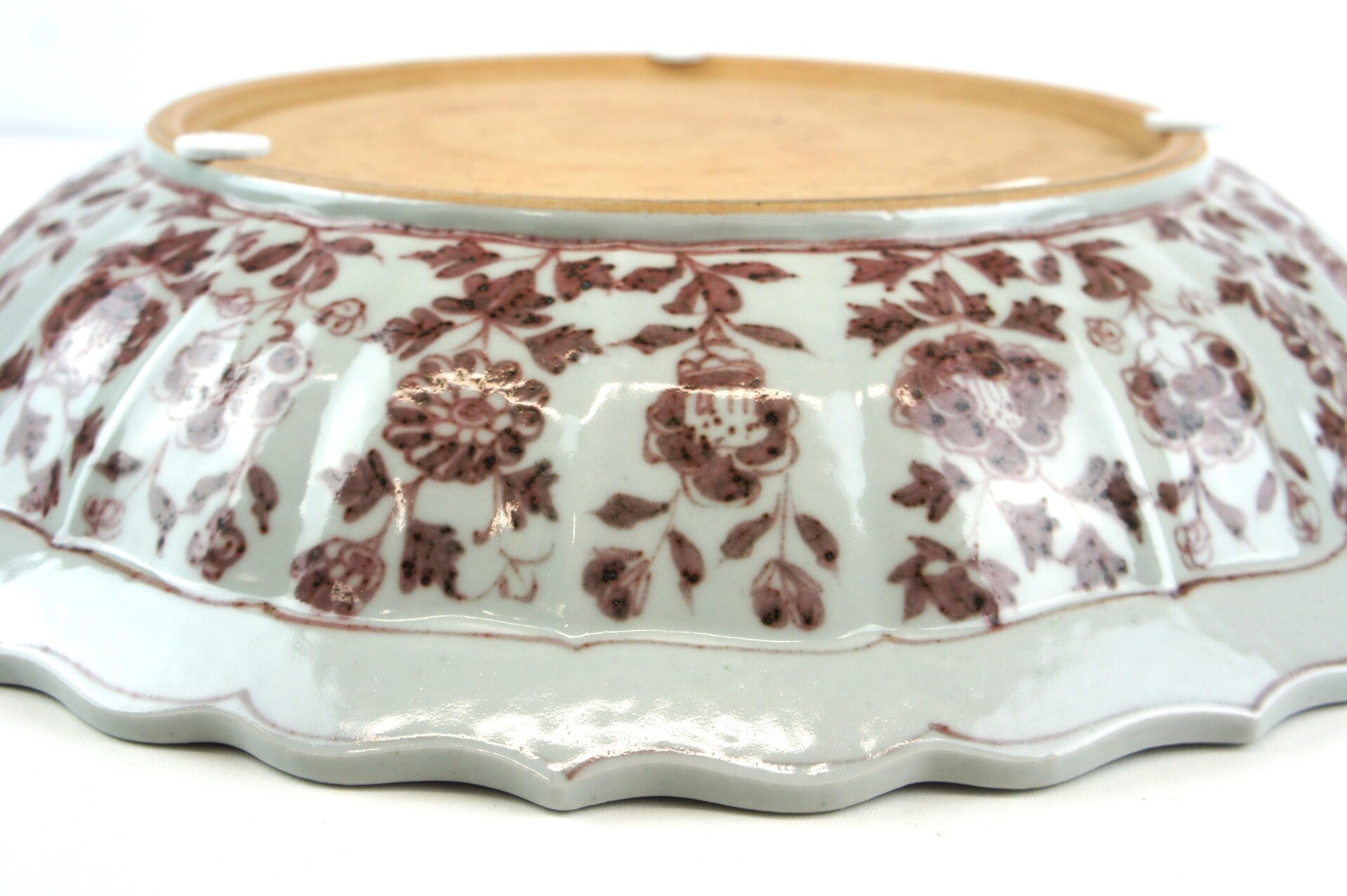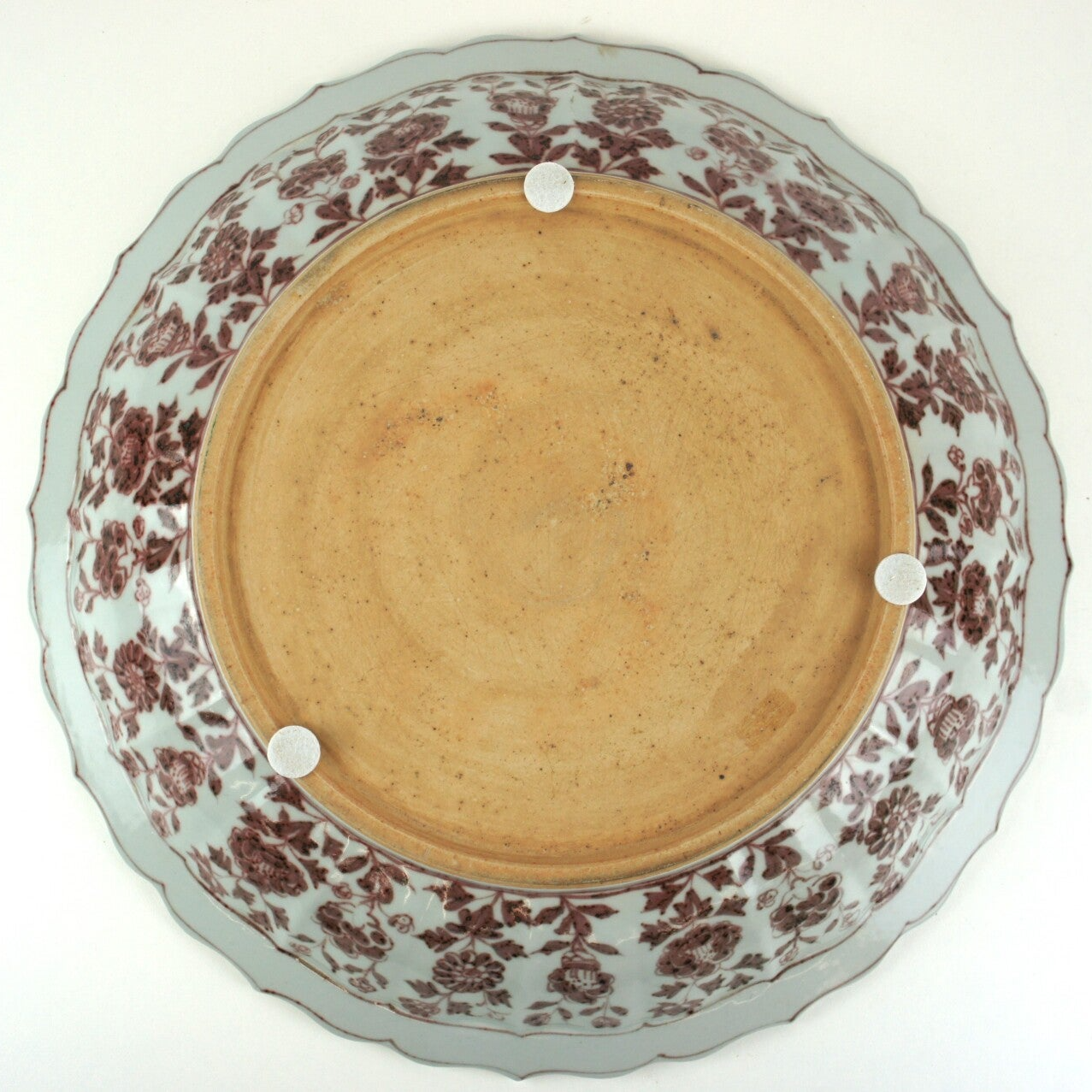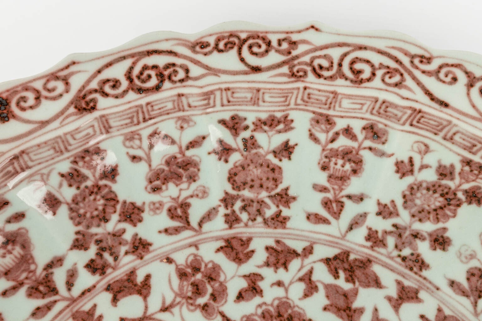 Large Chinese Ming Dynasty underglaze red flower (Peonies) porcelain plate. The plate has a wide central inside, flori-shaped rim, thick and large. Hand-painted ornaments in white base color contrasting with red copper color. It originated in Qing Dynasty. The red color of the package symbolizes happiness, corresponding to fire, symbolizes happiness and joy. The bottom unglazed, revealed the pale cream ground revealed and dark gray-brown mottled fire traces and edge-carved foot rim.