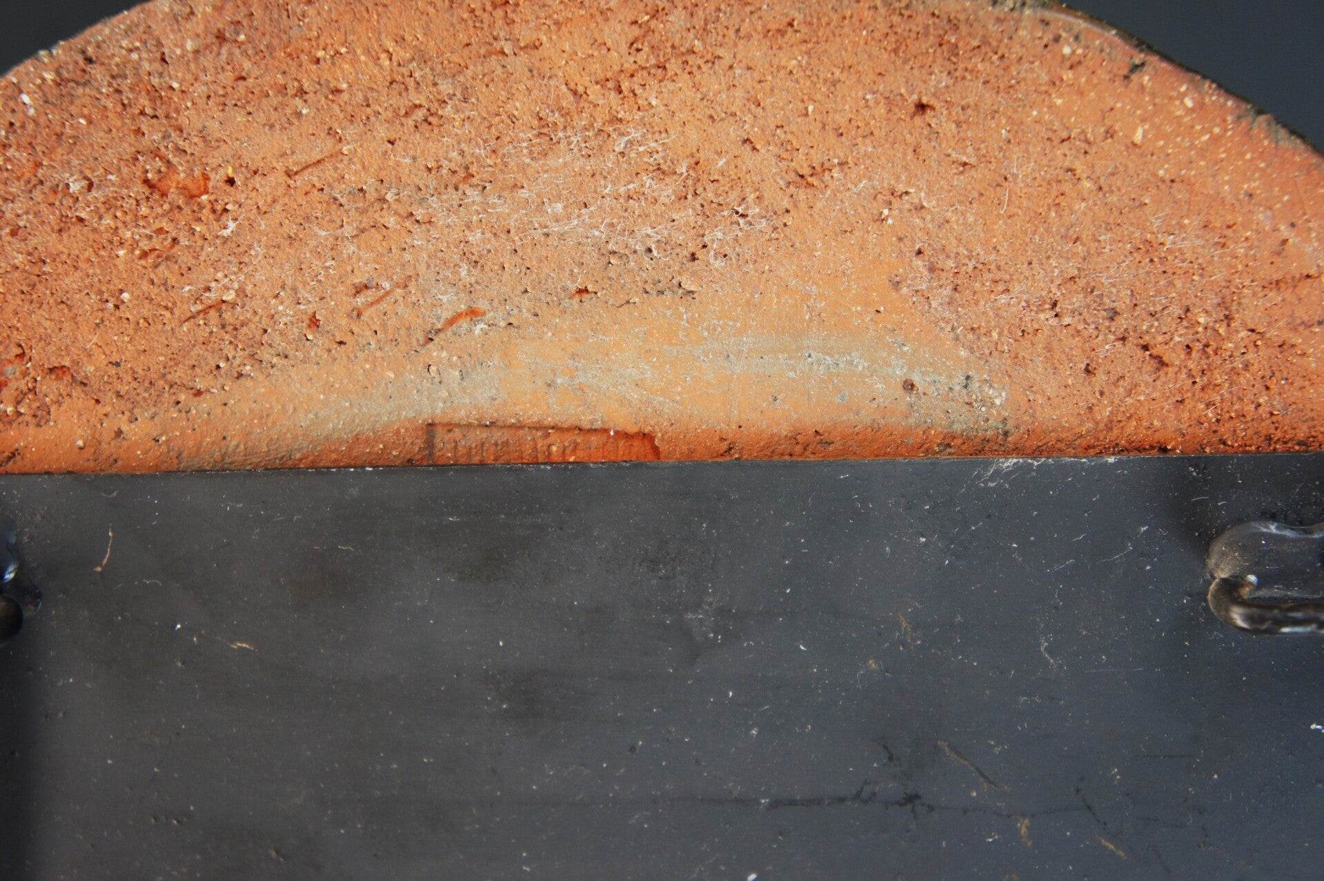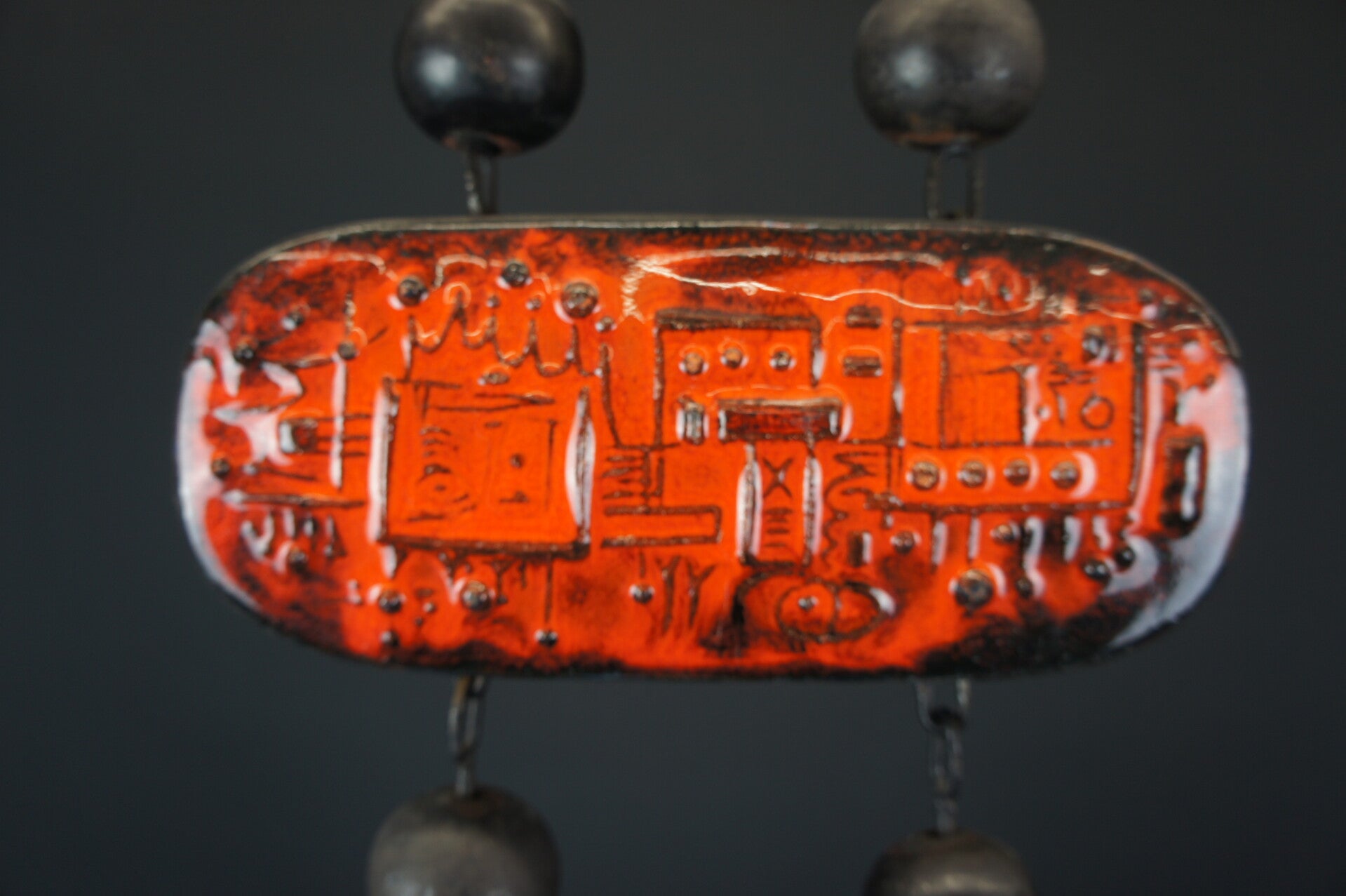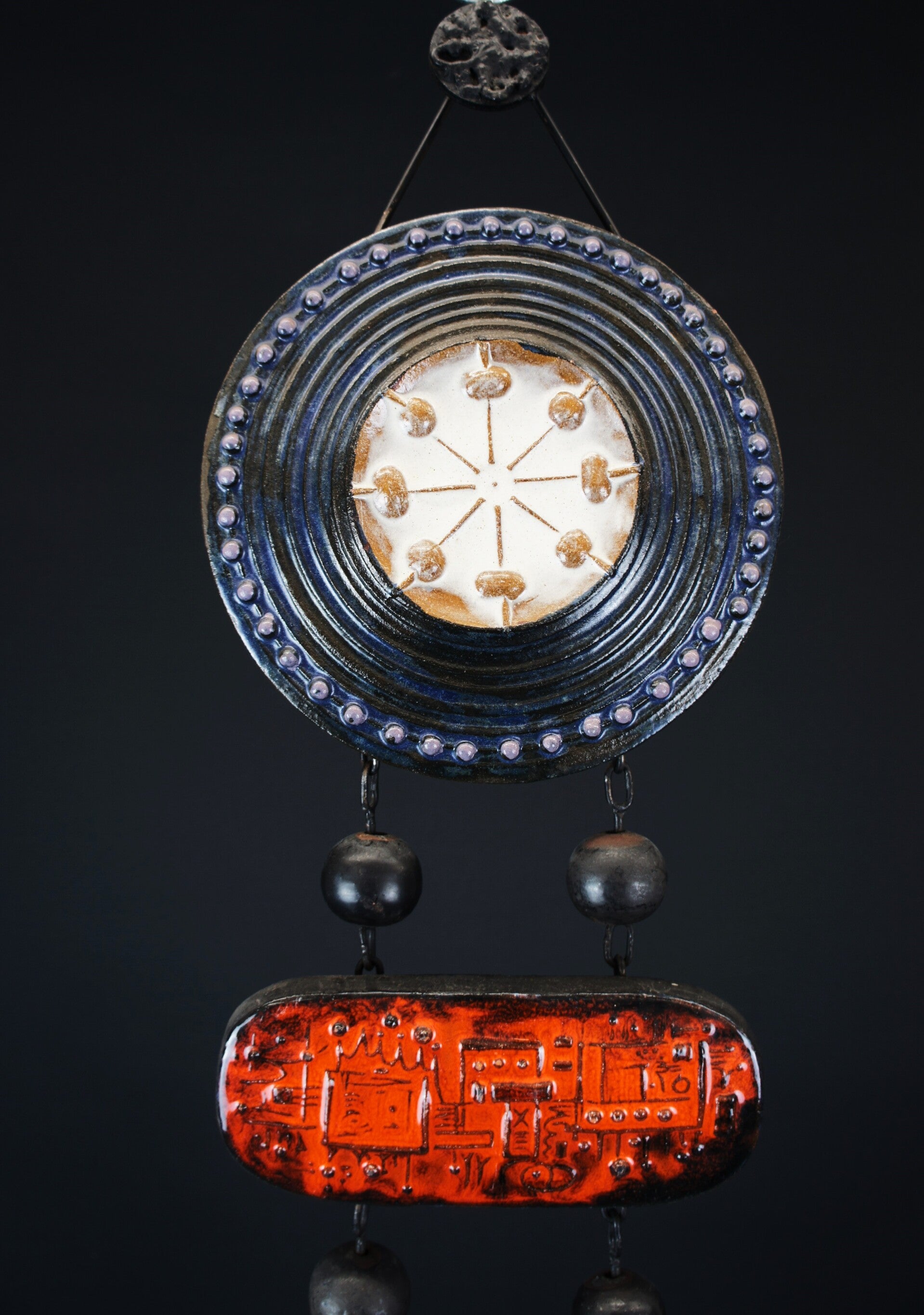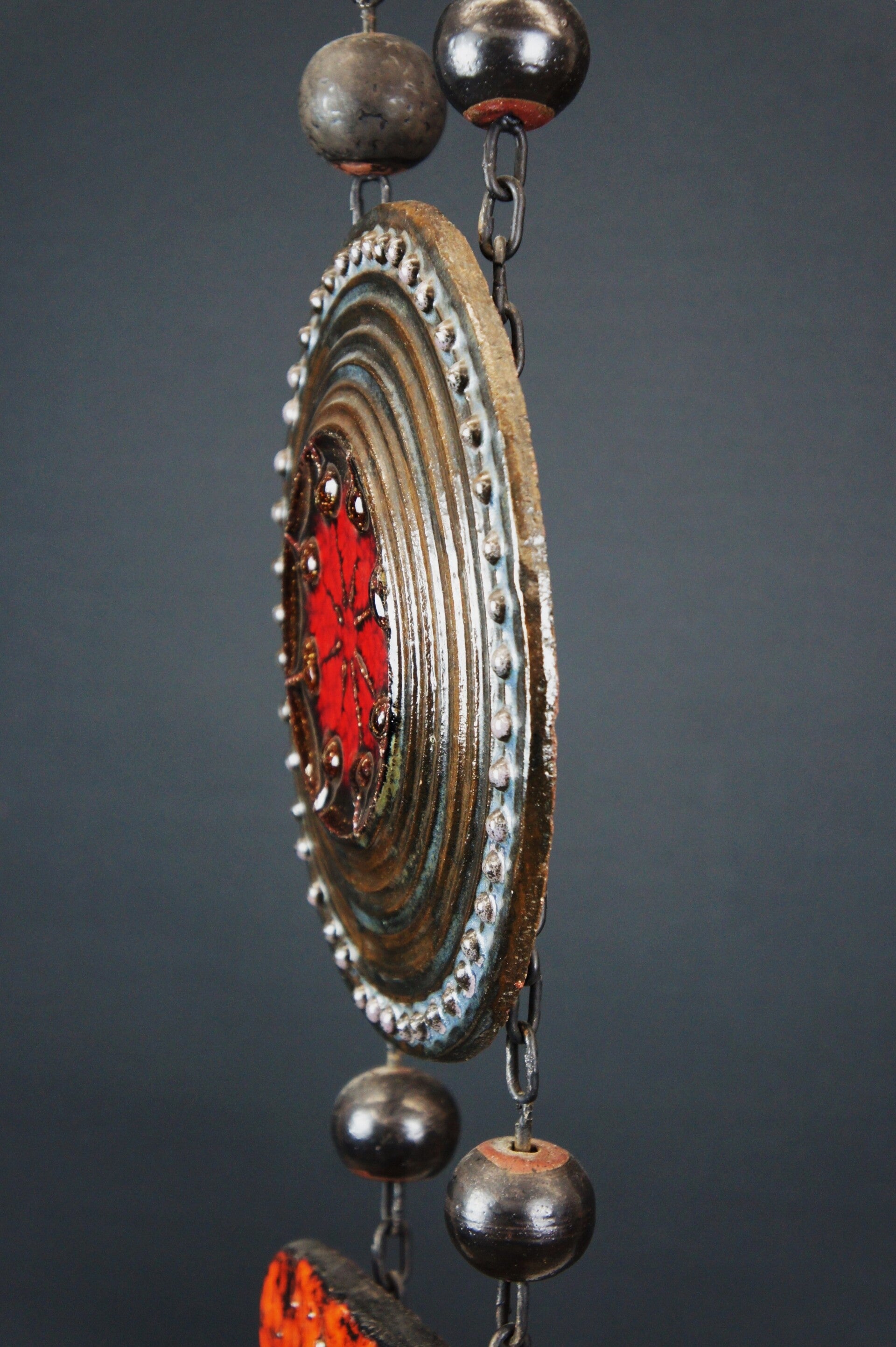 Constructed of five amulets, matte and high-gloss glaze, an exceptional piece held together by wrought iron chains and large ceramic beads. Top amulet is marked.
