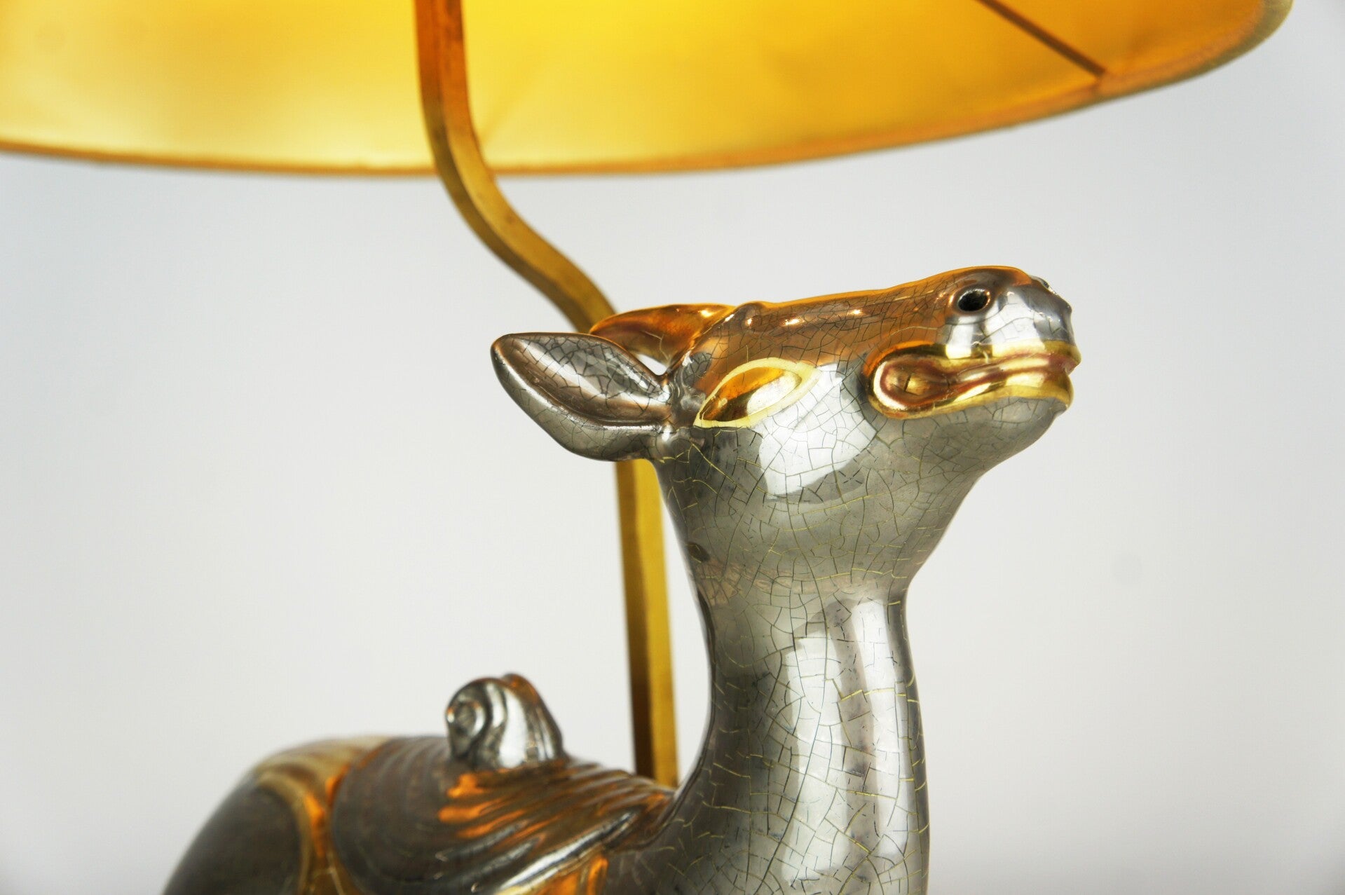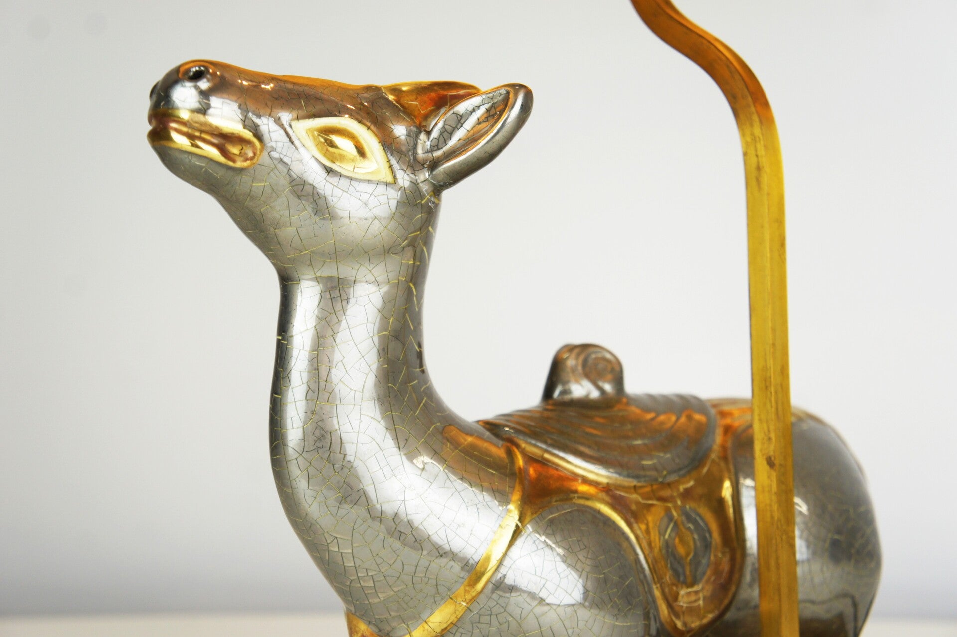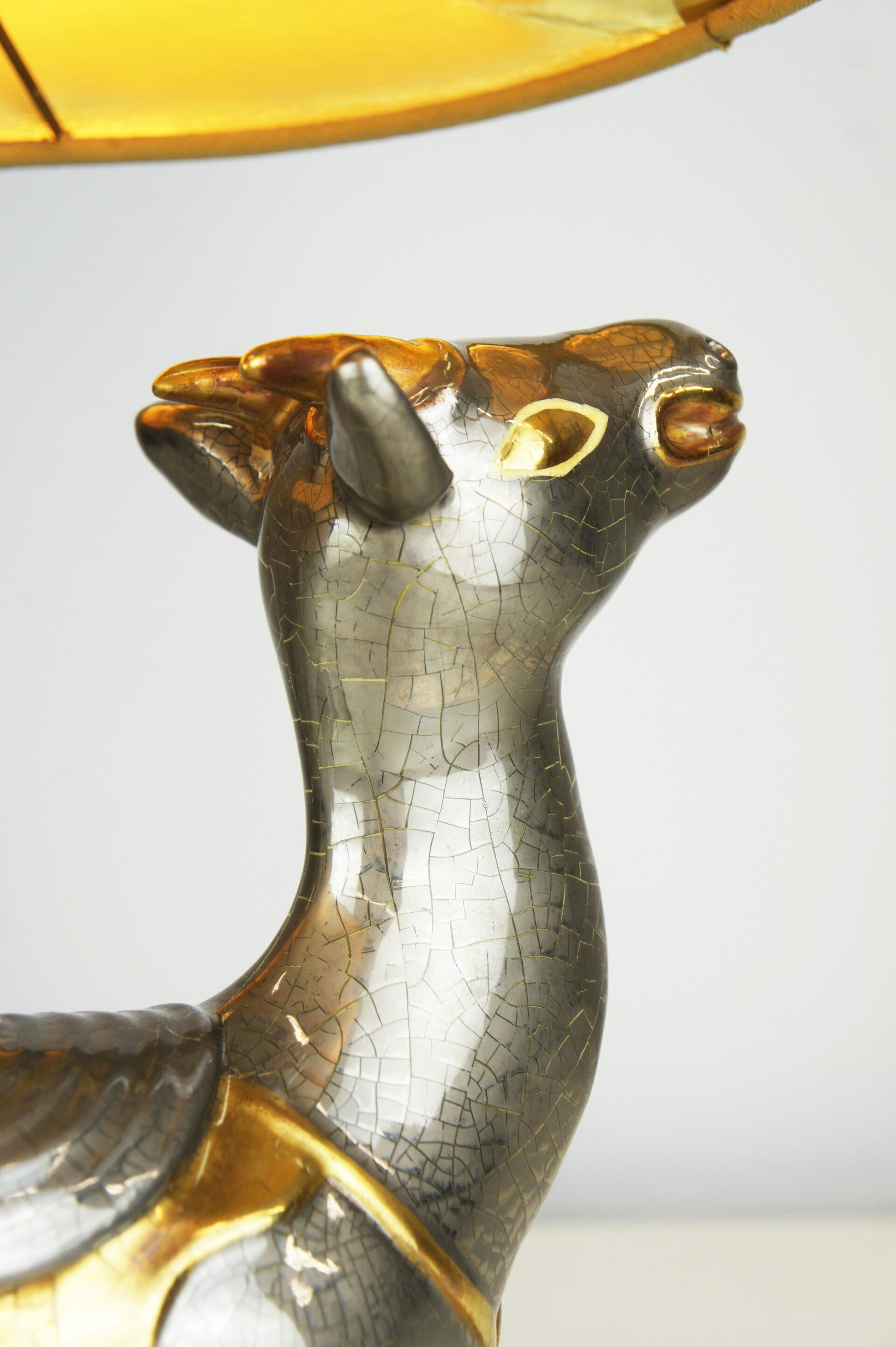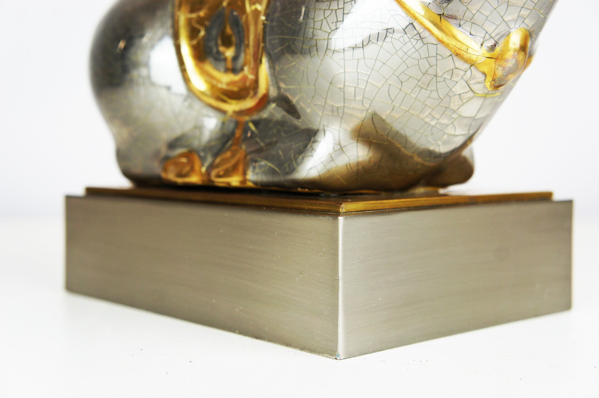 Ceramic table lamp, French work from the 60s, after a representation of the 'Sacred cow' in gold and silver mirror glaze with a crackle effect.