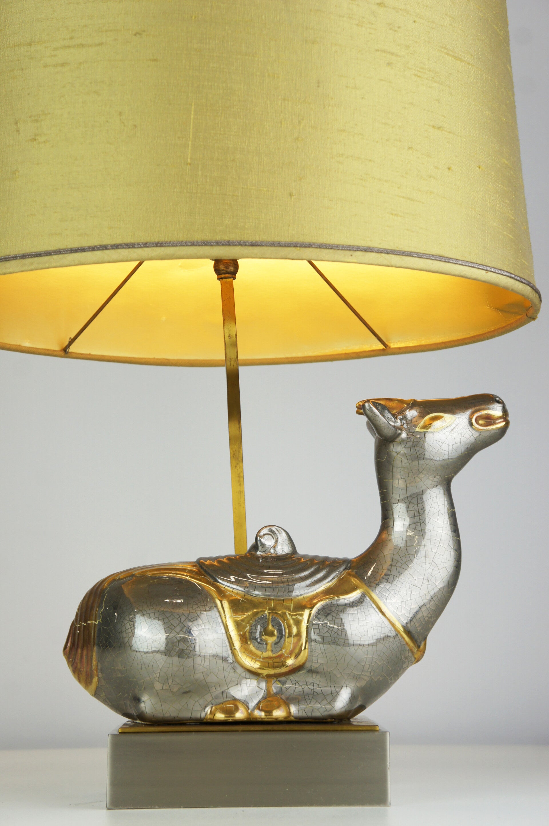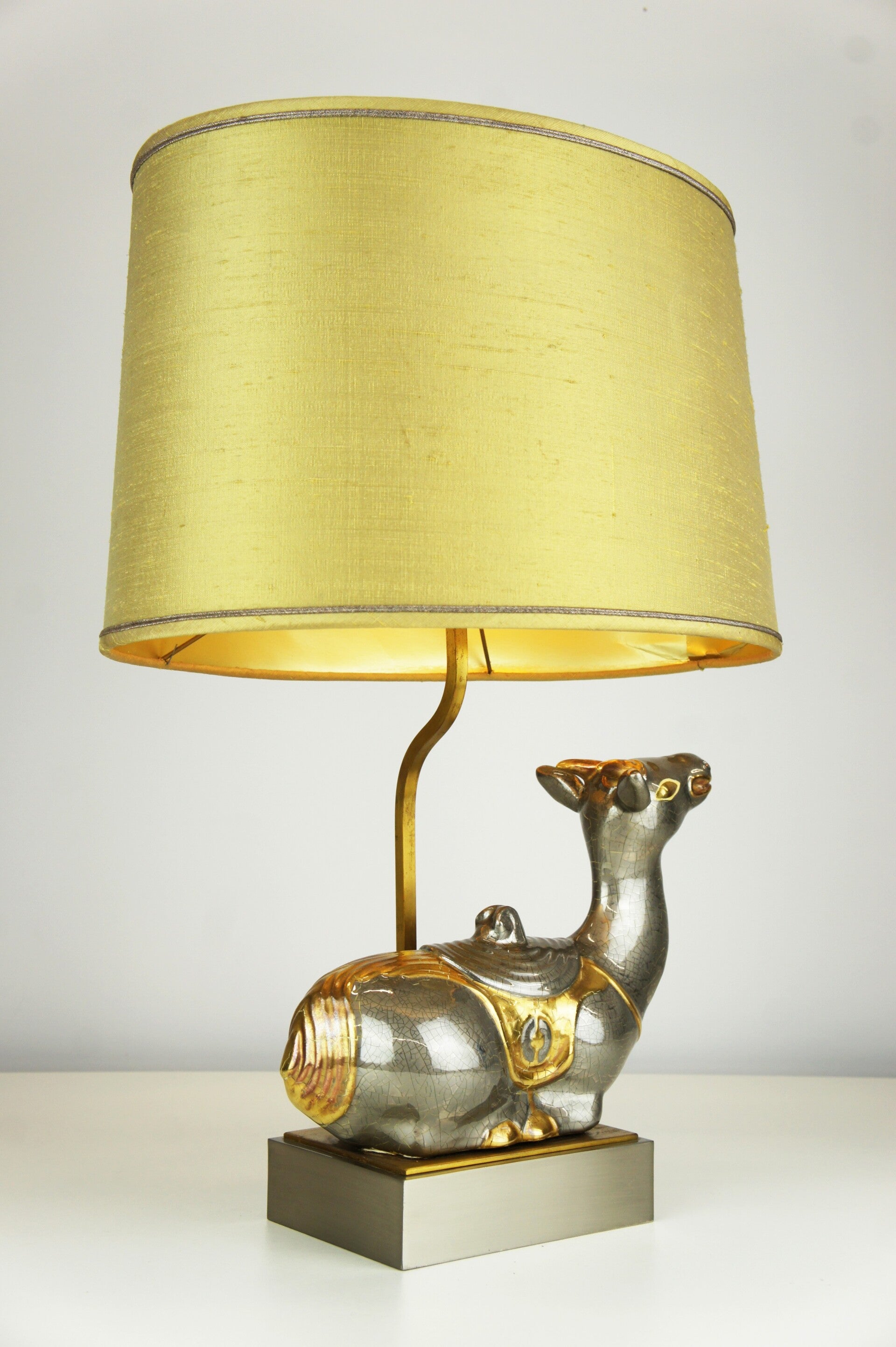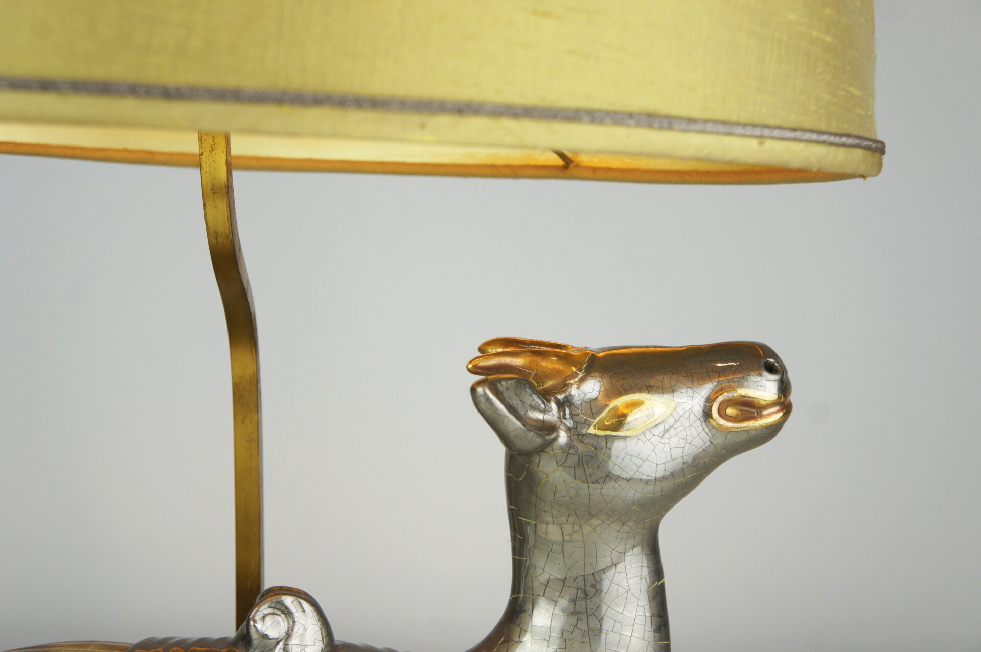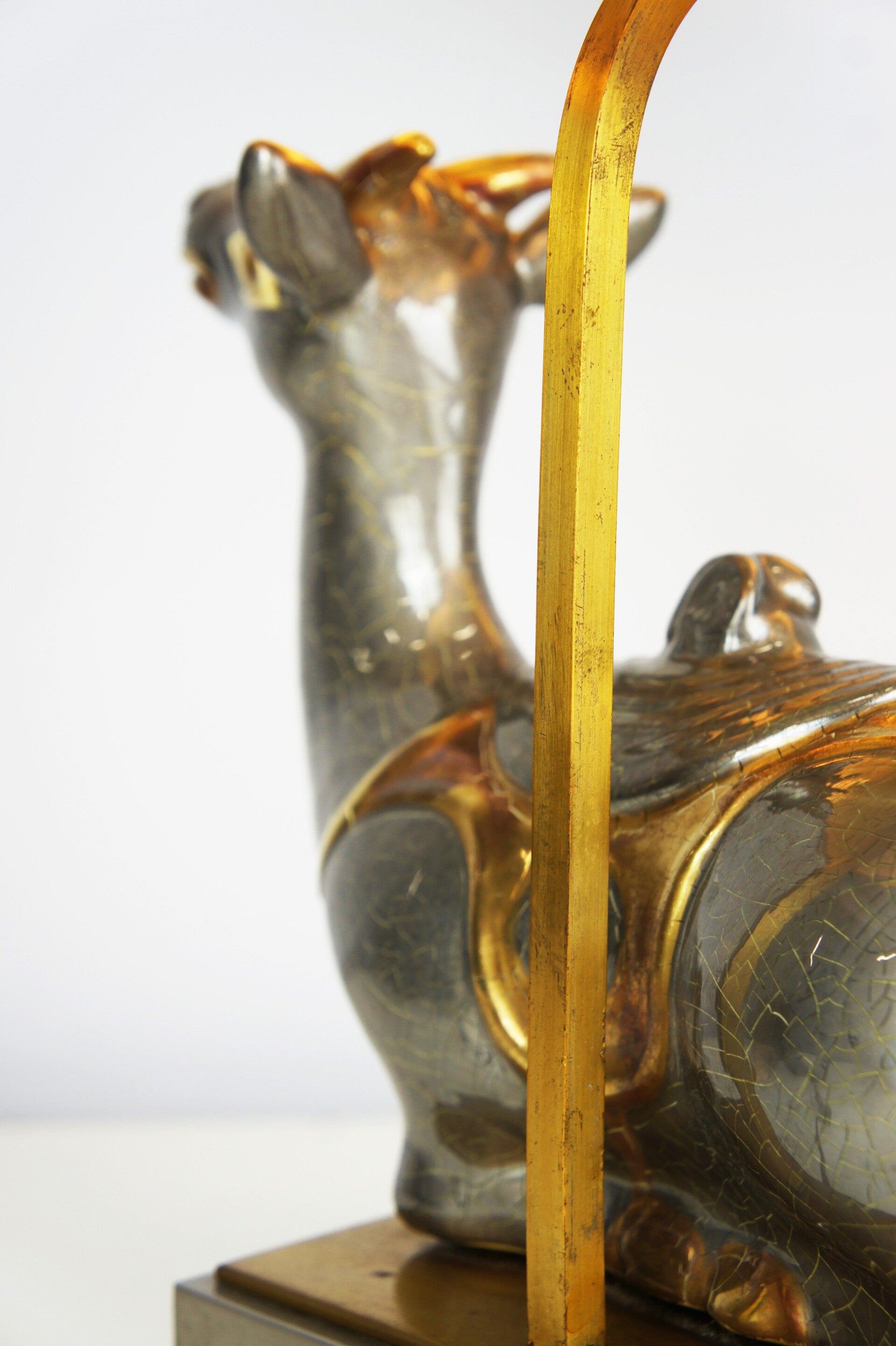Ceramic table lamp, French work from the 60s, after a representation of the 'Sacred cow' in gold and silver mirror glaze with a crackle effect.