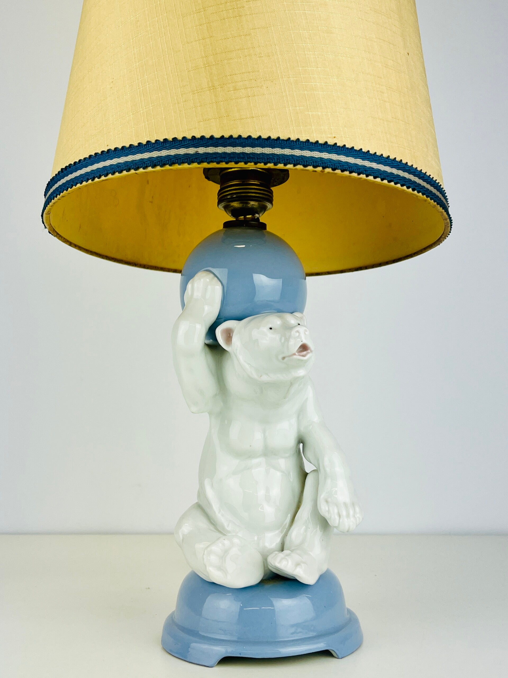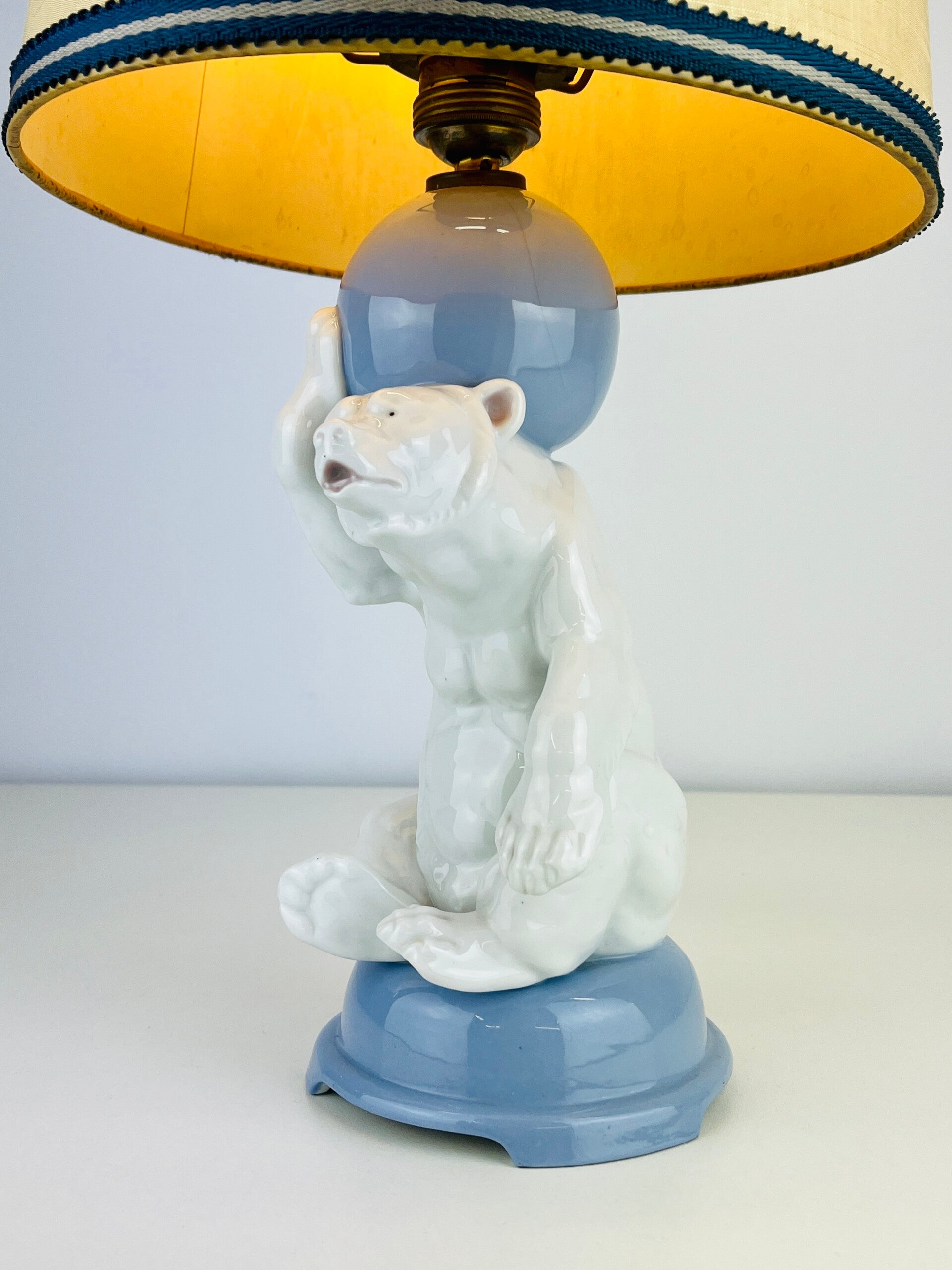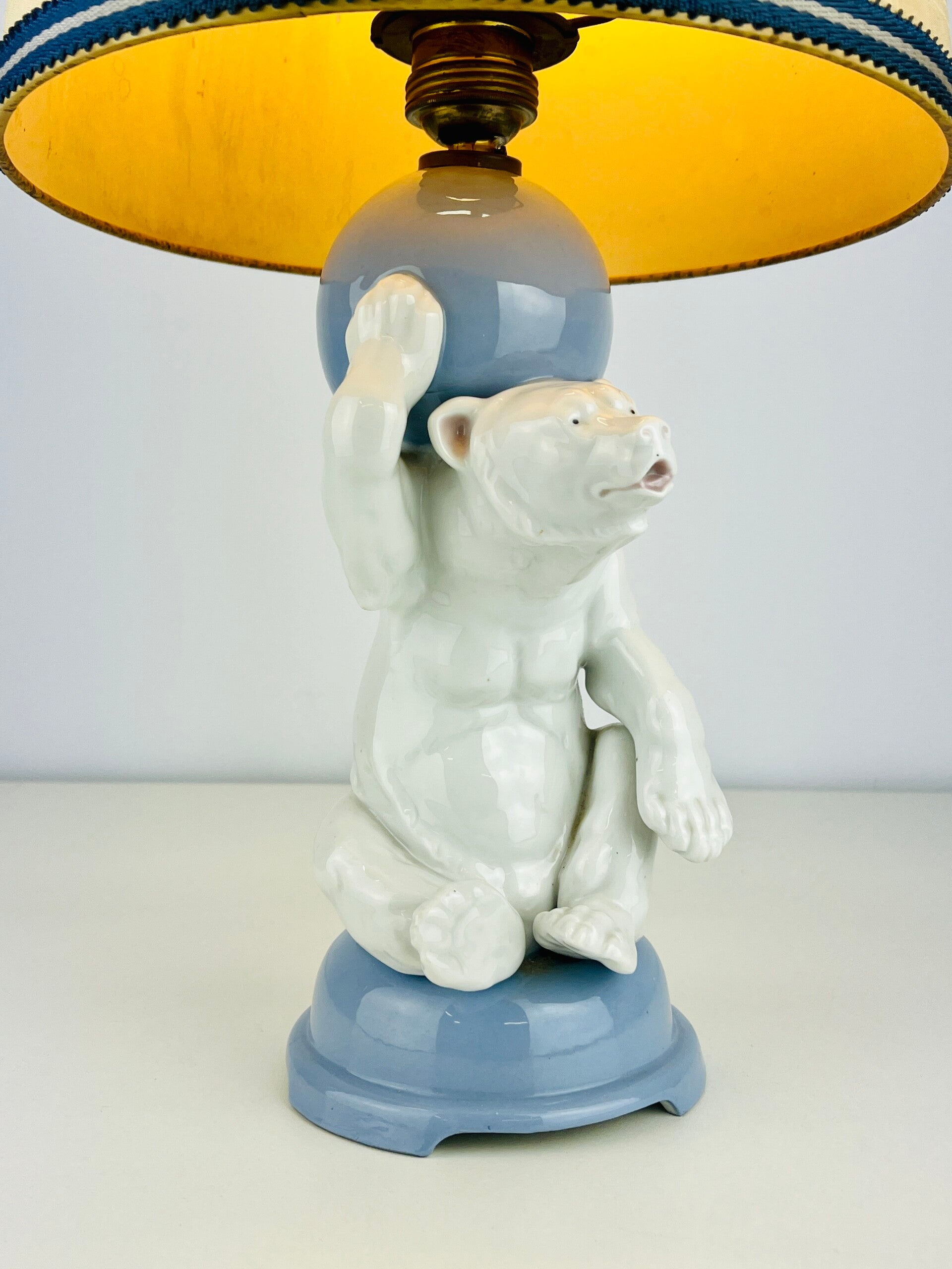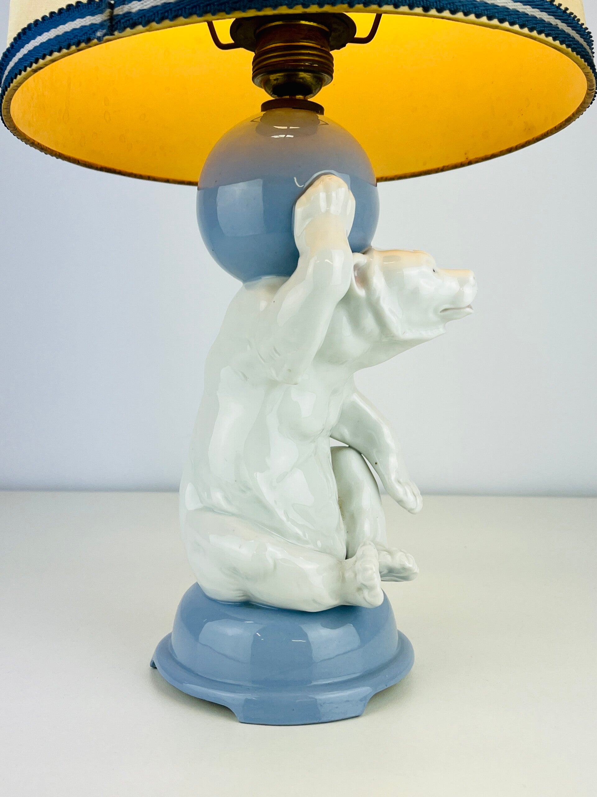 Porcelain table lamp from the Art Deco period of a circus polar bear carrying a sky-blue ball.