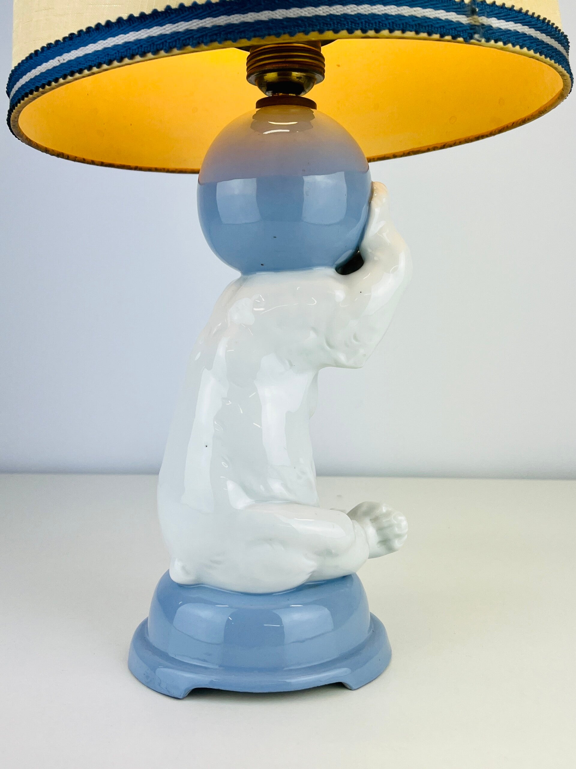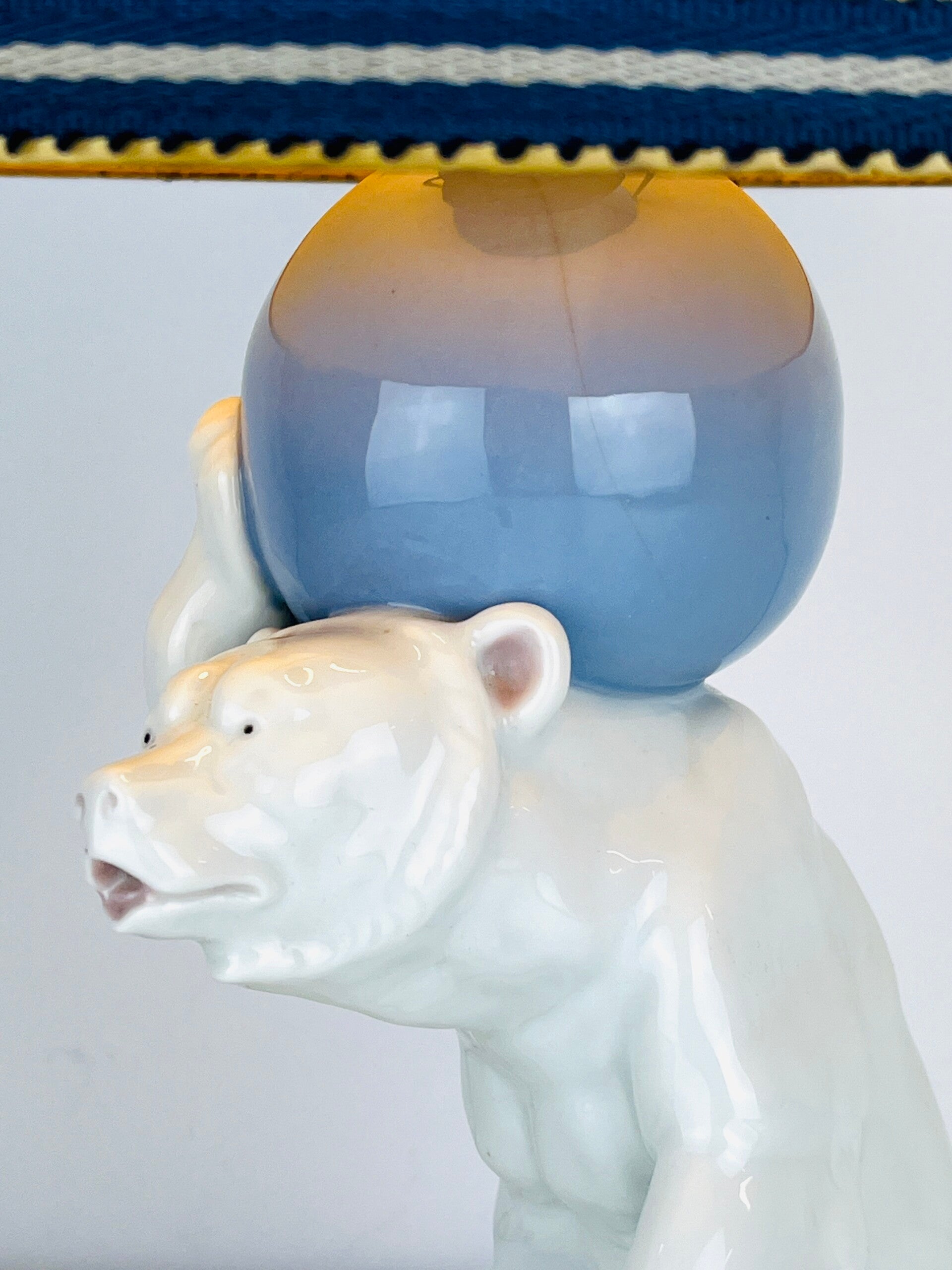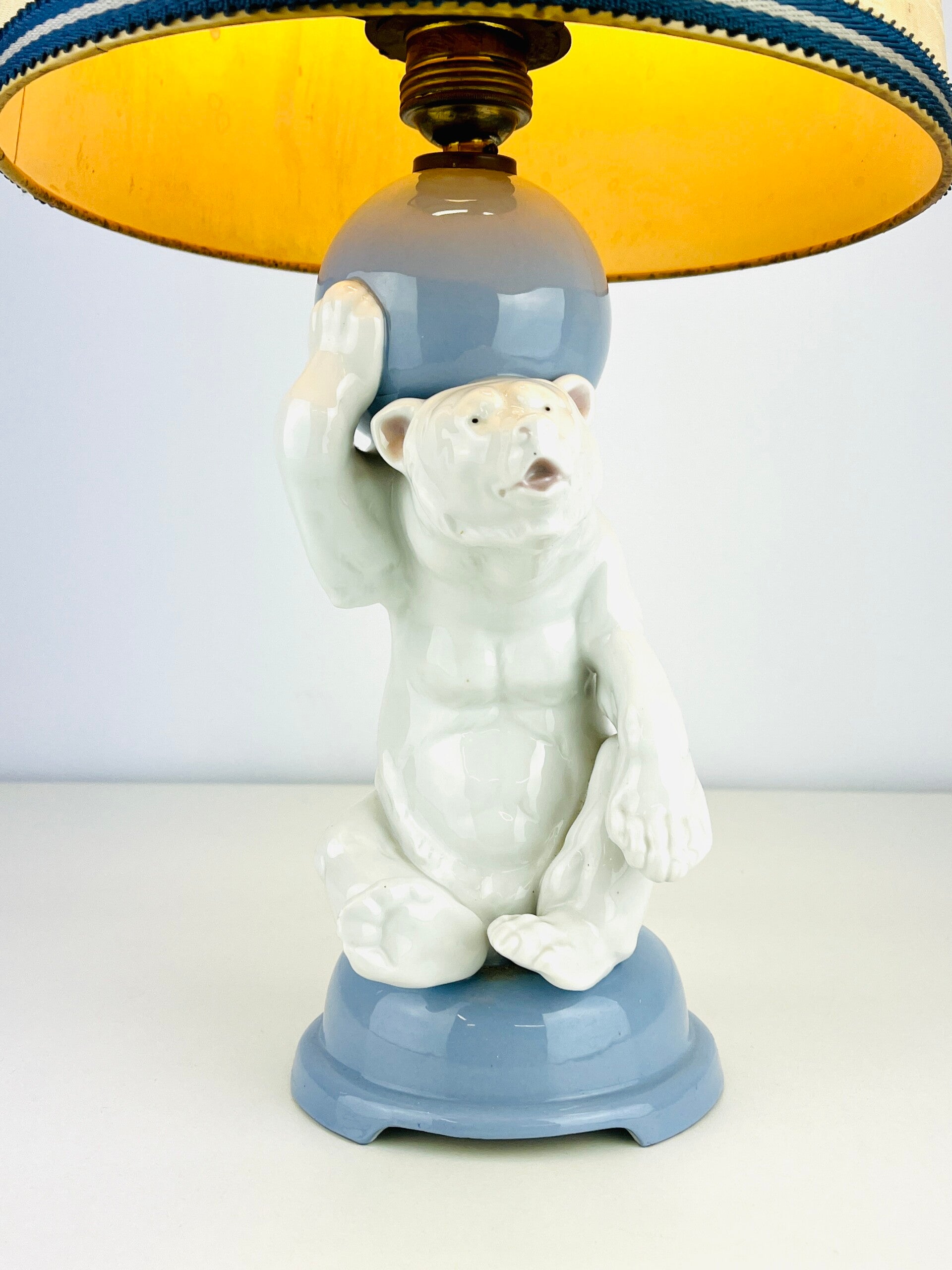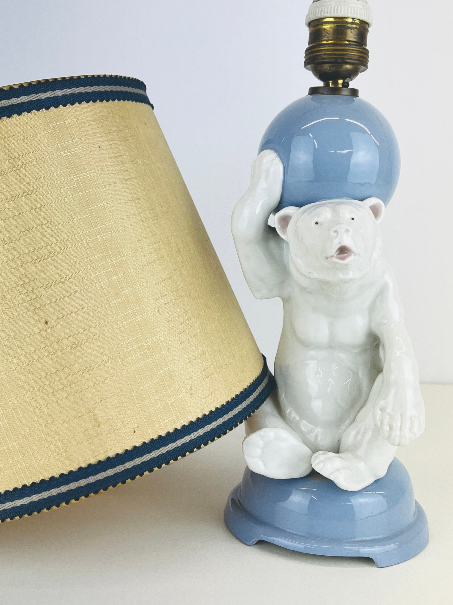Porcelain table lamp from the Art Deco period of a circus polar bear carrying a sky-blue ball.