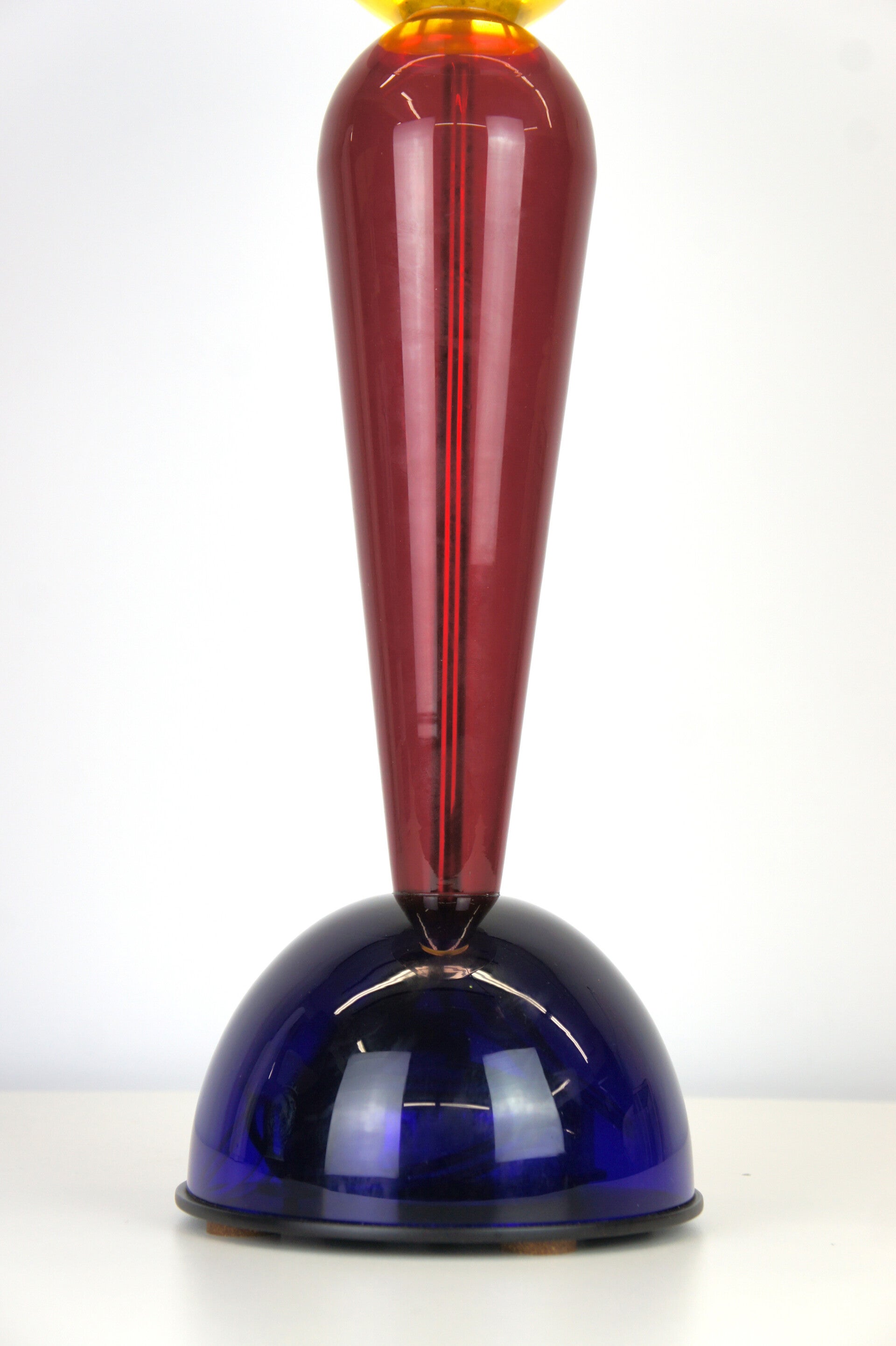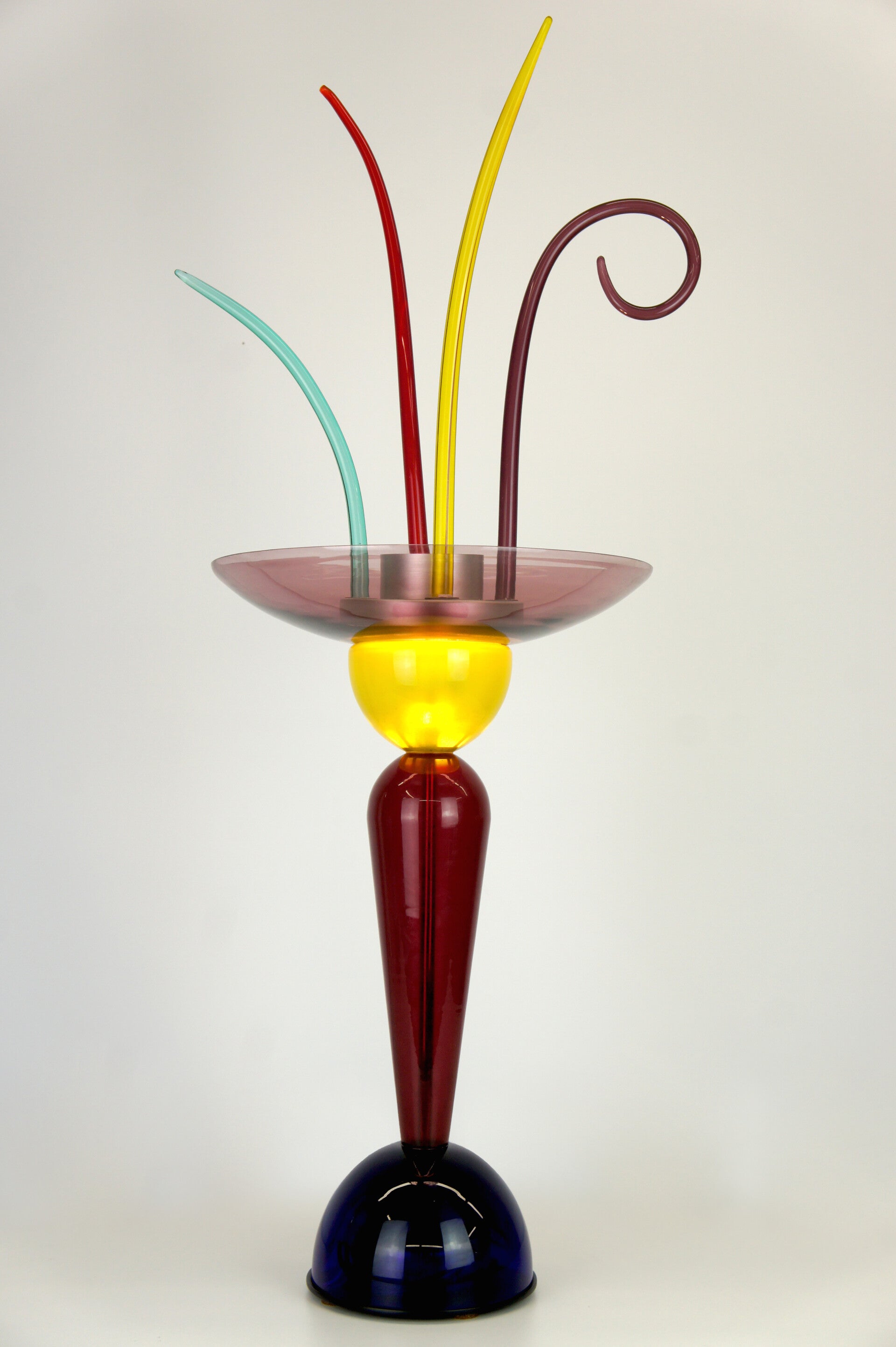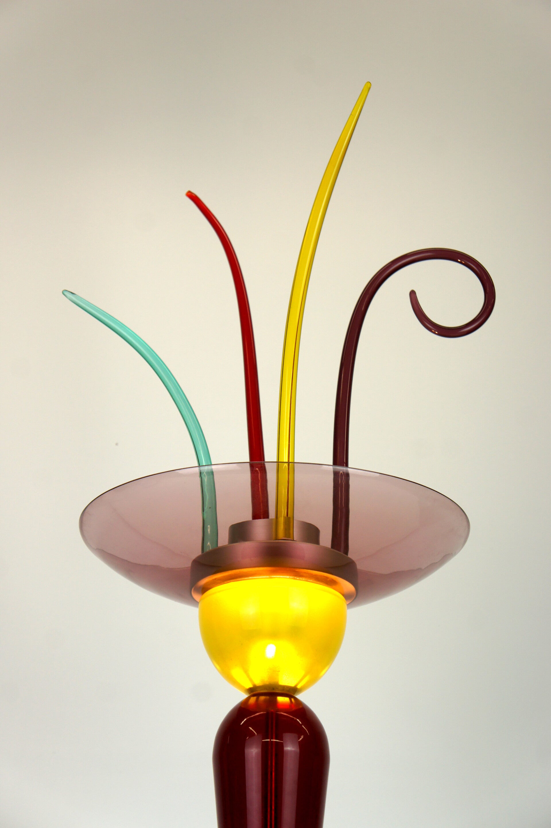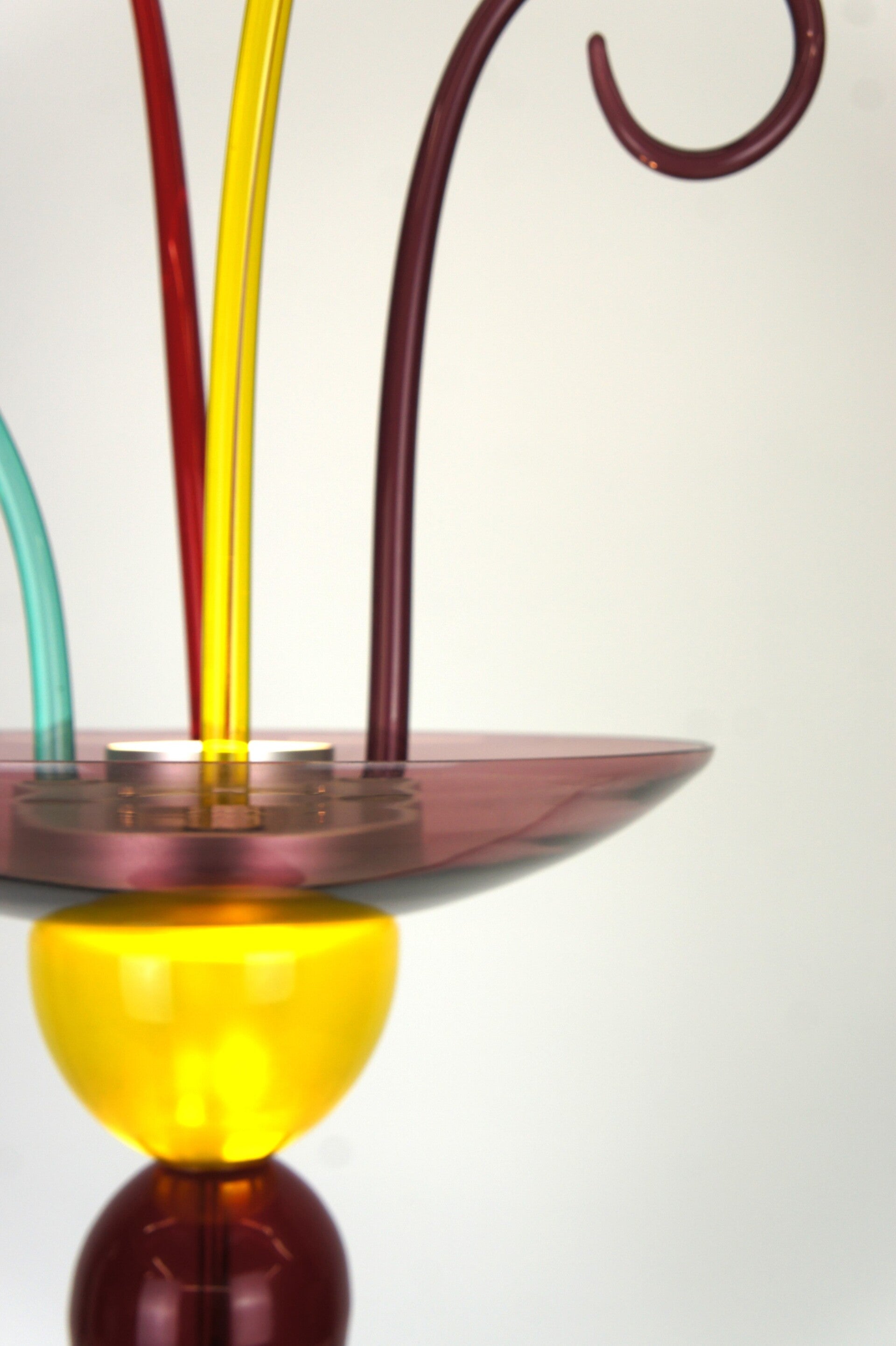 A combination of various colours that reflect the Memphis period. Bright and soft pastel colours were chosen, such as the pink bowl on the bright yellow glass element that houses the light source in an aluminium tube.