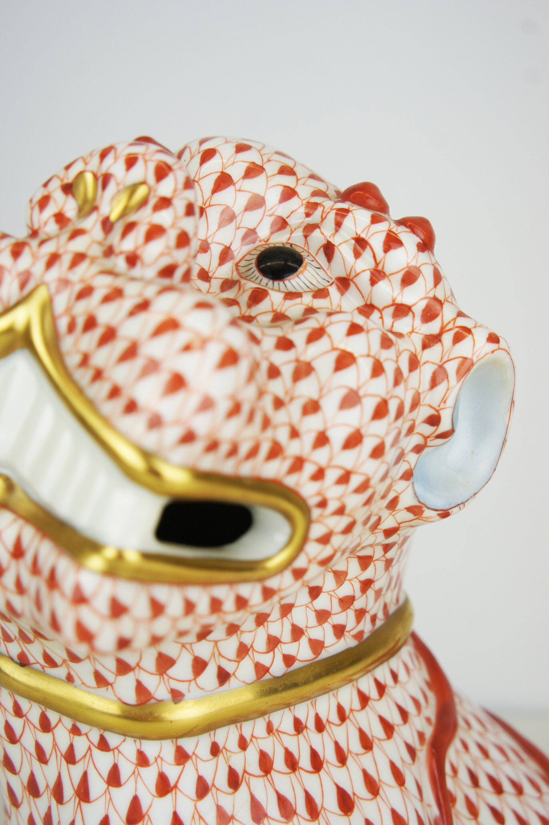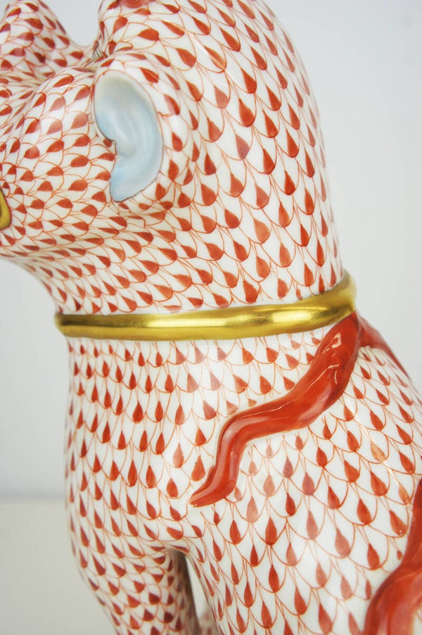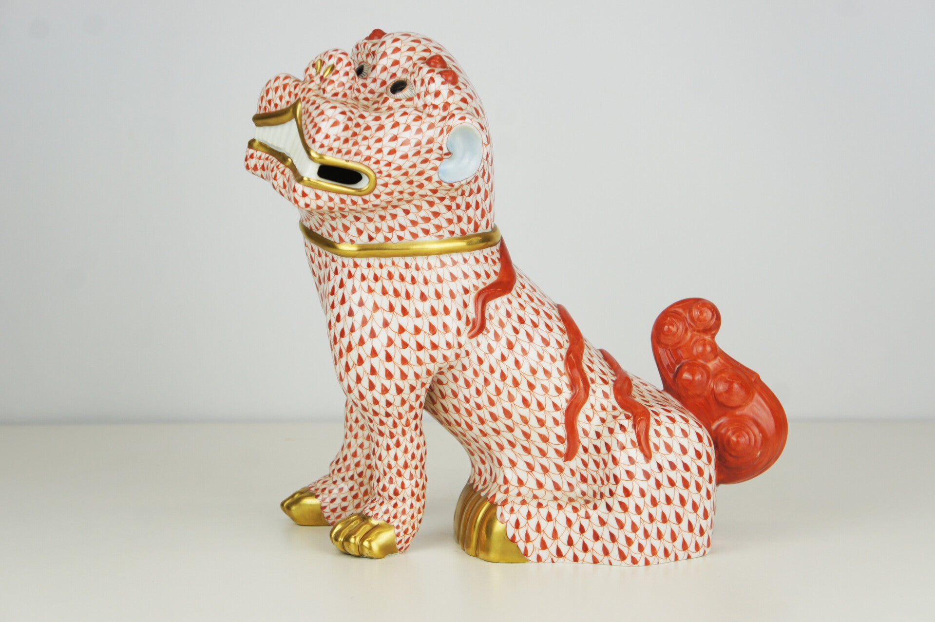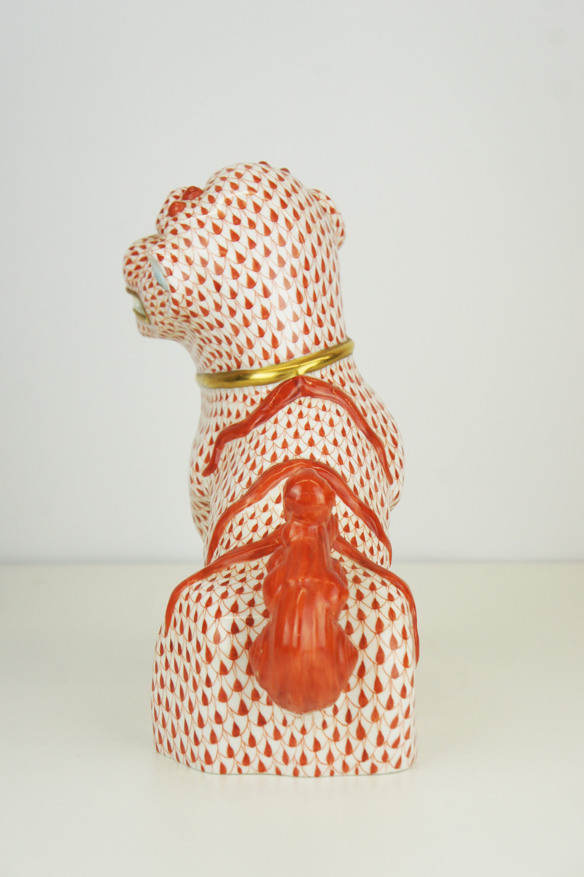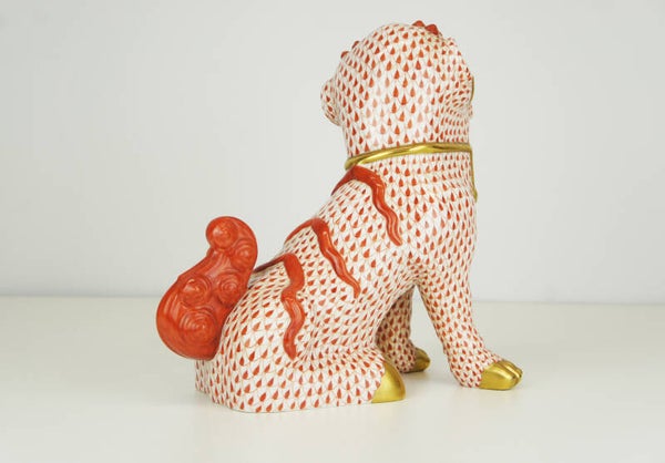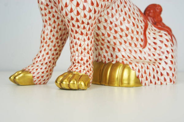 Hand painted Foo dog in porcelain in a red fishnet pattern by Herend.