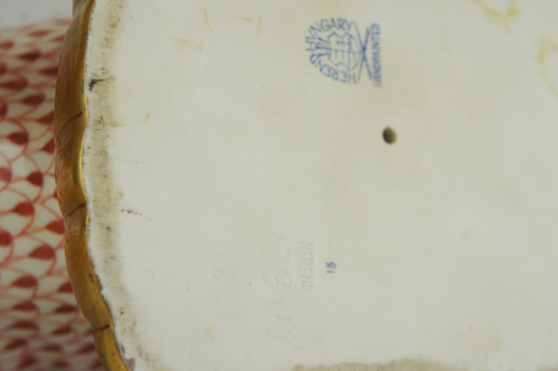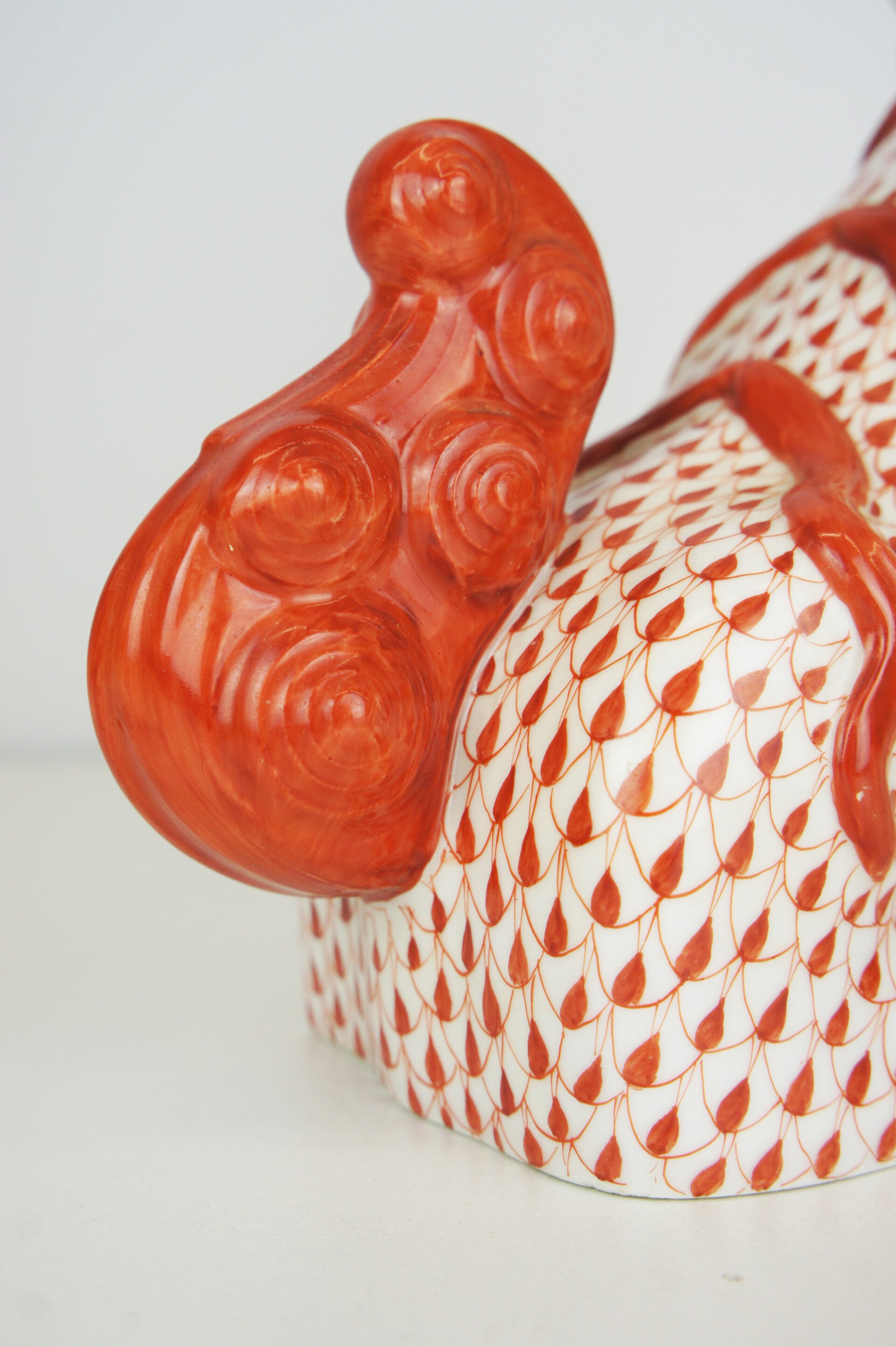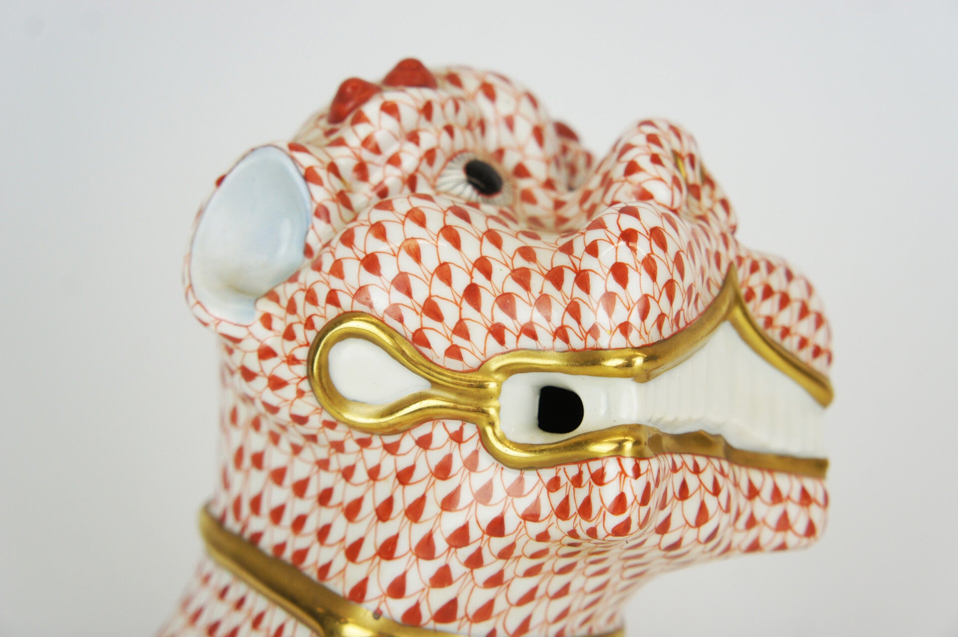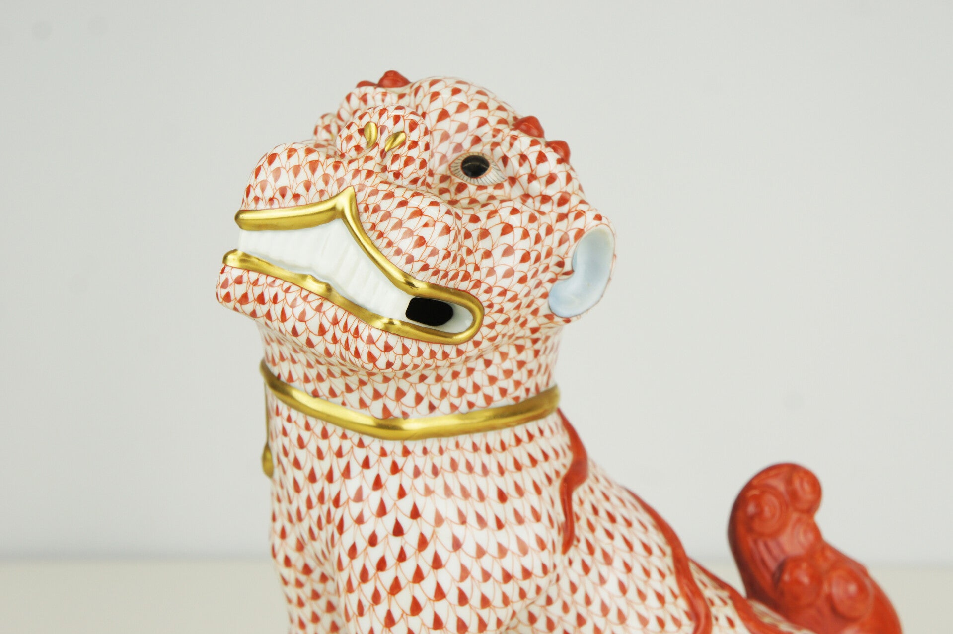 Hand painted Foo dog in porcelain in a red fishnet pattern by Herend.