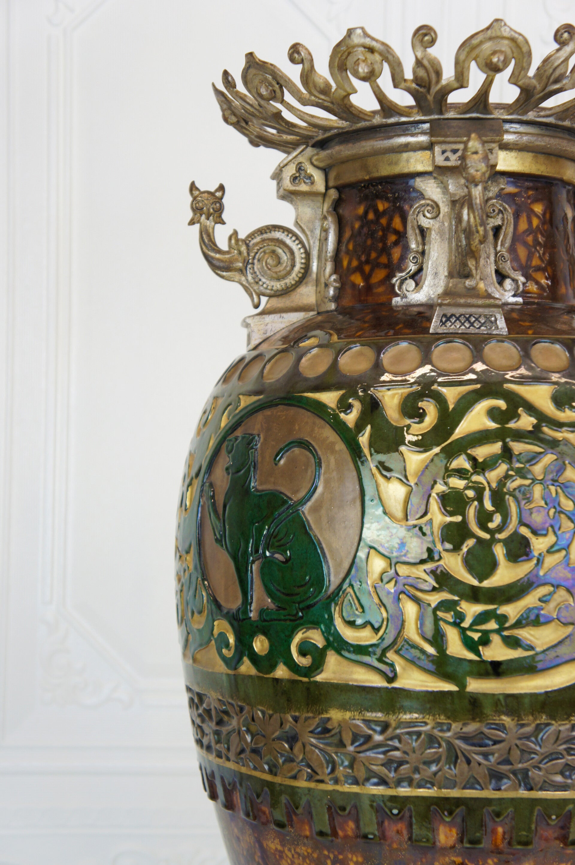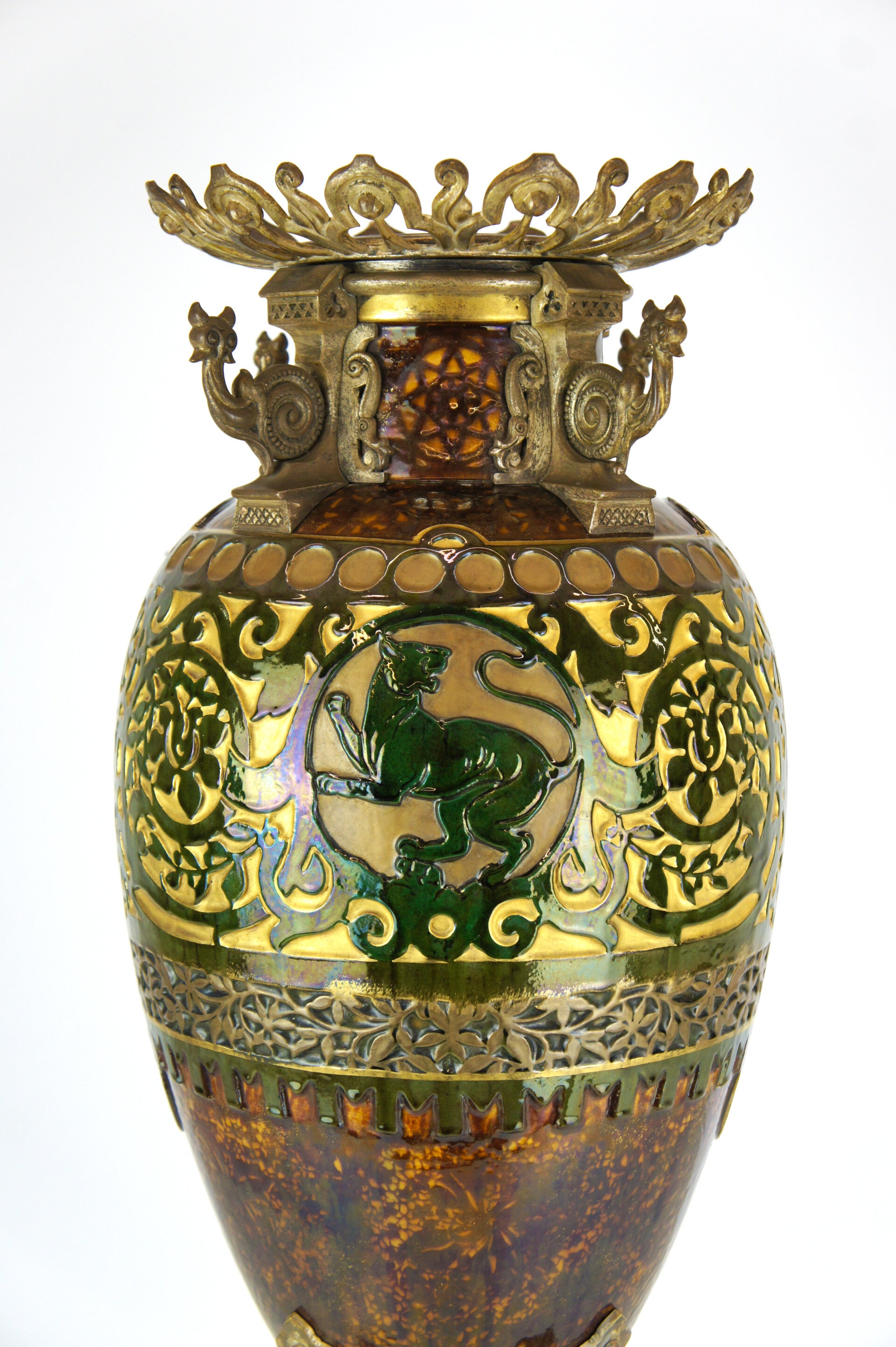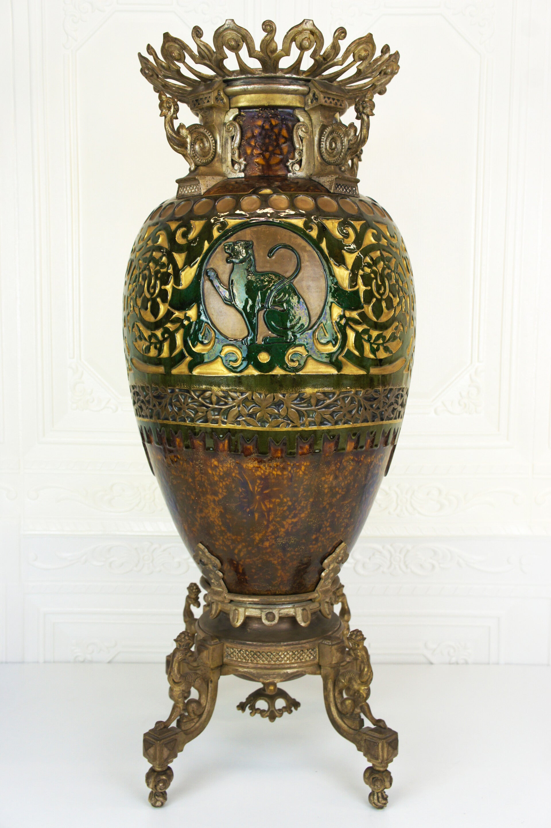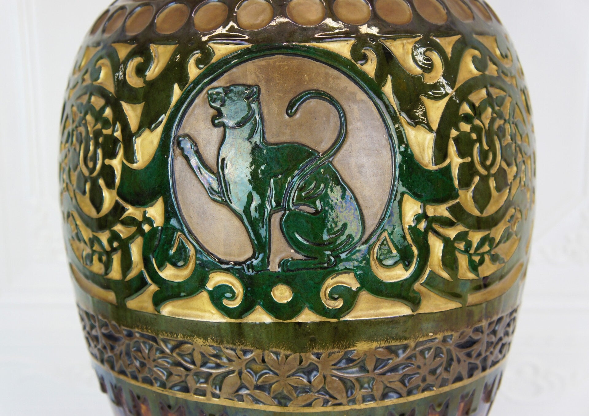 The vase is decorated with two striking green glazed panthers, each taking a different pose and looking in a different direction.