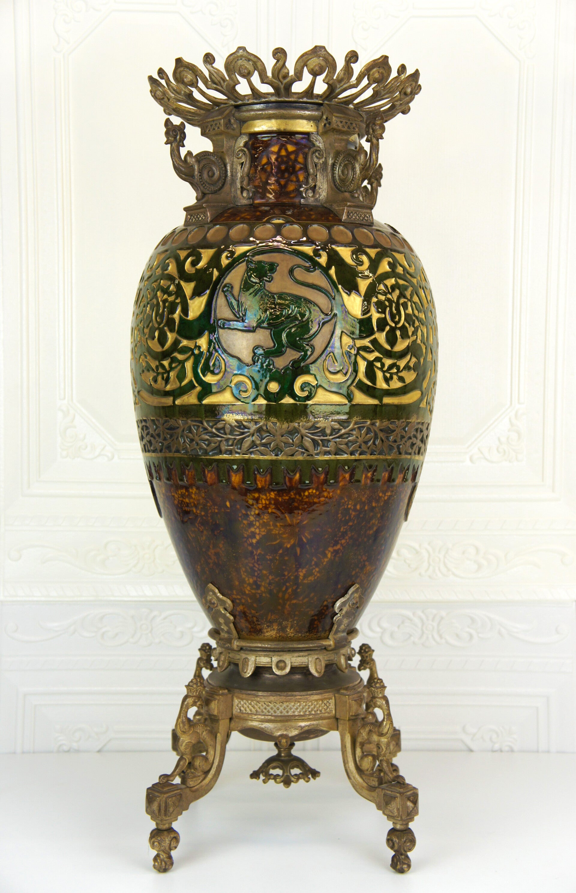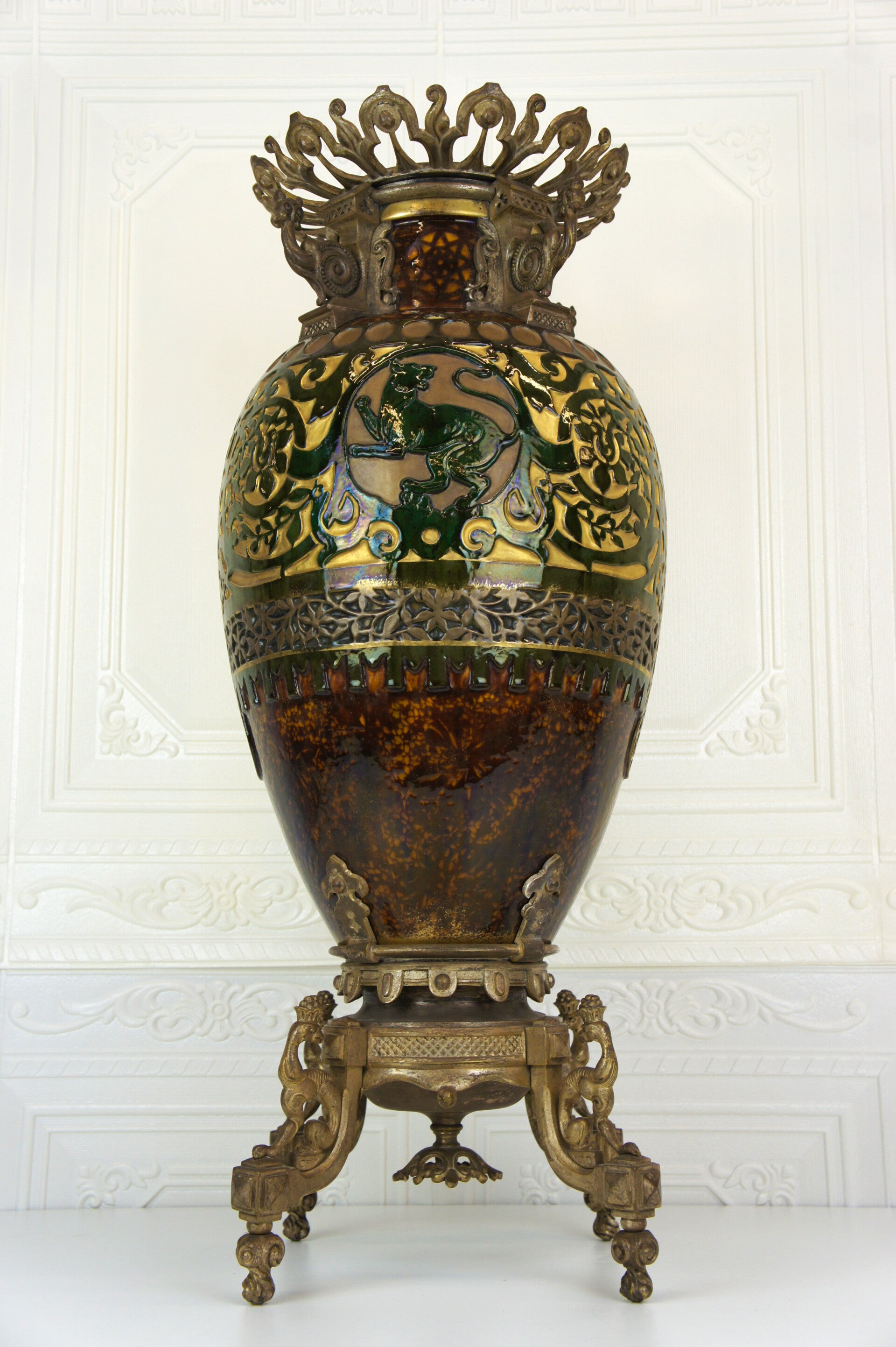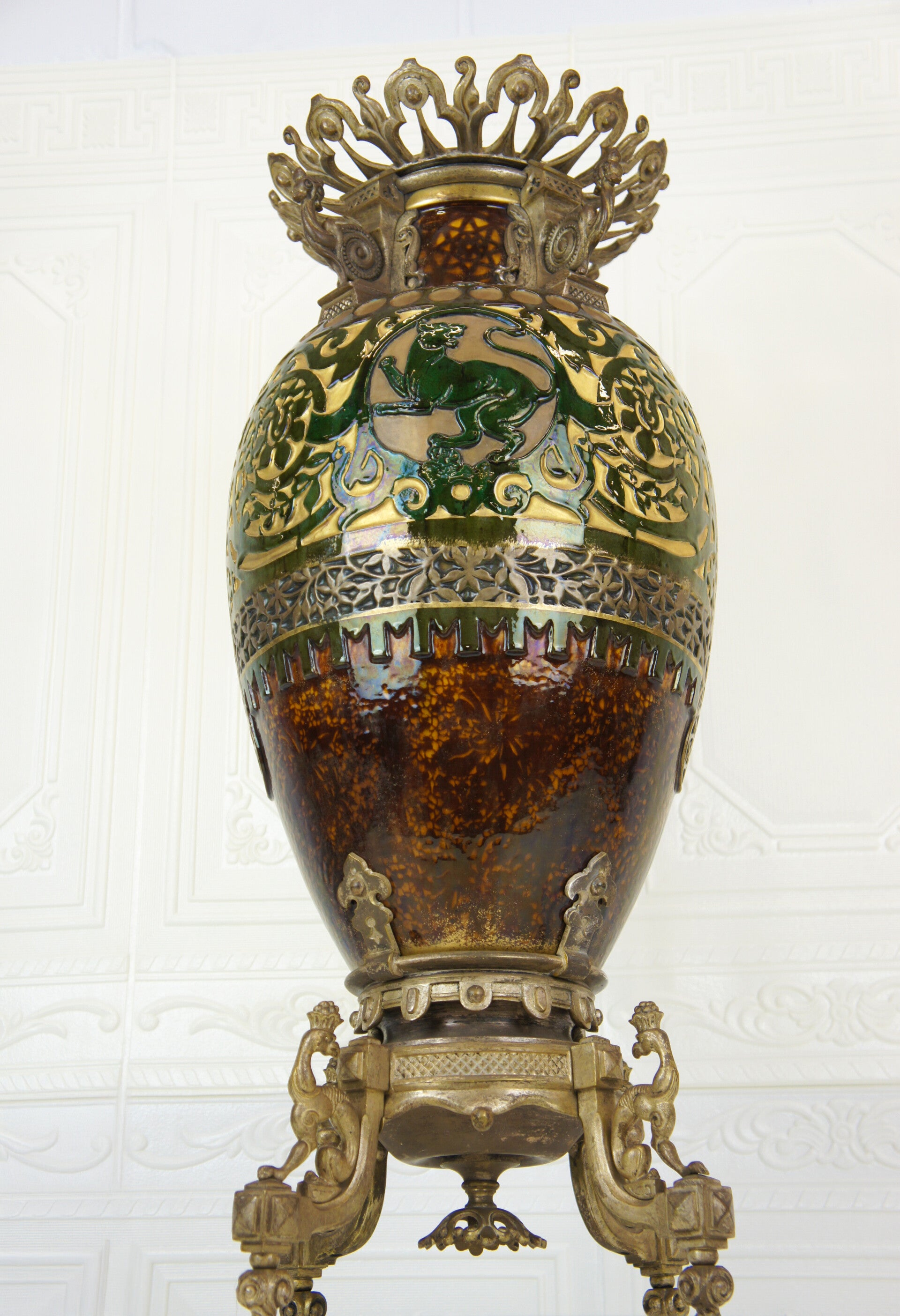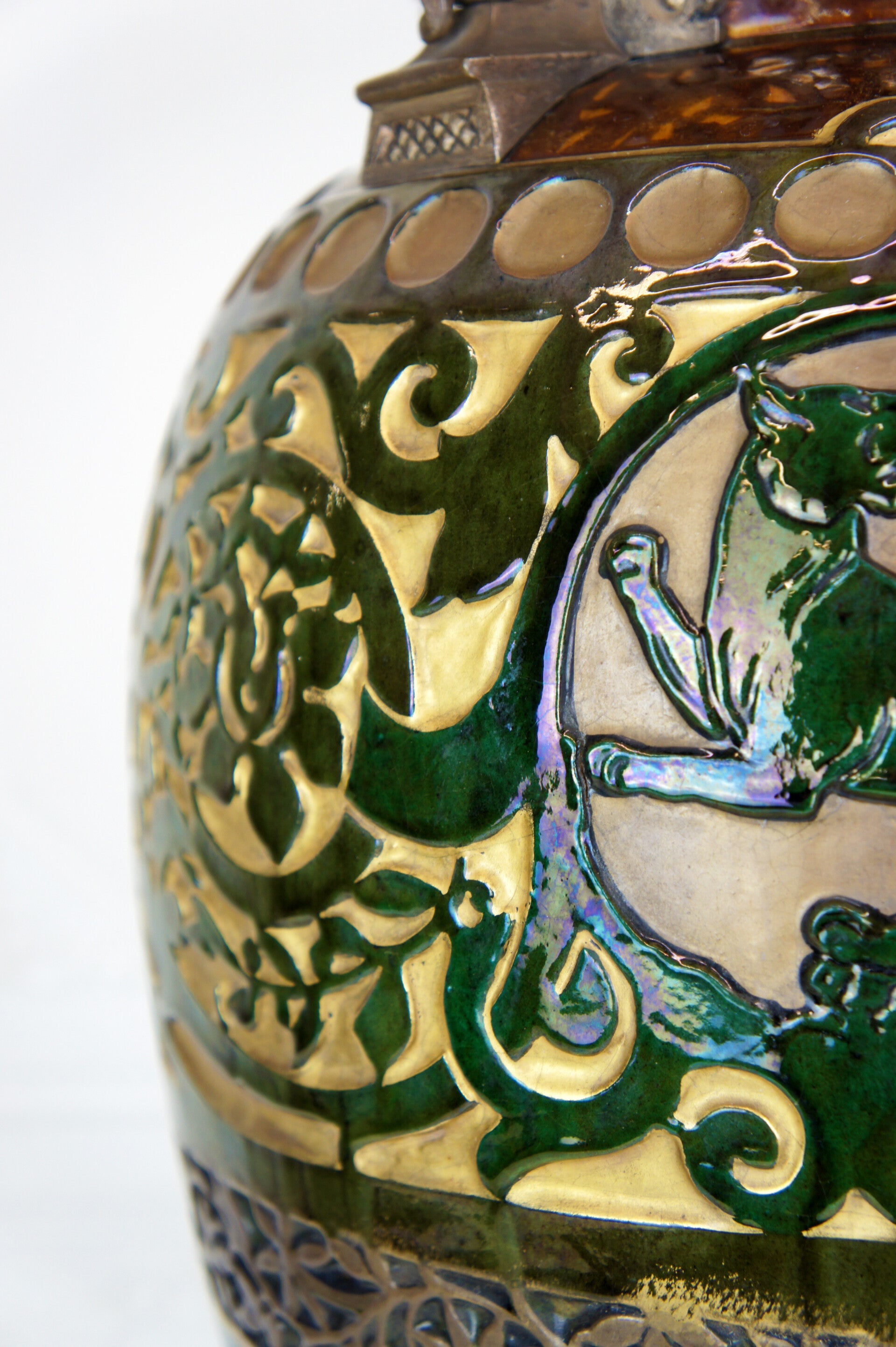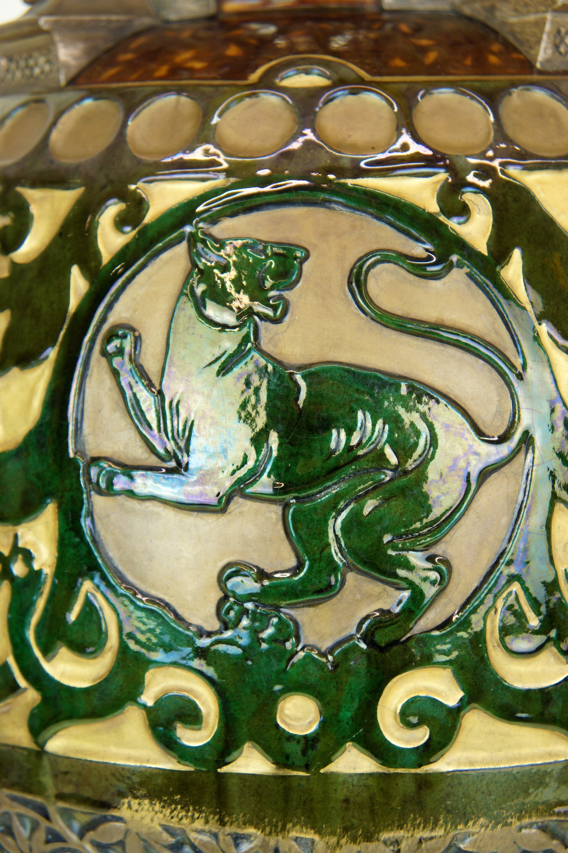 The vase is decorated with two striking green glazed panthers, each taking a different pose and looking in a different direction.