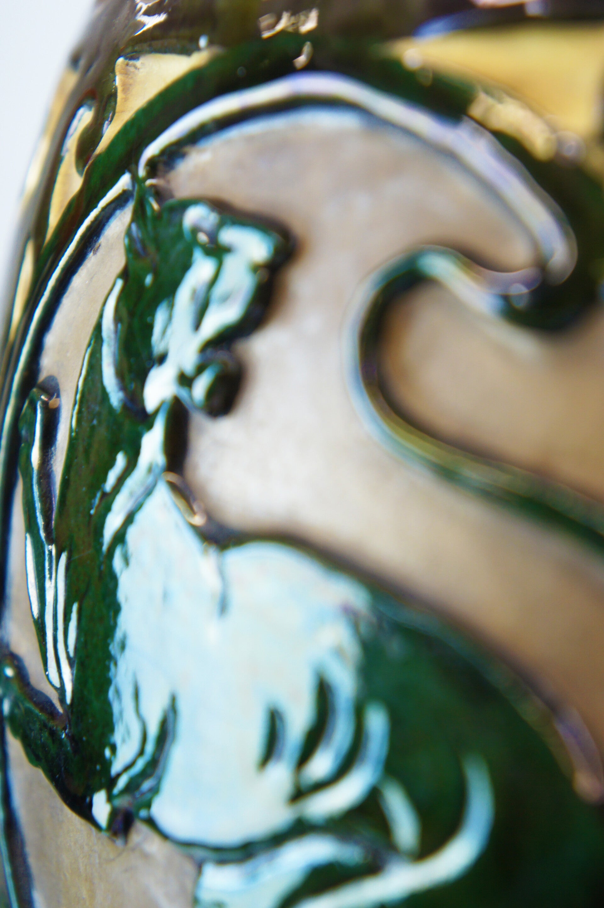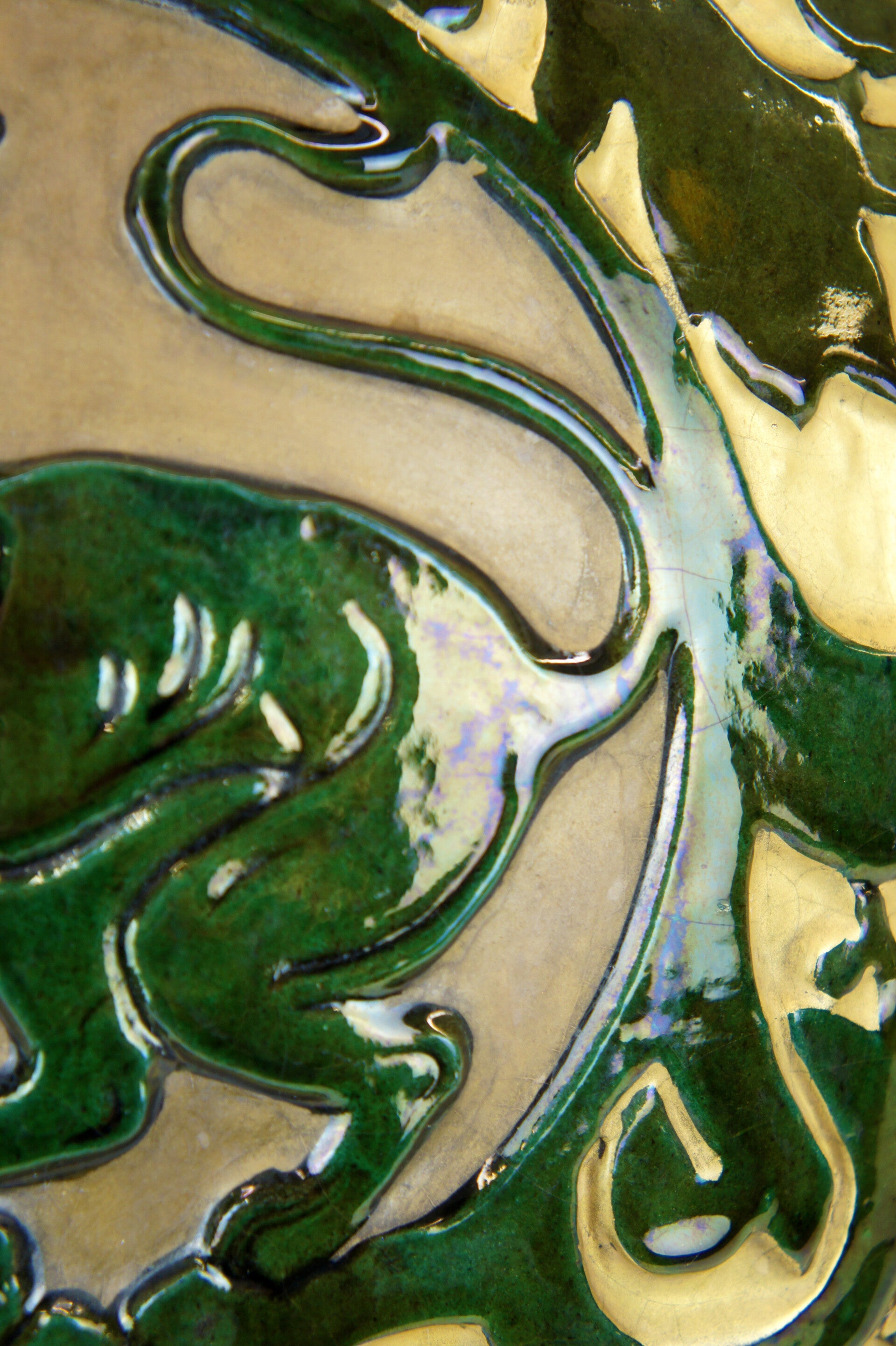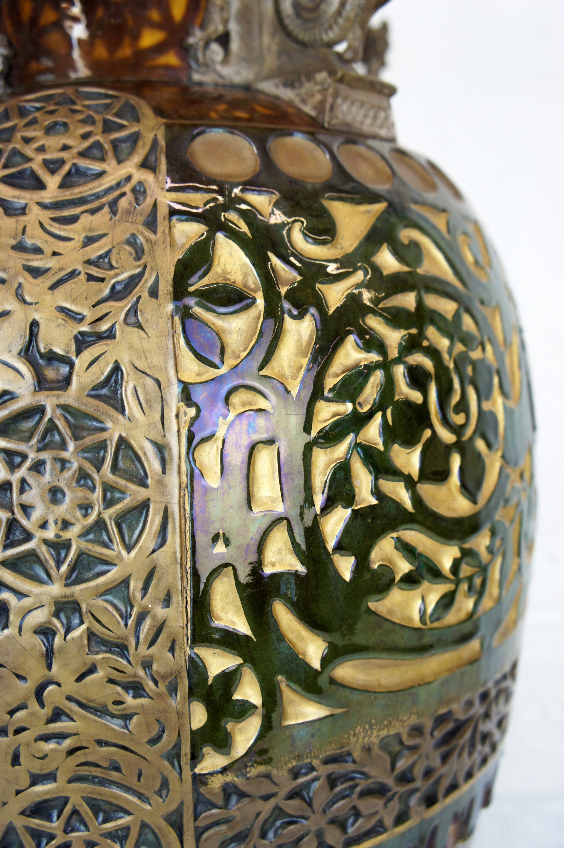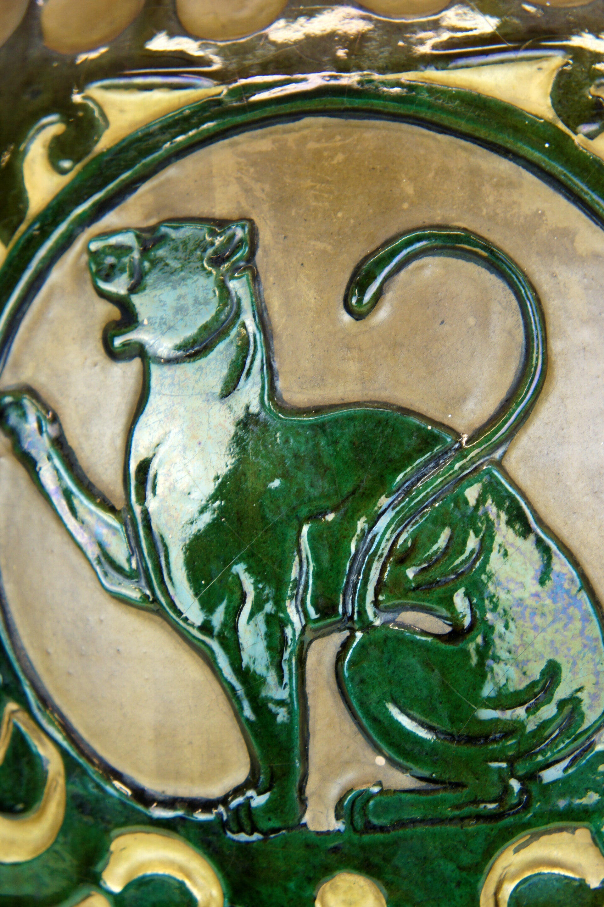 The vase is decorated with two striking green glazed panthers, each taking a different pose and looking in a different direction.