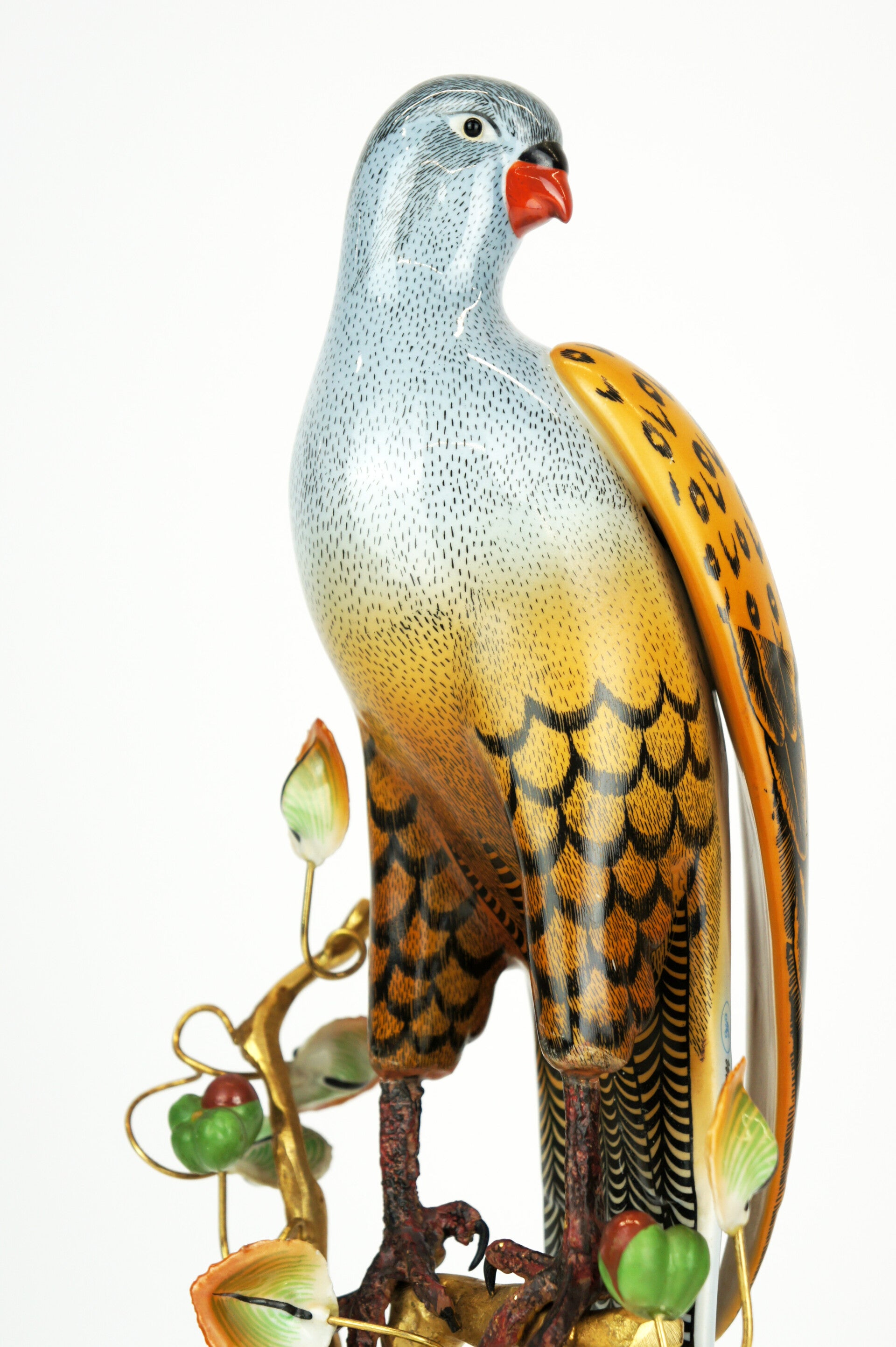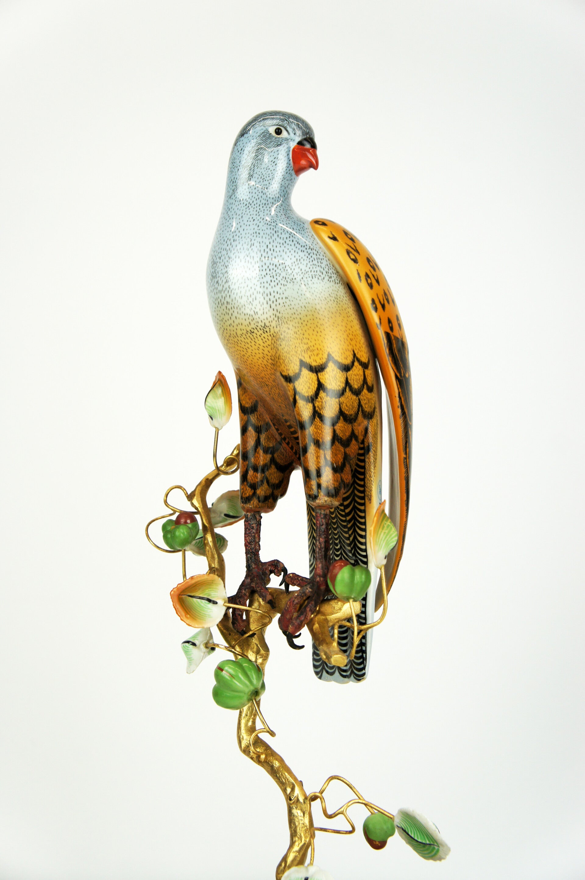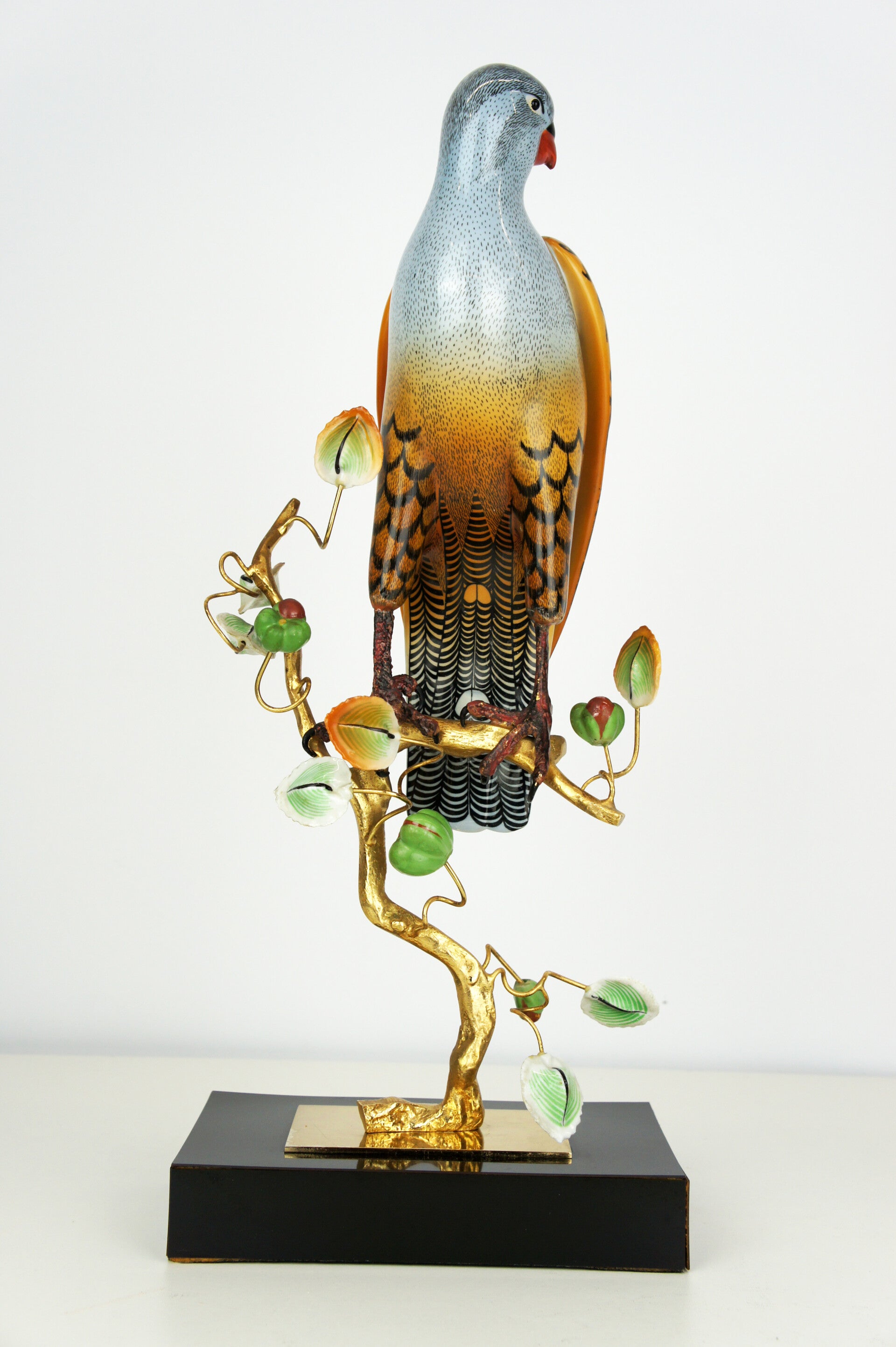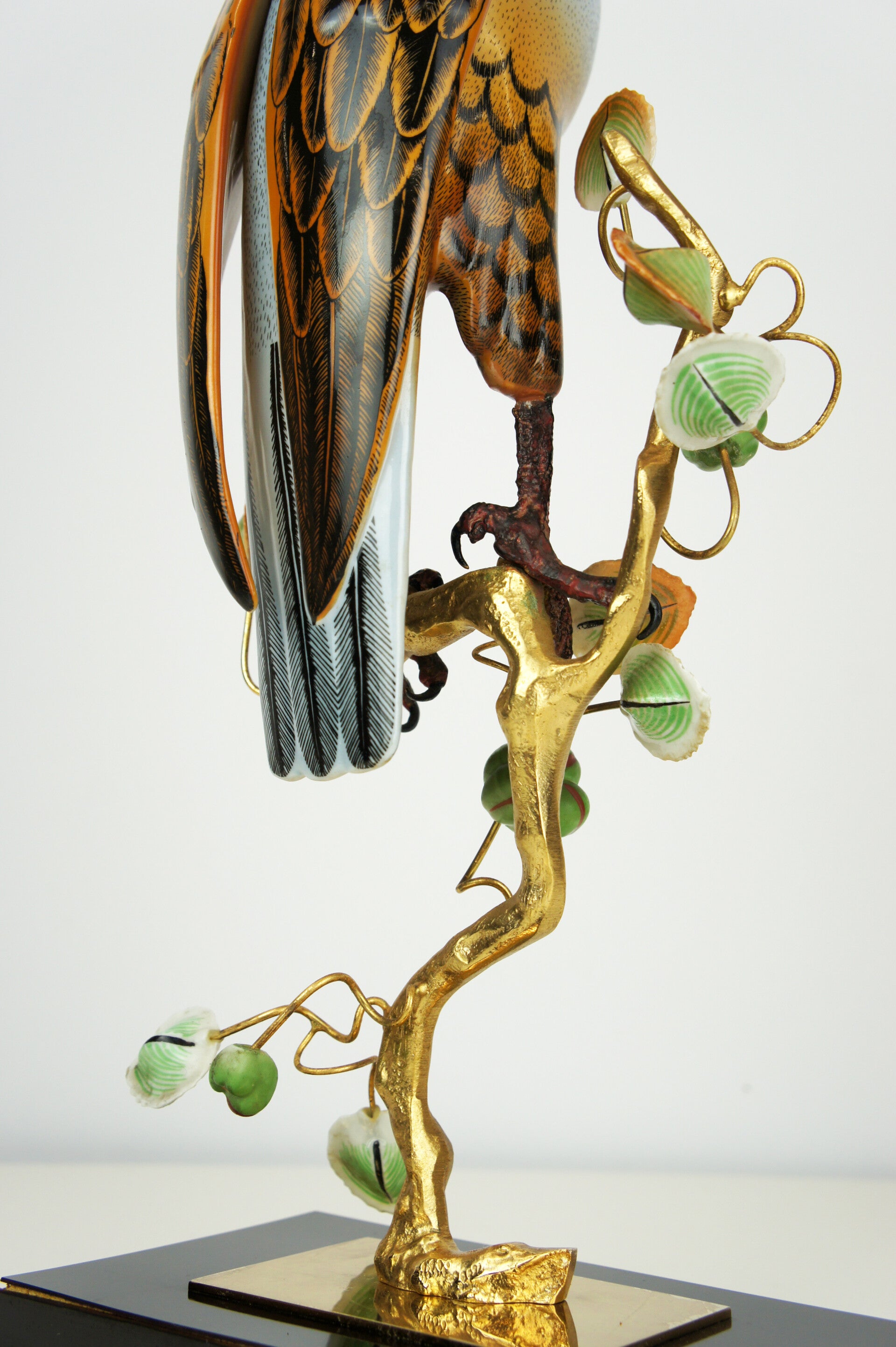 Finely crafted porcelain falcon by Giulia Mangani, from the 1970s. The falcon is finished in detail and rests on a bronze-gilded branch, which is richly filled with fruits and leaves.
