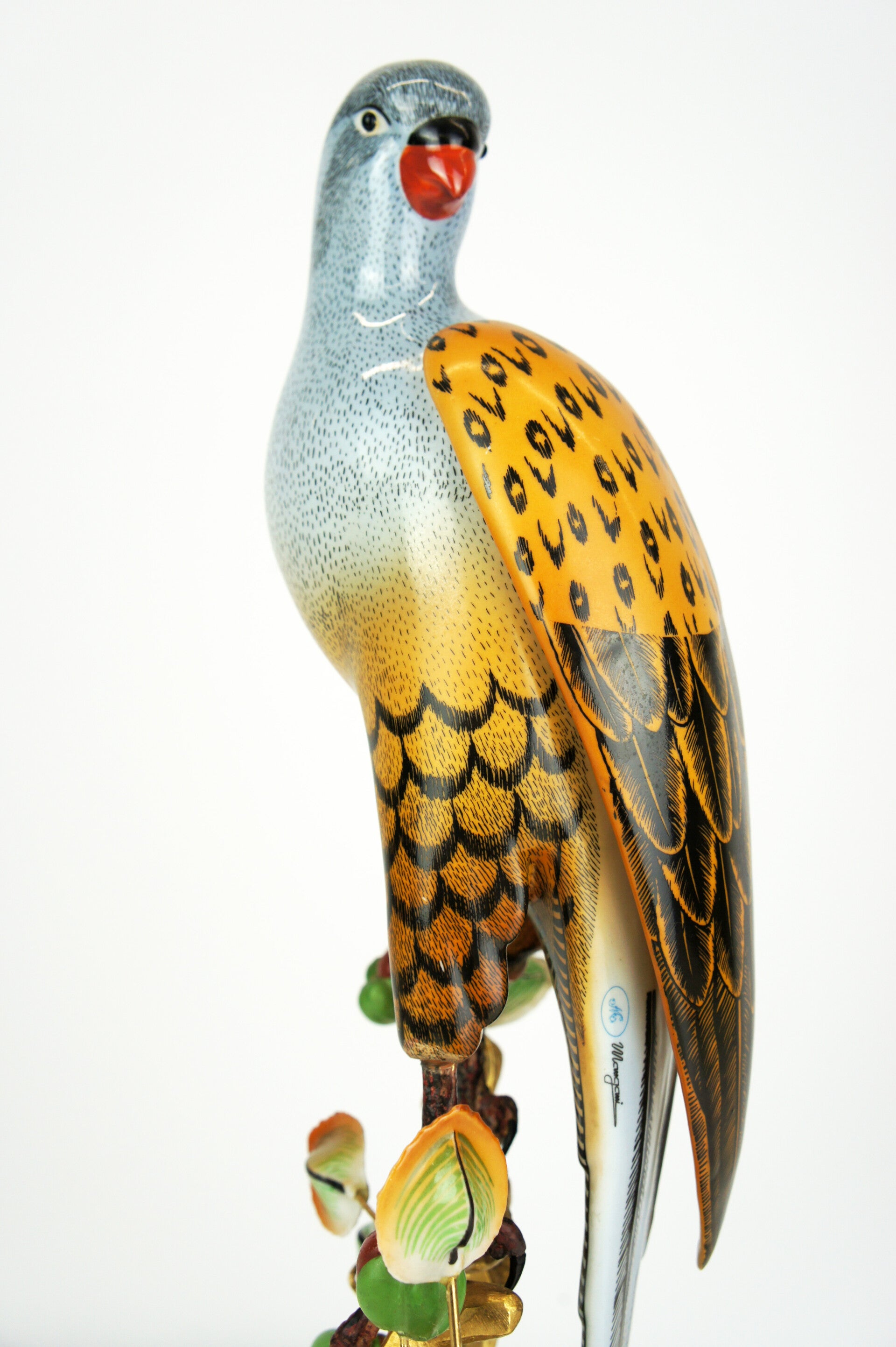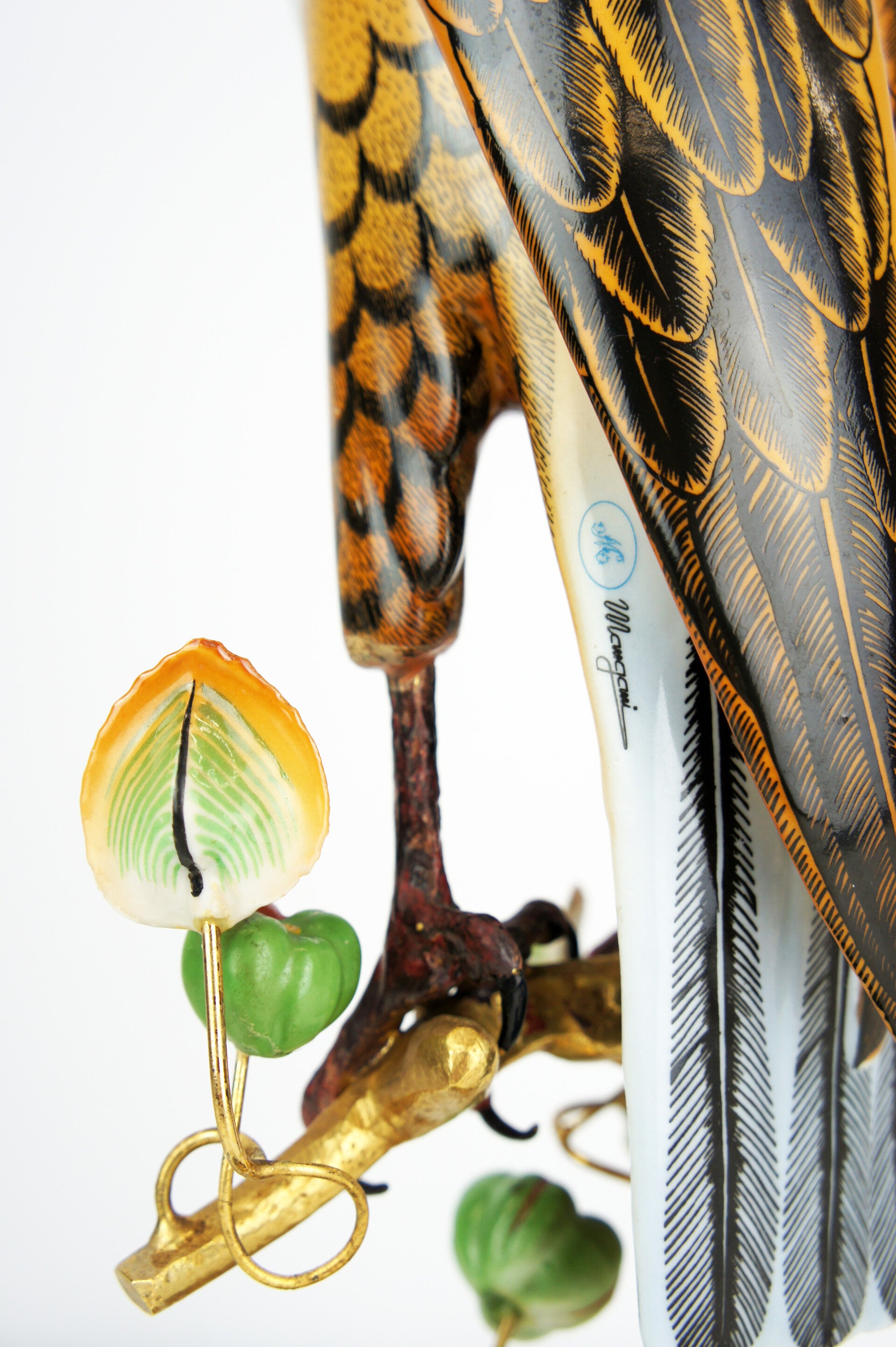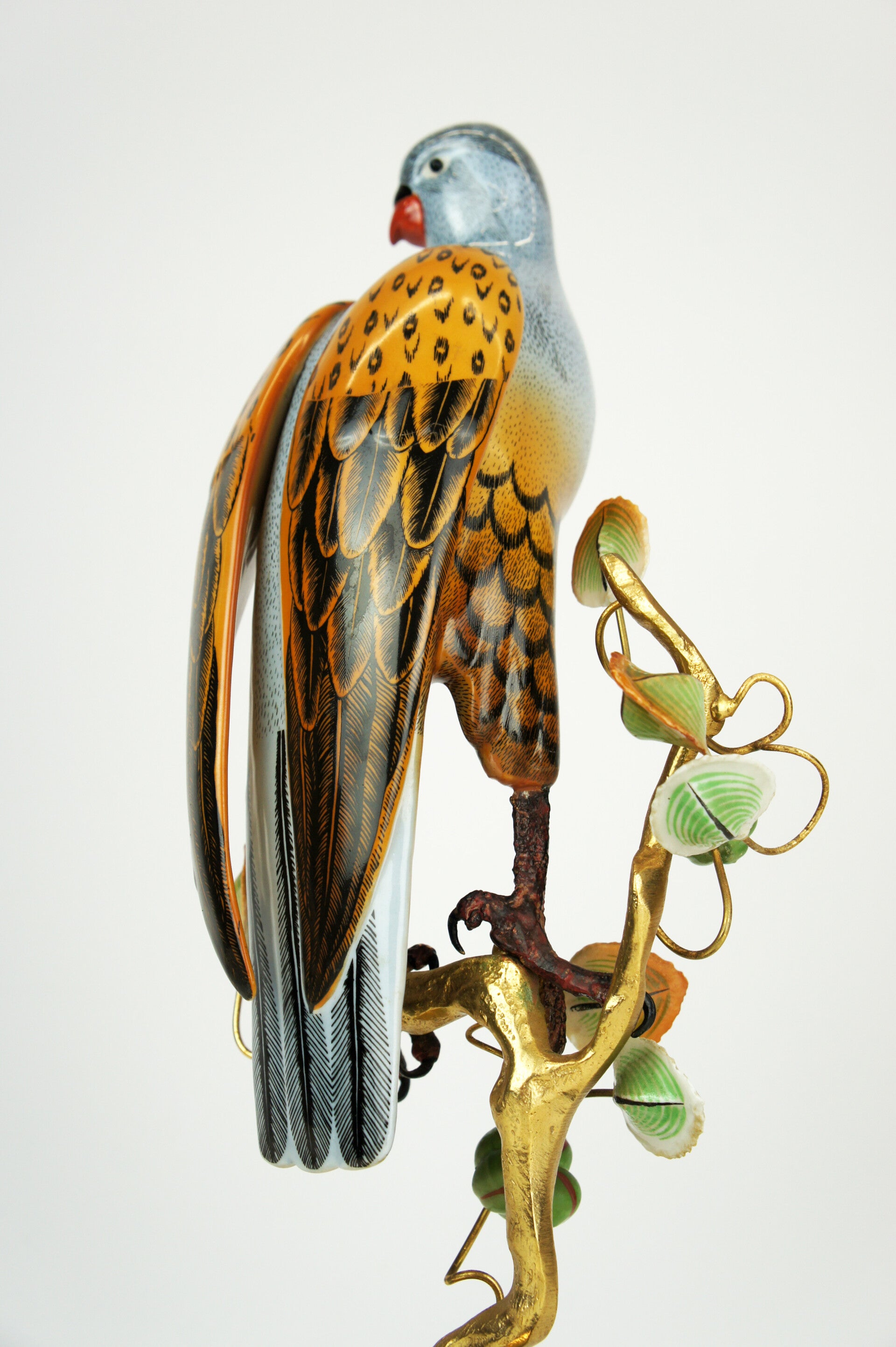 Finely crafted porcelain falcon by Giulia Mangani, from the 1970s. The falcon is finished in detail and rests on a bronze-gilded branch, which is richly filled with fruits and leaves.