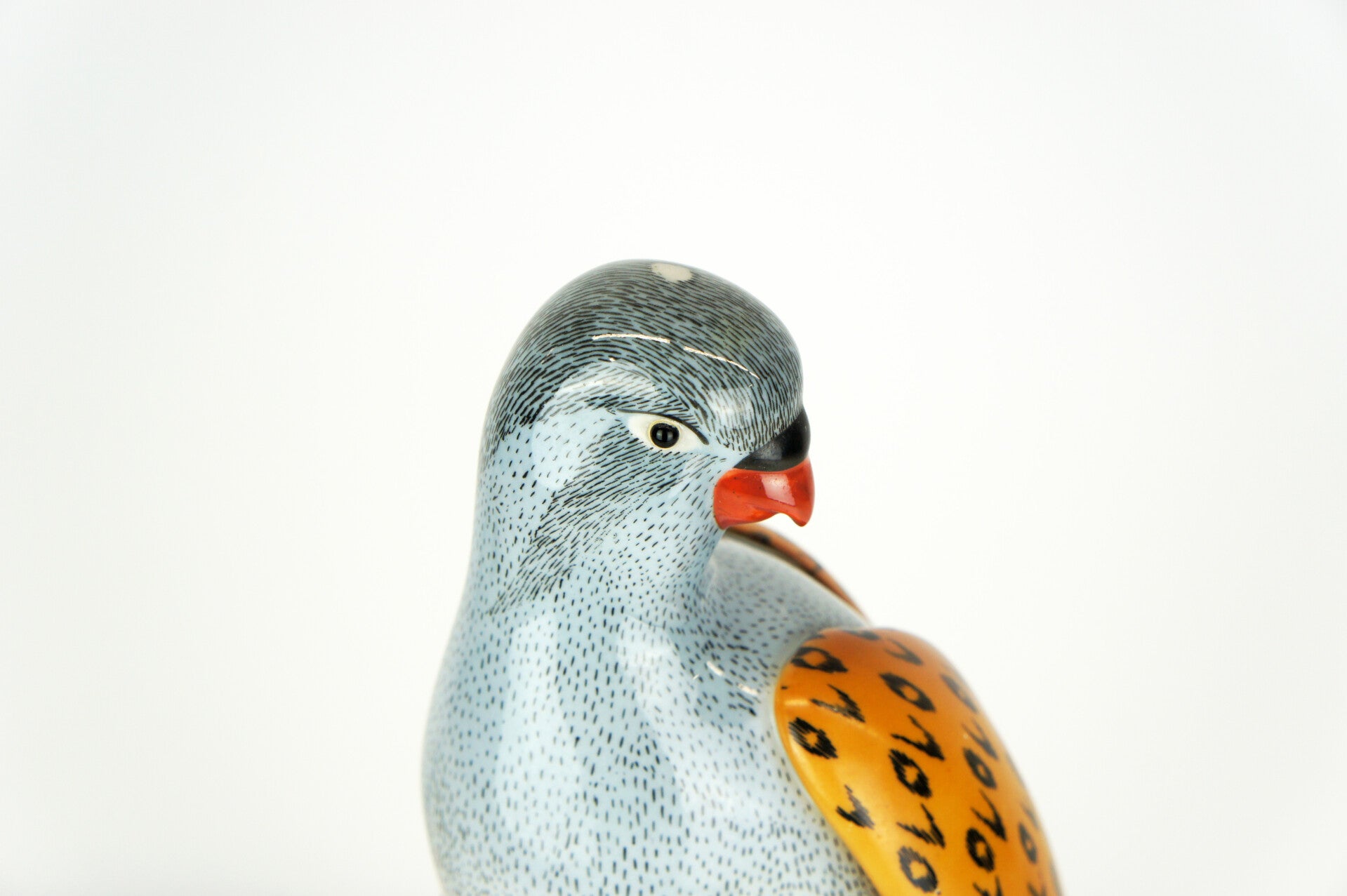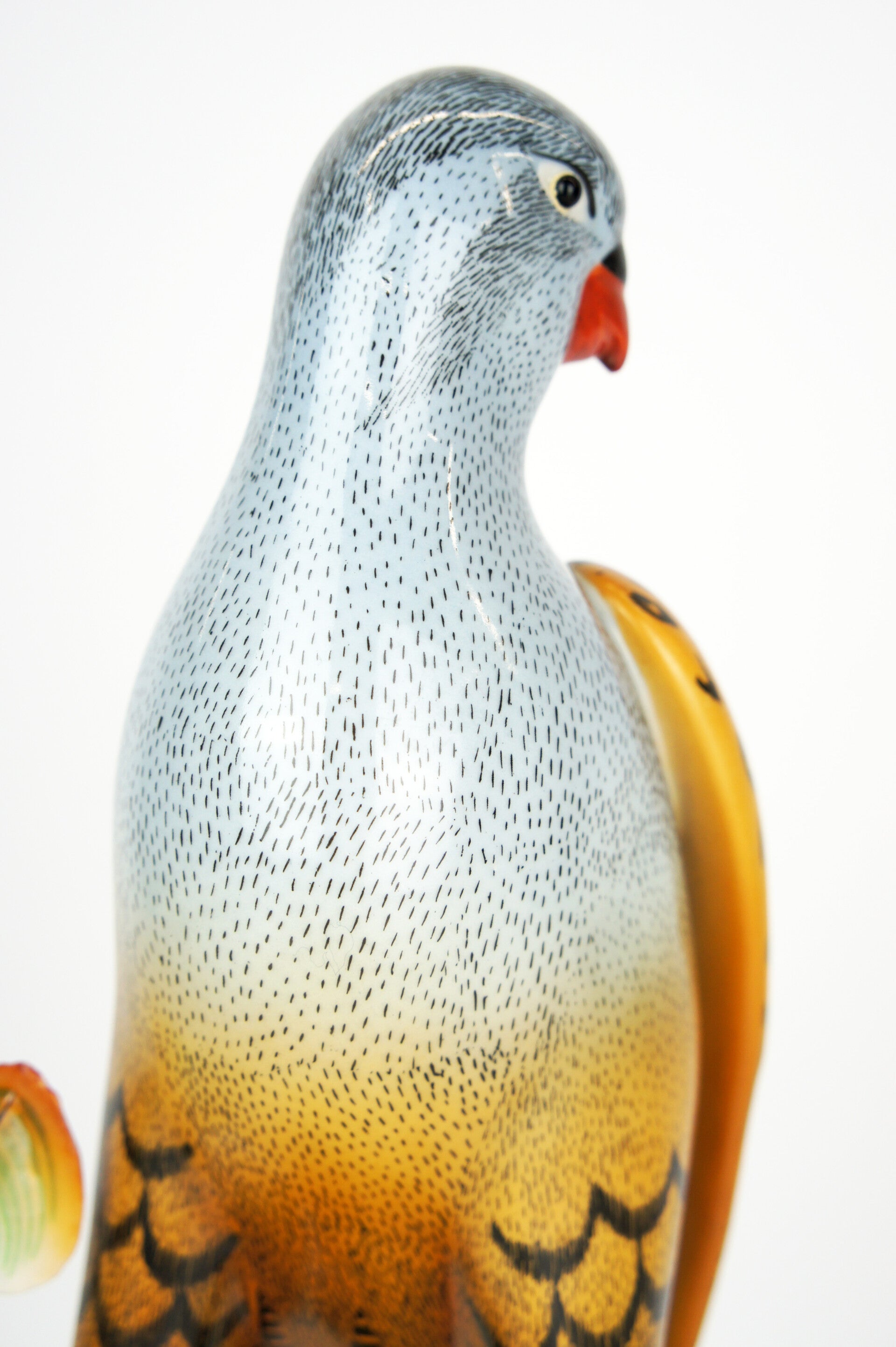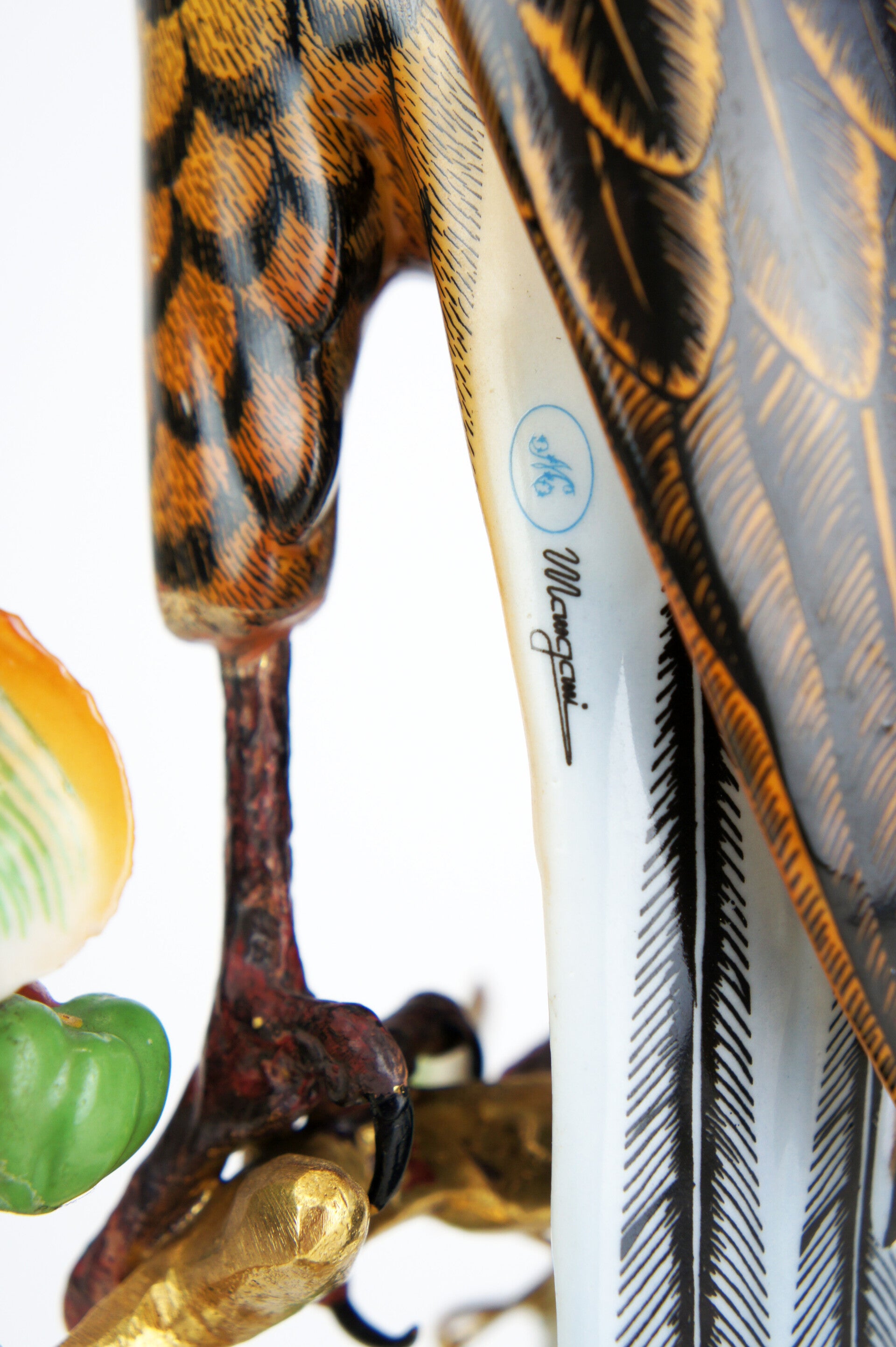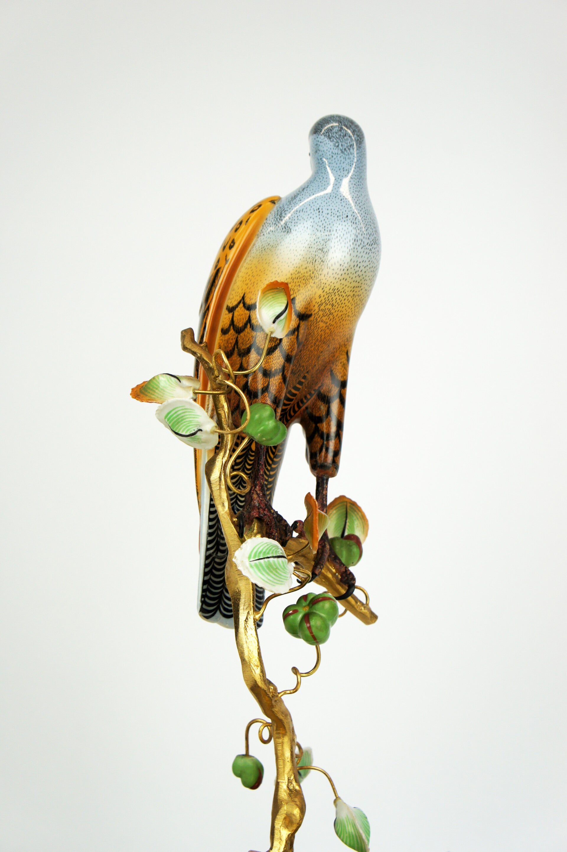 Finely crafted porcelain falcon by Giulia Mangani, from the 1970s. The falcon is finished in detail and rests on a bronze-gilded branch, which is richly filled with fruits and leaves.