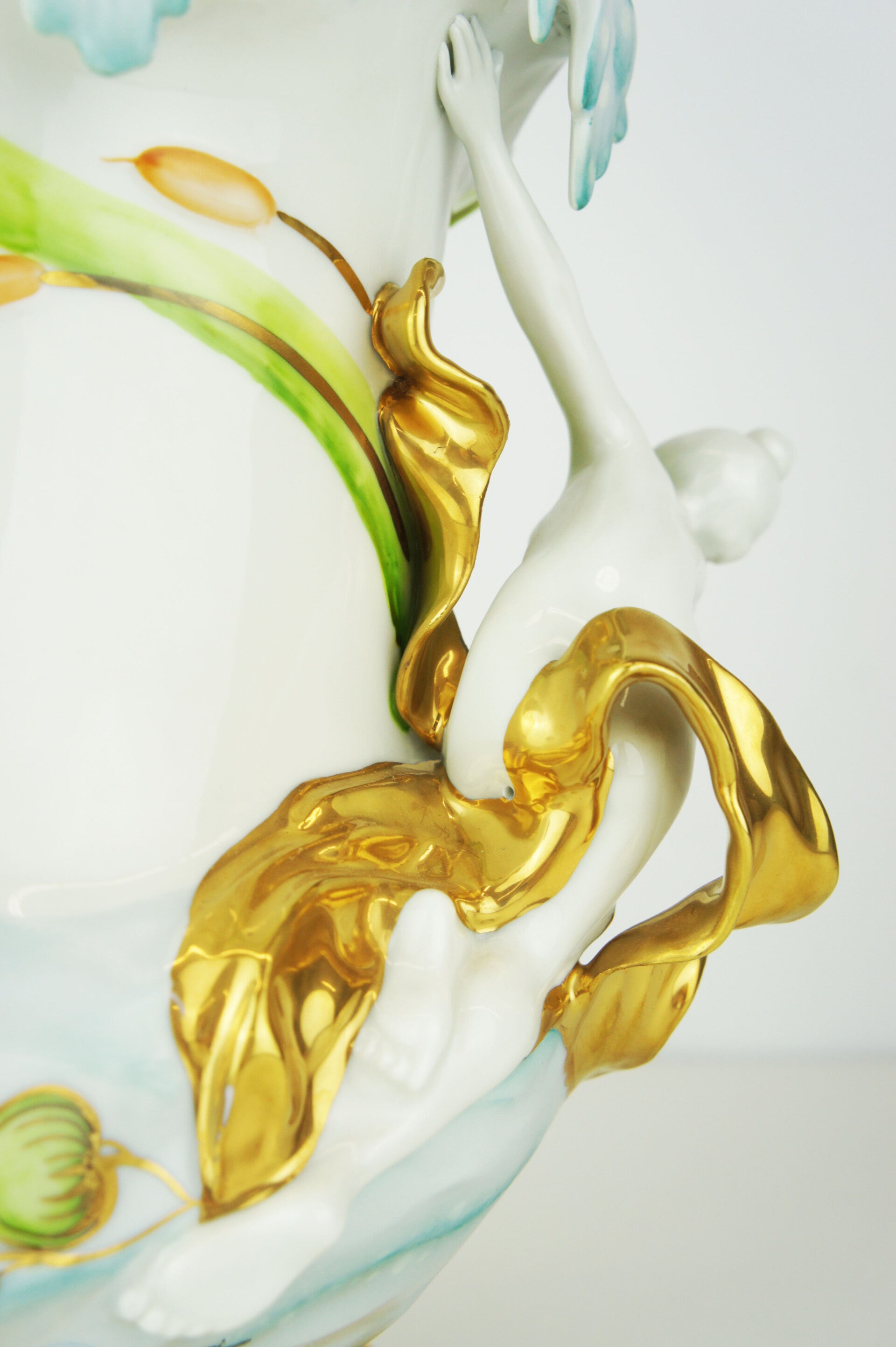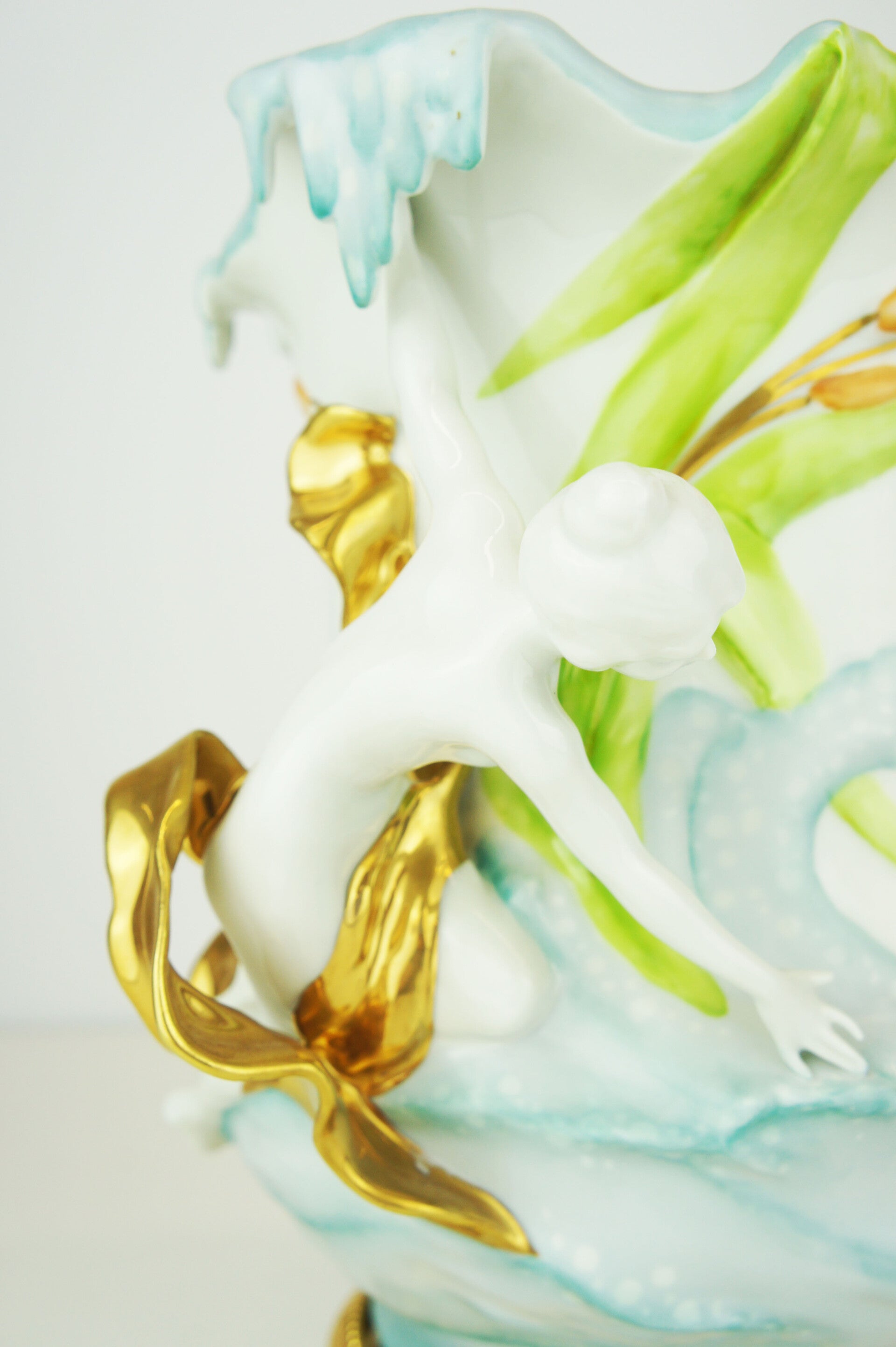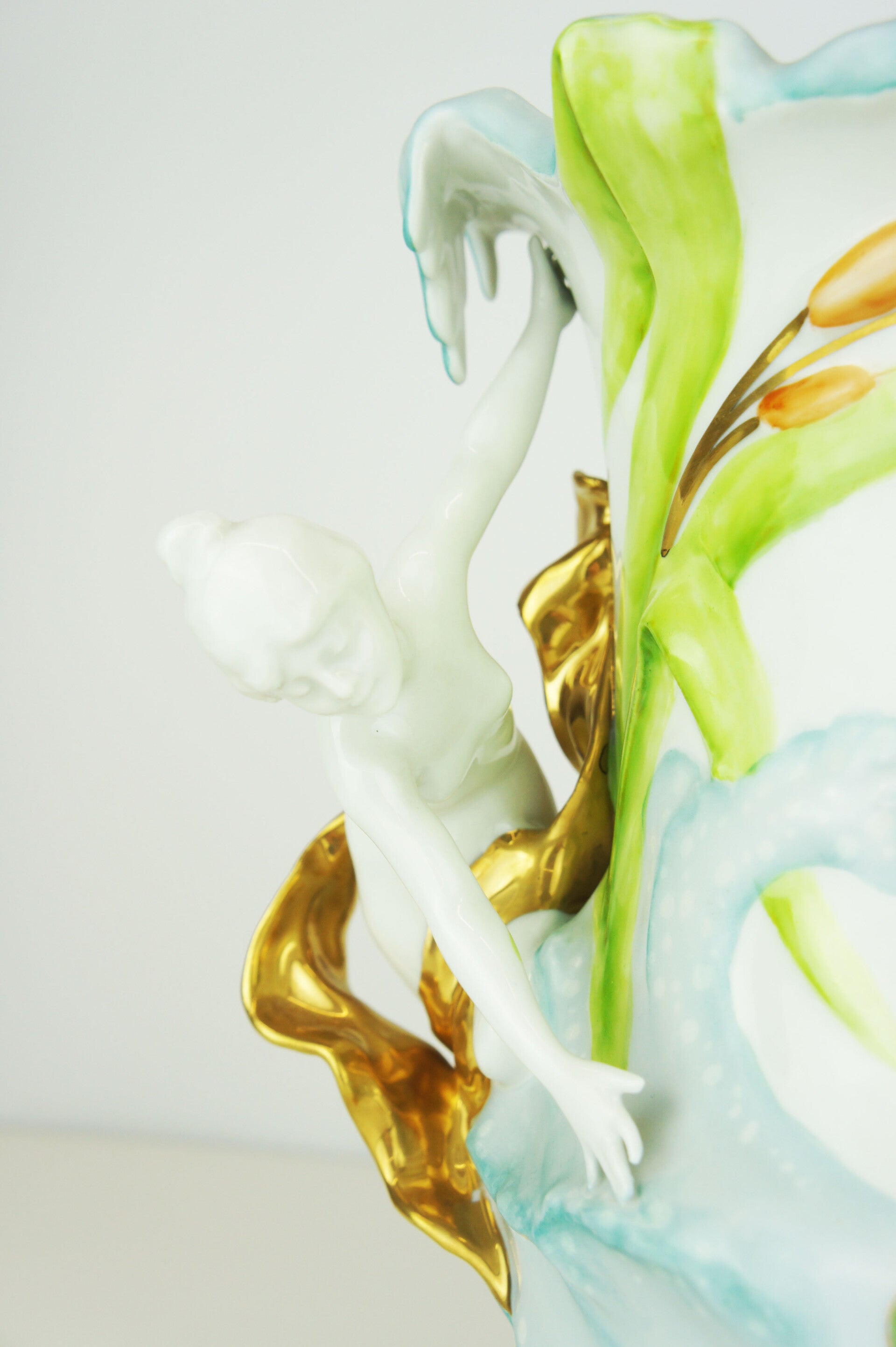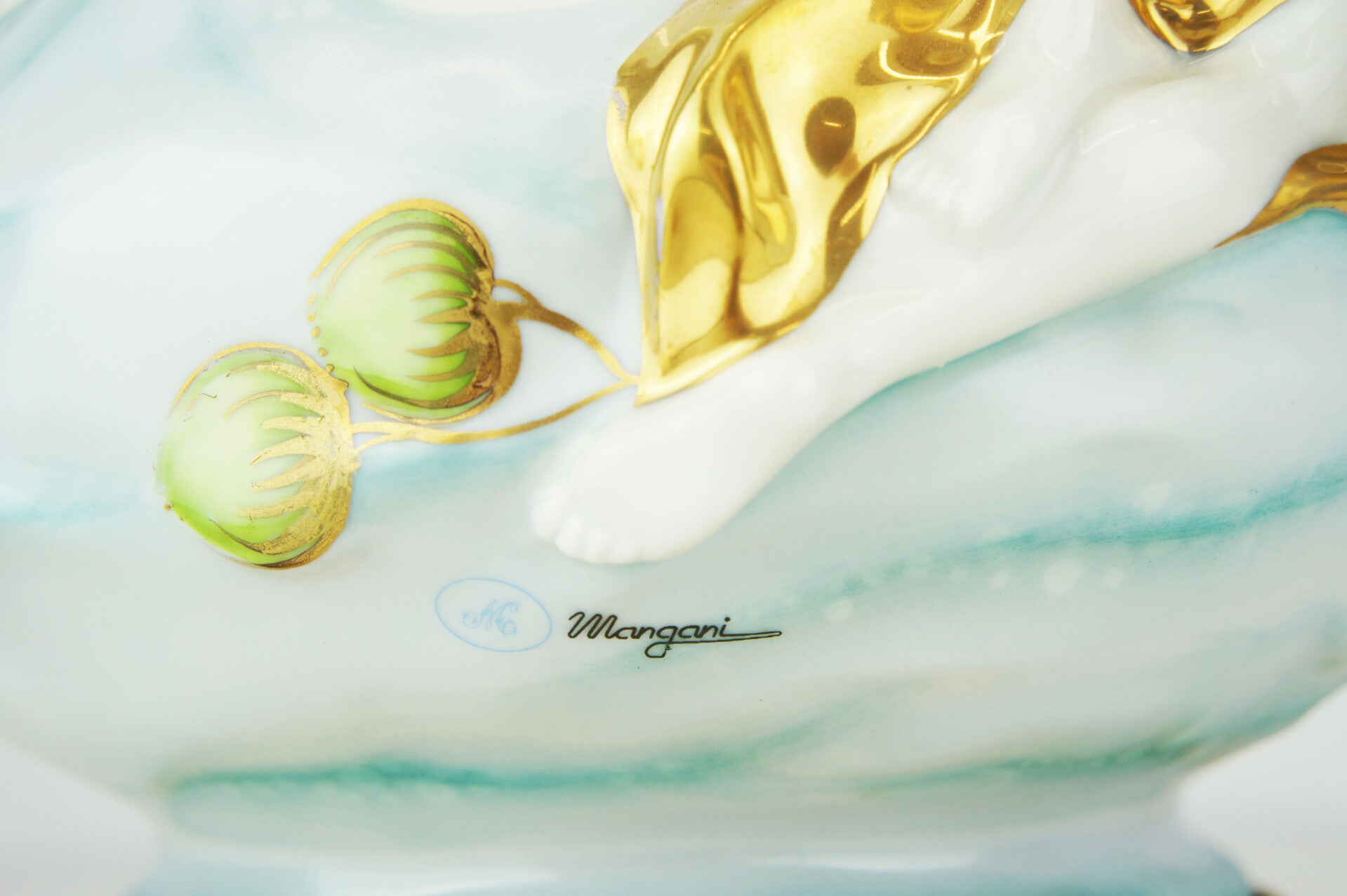 Stylish and finely decorated cache-pot with a nymph by the Italian Giulia Mangani. The porcelain is mounted on a gilded base.