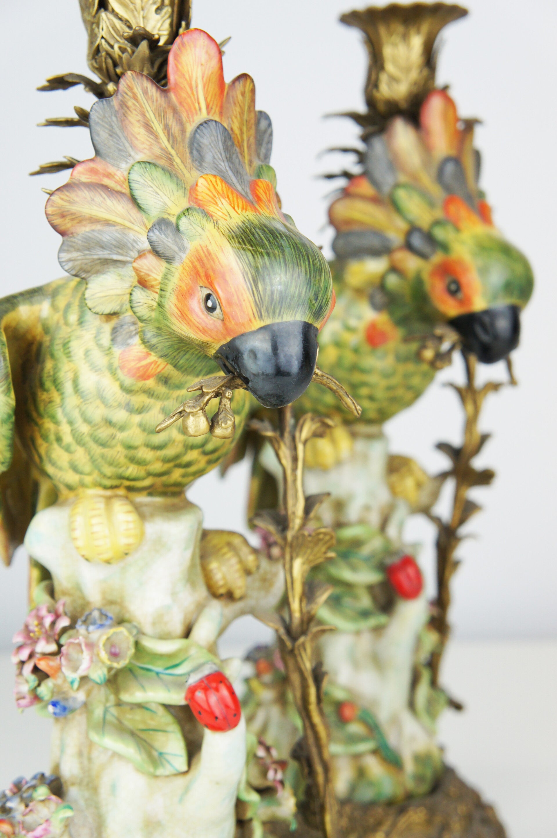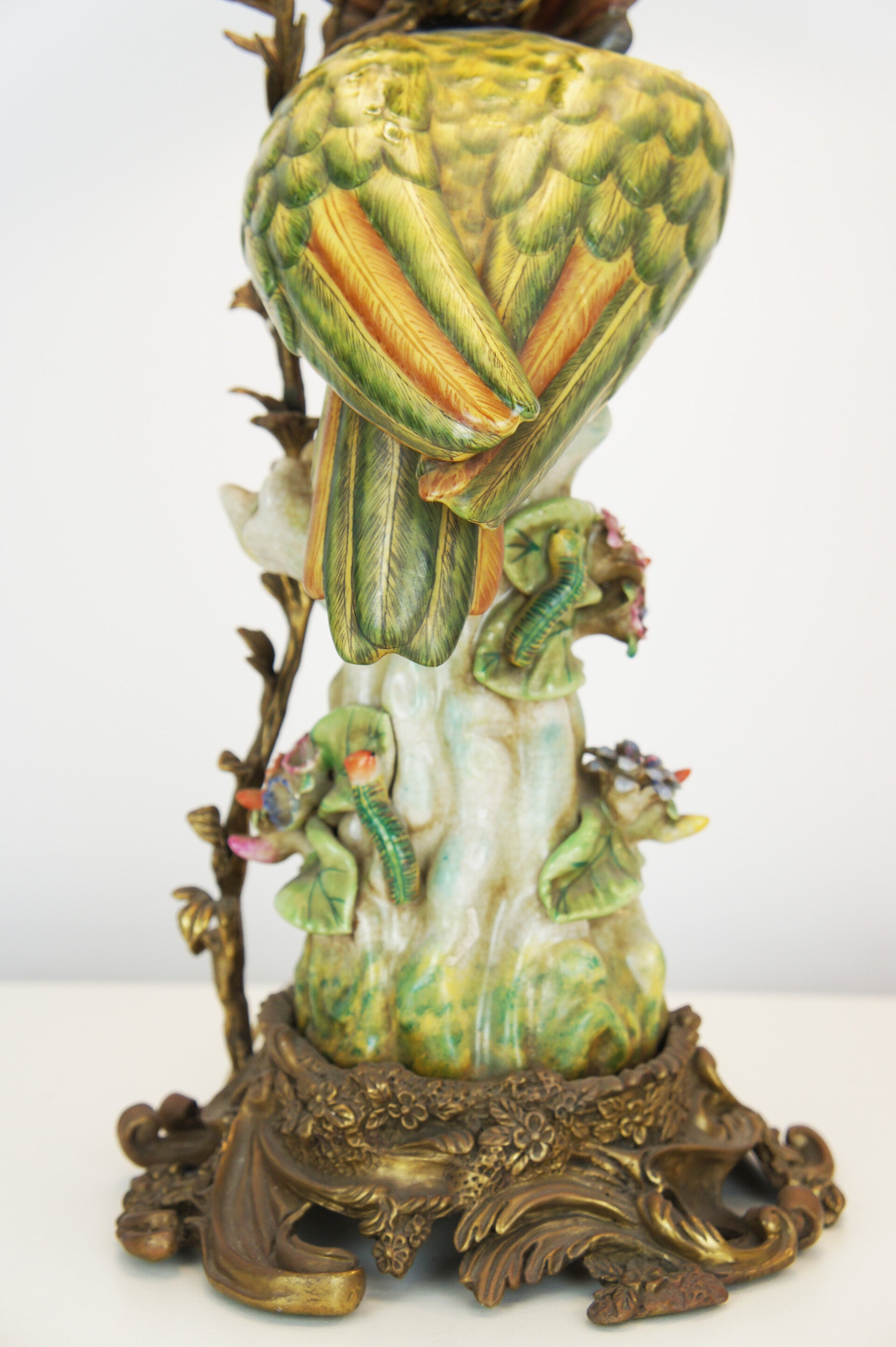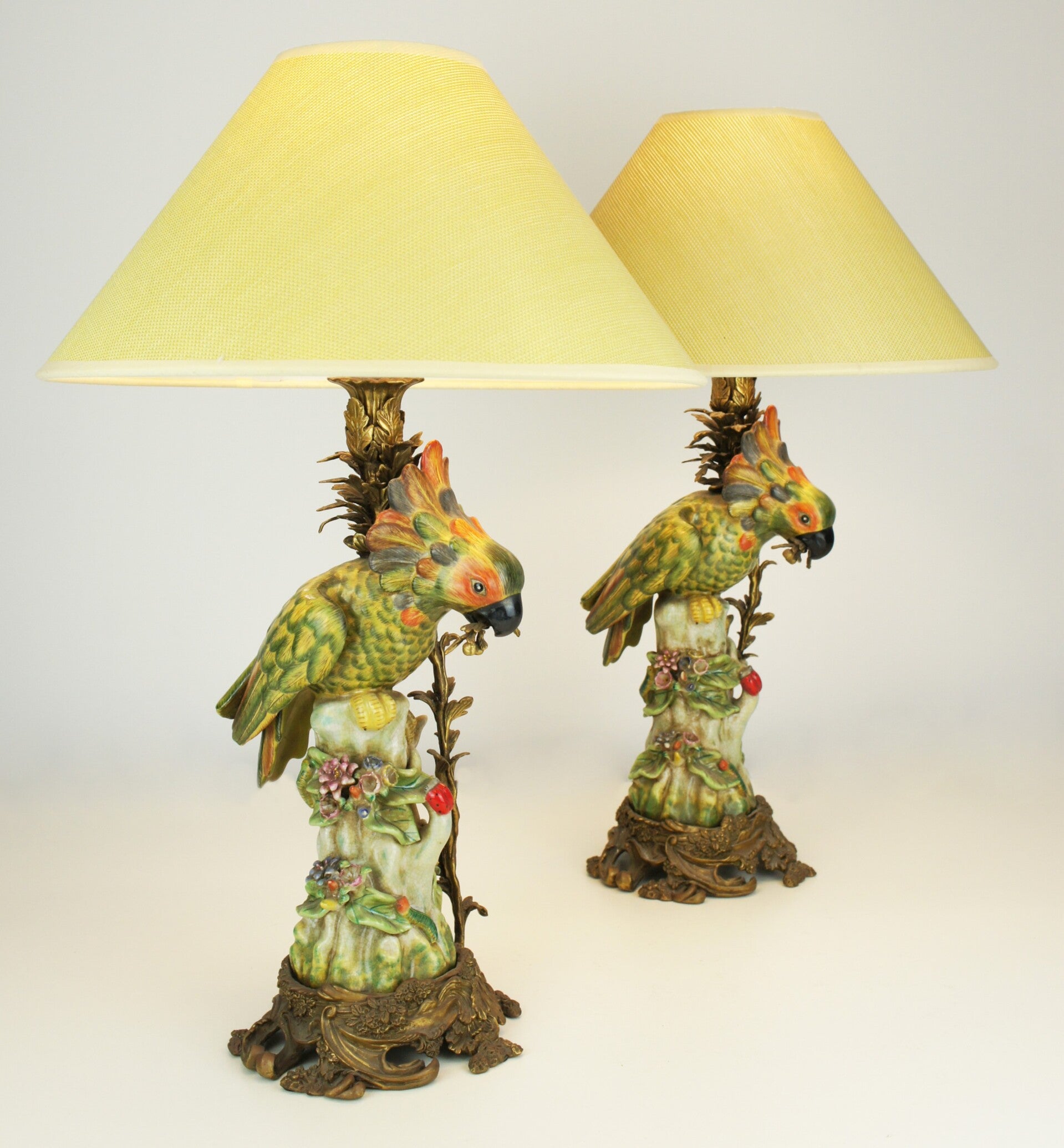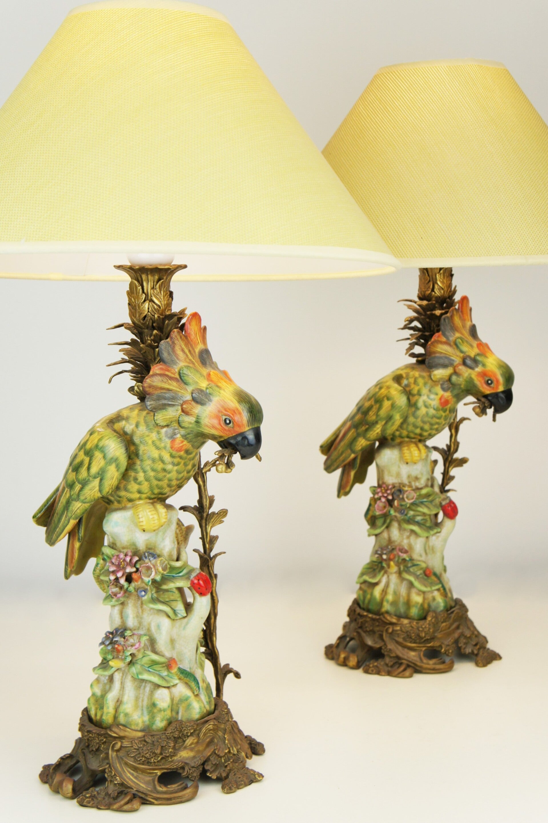 Beautiful pair of colorful cockatoe table lamps in porcelain mounted on a bronze base in rococo style.