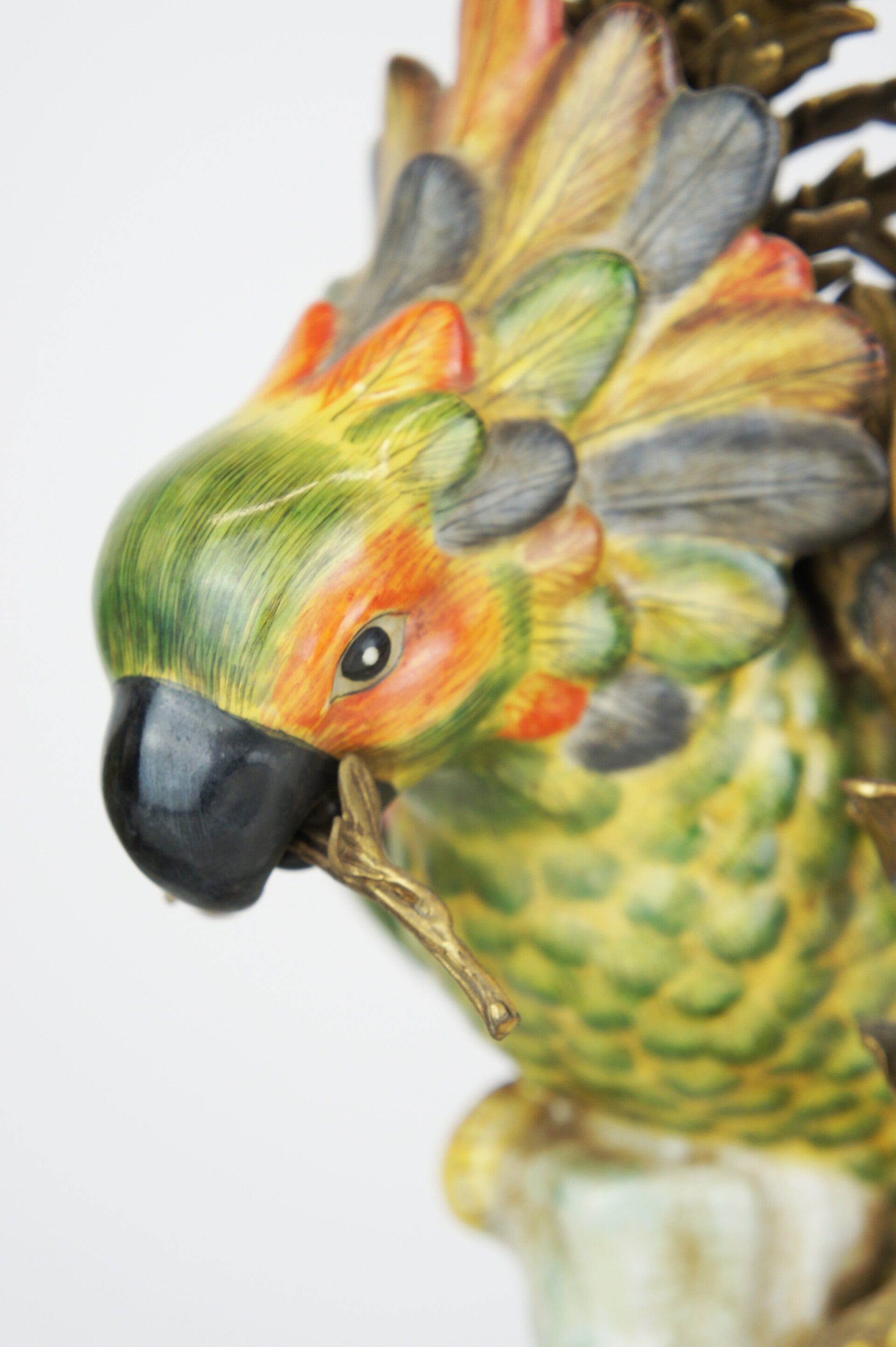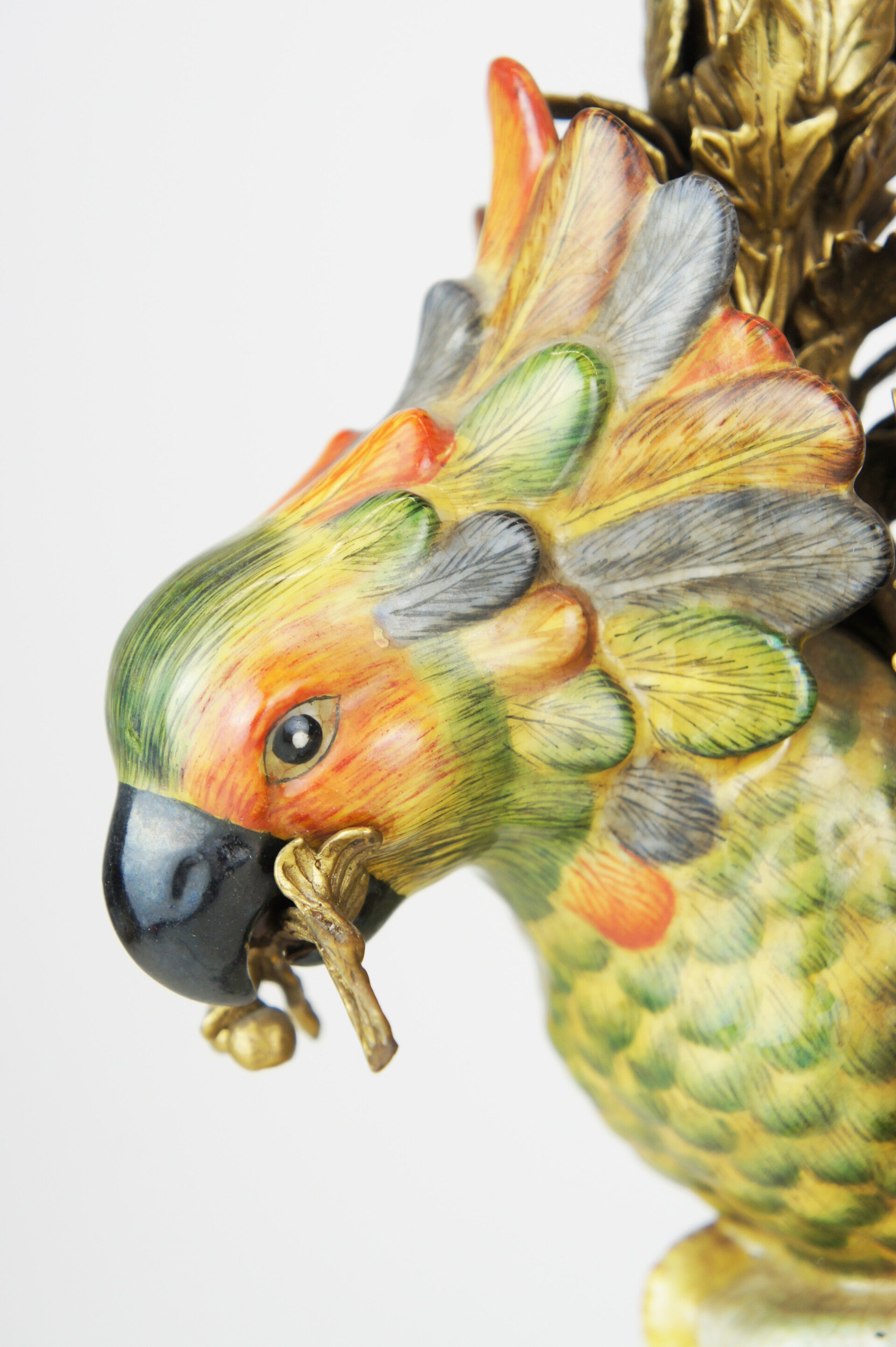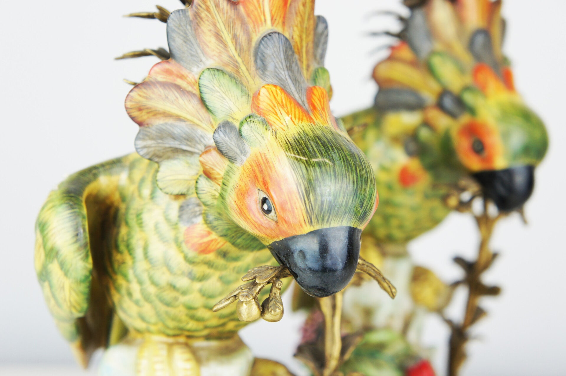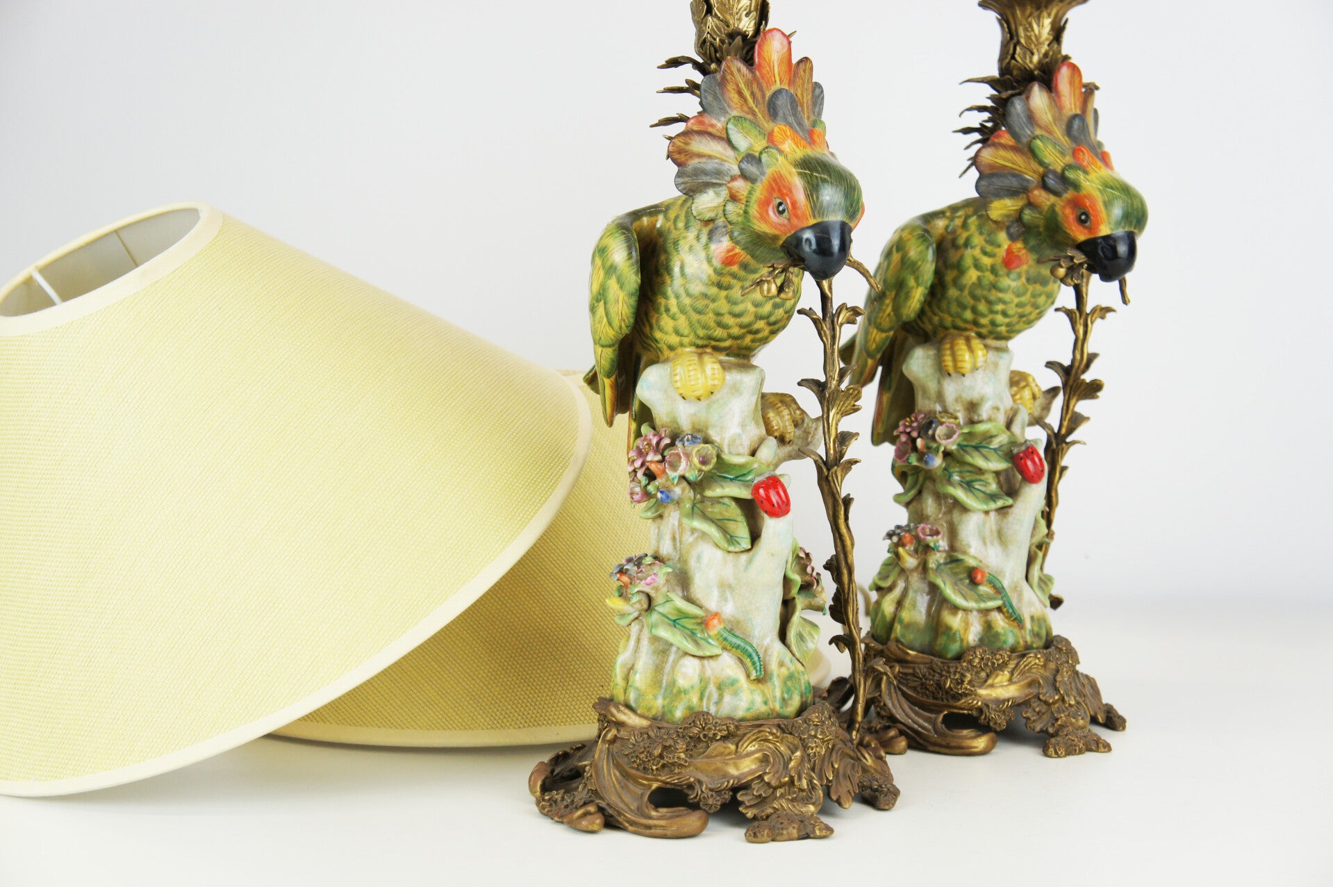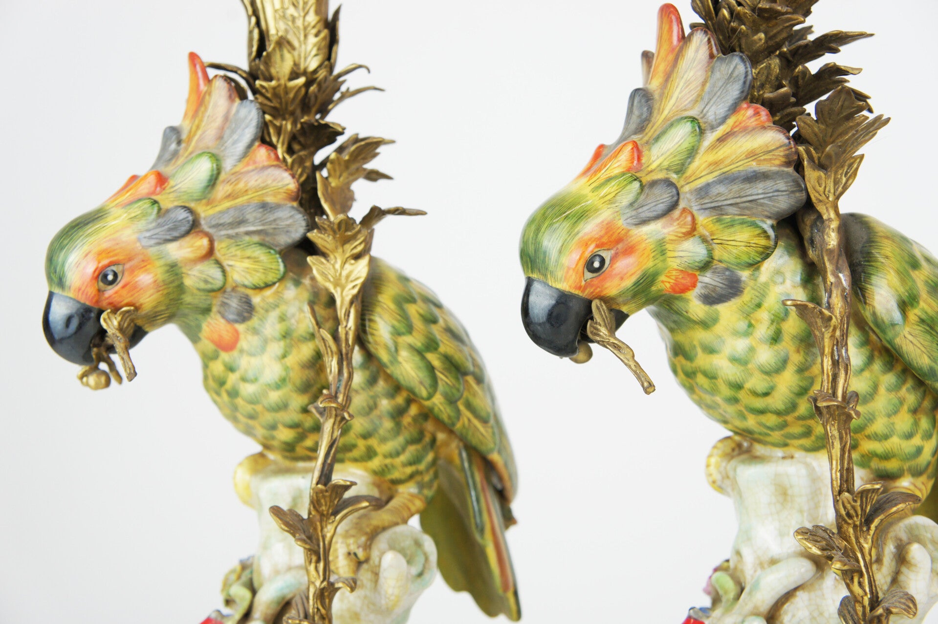 Beautiful pair of colorful cockatoe table lamps in porcelain mounted on a bronze base in rococo style.