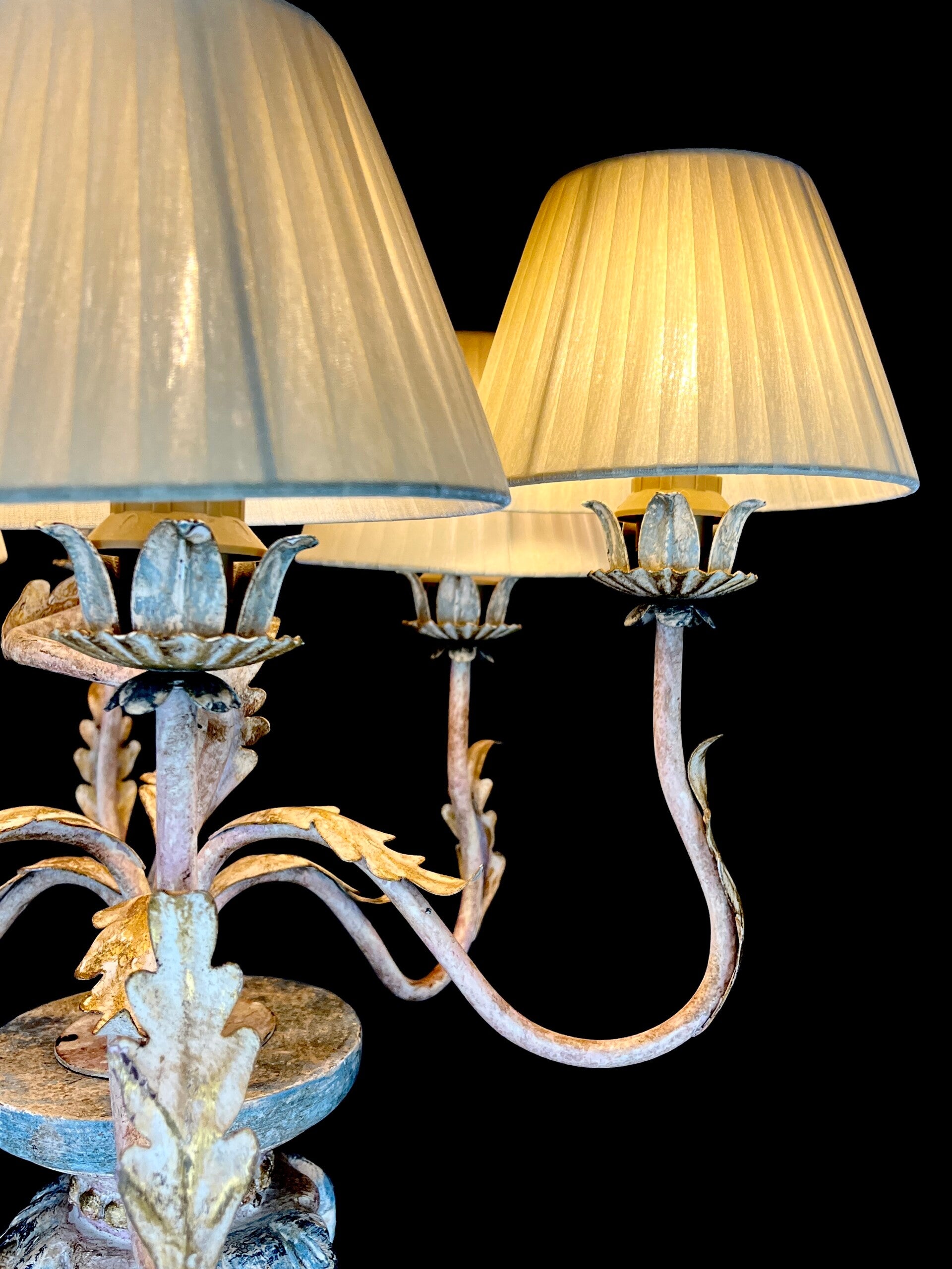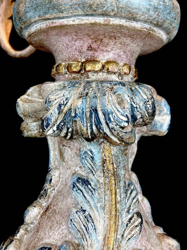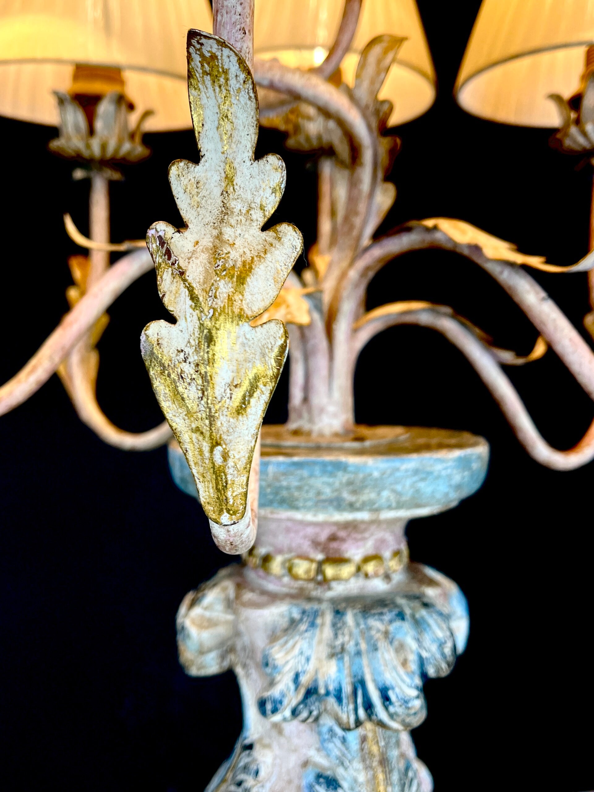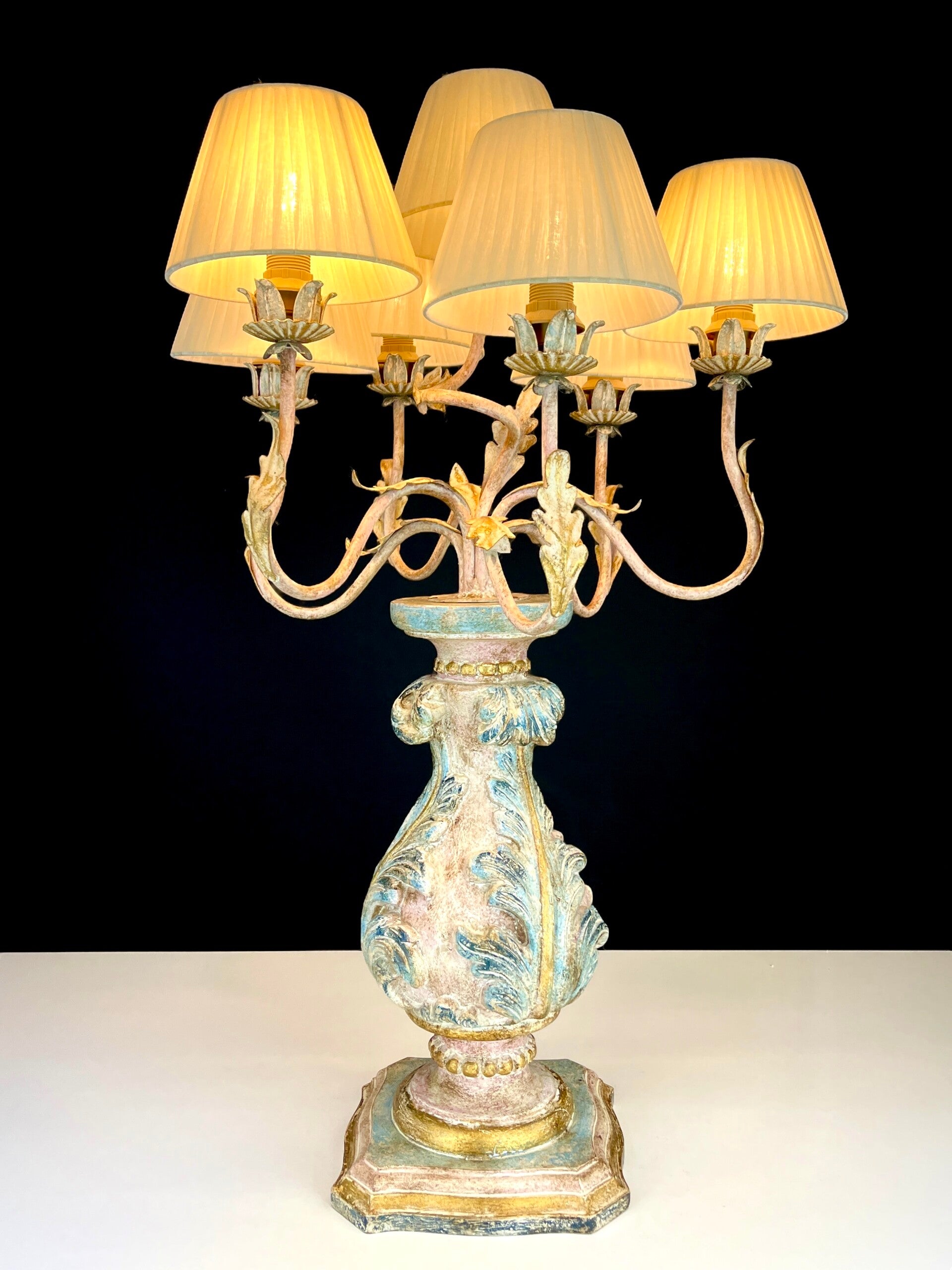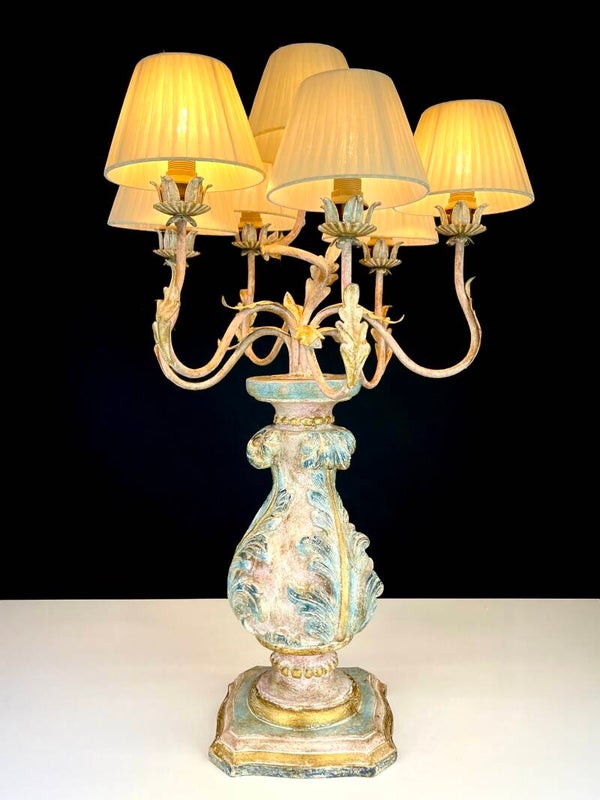 Acanthus base carved from wood in polychrome pastel colours with seven mounted painted arms in Florentine style, each light point carries a pleated lampshade made of silk.