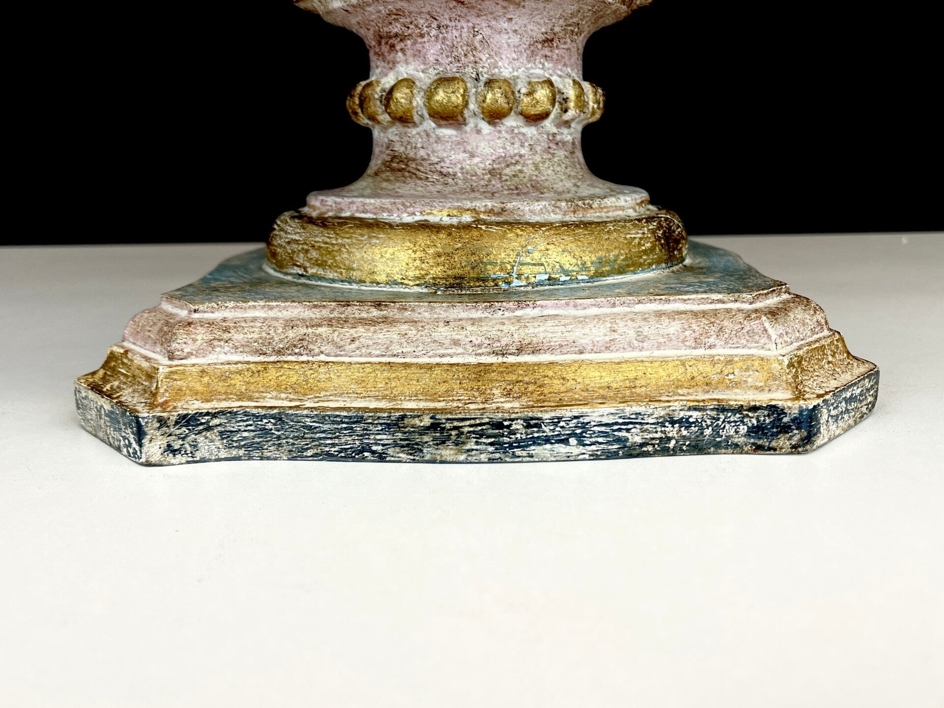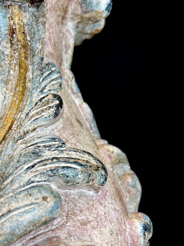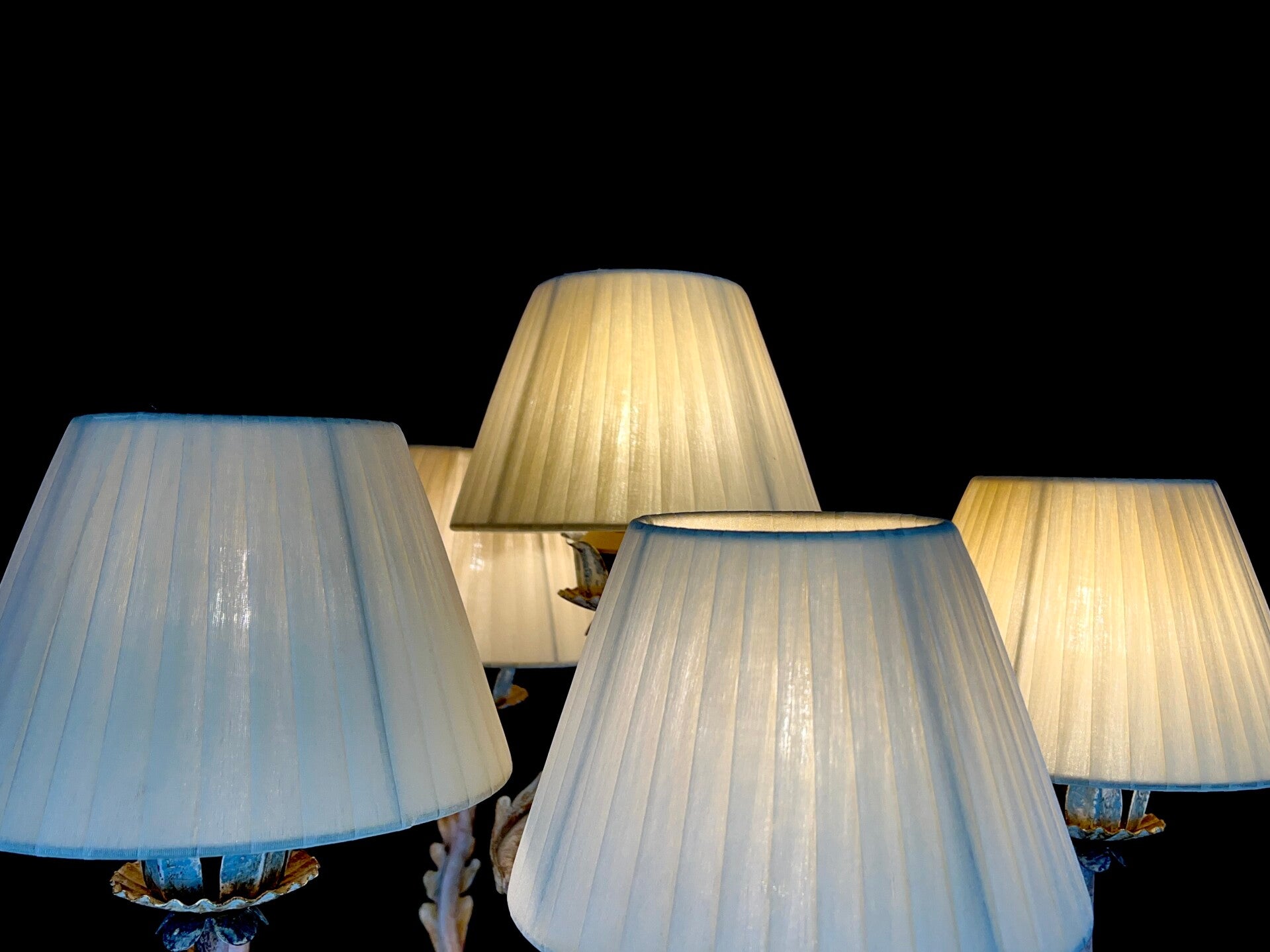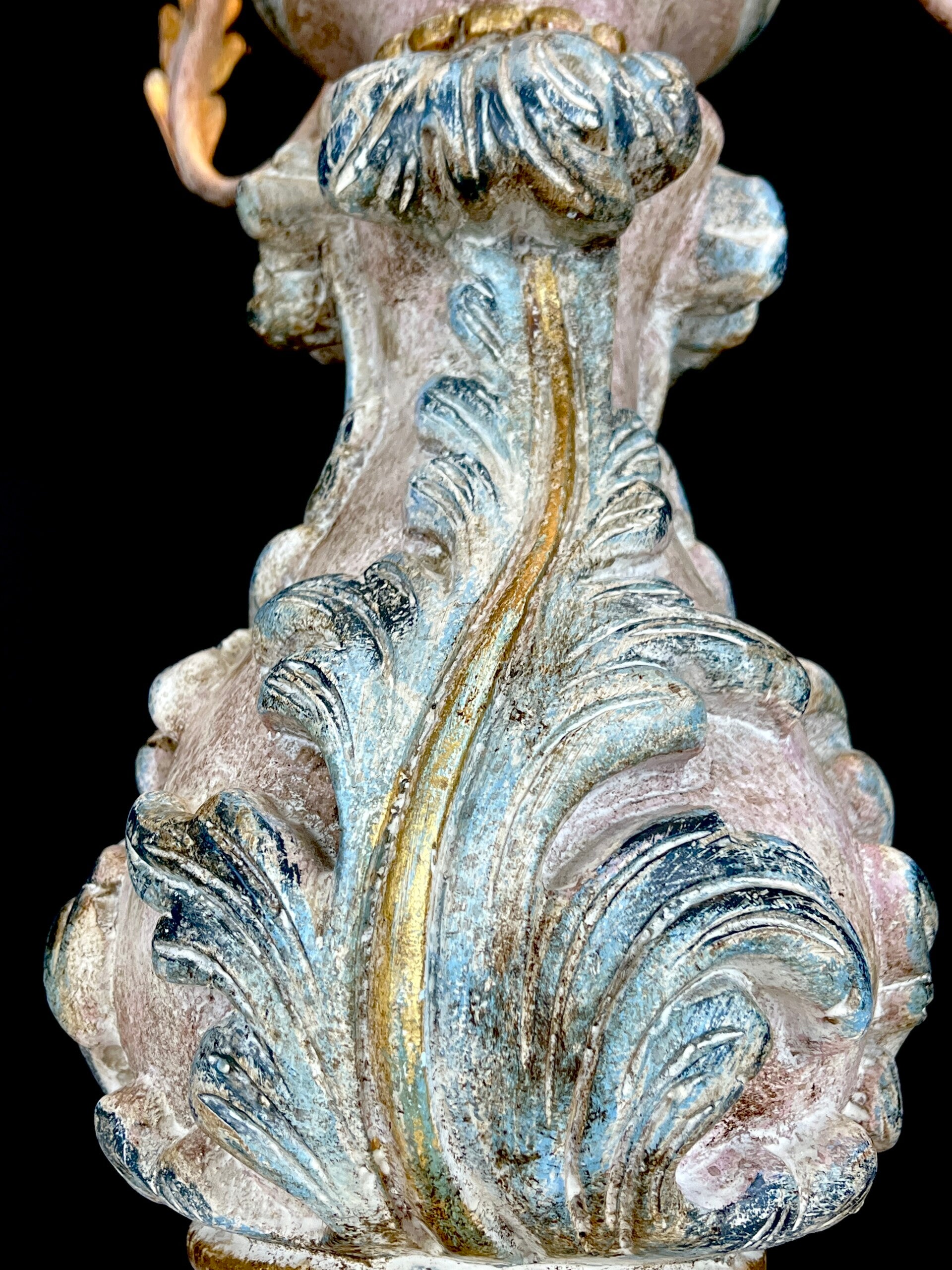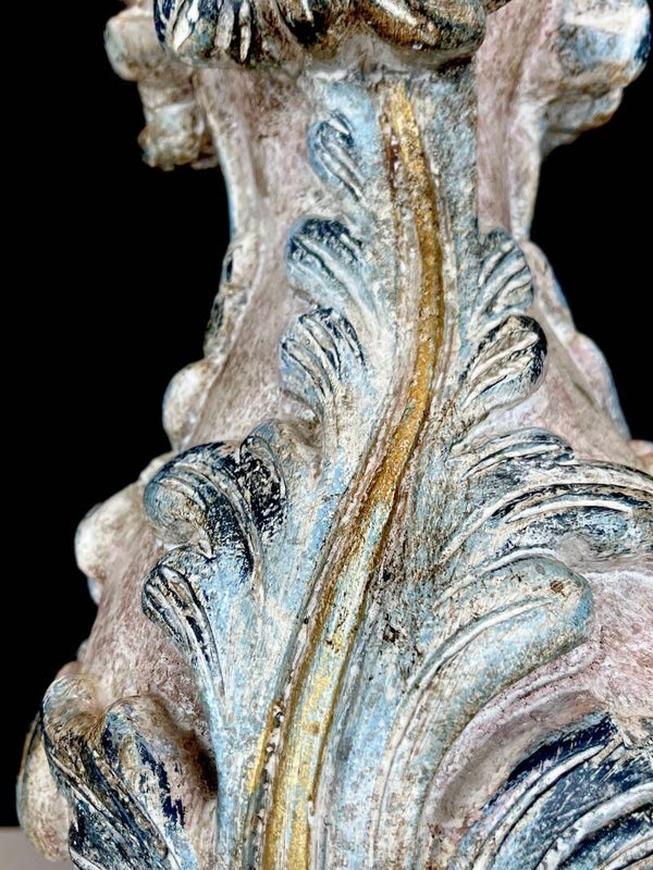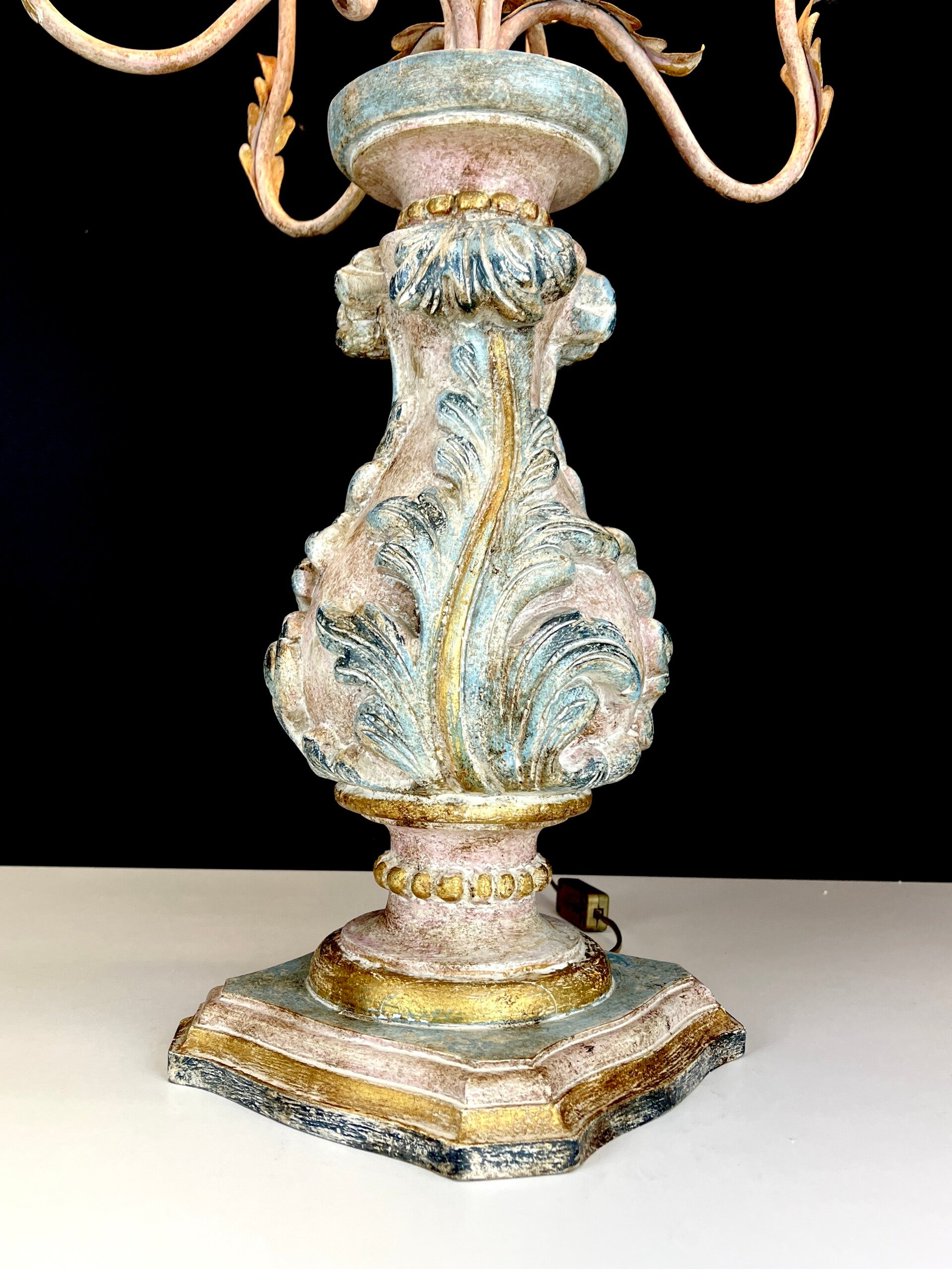 Acanthus base carved from wood in polychrome pastel colours with seven mounted painted arms in Florentine style, each light point carries a pleated lampshade made of silk.
