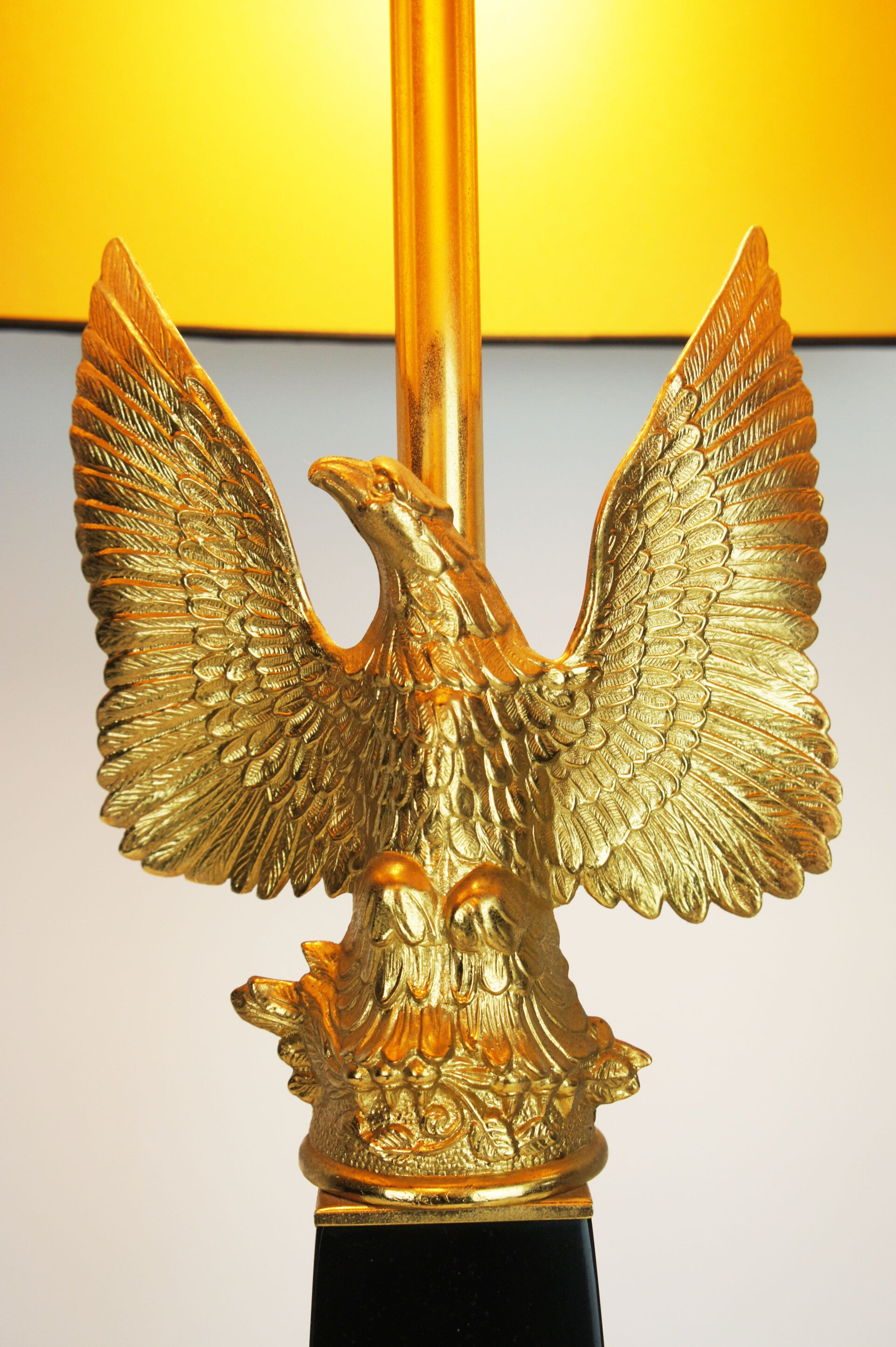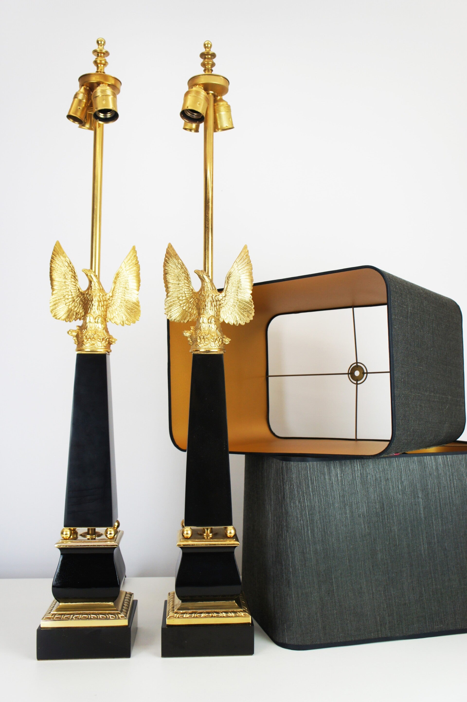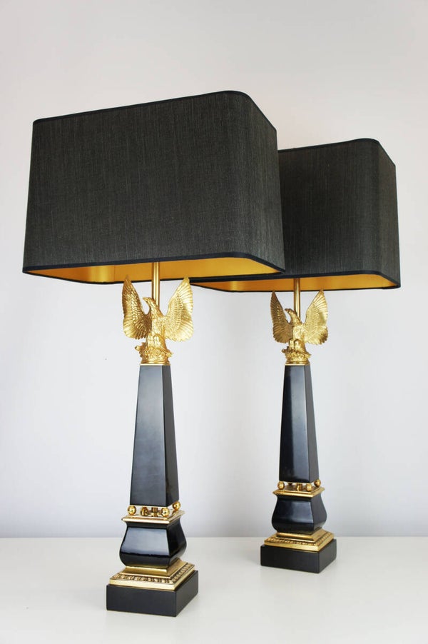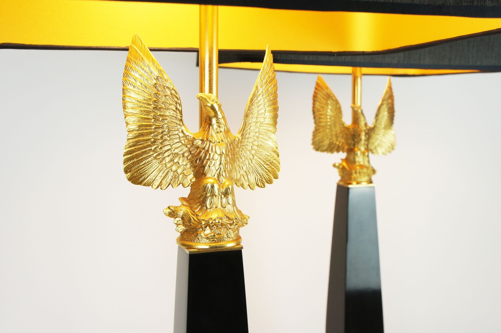 Luxurious large high-quality set of obelisk lamps in Black marble with brass eagle from the 1970s by Deknudt with beautiful lampshades that were specially made for these lamps. The lamps weigh 7kg each!! and are no less than 95 cm high.