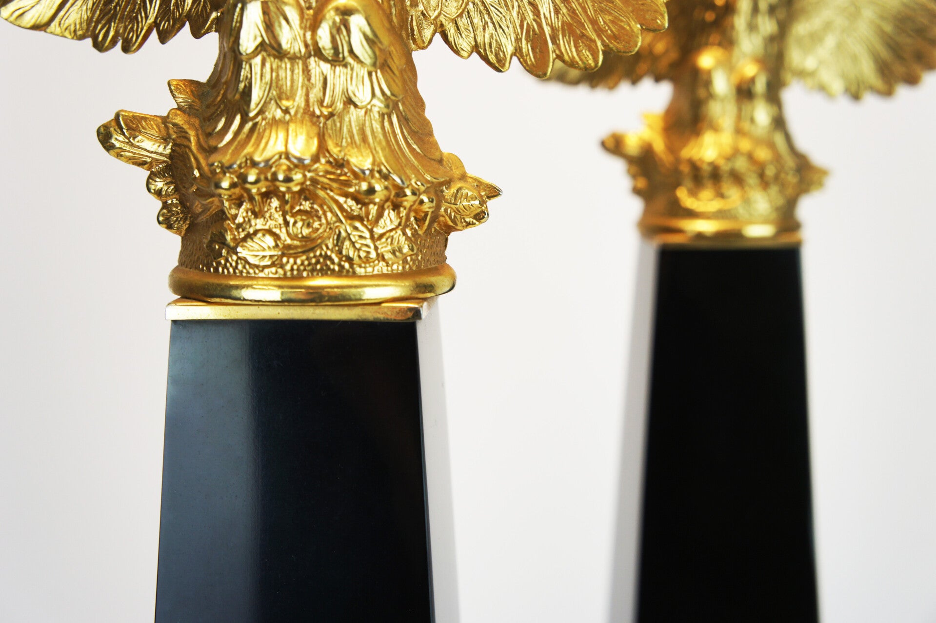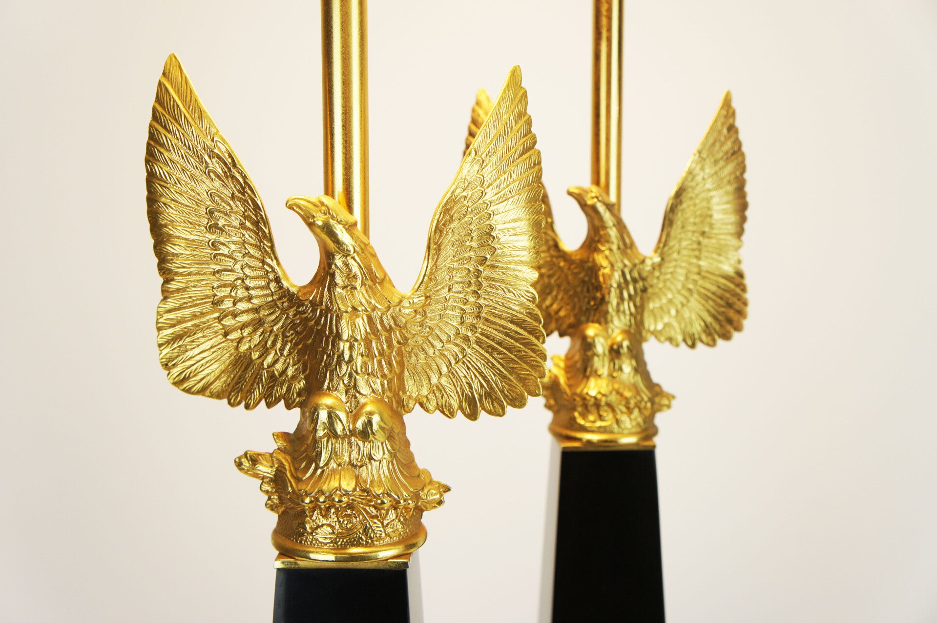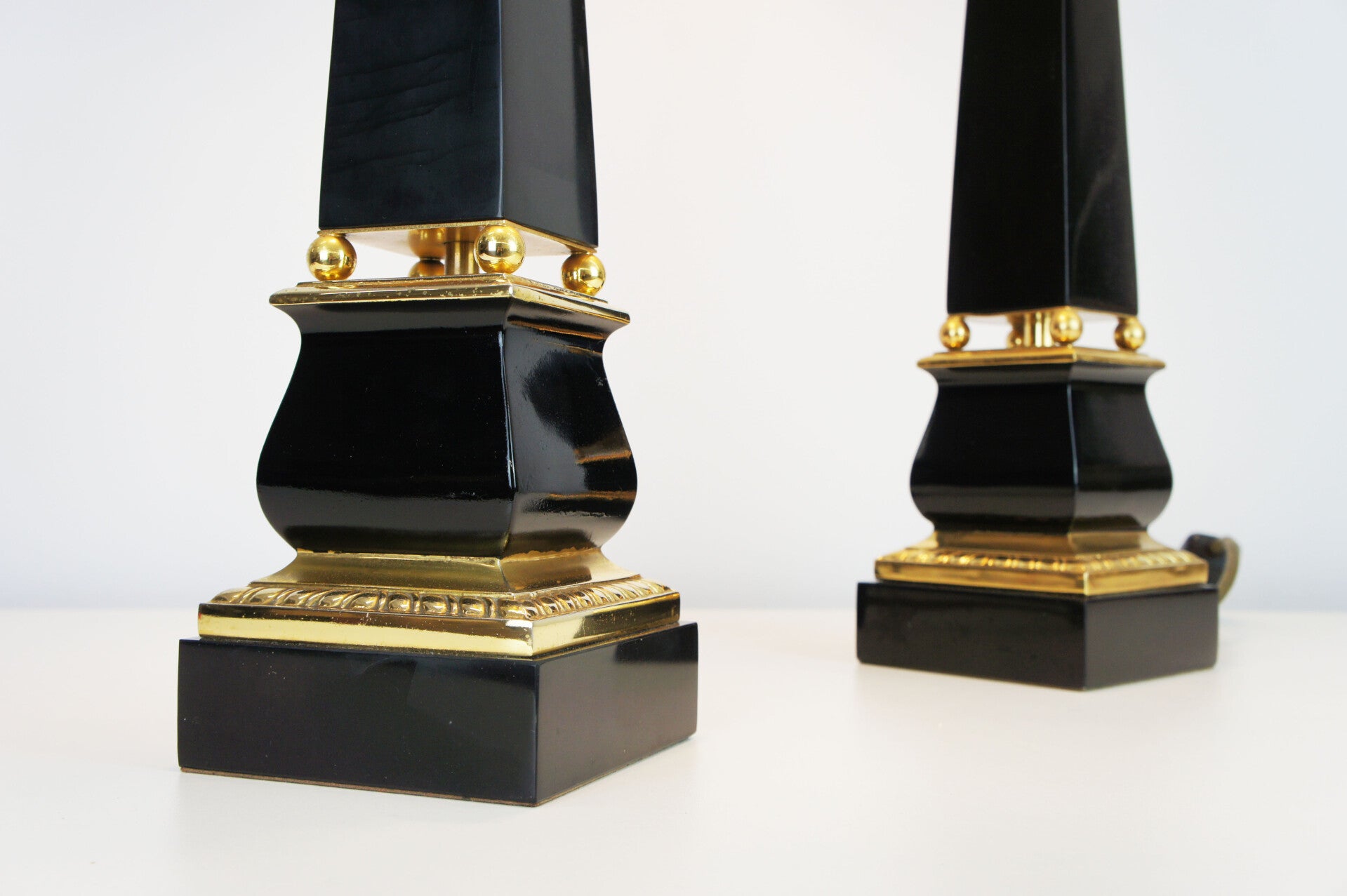 Luxurious large high-quality set of obelisk lamps in Black marble with brass eagle from the 1970s by Deknudt with beautiful lampshades that were specially made for these lamps. The lamps weigh 7kg each!! and are no less than 95 cm high.