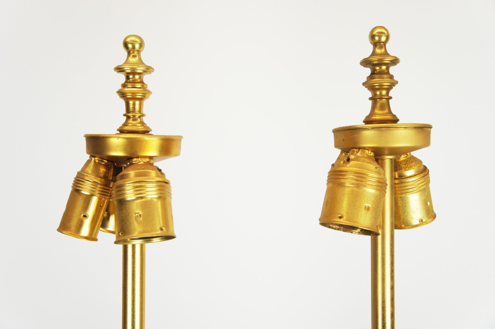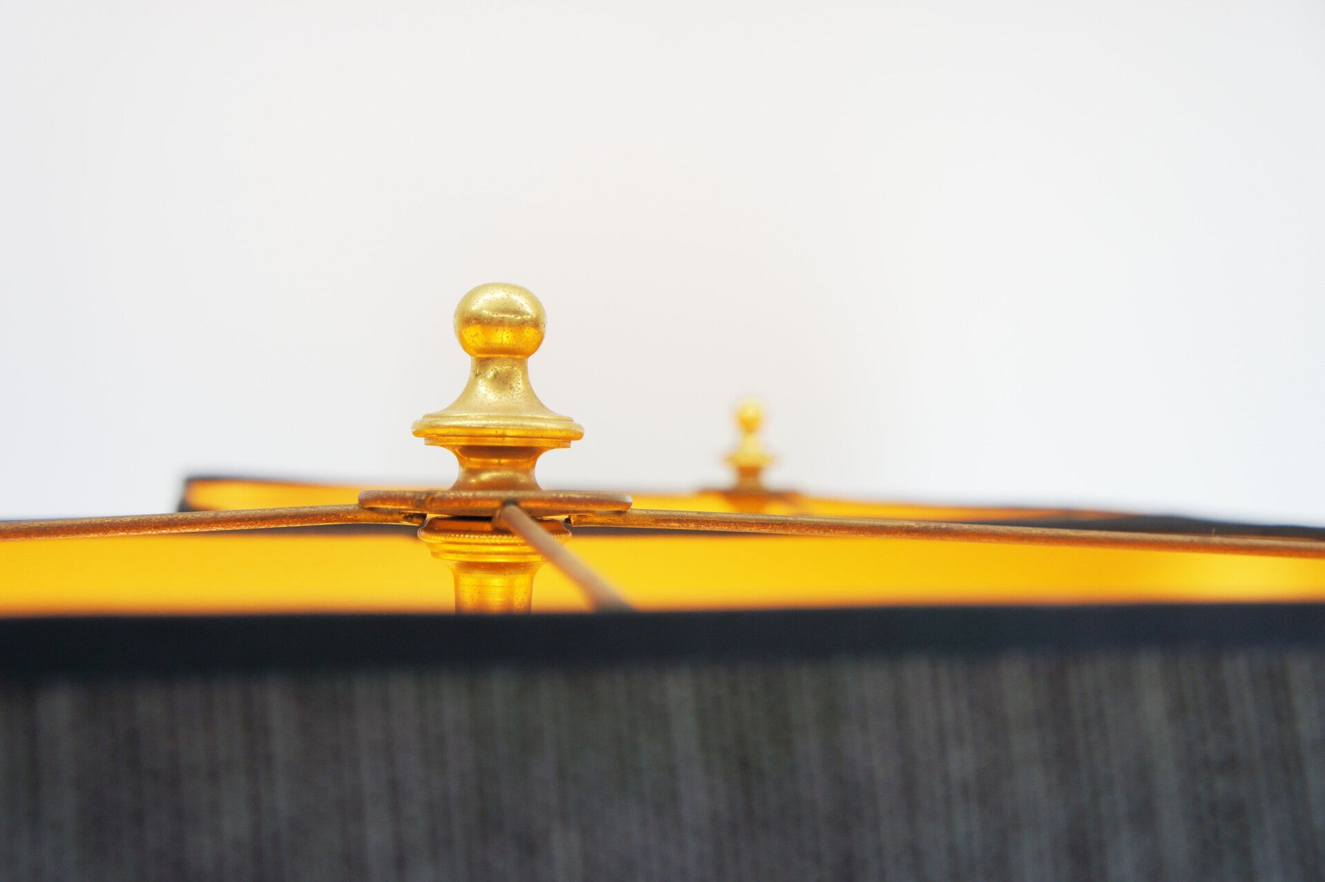 This special pair is equipped with very appropriate lampshades in a stricted fabric in black/grey tone, these are fixed by means of a brass gold-plated cap at the top.