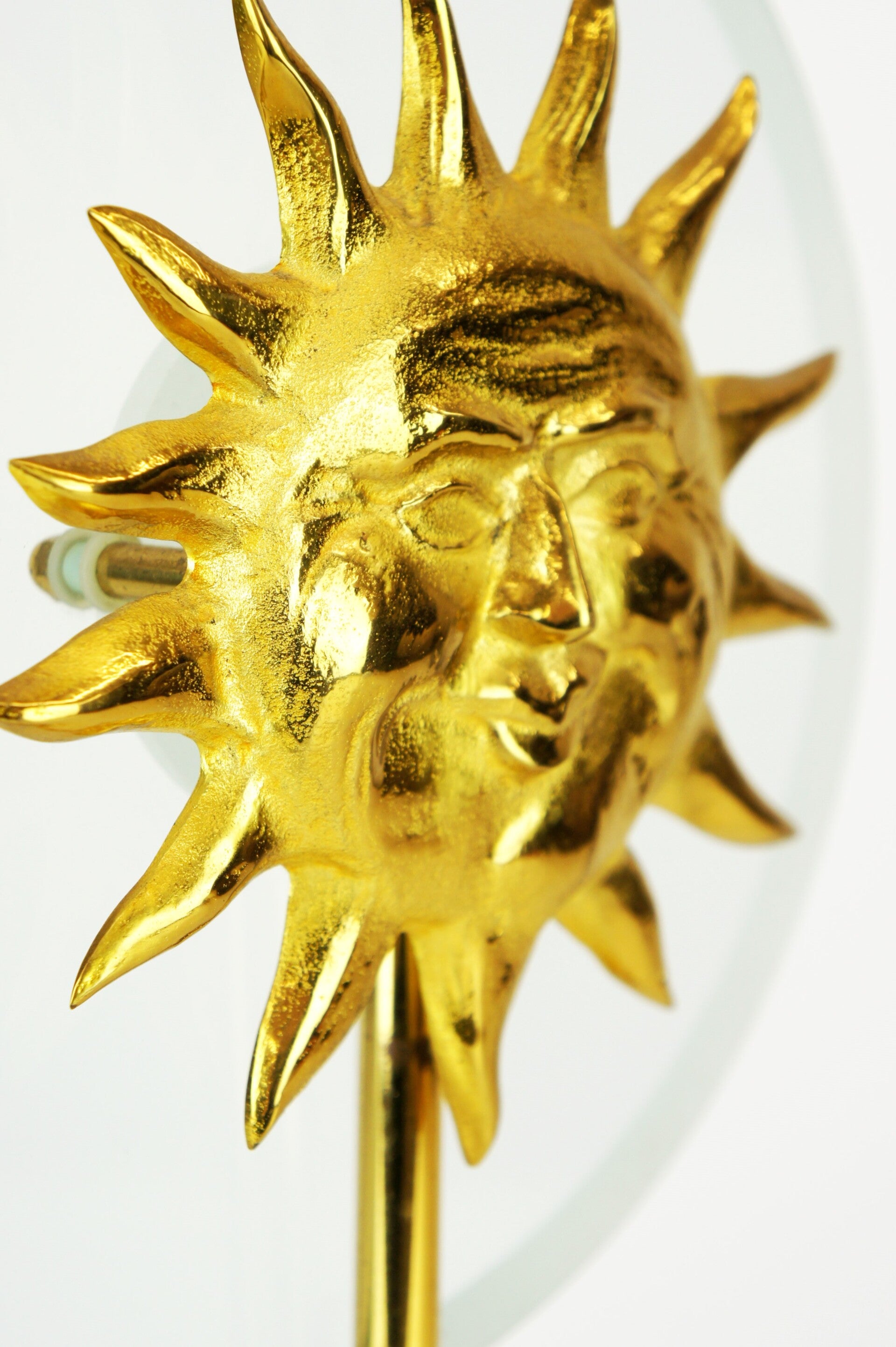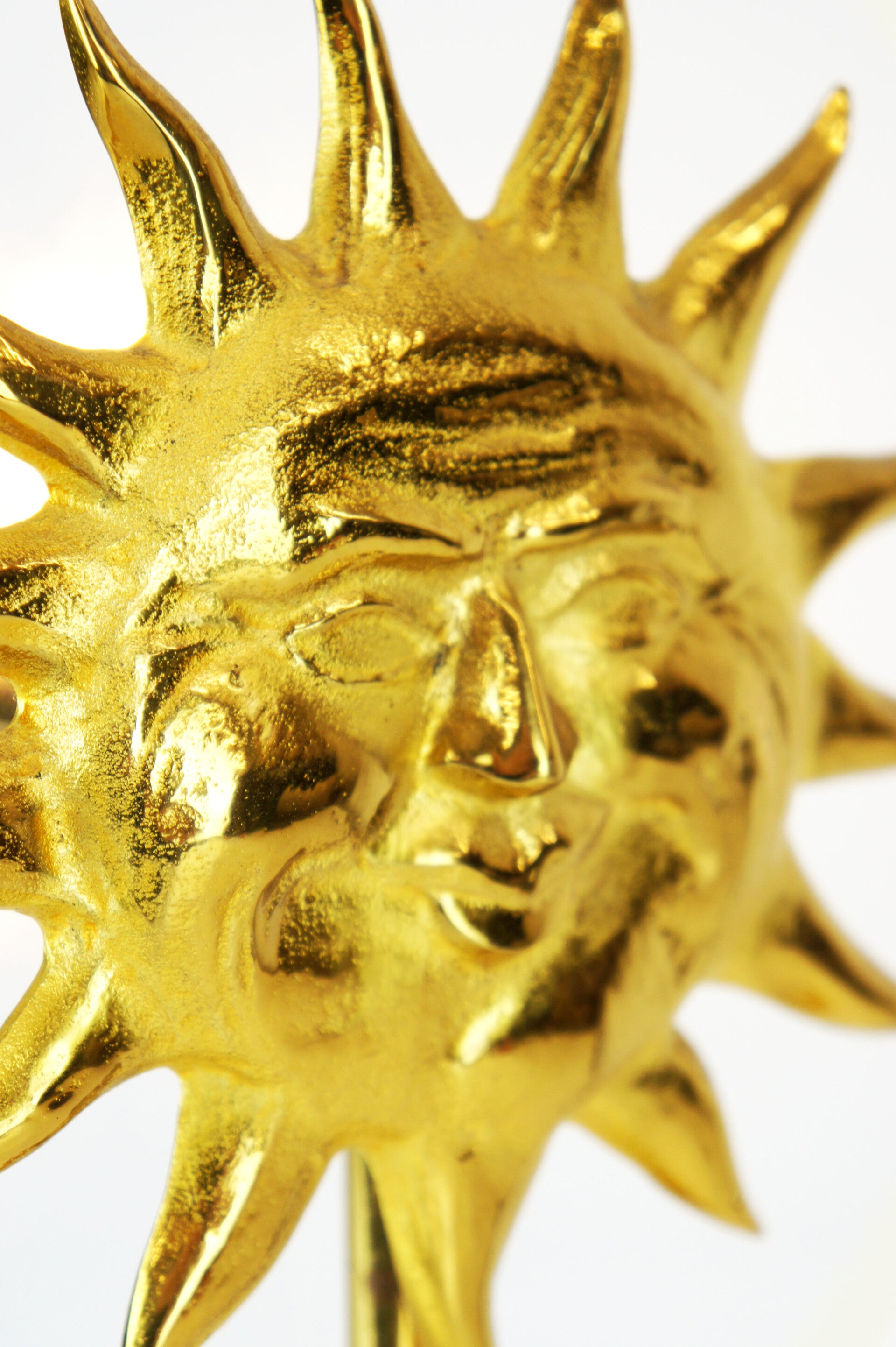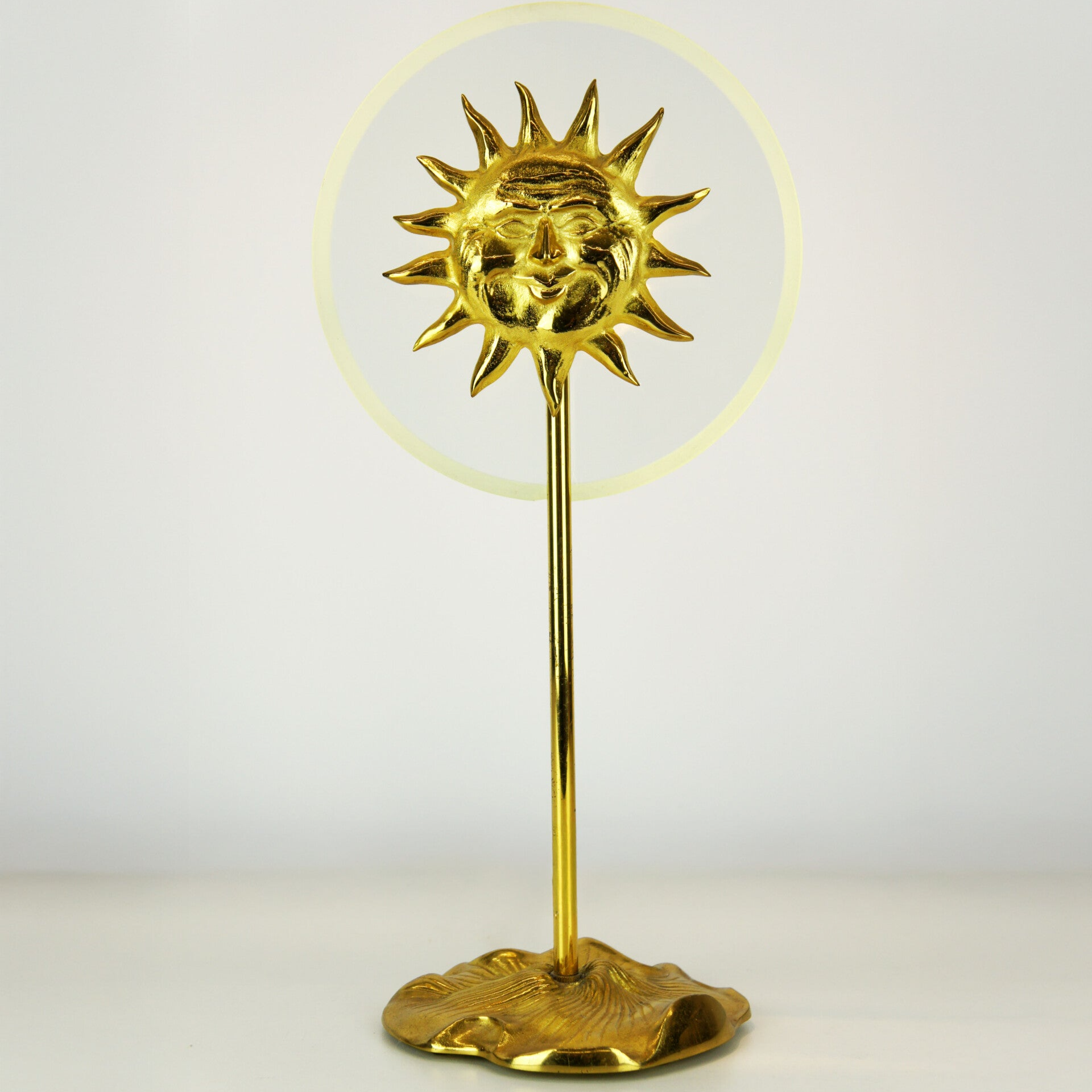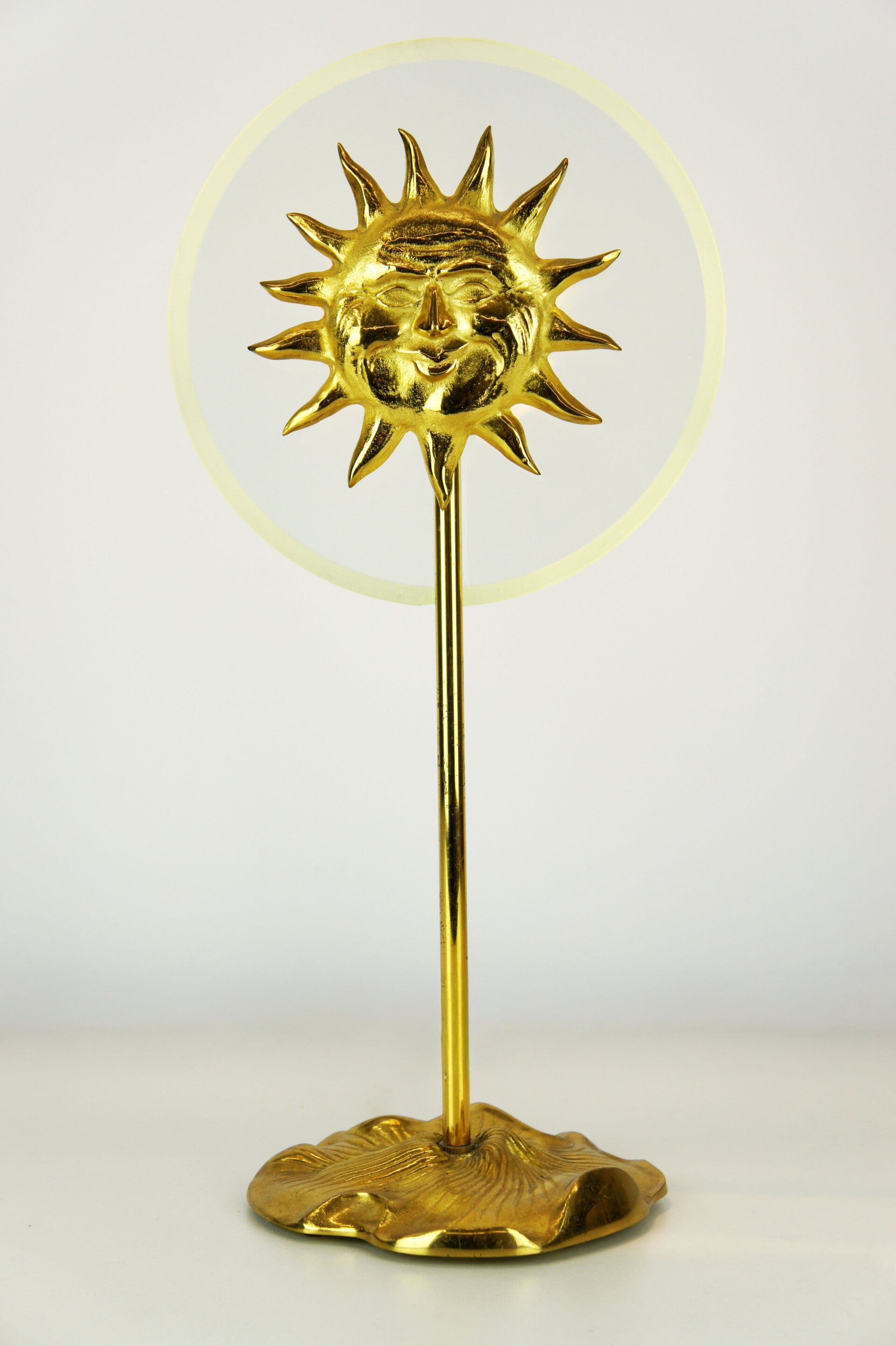 Beautifully elegant gold-plated table lamp by Maison Lucien Gau, Paris. The sun is mounted in front of a glass disc with a satin edge.