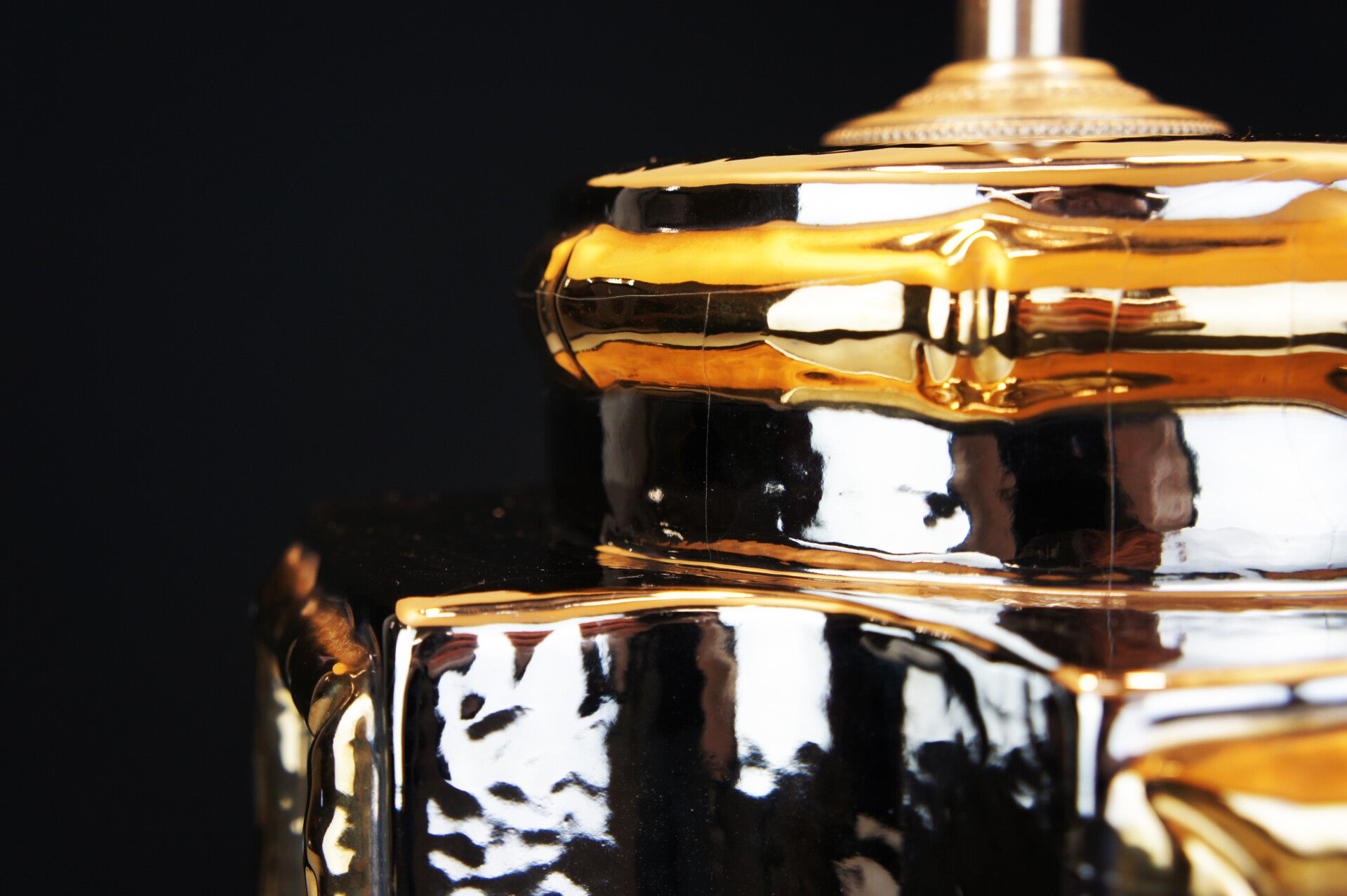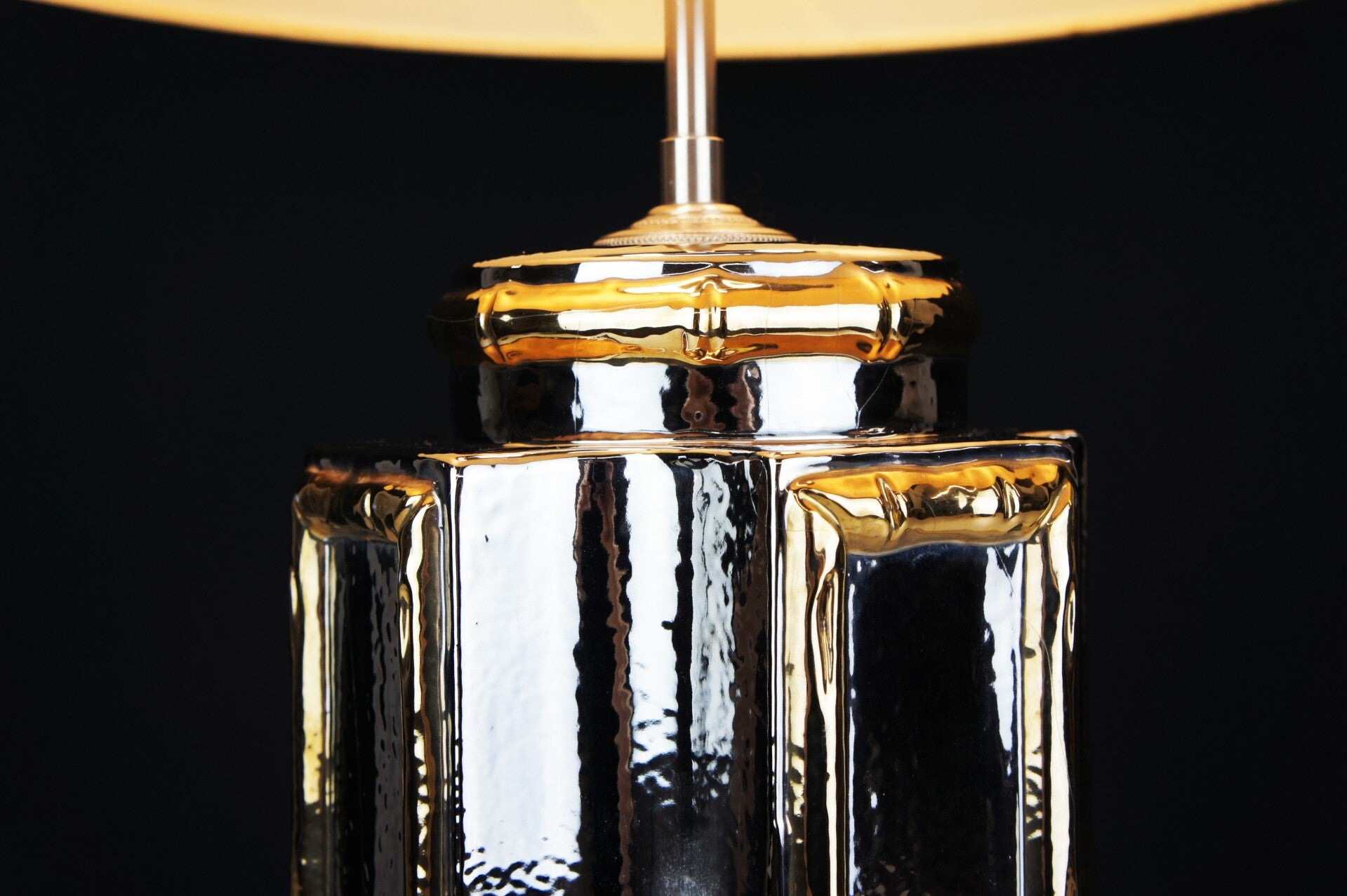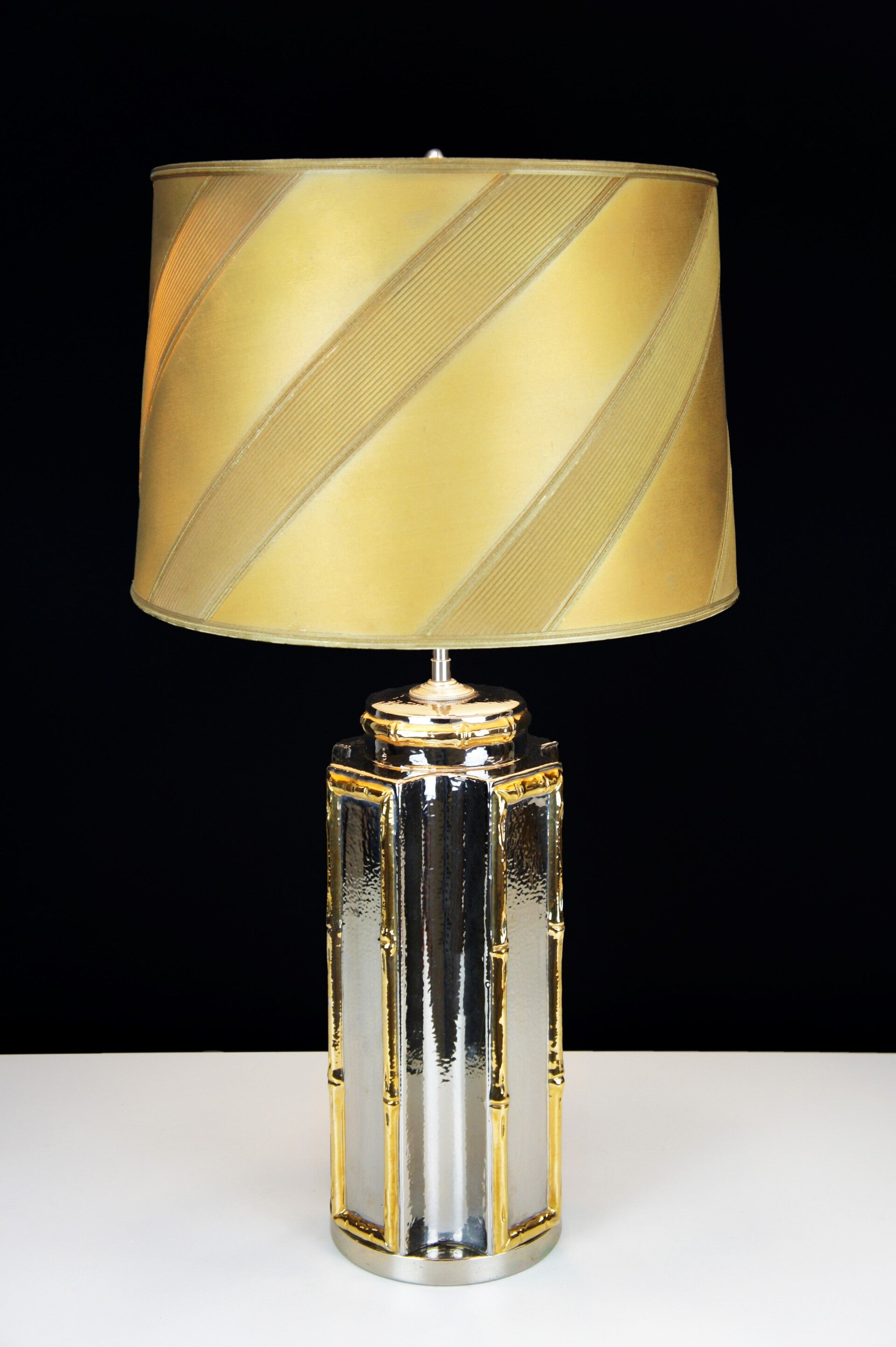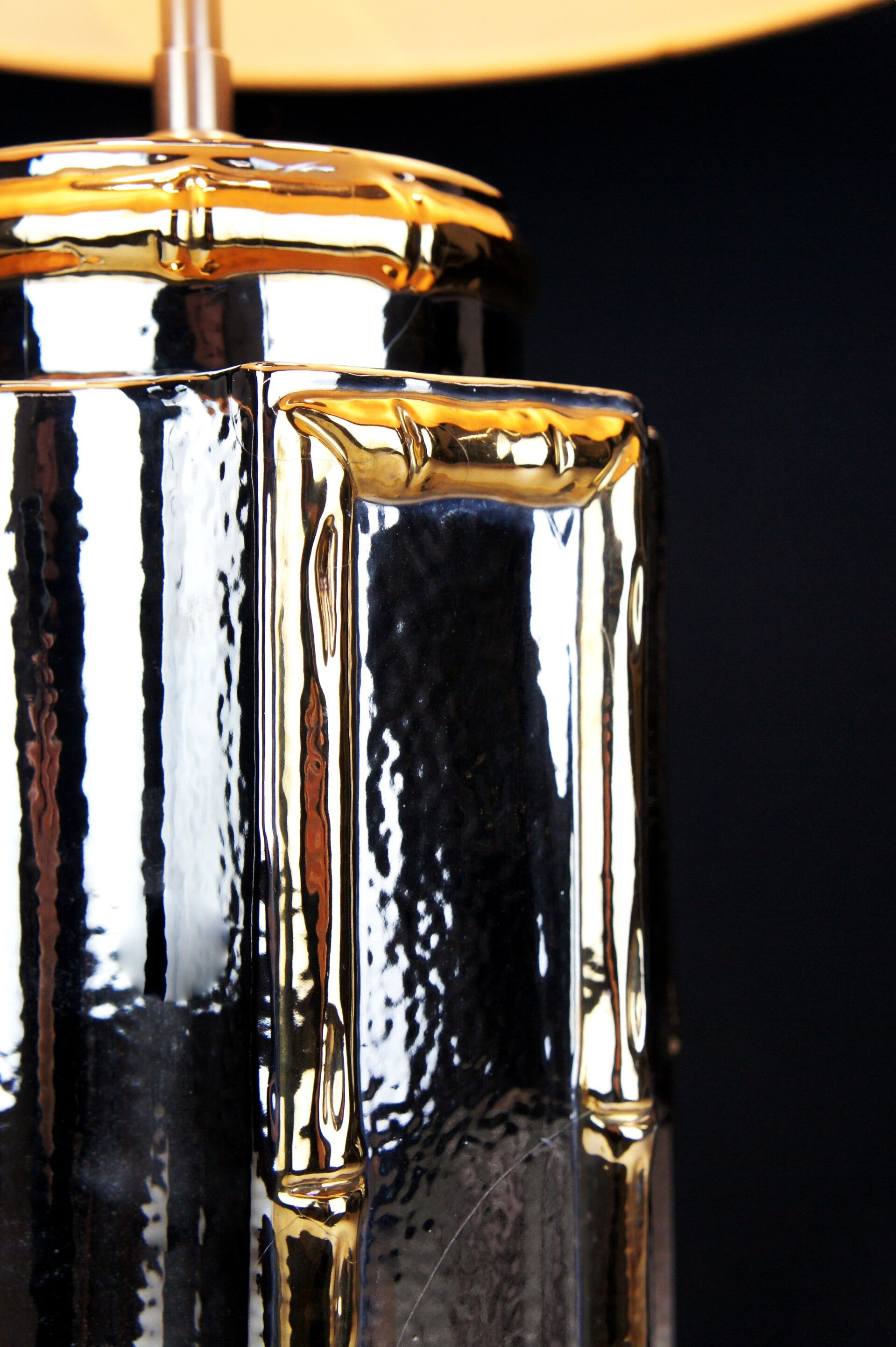 Ceramic Italian table lamp from the 1960s, a round base with four panels of imitation bamboo branches in gold mirror glaze.