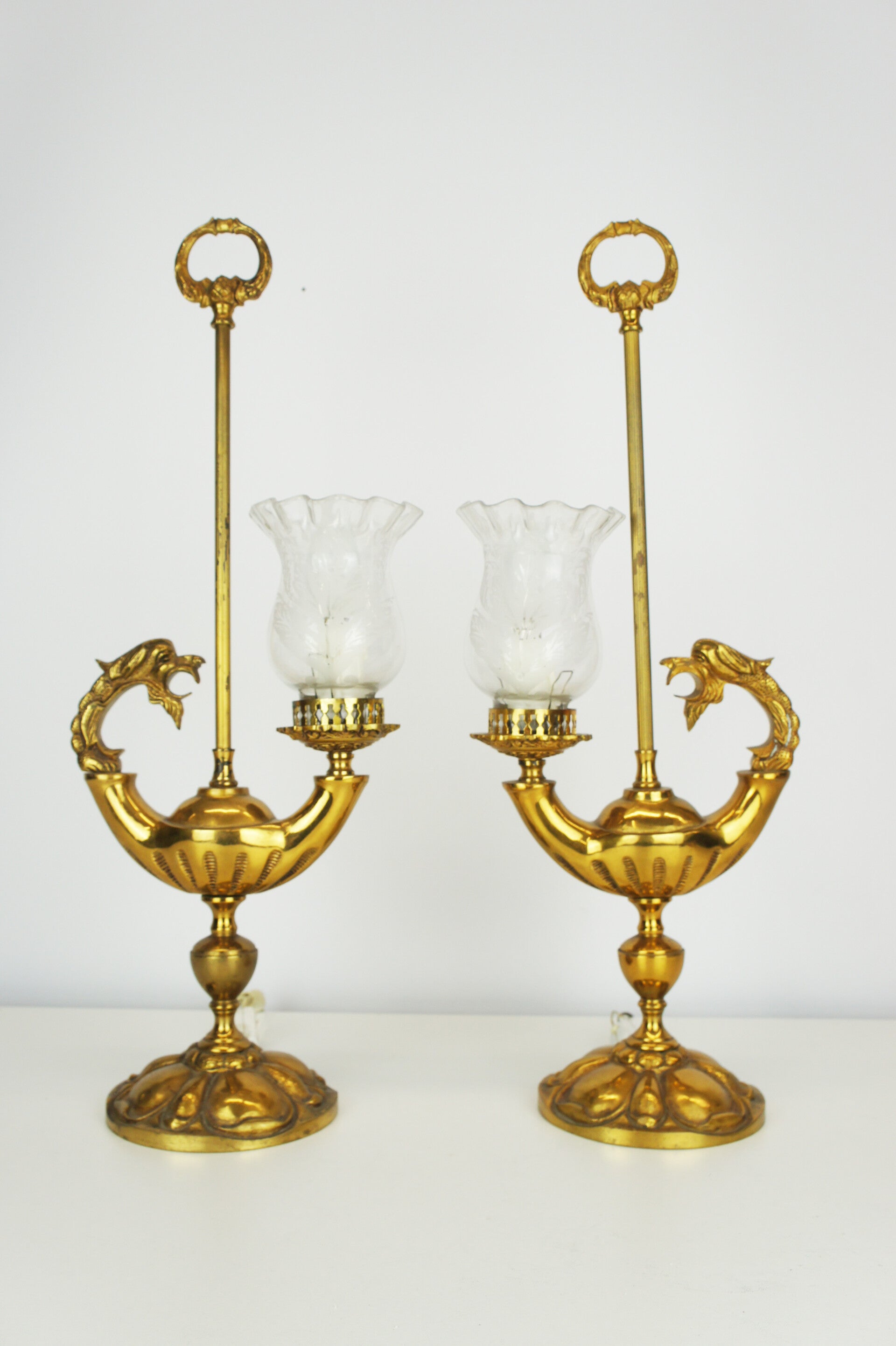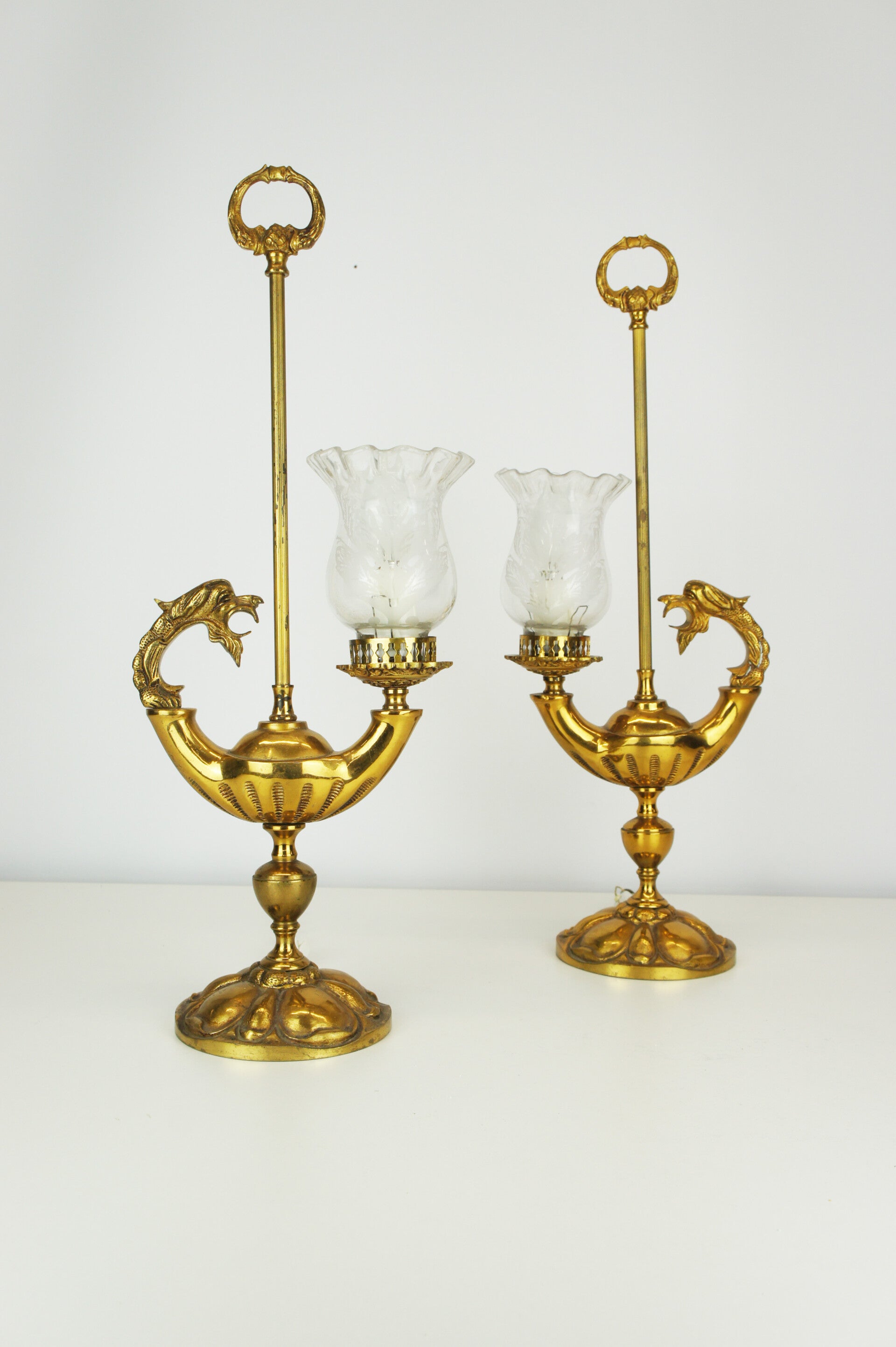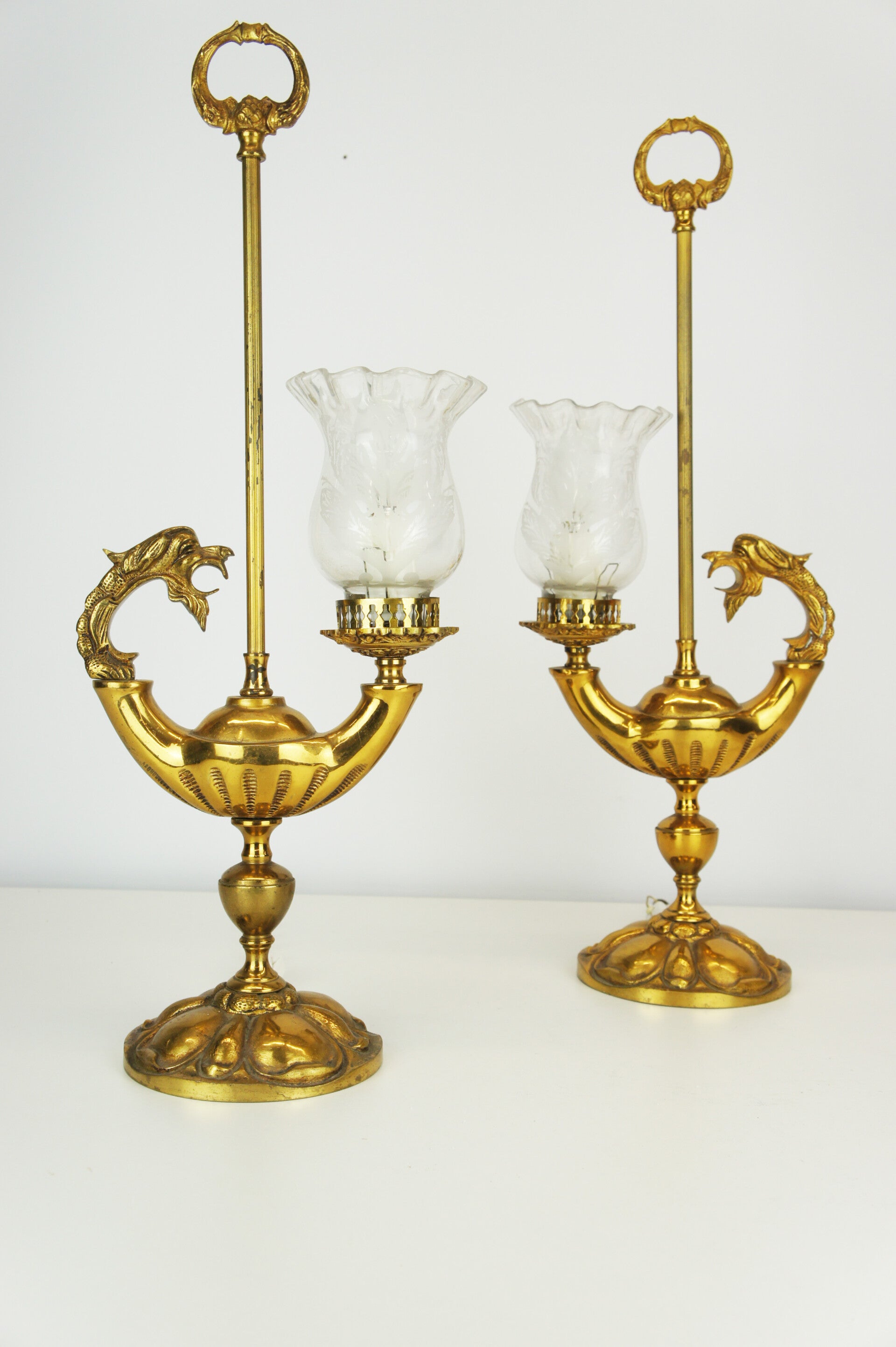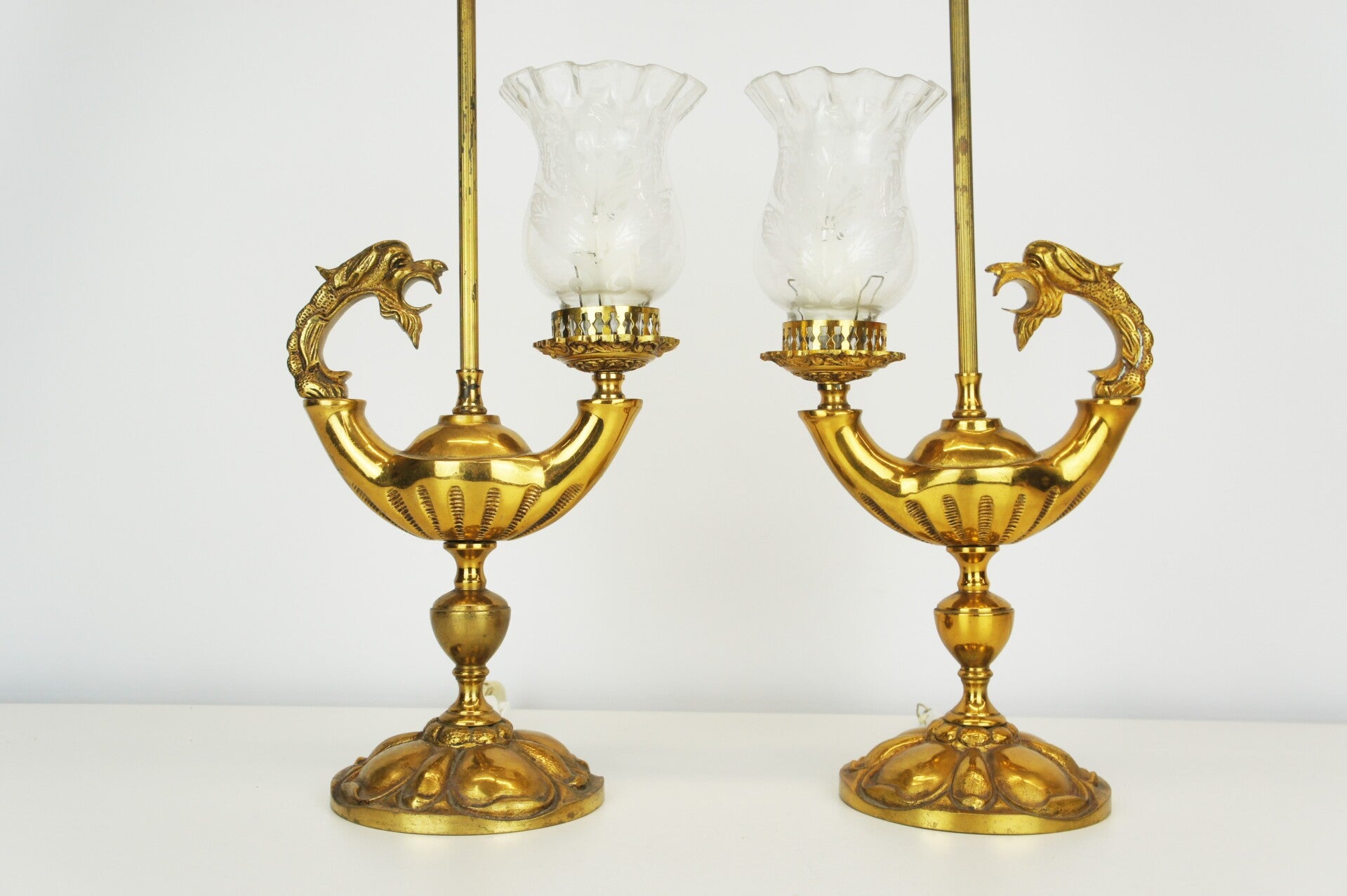 Beautiful pair of solid bronze genie table lamps from Spain, circa 1950 with glass shades in an etched floral decor.